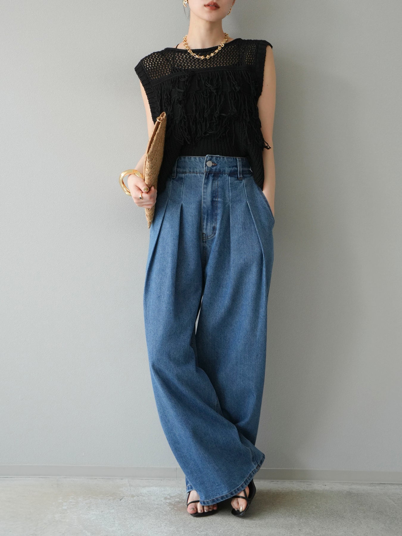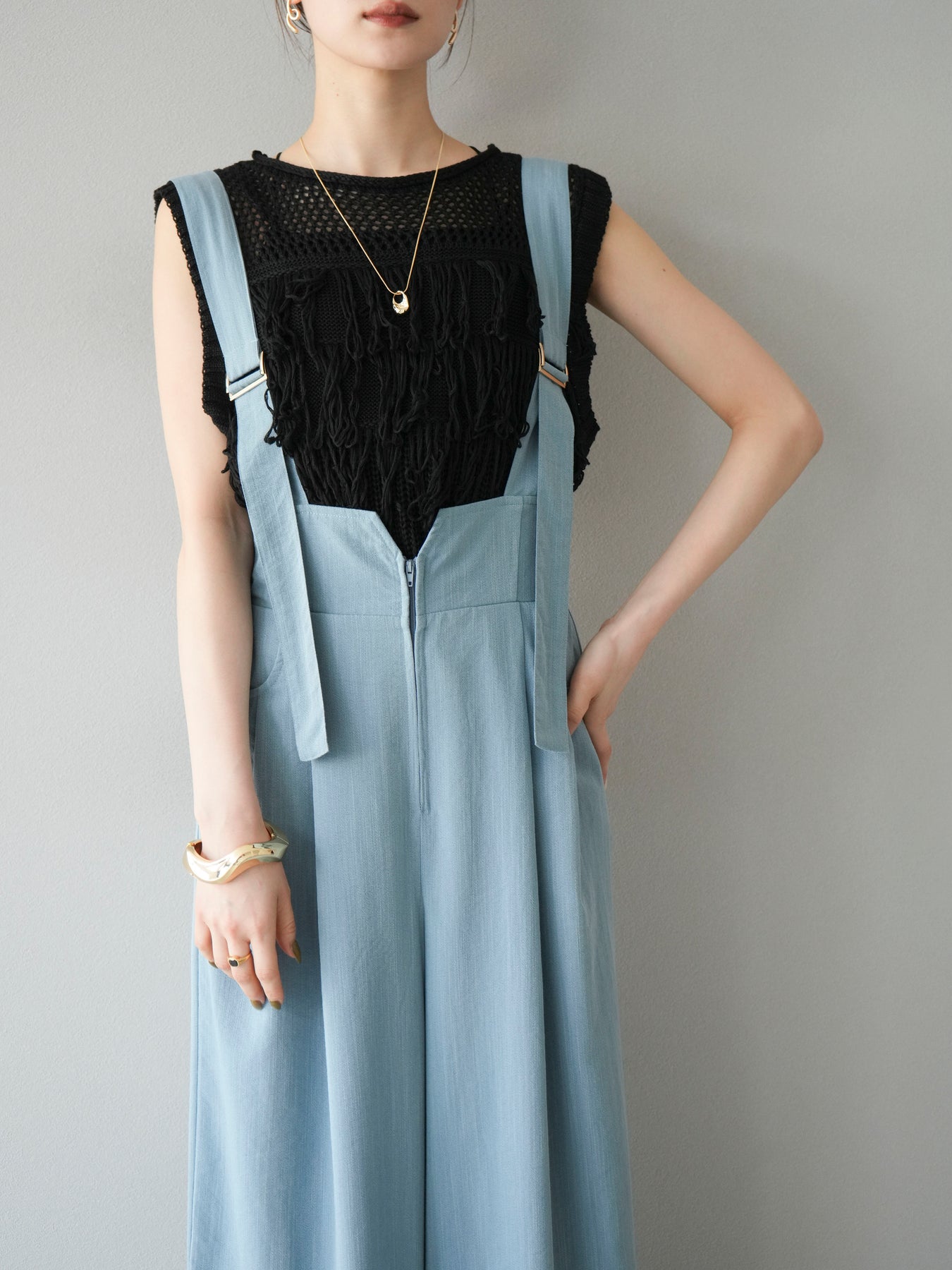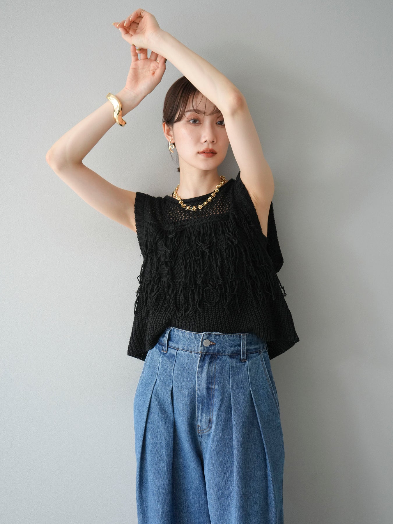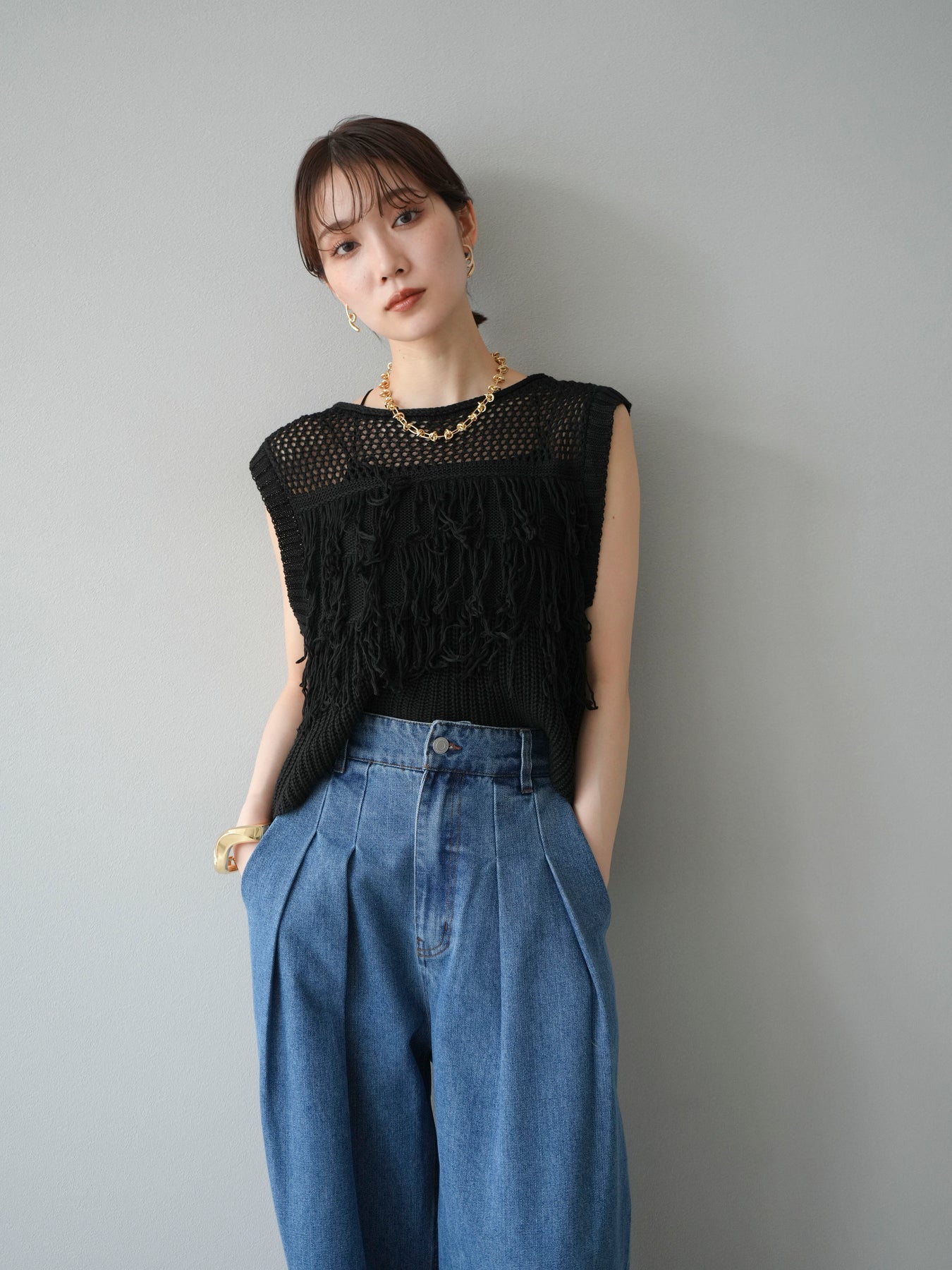 充滿現代感的針織上衣,立體流蘇和精緻的鏤空針織引人注目。 針織布料透氣性極佳,即使在炎熱的天氣下也能穿著舒適,非常涼爽。 適度的肩部露出度和緊湊的長度使其非常適合分層風格。 它可以與 T 卹或背心搭配,也可以搭配襯衫或吊帶裙。 引人注目的流蘇設計為您的服裝增添了動態和表現力。 這是一款迷人的上衣,可將您的日常風格提升到一個新的水平。