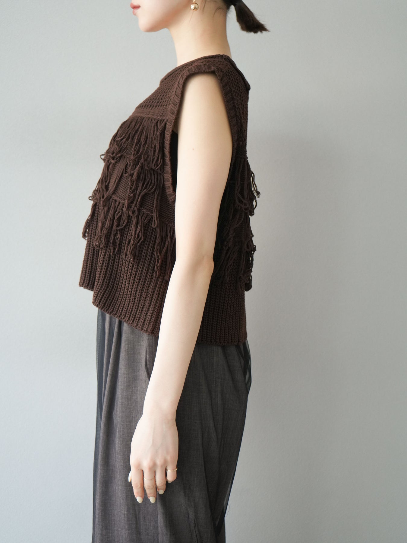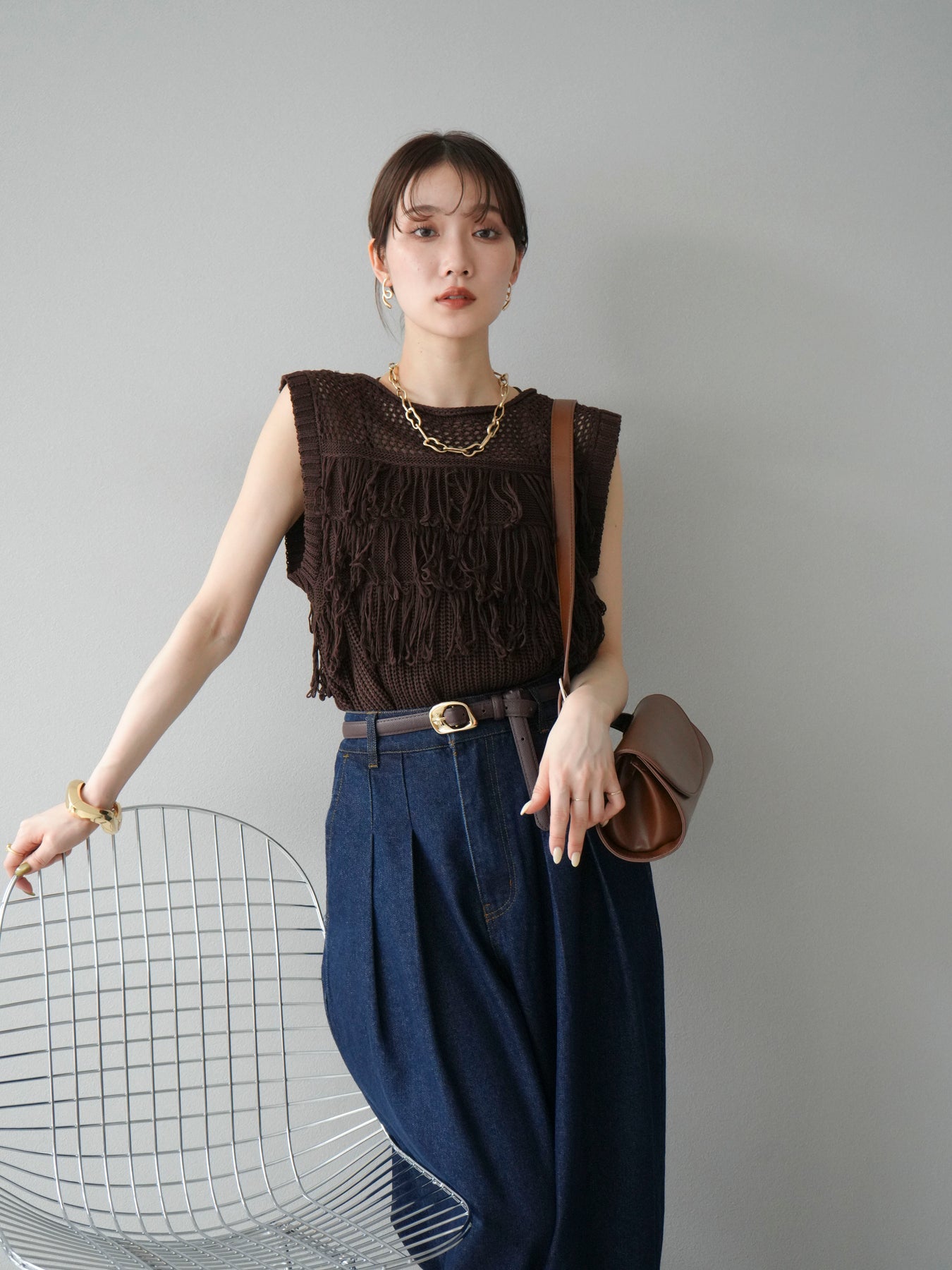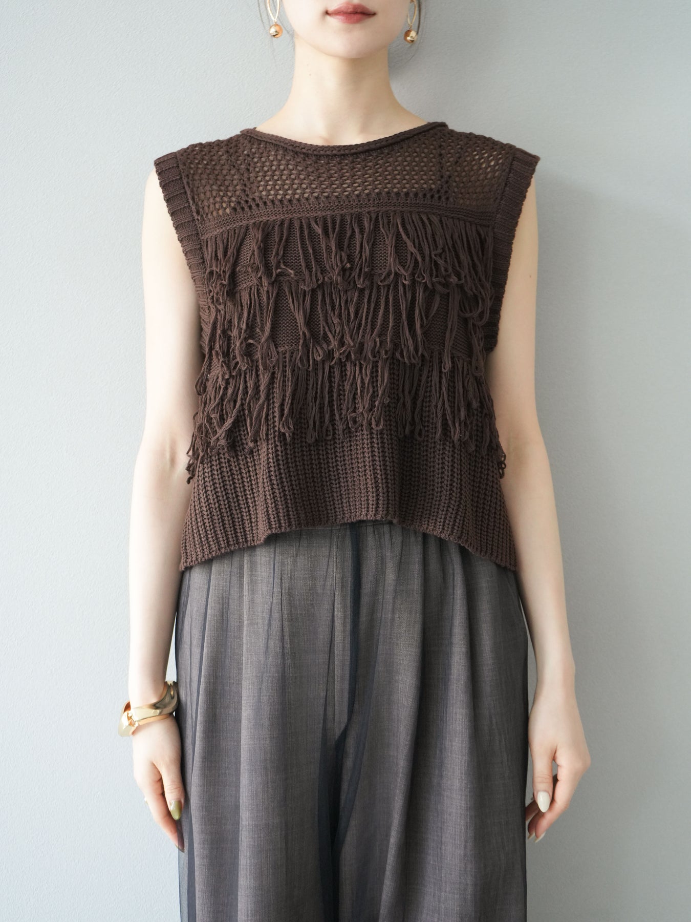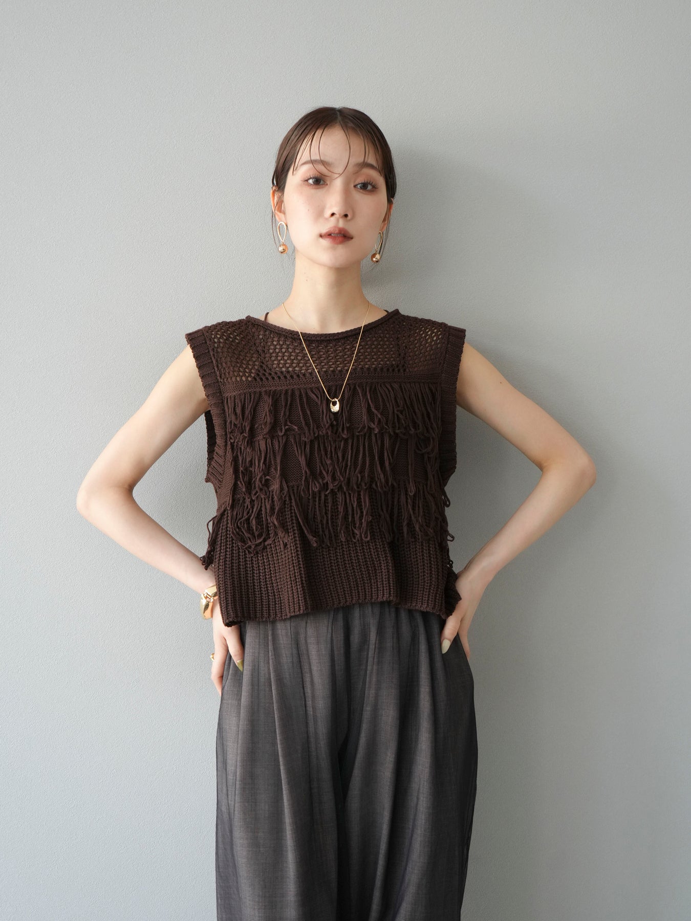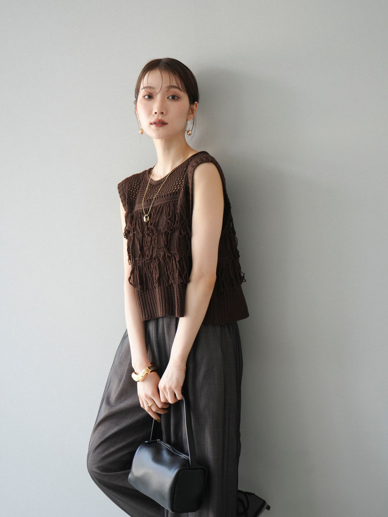 充滿現代感的針織上衣,立體流蘇和精緻的鏤空針織引人注目。 針織布料透氣性極佳,即使在炎熱的天氣下也能穿著舒適,非常涼爽。 適度的肩部露出度和緊湊的長度使其非常適合分層風格。 它可以與 T 卹或背心搭配,也可以搭配襯衫或吊帶裙。 引人注目的流蘇設計為您的服裝增添了動態和表現力。 這是一款迷人的上衣,可將您的日常風格提升到一個新的水平。