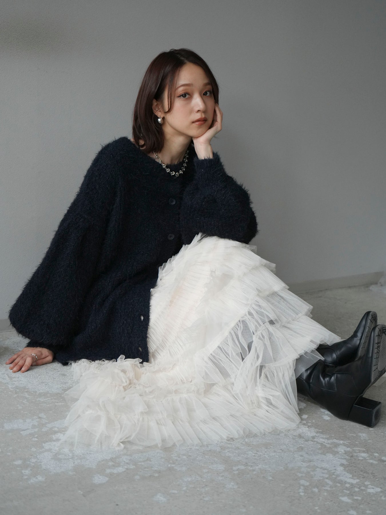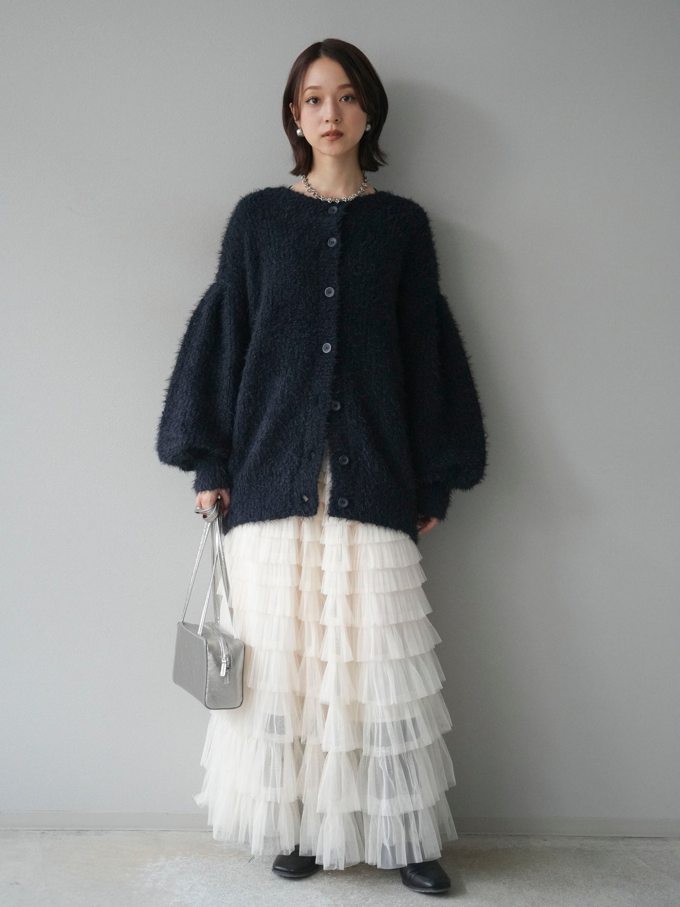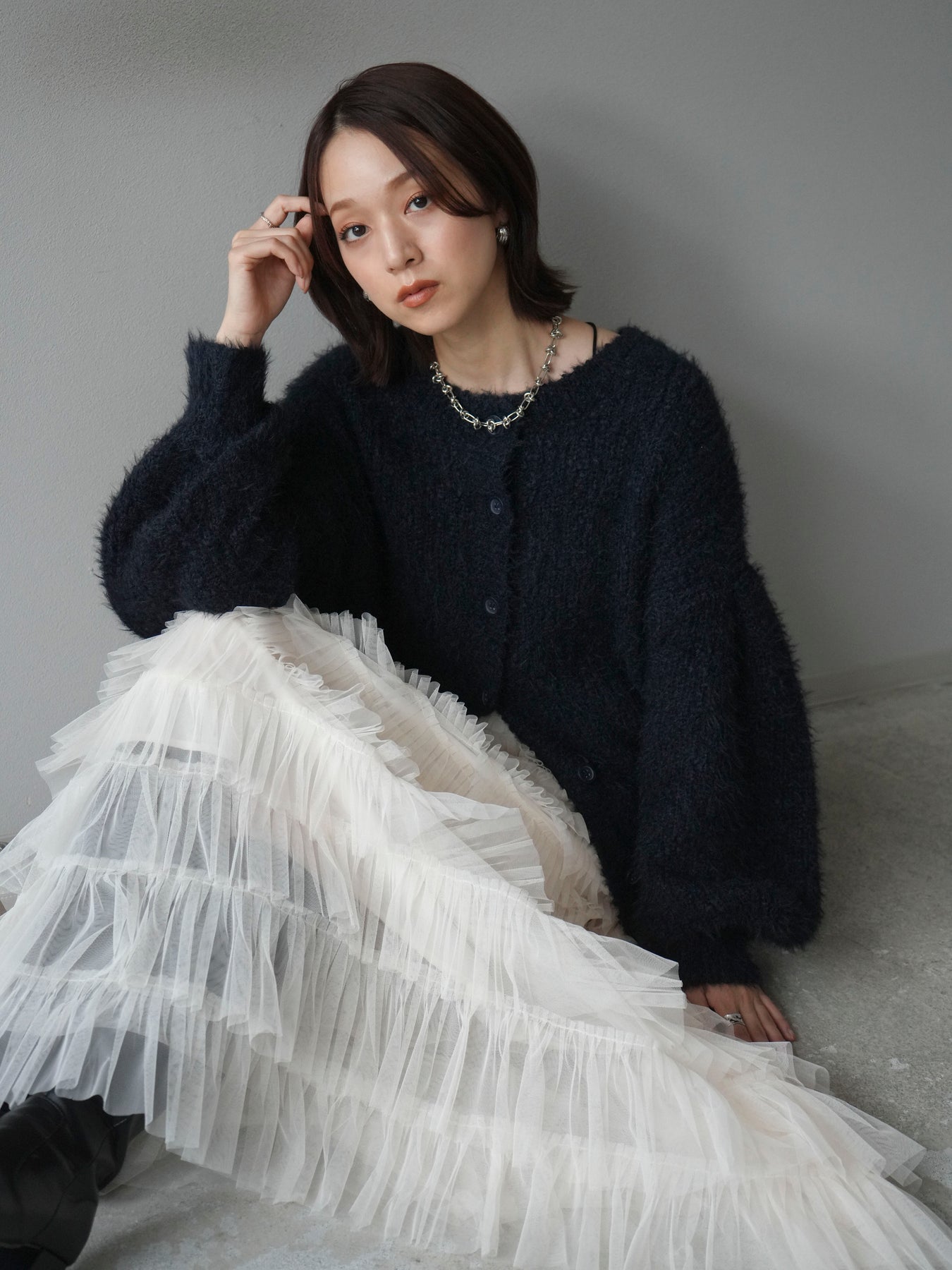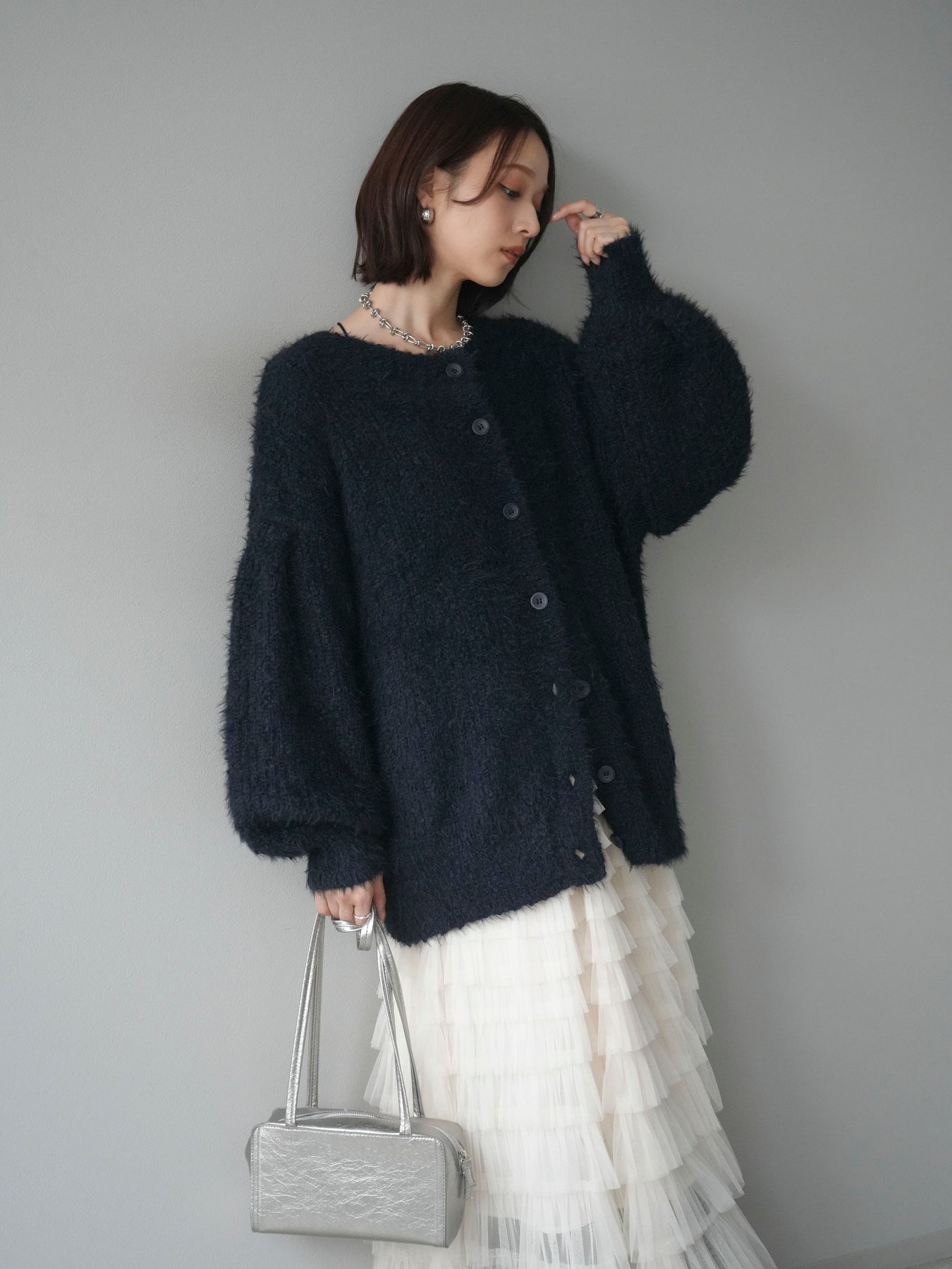 圓領開襟衫,採用柔軟、隨興的毛茸茸材質。它具有輕盈的感覺和女性化的輪廓,適合從日常穿著到特殊場合等各種場合。這件作品散發著迷人和時尚的感覺。 ※除下裝、吊帶背心(內衣)以外的所有商品均不包含內衣。