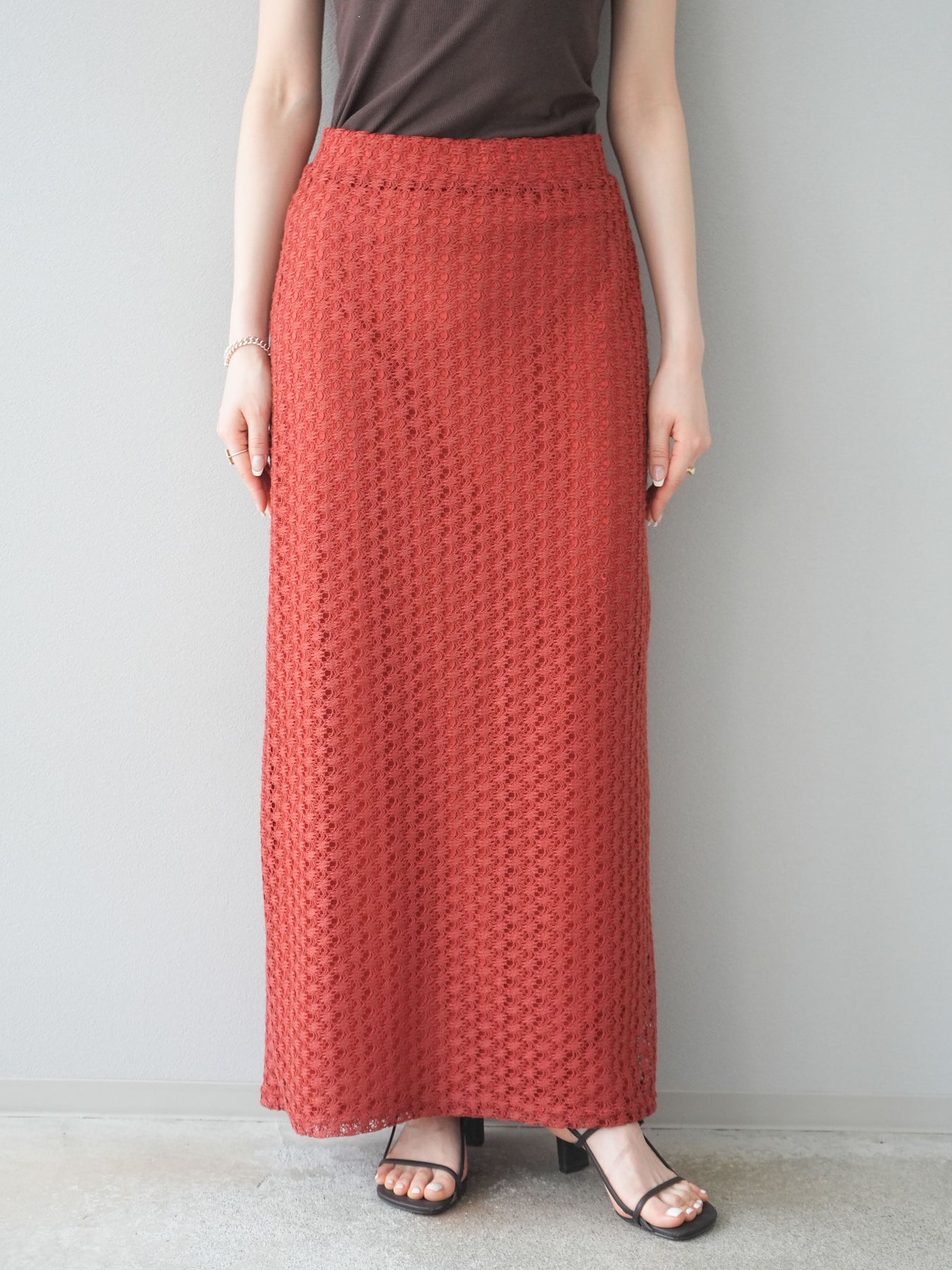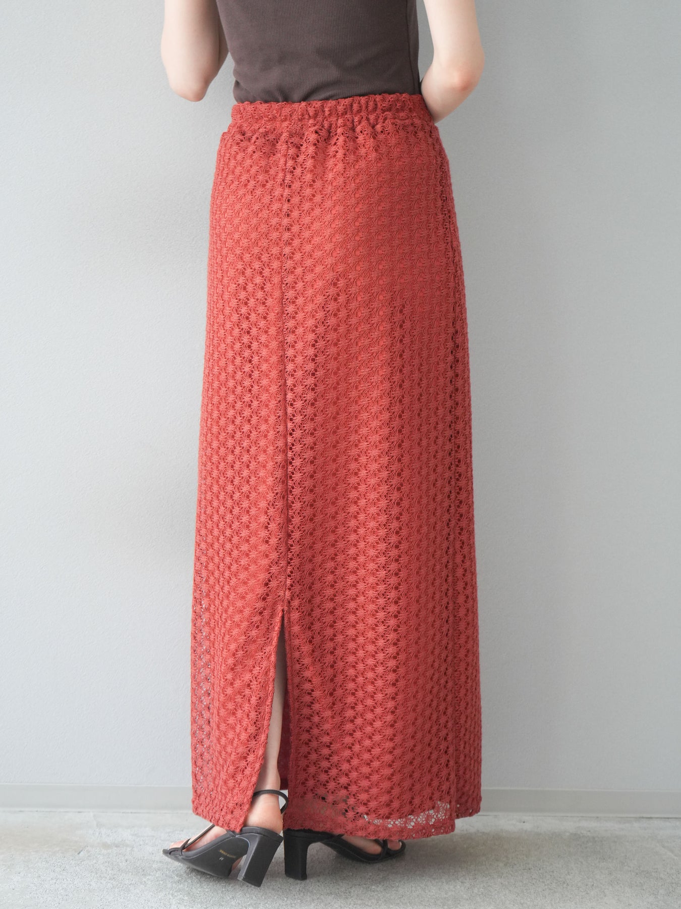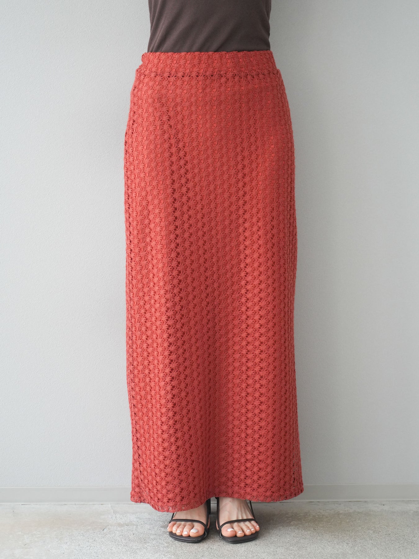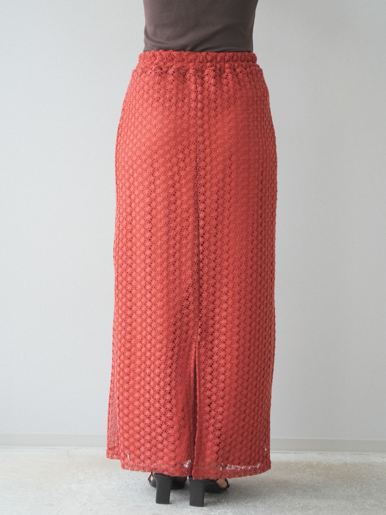 精緻鏤空設計的緊身裙。適度的剪裁使輪廓更加優美,內襯也讓穿著時無需擔心透視感。即使搭配休閒上衣也能展現女性魅力。無論什麼季節都適用,也推薦用於打造時尚的疊穿風格。 ※除下裝、吊帶背心(內衣)以外的商品均為標準品,不含內衣。
