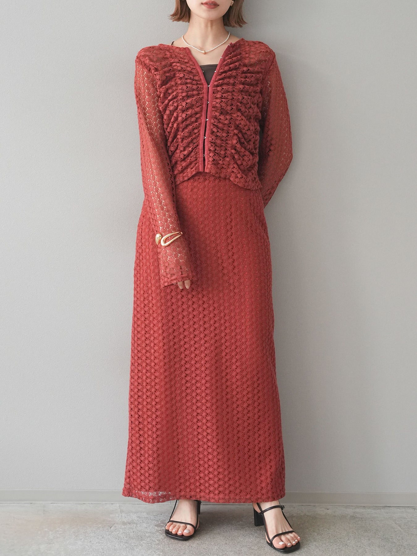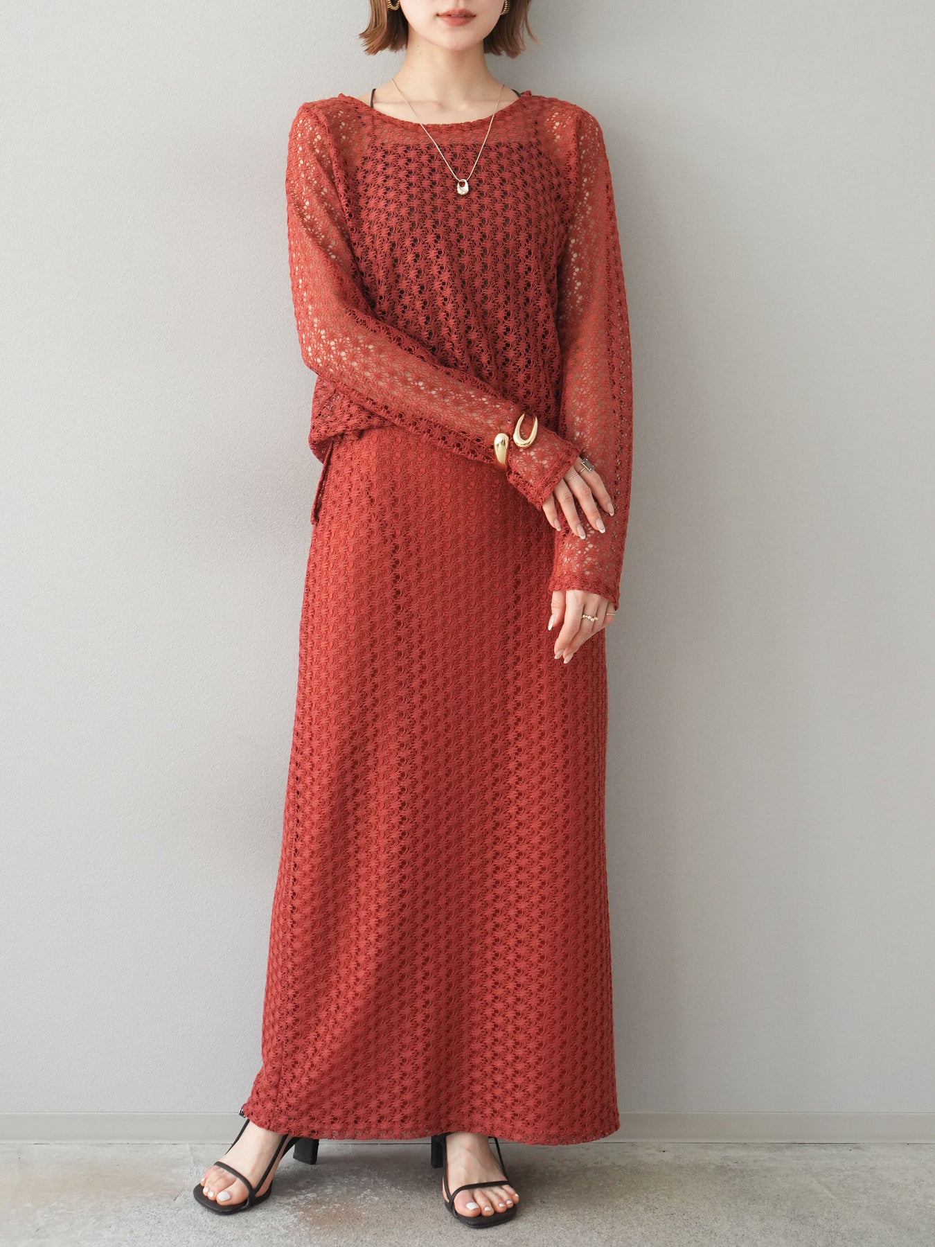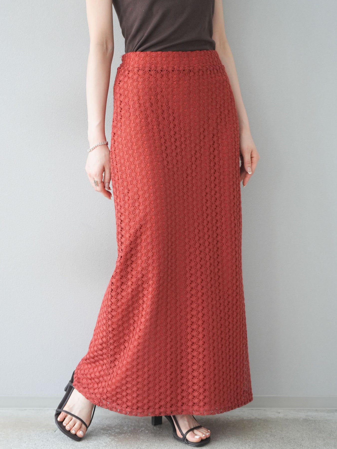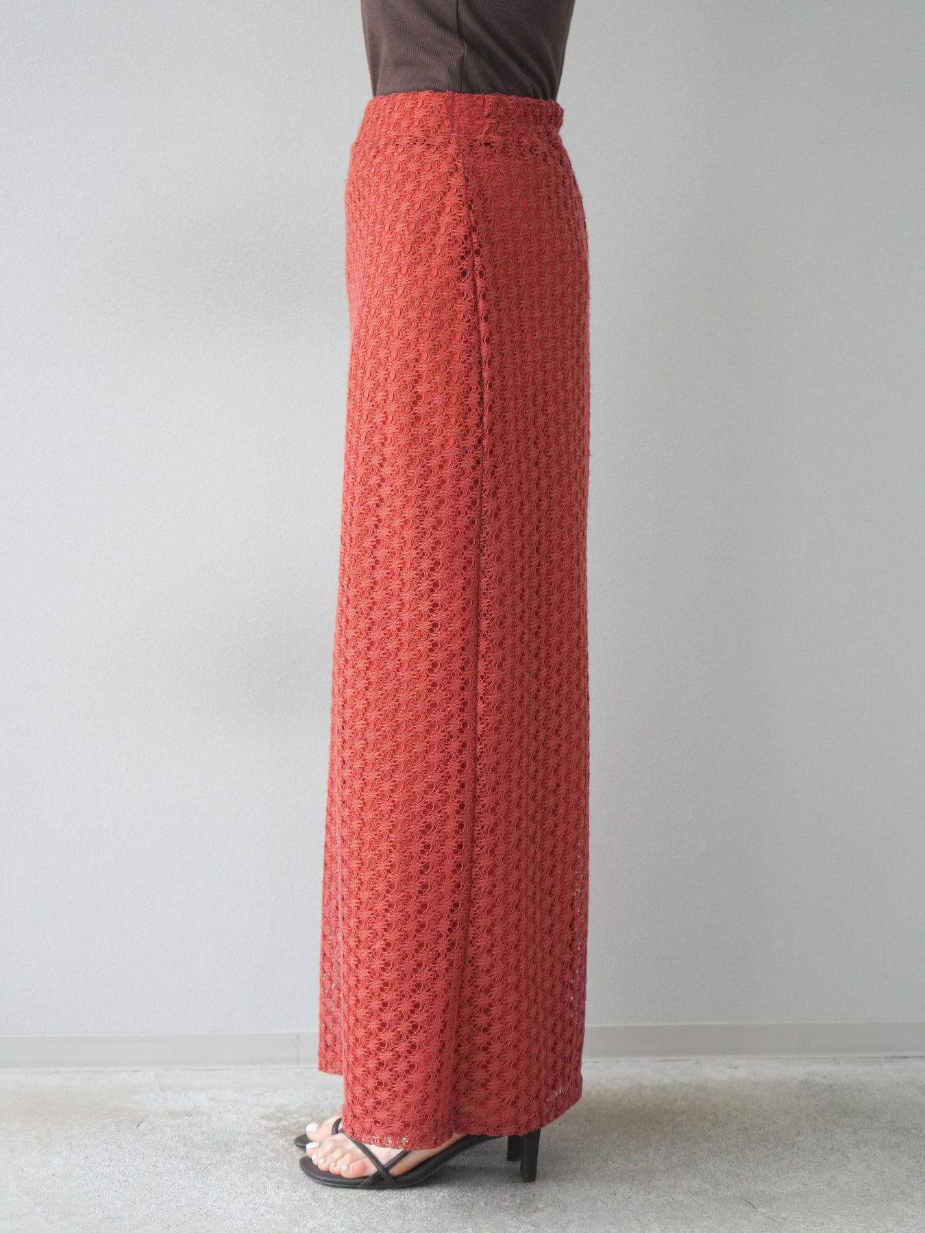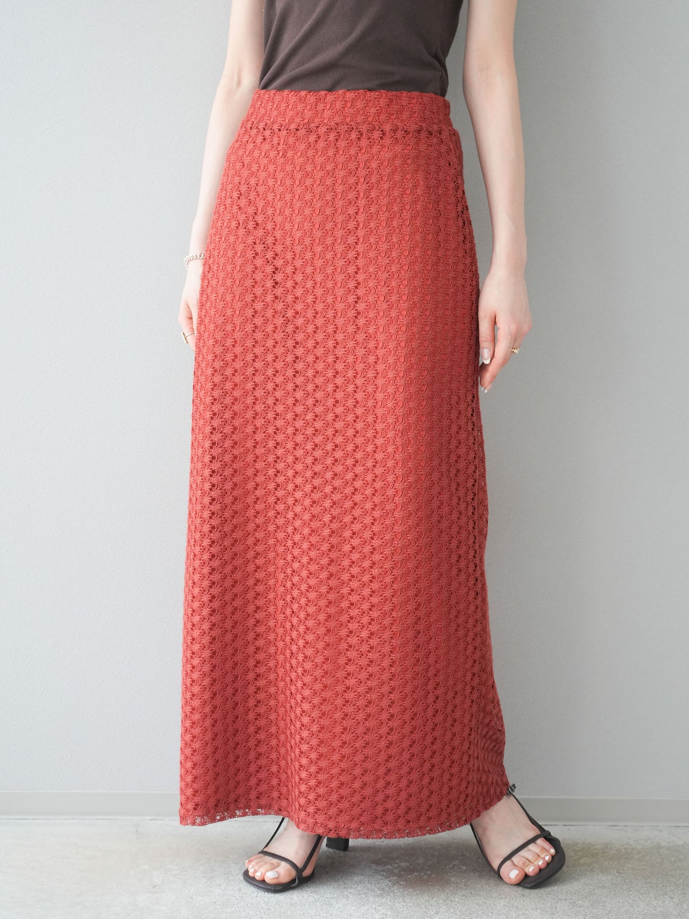 精緻鏤空設計的緊身裙。適度的剪裁使輪廓更加優美,內襯也讓穿著時無需擔心透視感。即使搭配休閒上衣也能展現女性魅力。無論什麼季節都適用,也推薦用於打造時尚的疊穿風格。 ※除下裝、吊帶背心(內衣)以外的商品均為標準品,不含內衣。