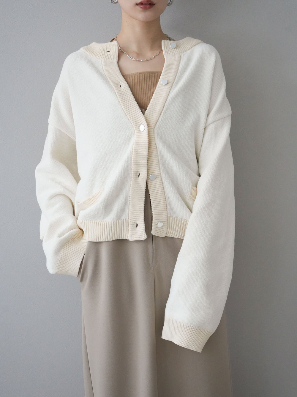 [預訂] 不同材質配色馬海毛針織開襟衫/象牙色