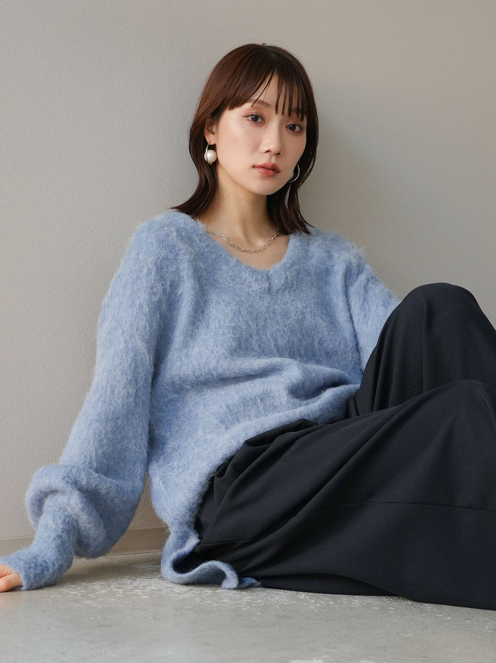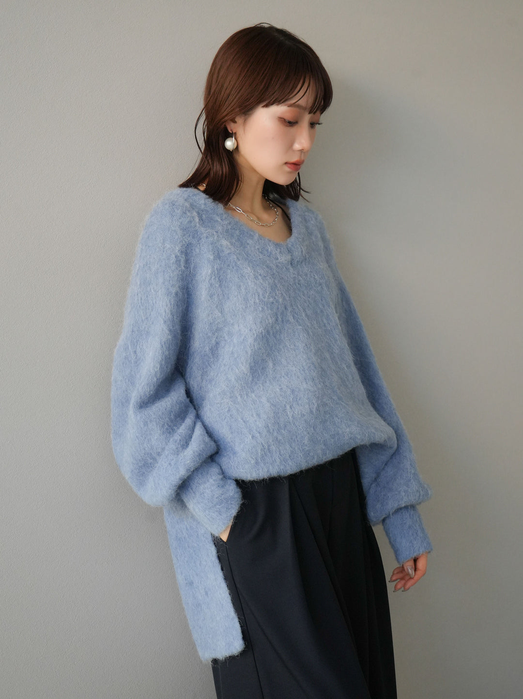【預購】V領加大尺寸馬海毛針織套頭衫/藍