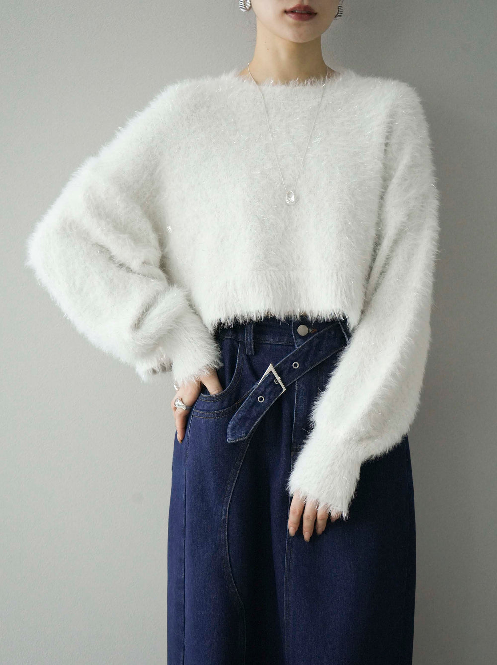 [預訂] 閃光毛茸茸捲袖短針織衫/米白色