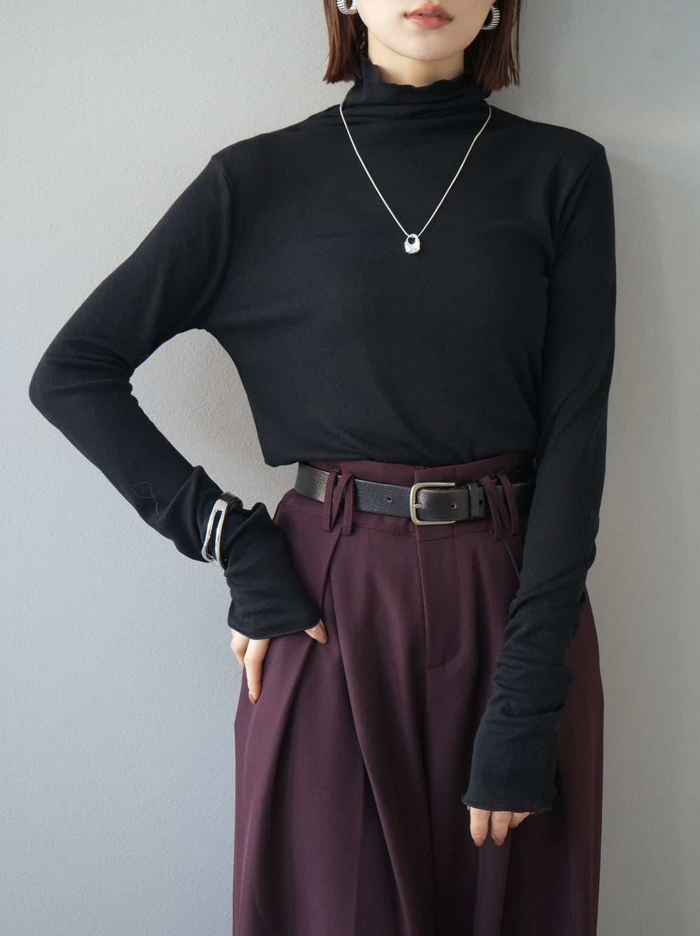[預訂] 透明羅紋柔和高領上衣/黑色