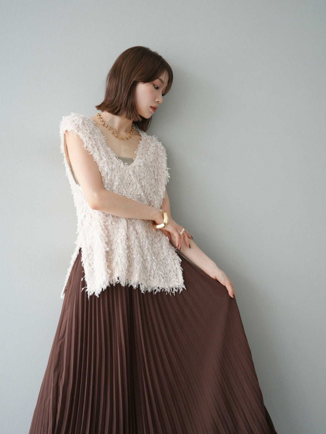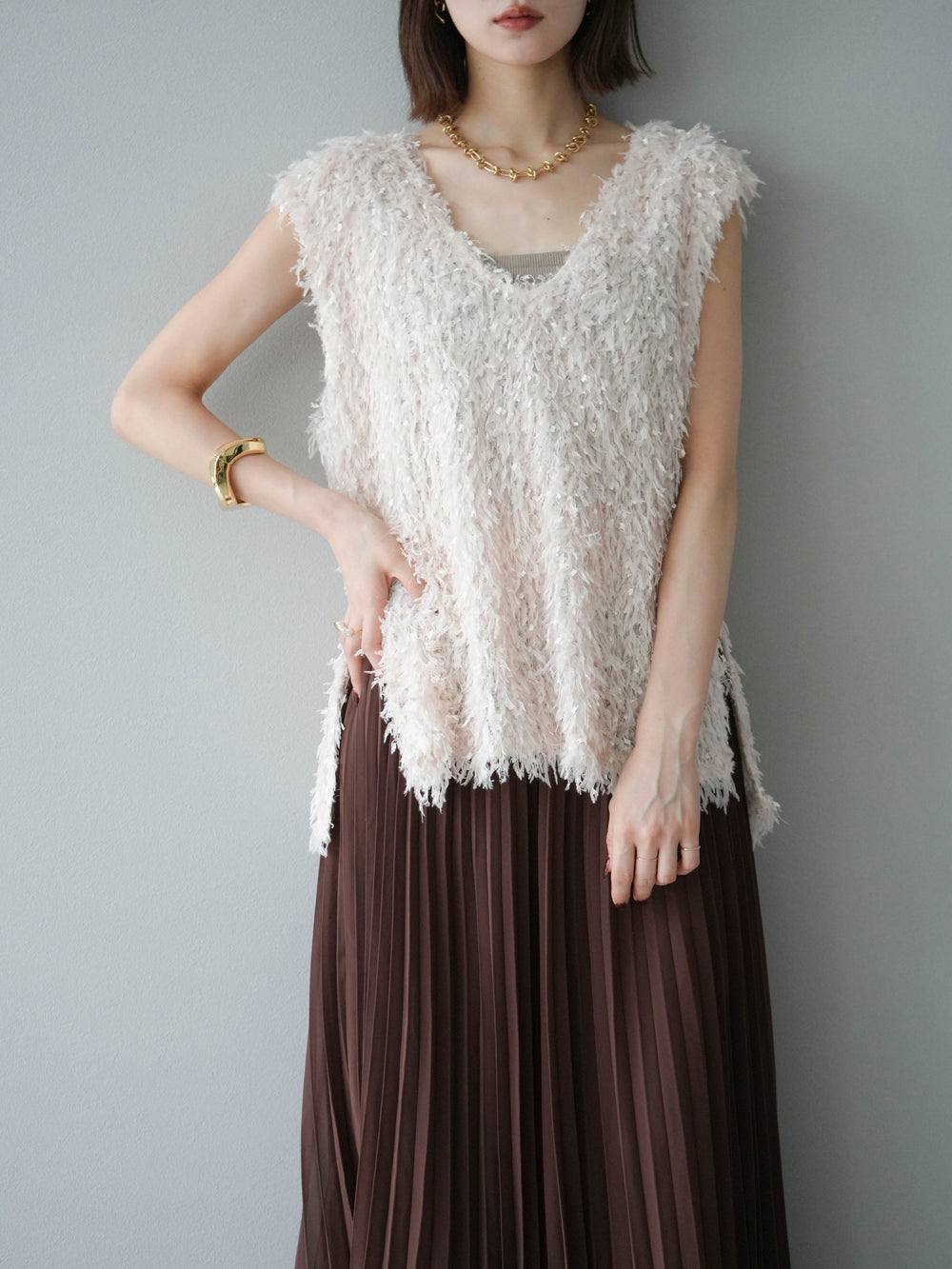 【預訂】毛圈混搭針織背心/象牙色