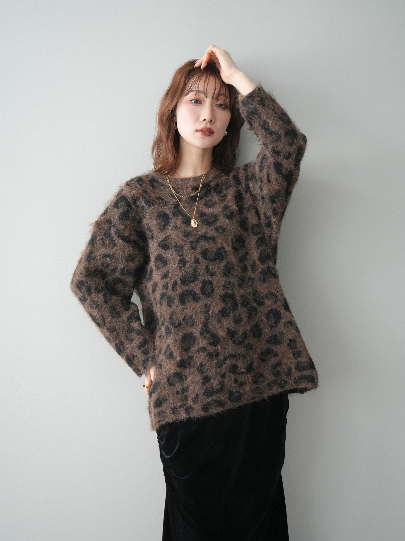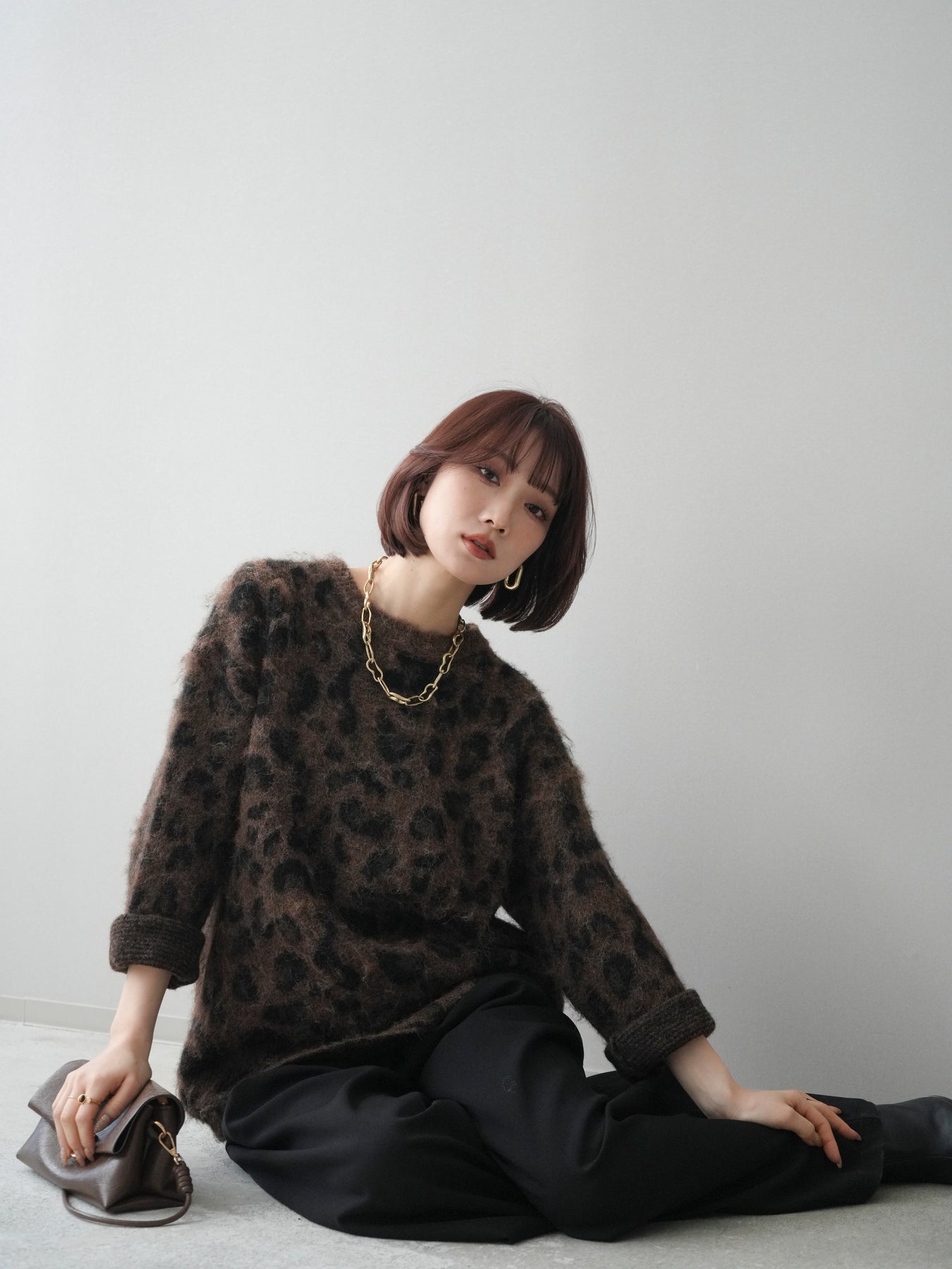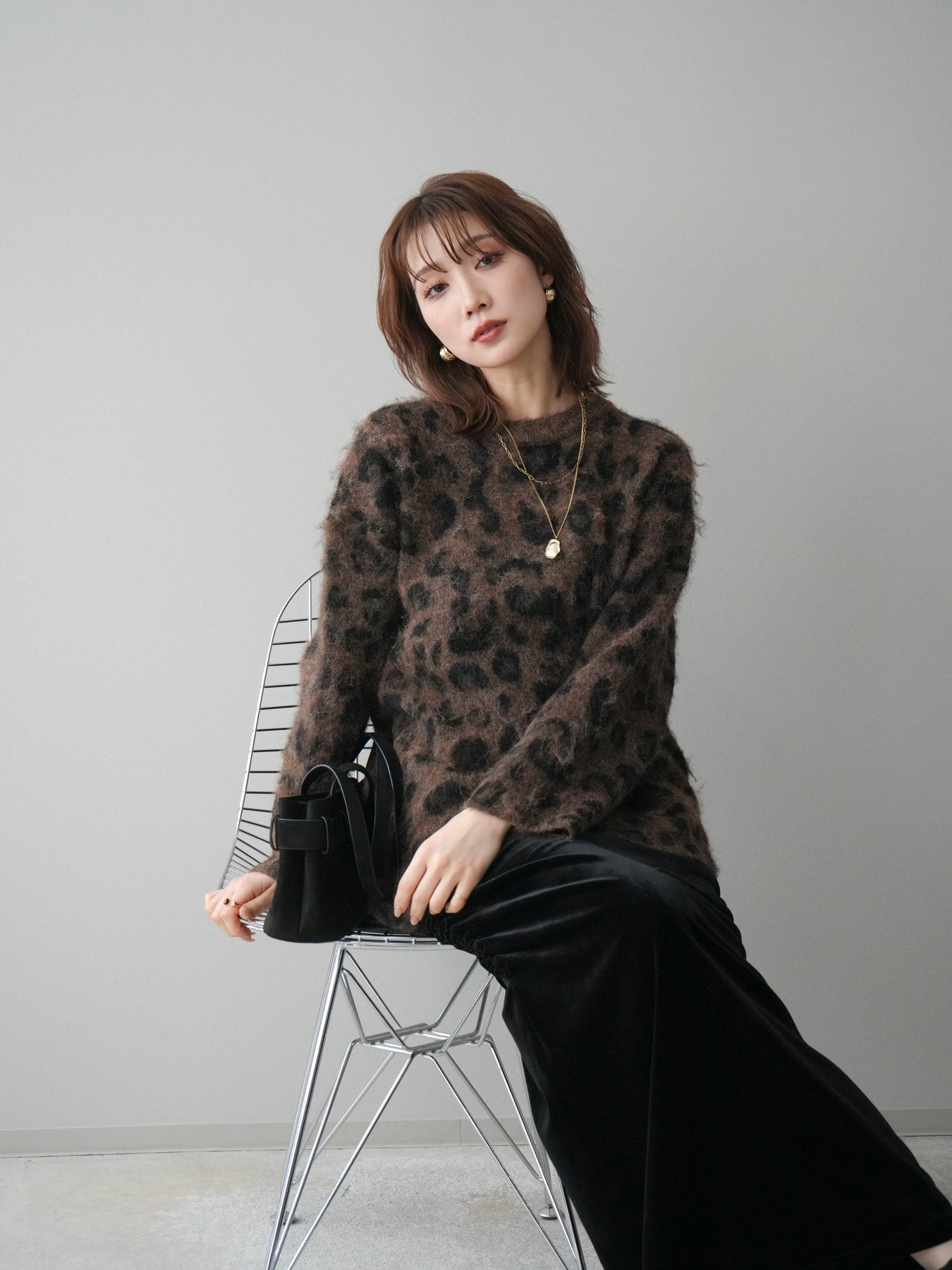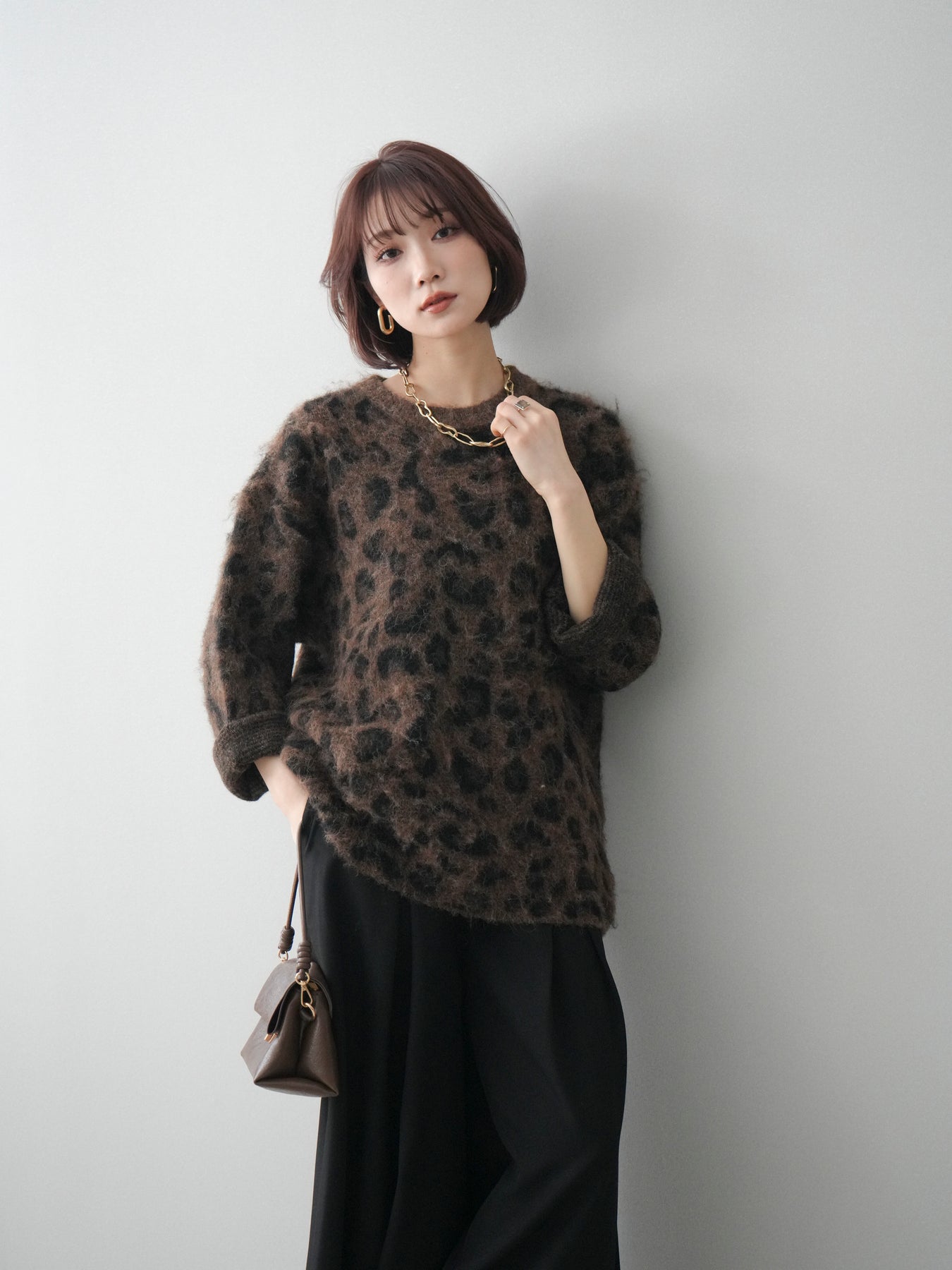 ふんわりとしたシャギー素材に、レオパード柄を落とし込んだ存在感のあるニットプルオーバー。 毛足のある表情豊かな編み地が、シーズンムードを高めながらコーディネートの主役として映えます。 程よくラフな雰囲気がありつつも、柄のバランスが取りやすく、取り入れるだけでスタイリングにこなれ感をプラス。 シンプルなボトムと合わせるだけで、洗練されたカジュアルスタイルが完成します。 デイリーコーデにアクセントを加えたいときにおすすめの一着です。