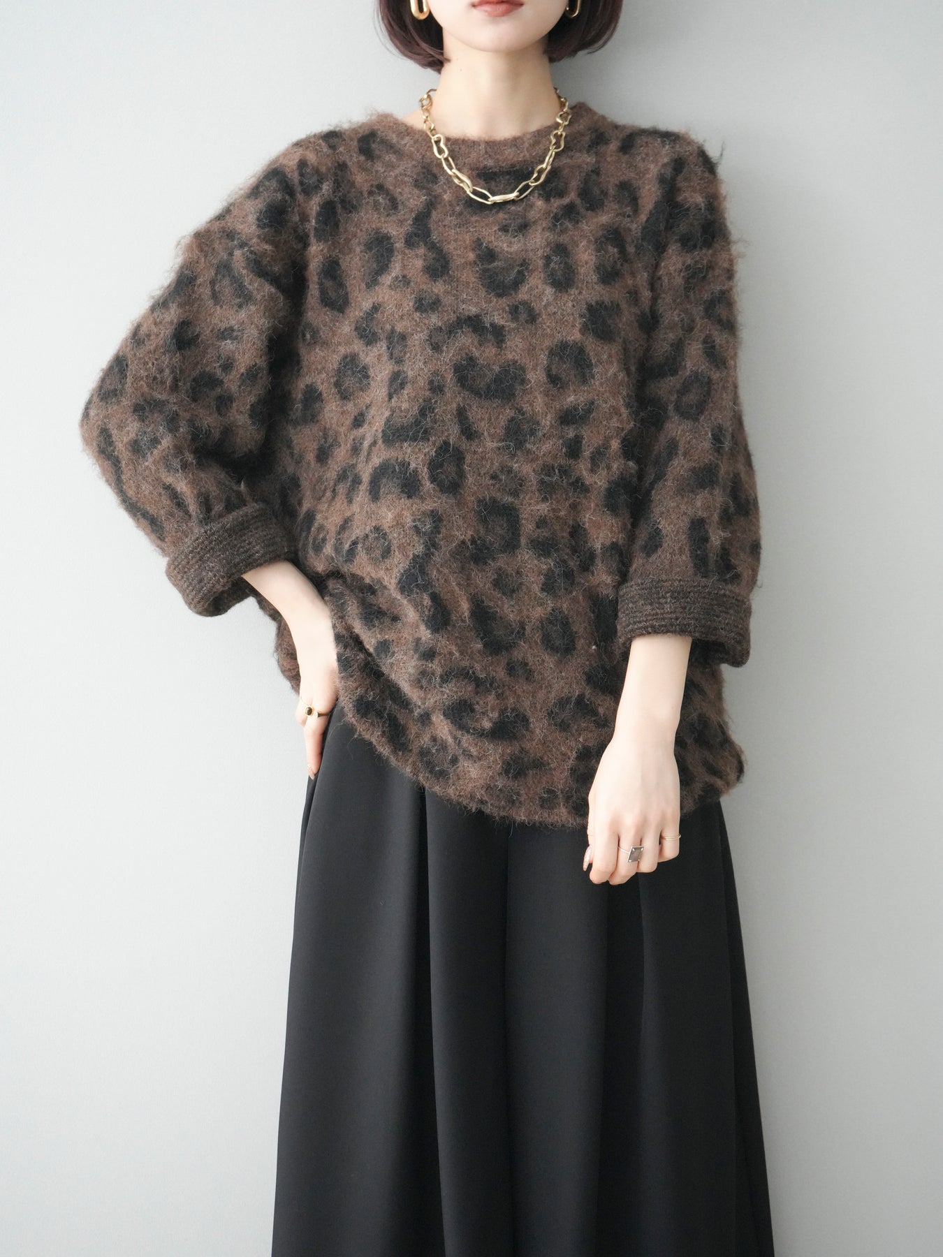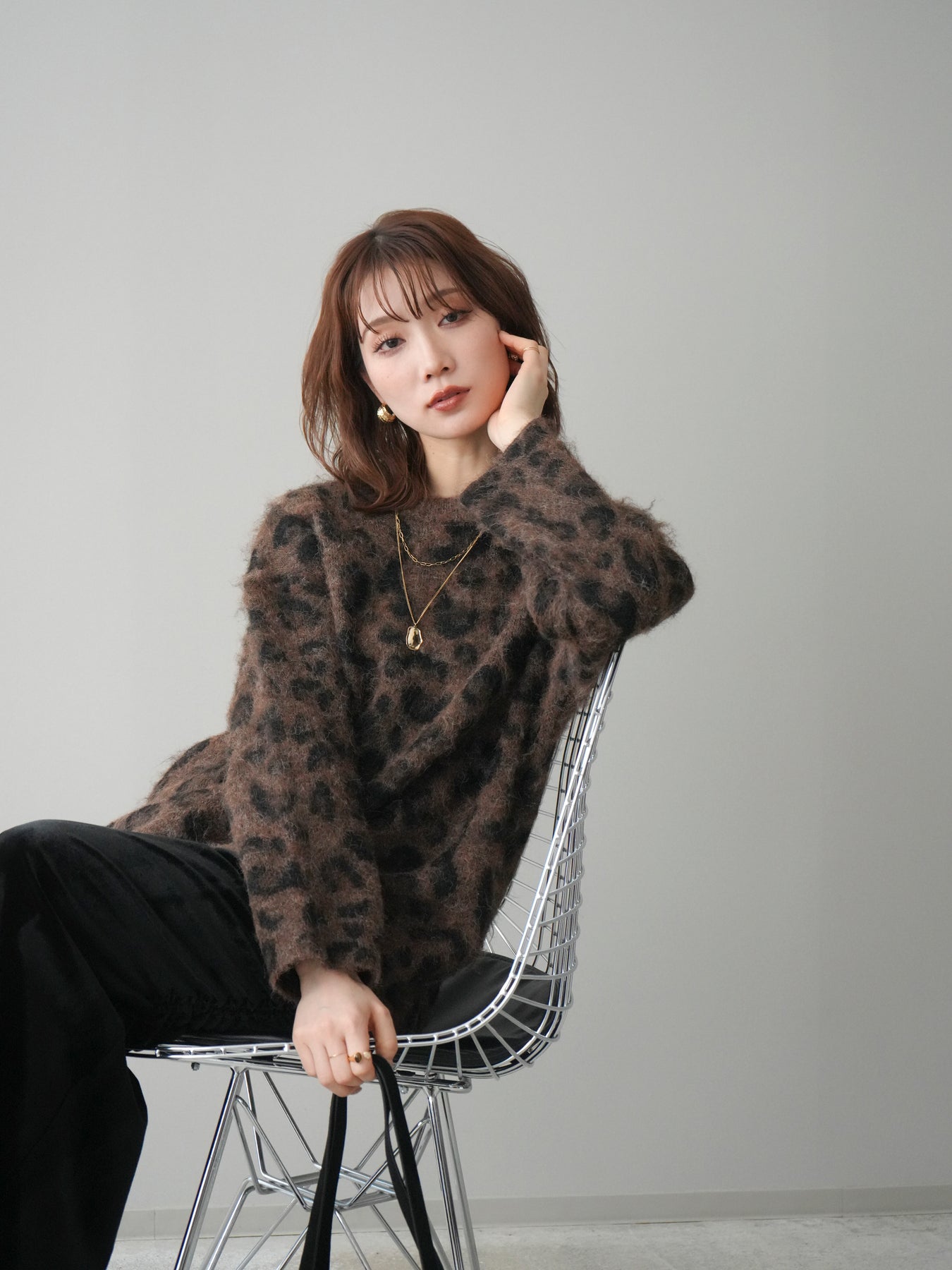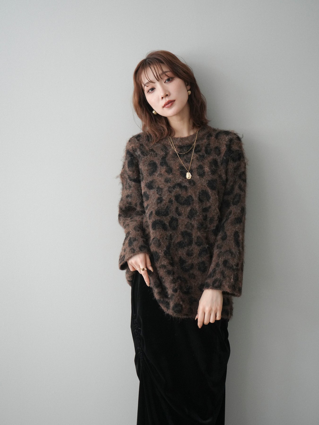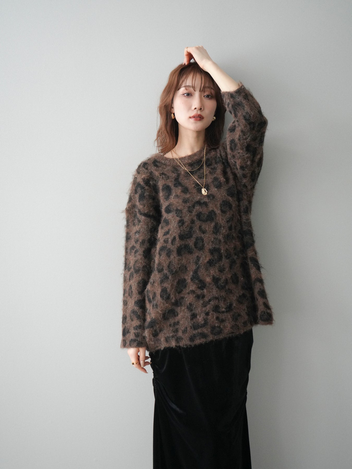 ふんわりとしたシャギー素材に、レオパード柄を落とし込んだ存在感のあるニットプルオーバー。 毛足のある表情豊かな編み地が、シーズンムードを高めながらコーディネートの主役として映えます。 程よくラフな雰囲気がありつつも、柄のバランスが取りやすく、取り入れるだけでスタイリングにこなれ感をプラス。 シンプルなボトムと合わせるだけで、洗練されたカジュアルスタイルが完成します。 デイリーコーデにアクセントを加えたいときにおすすめの一着です。