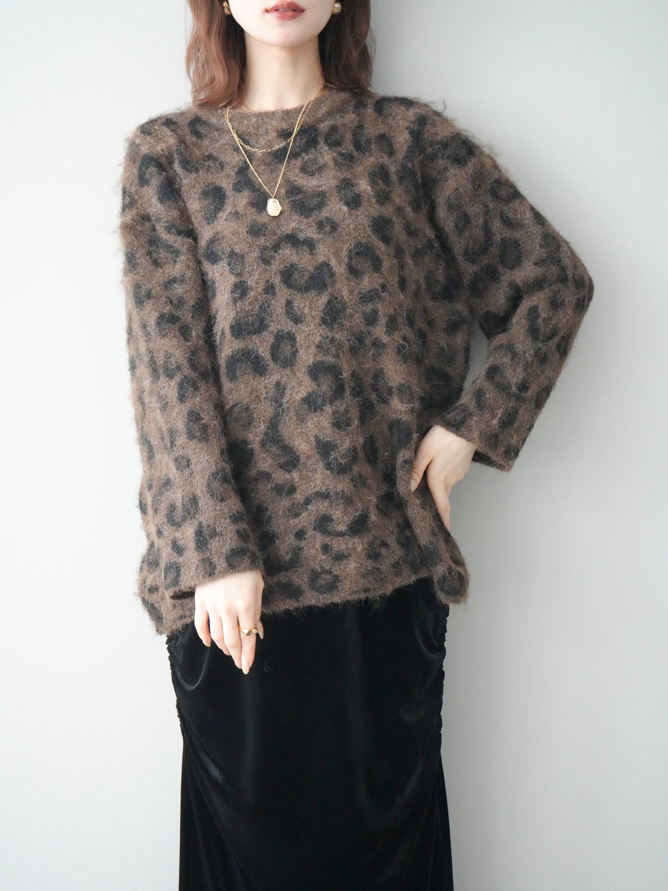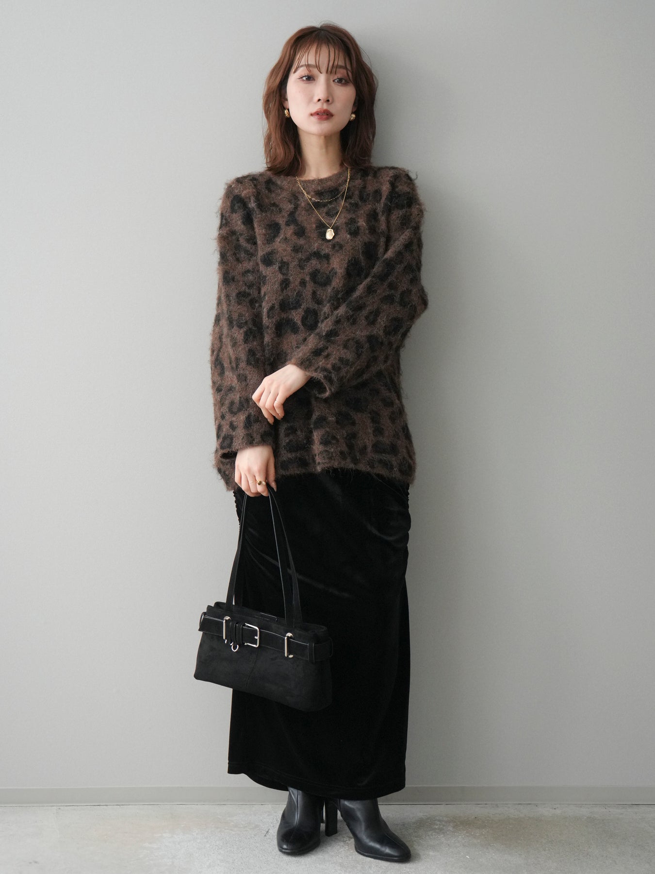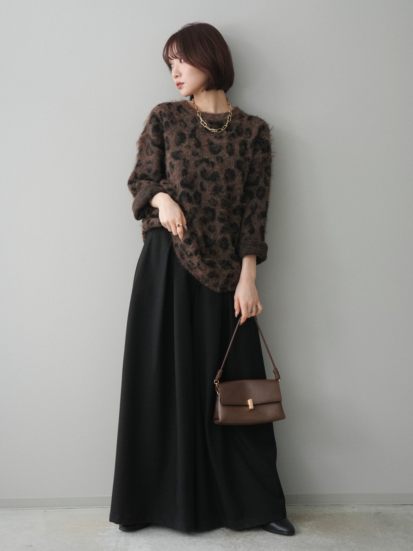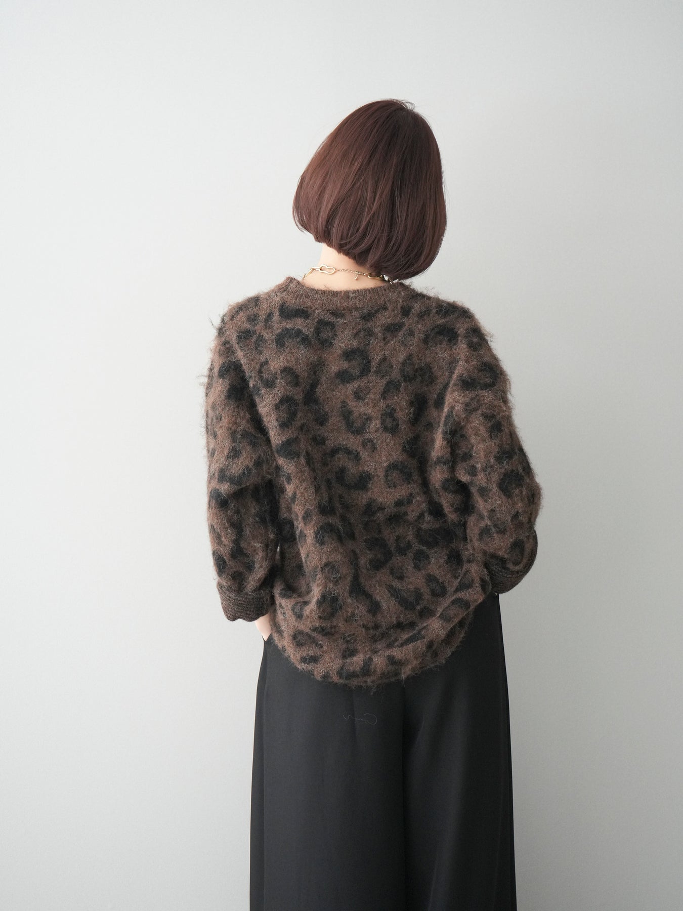 ふんわりとしたシャギー素材に、レオパード柄を落とし込んだ存在感のあるニットプルオーバー。 毛足のある表情豊かな編み地が、シーズンムードを高めながらコーディネートの主役として映えます。 程よくラフな雰囲気がありつつも、柄のバランスが取りやすく、取り入れるだけでスタイリングにこなれ感をプラス。 シンプルなボトムと合わせるだけで、洗練されたカジュアルスタイルが完成します。 デイリーコーデにアクセントを加えたいときにおすすめの一着です。