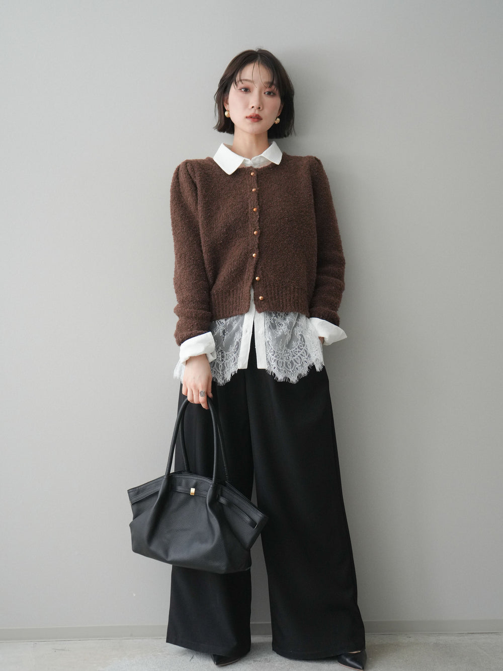 [SET]ゴールドボタンブークレニットカーディガン+総レースボリュームスリーブシャツ+ウエストレースタックワイドパンツ(3set)