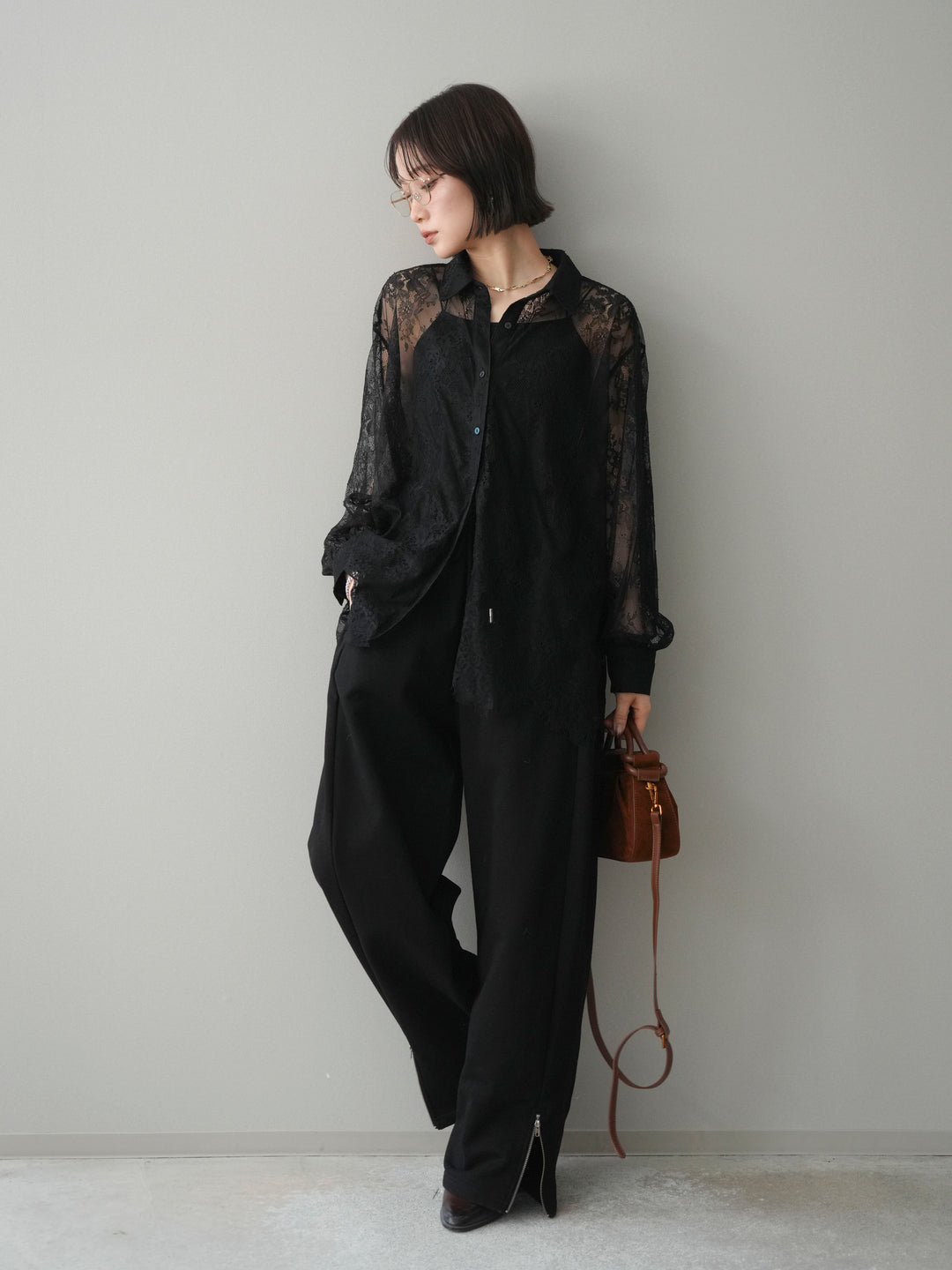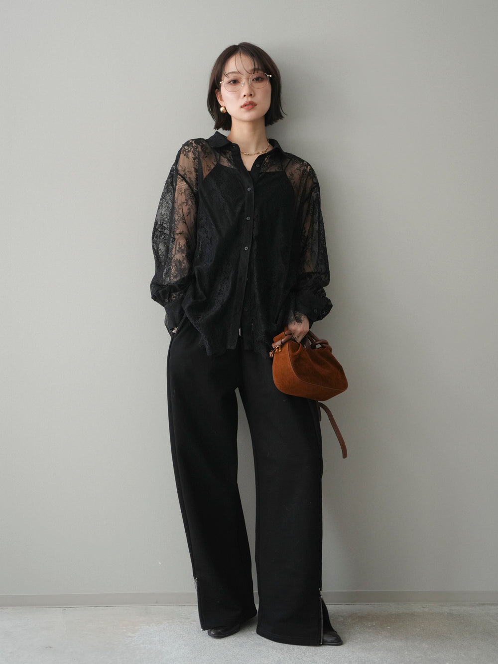 [SET]総レースボリュームスリーブシャツ+裾ZIPスエットワイドパンツ(2set)