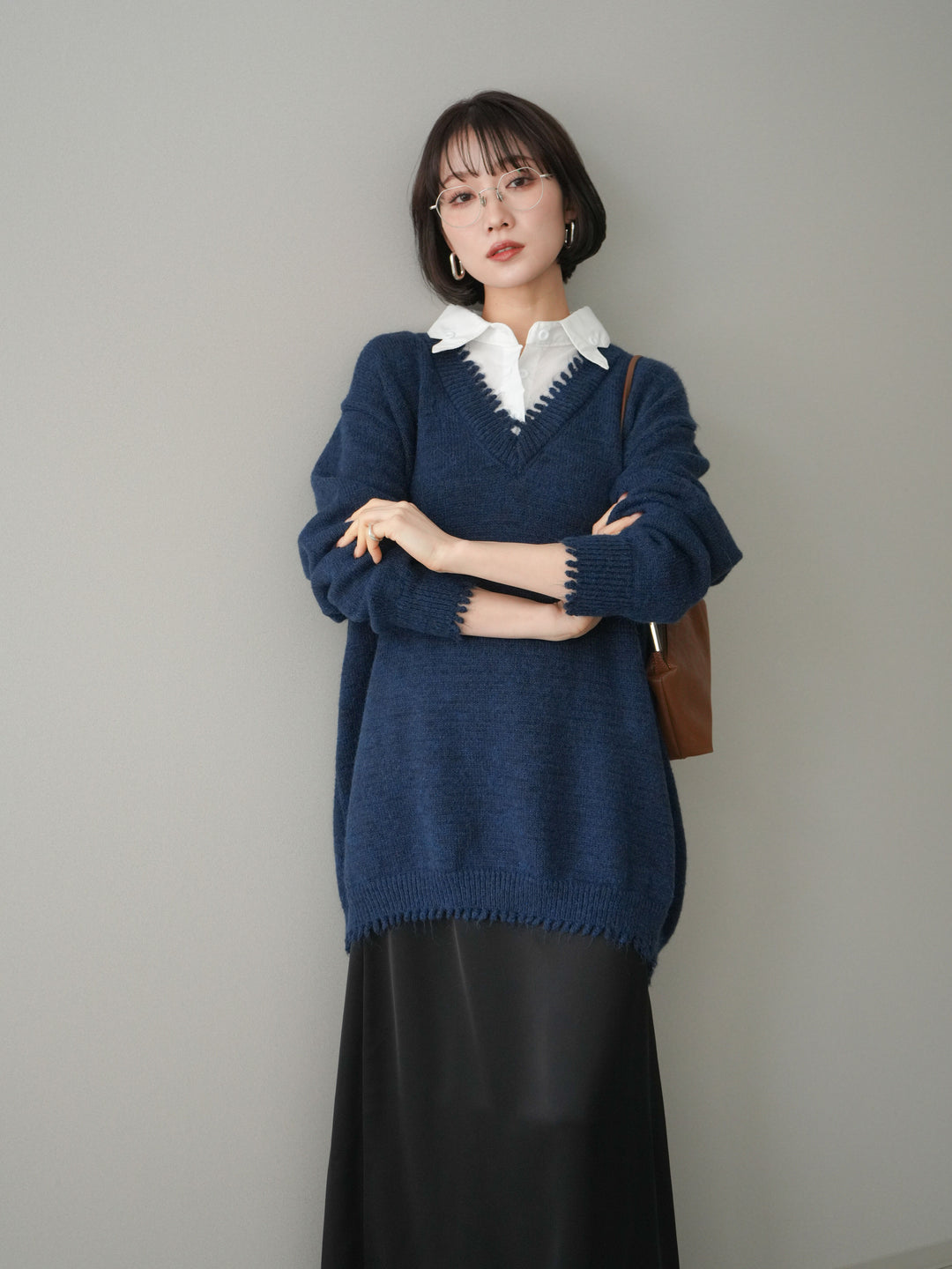 [SET]シャツドッキングVネックフリンジニットプルオーバー+選べるアクセセット(2set)