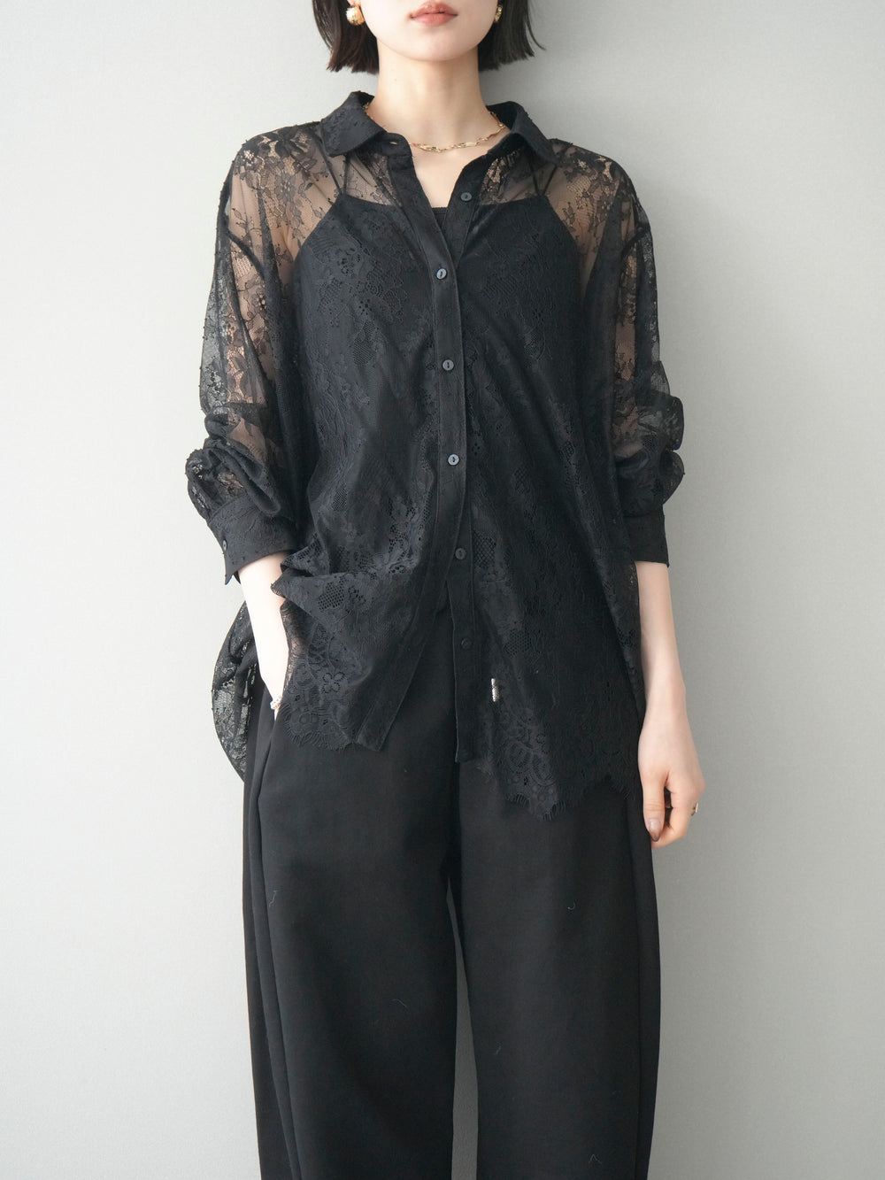 [SET]総レースボリュームスリーブシャツ+カップ付きバッククロスキャミソール+裾ZIPスエットワイドパンツ(3set)