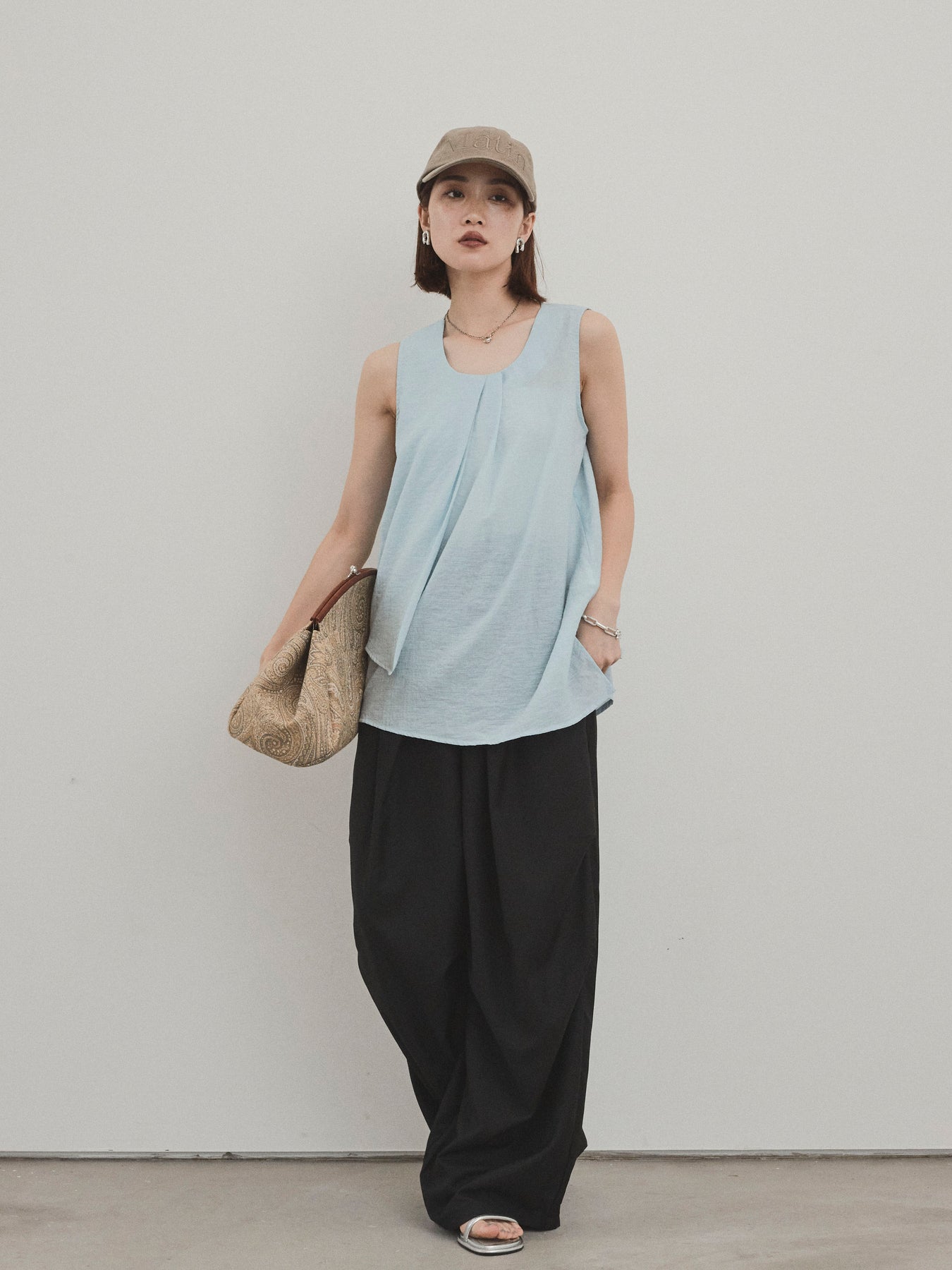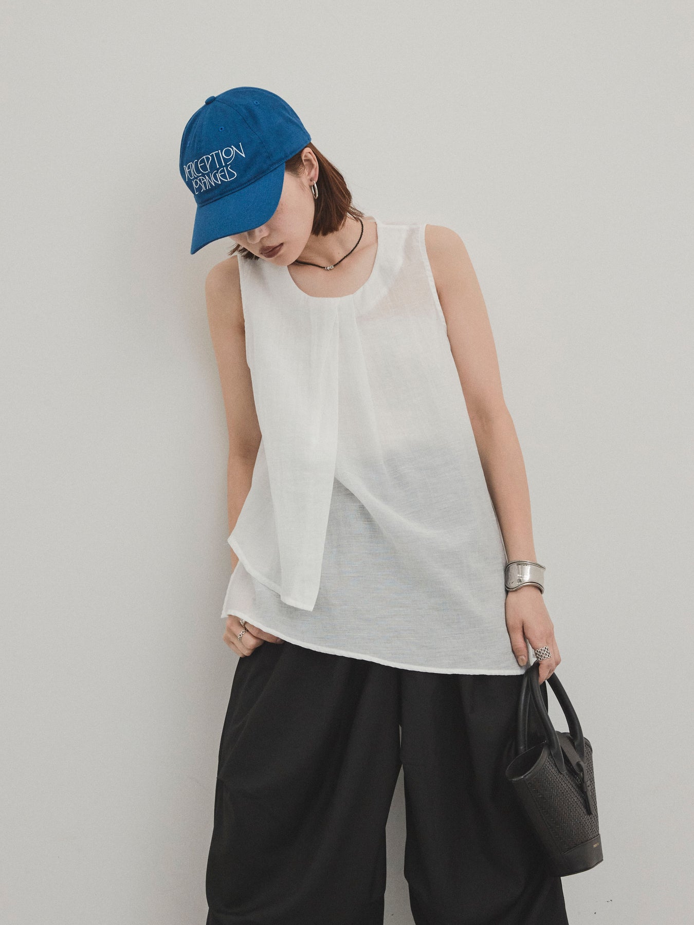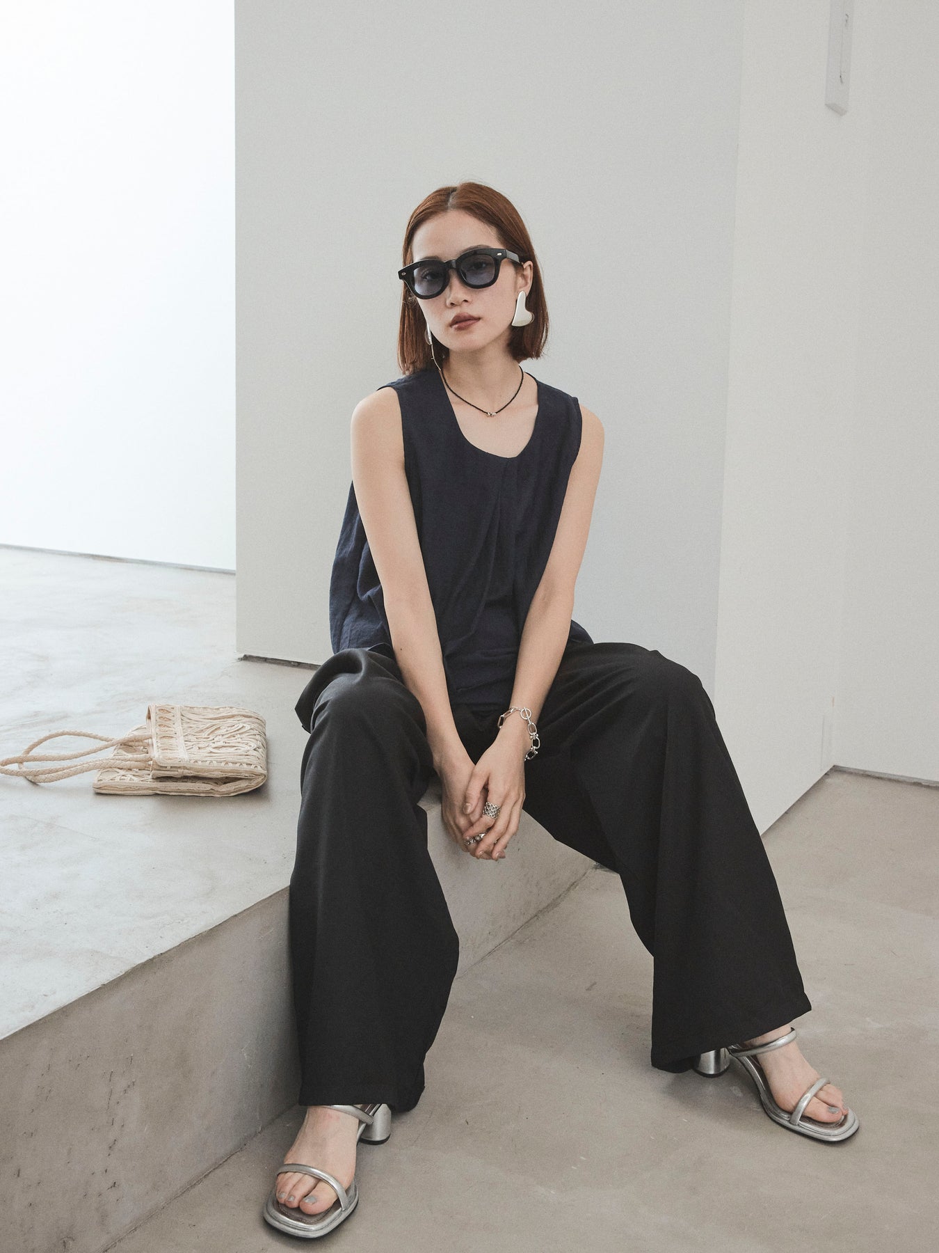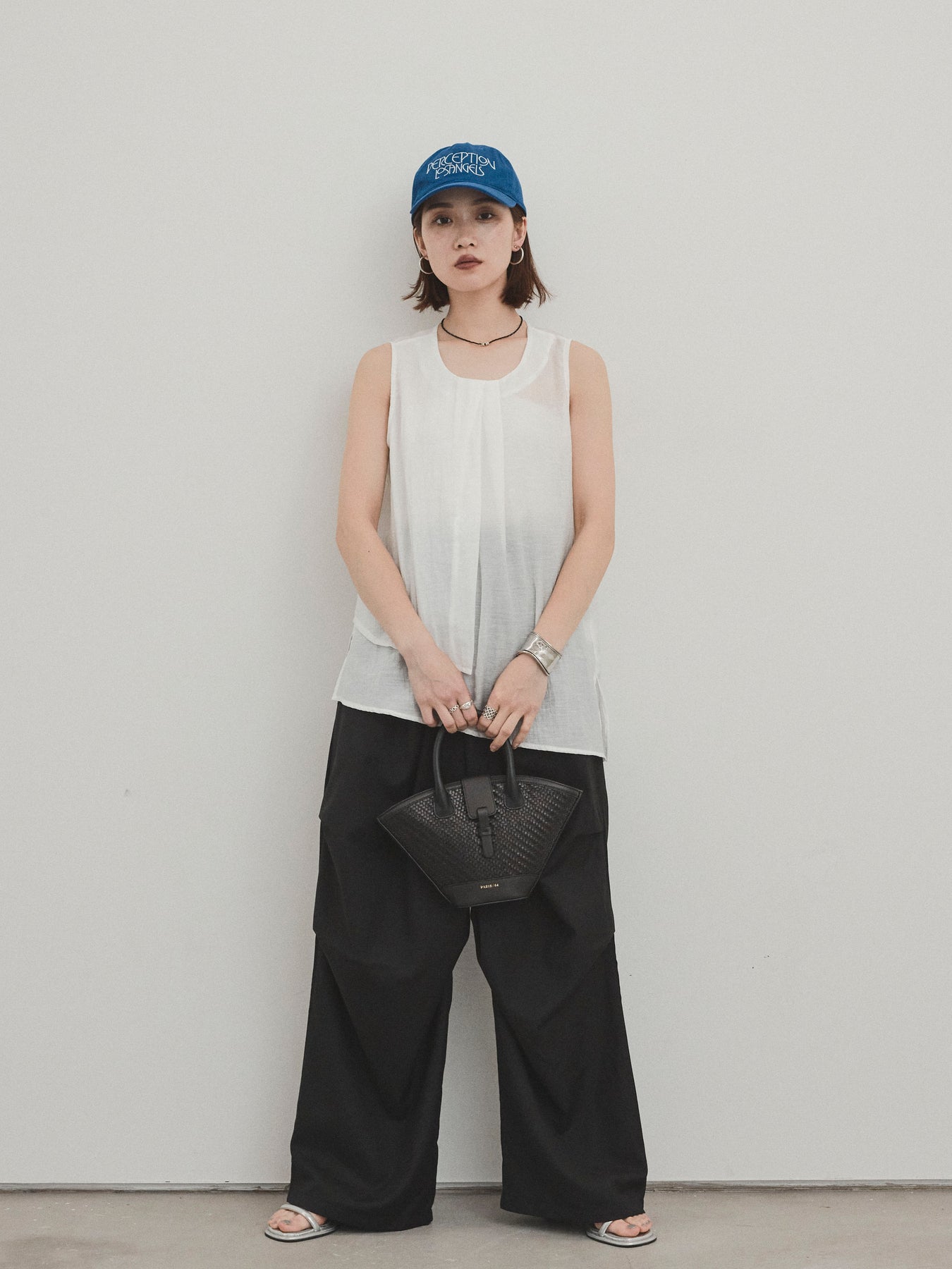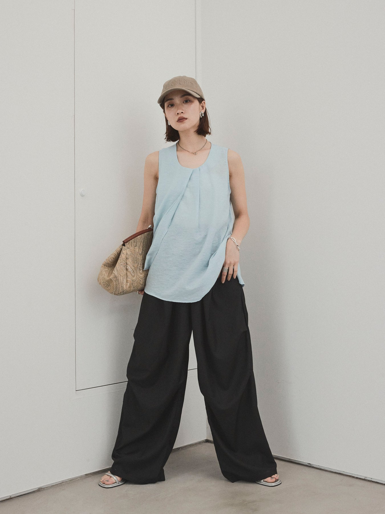[SET] 透視褶皺不對稱上衣 + 設計環側褶褲 (2 件組)