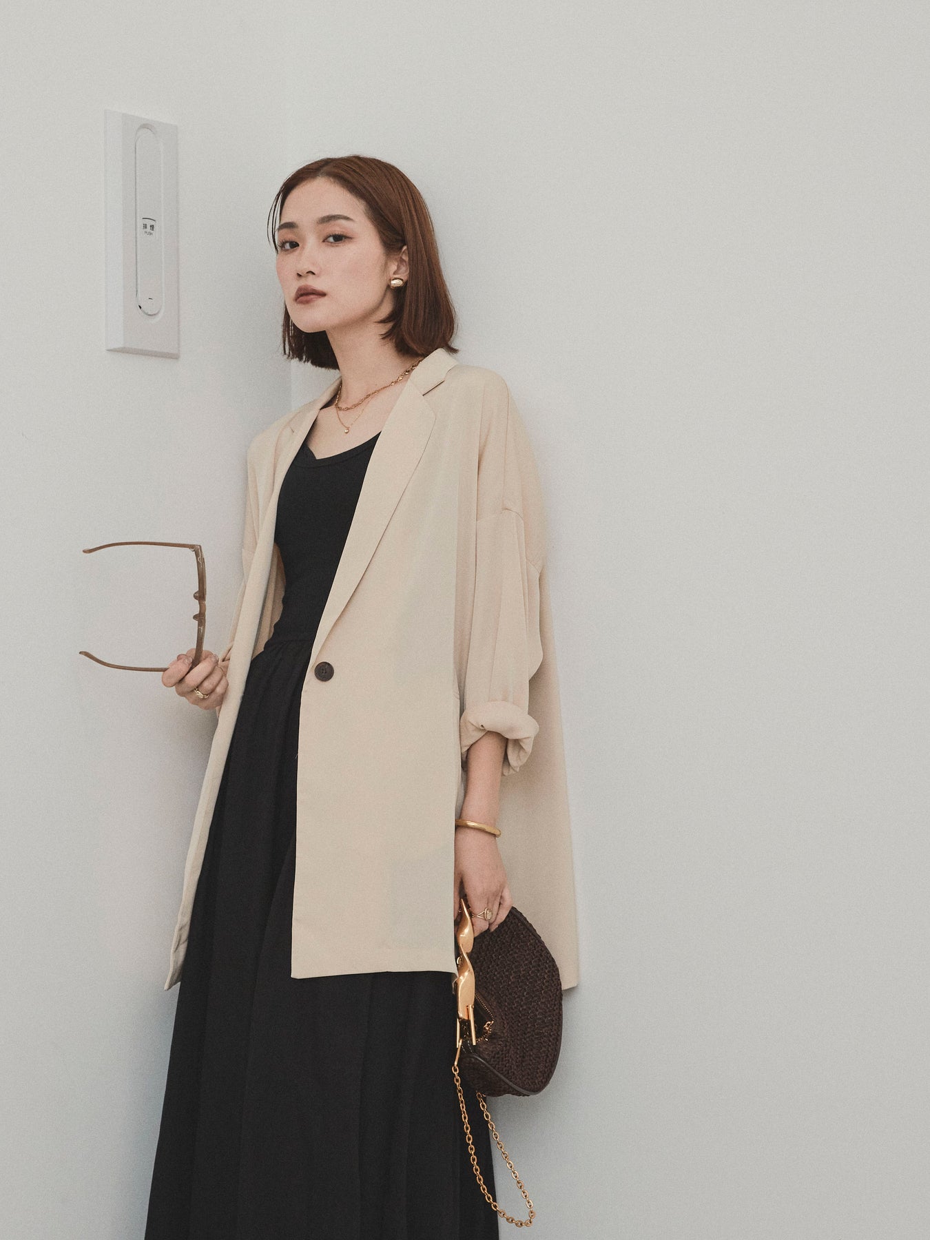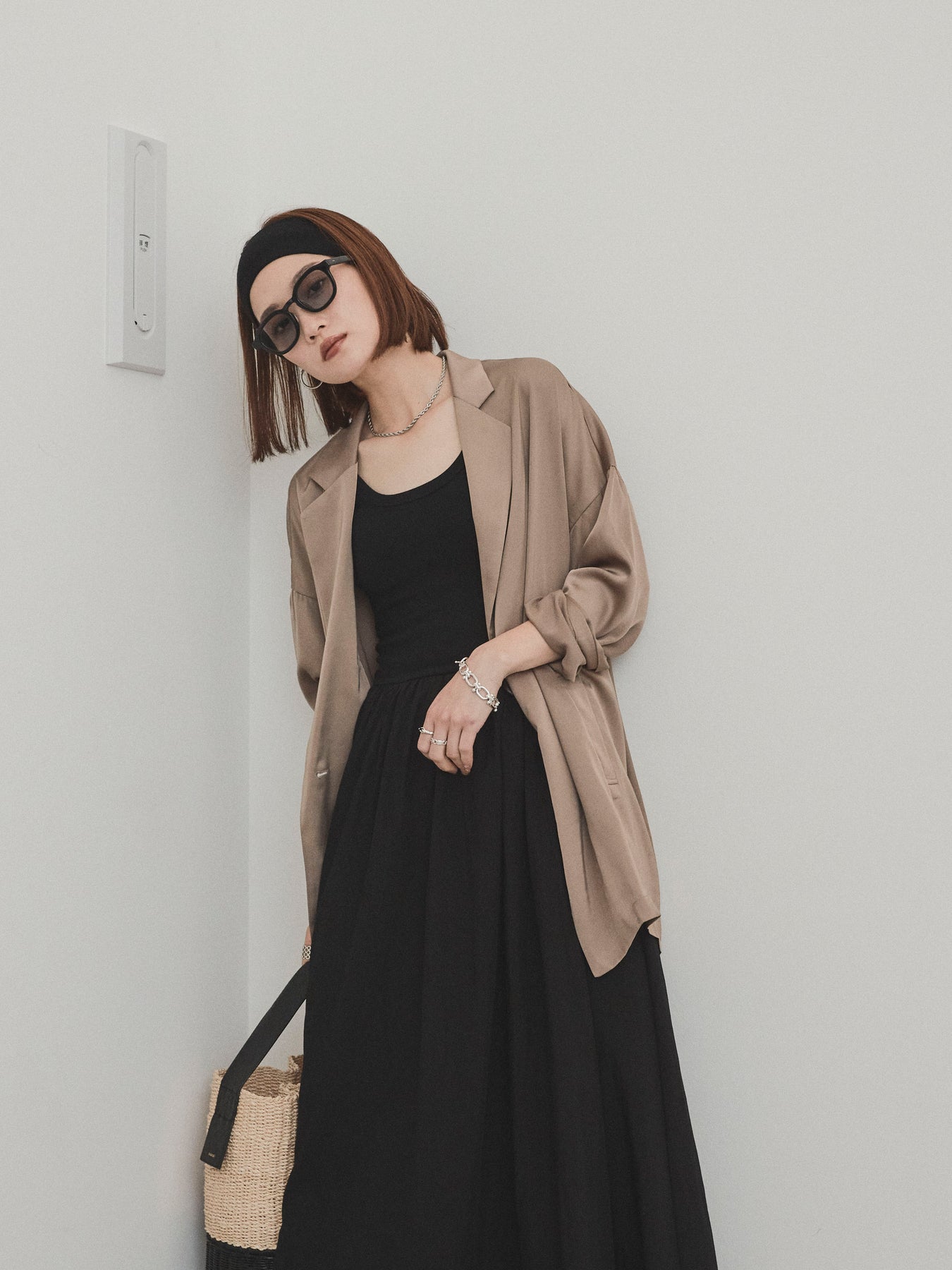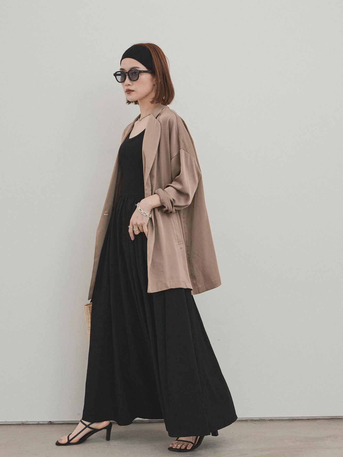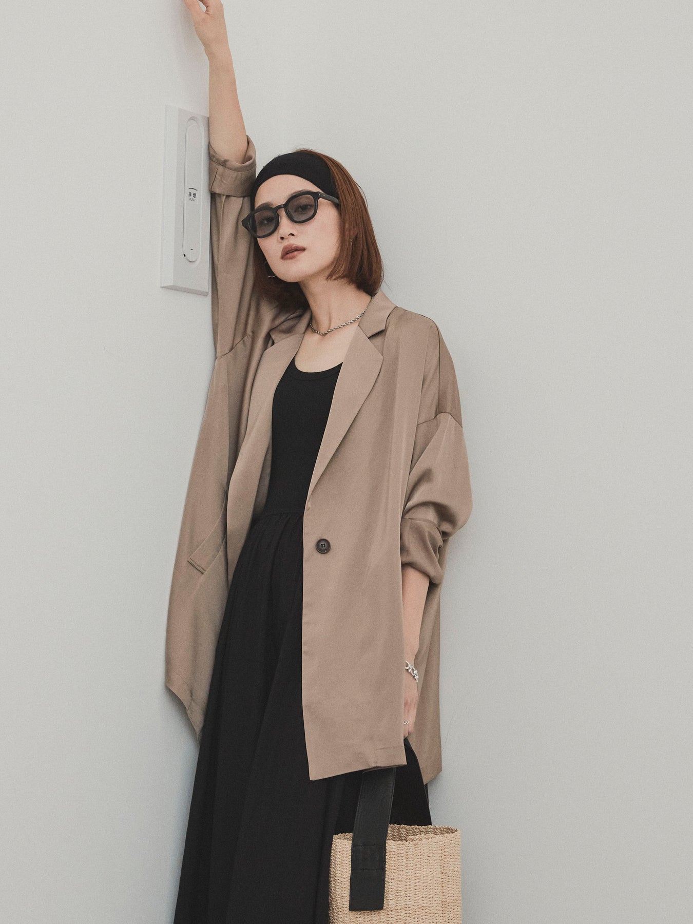 這款輕便外套採用霧面緞面材質製成,光澤度適中,營造出優雅而輕鬆的外觀。 光滑的垂墜自然貼合身體,只需穿上即可展現精緻的外觀。 它具有寬鬆的超大輪廓,並由輕質材料製成,易於穿戴。 捲起的袖子和自然的垂墜感賦予設計一種精緻的感覺。 只需搭配 T 卹或背心即可展現輕鬆休閒風格,或搭配洋裝和休閒褲即可展現更優雅的外觀。 這是一件適合四季穿著的服裝,它將成為您衣櫃中的必備品。