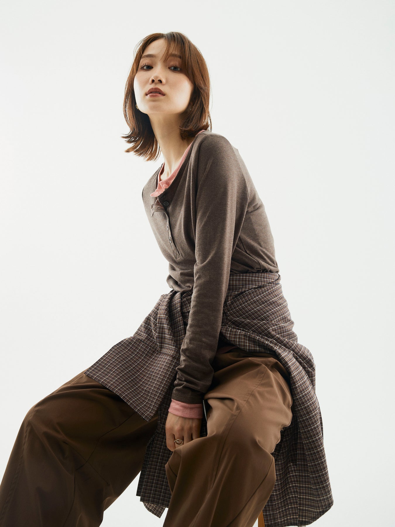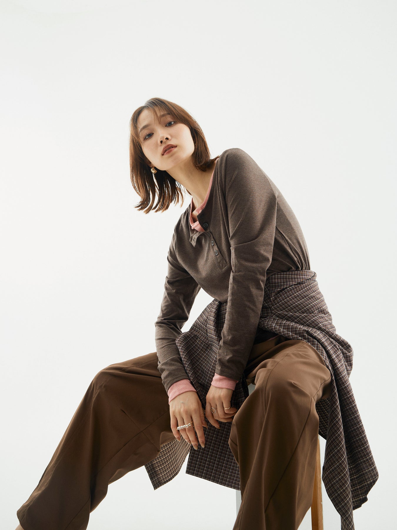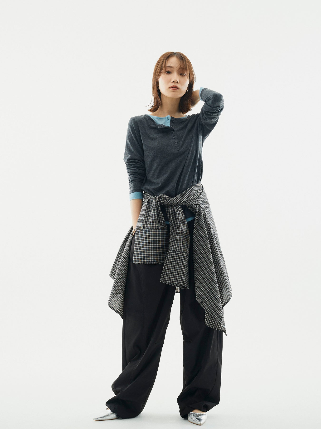 【Allure】[SET]配色レイヤードヘンリーネックトップス+タフタワイドカーブパンツ+チェックBIGカフスオーバーシャツ(3set)