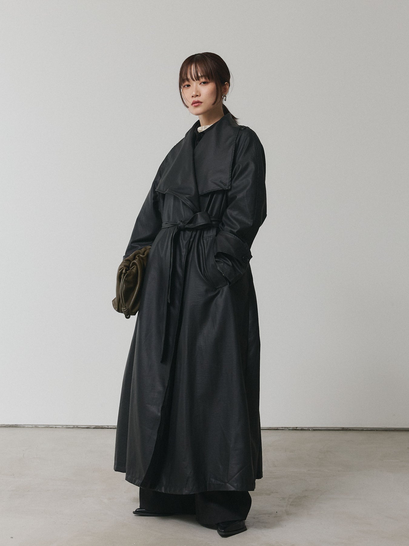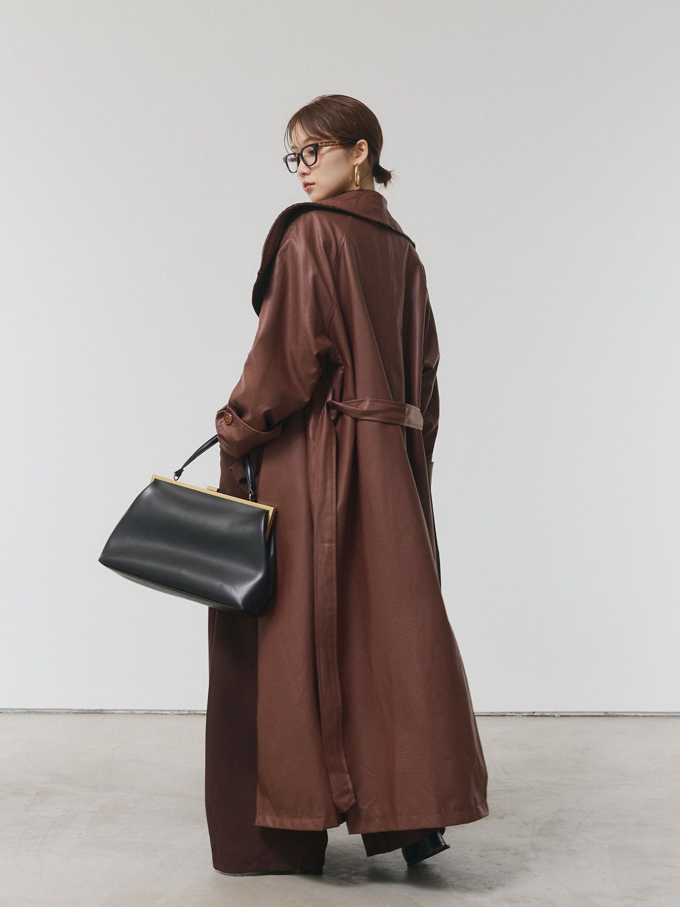 存在感のあるビッグカラーが印象的なレザーロングコート。ロング丈のシルエットがスタイルを引き締め、羽織るだけでモード感漂うスタイリングを完成させます。しなやかなレザー調素材は軽やかさと高級感を兼ね備え、デイリーから特別なシーンまで幅広く活躍。ウエストには共布ベルト付きで、シルエットを変化させながら着こなせるのも魅力です。さらりと羽織れば大人の余裕を感じさせ、ベルトを締めれば女性らしいメリハリのあるスタイルに。シーズンの主役としてワードローブに加えたい一枚です。 ※ボトムス、キャミソール(インナー)以外の商品は一律でインナーは付属していません。