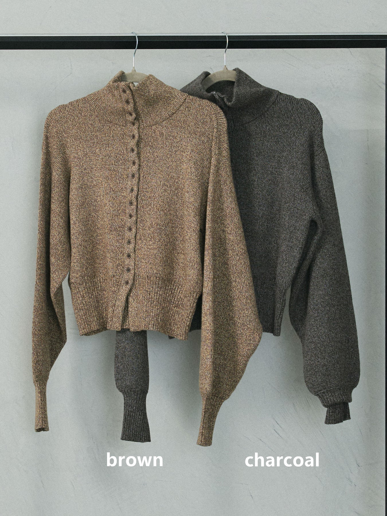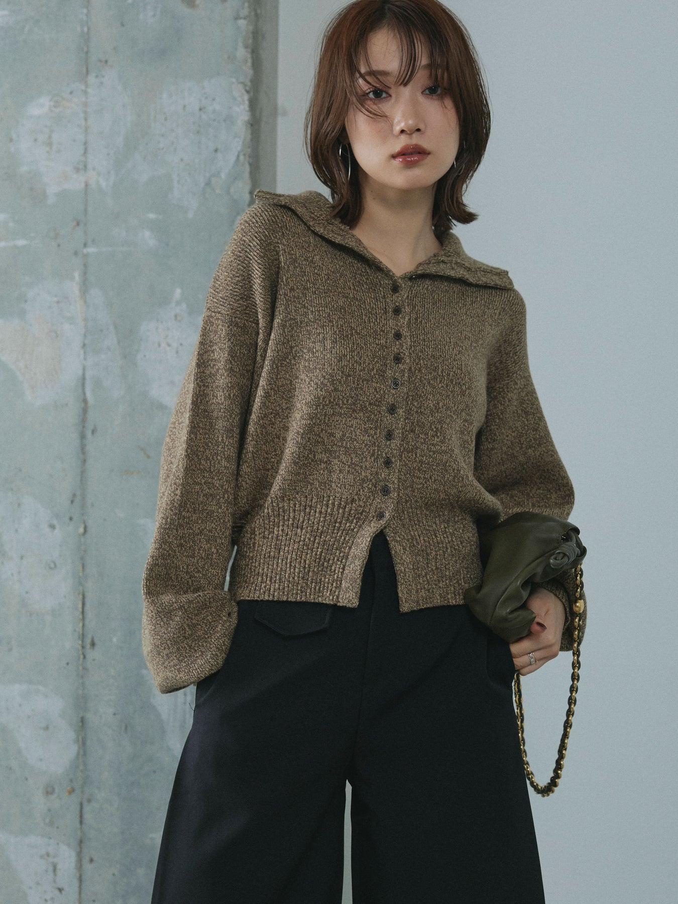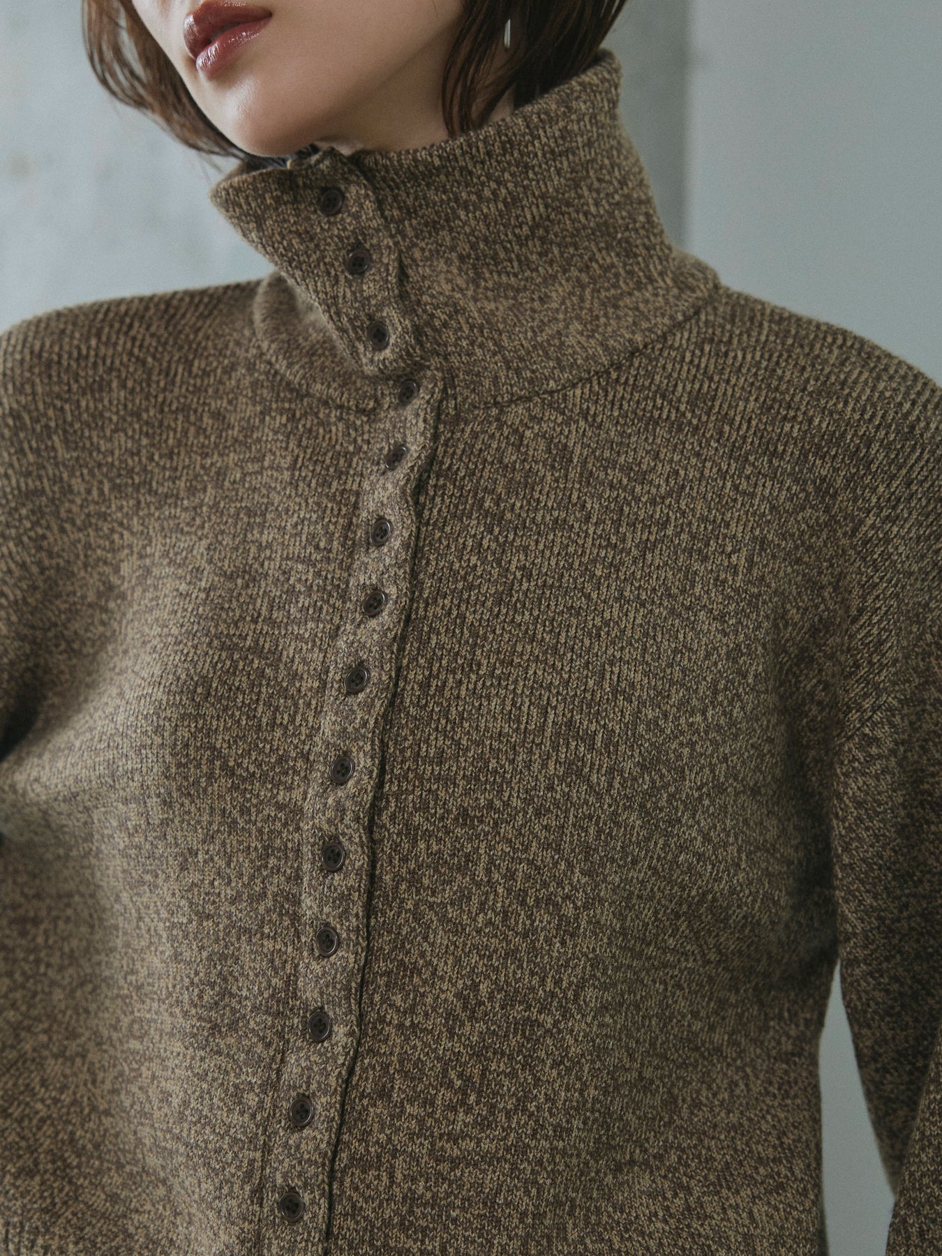 ざっくりとした編地と柔らかな風合いが魅力のハイネックカーディガン。 ミックス調の糸が生み出す奥行きのある表情が、シンプルな着こなしにも程よい存在感をプラスします。 首元まで包み込むハイネックデザインで、寒い季節も暖かく、羽織るだけでこなれた印象に。 ゆったりとしたシルエットながらも、リブの切り替えで全体がすっきり見えるバランスに仕上げました。 デイリーにはもちろん、リラックス感のあるスタイリングにもおすすめの一枚。 ※ボトムス、キャミソール(インナー)以外の商品は一律でインナーは付属していません。