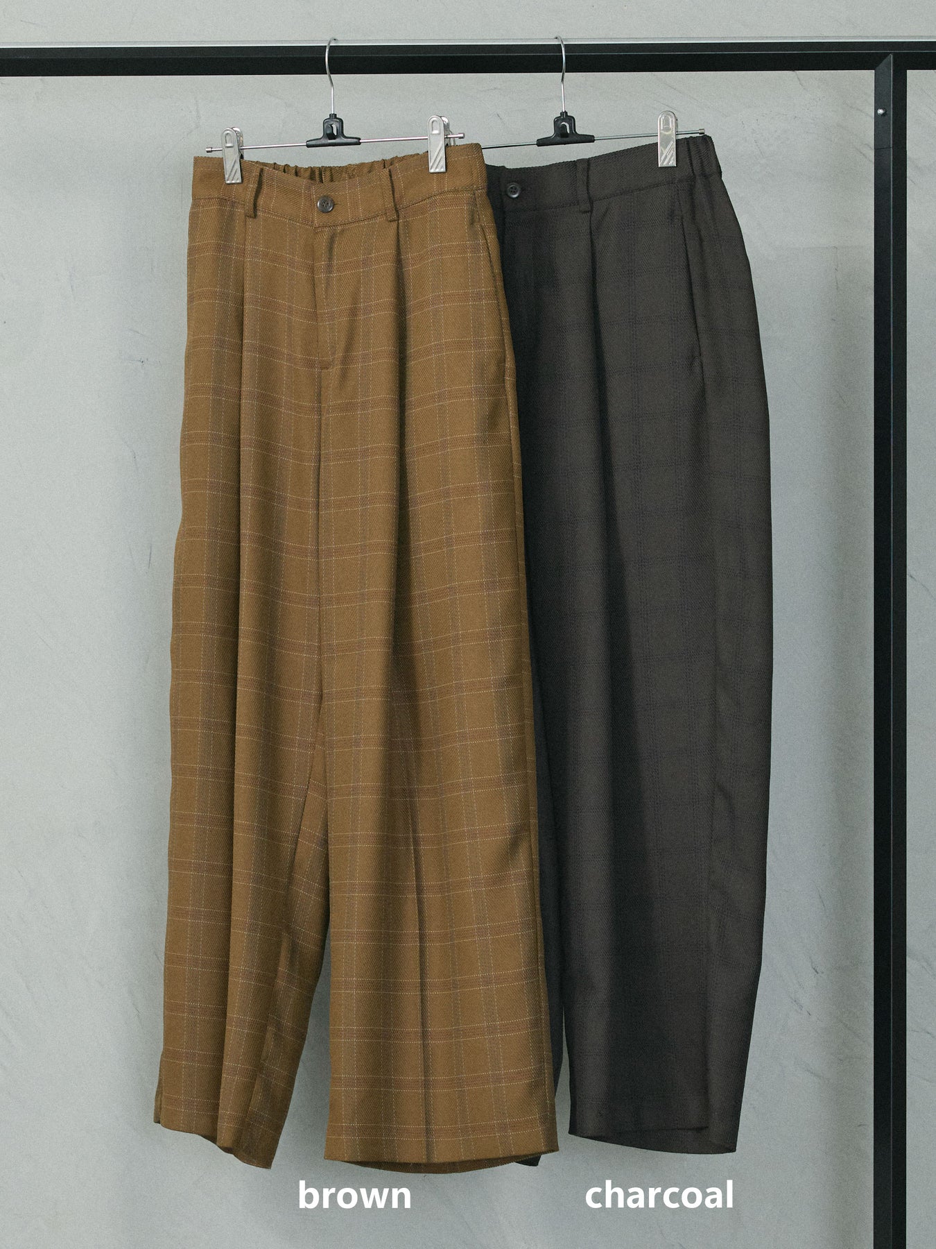 クラシカルなチェック柄と杢調の生地感が上品な印象を与えるタックパンツ。 フロントに施されたタックが立体感を生み、脚のラインをすっきりと見せてくれます。 程よくゆとりのあるシルエットで動きやすく、リラックス感のある穿き心地が魅力。 トップスをインしたスタイルもきれいに決まり、通勤から休日まで幅広いシーンで活躍します。 同素材のシャツジャケットと合わせたセットアップコーデもおすすめです。