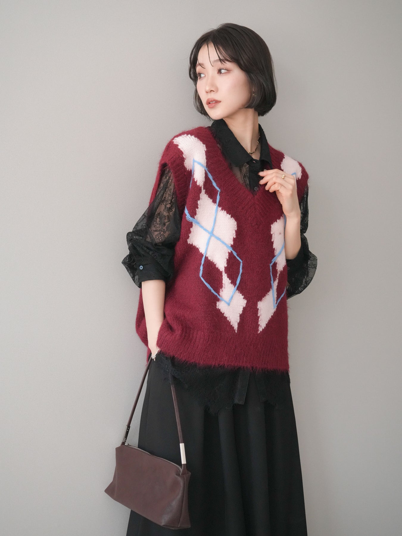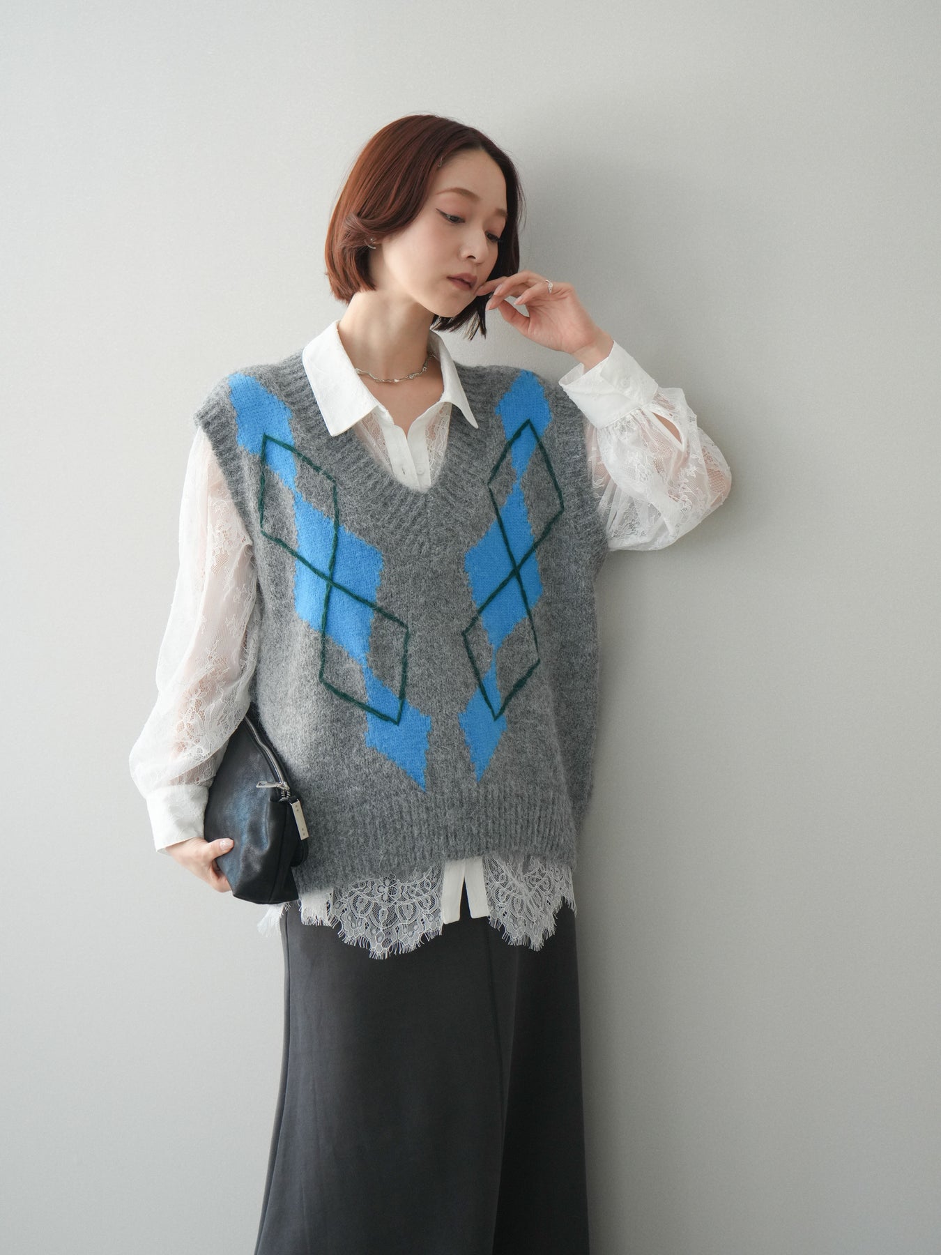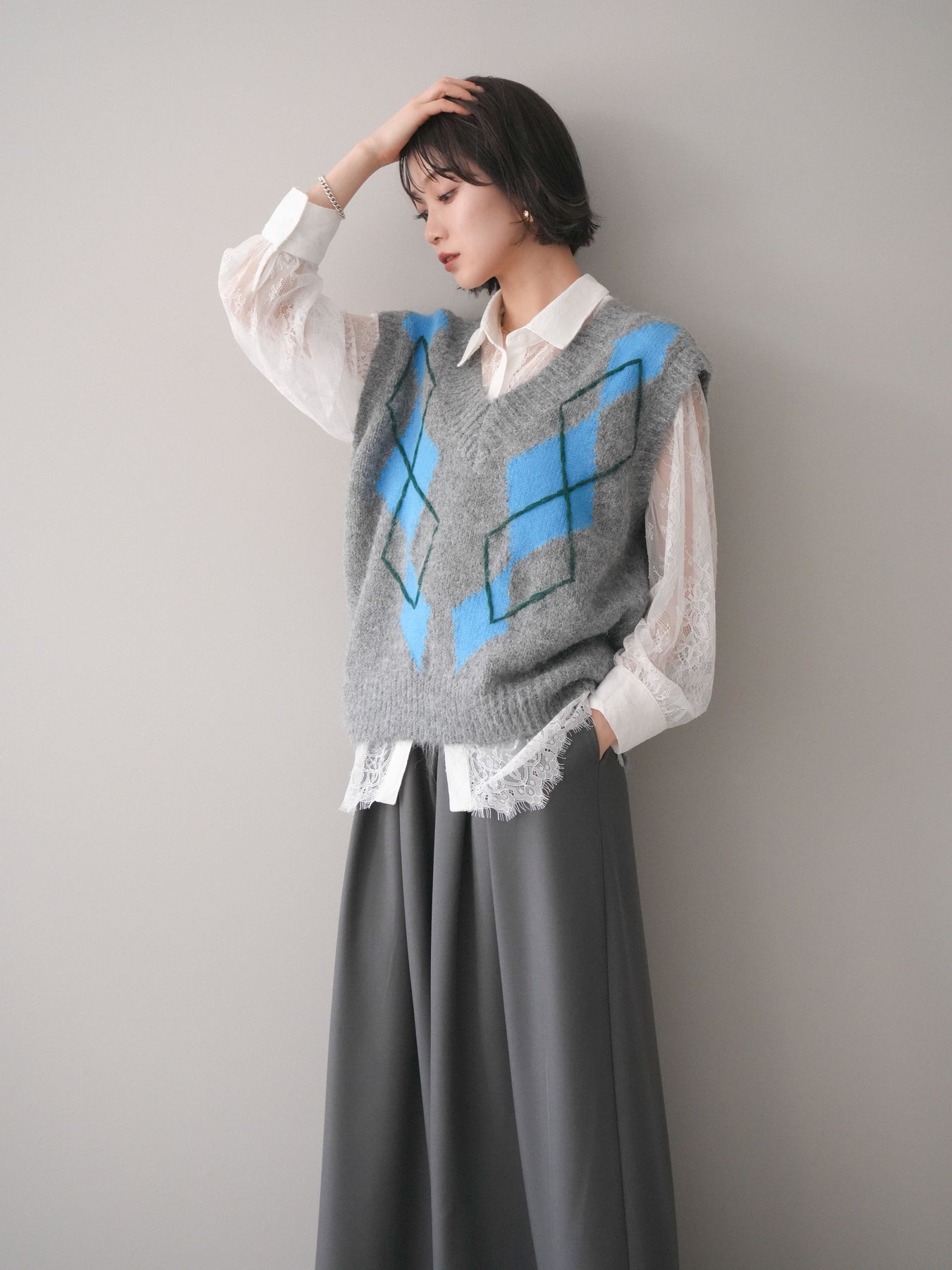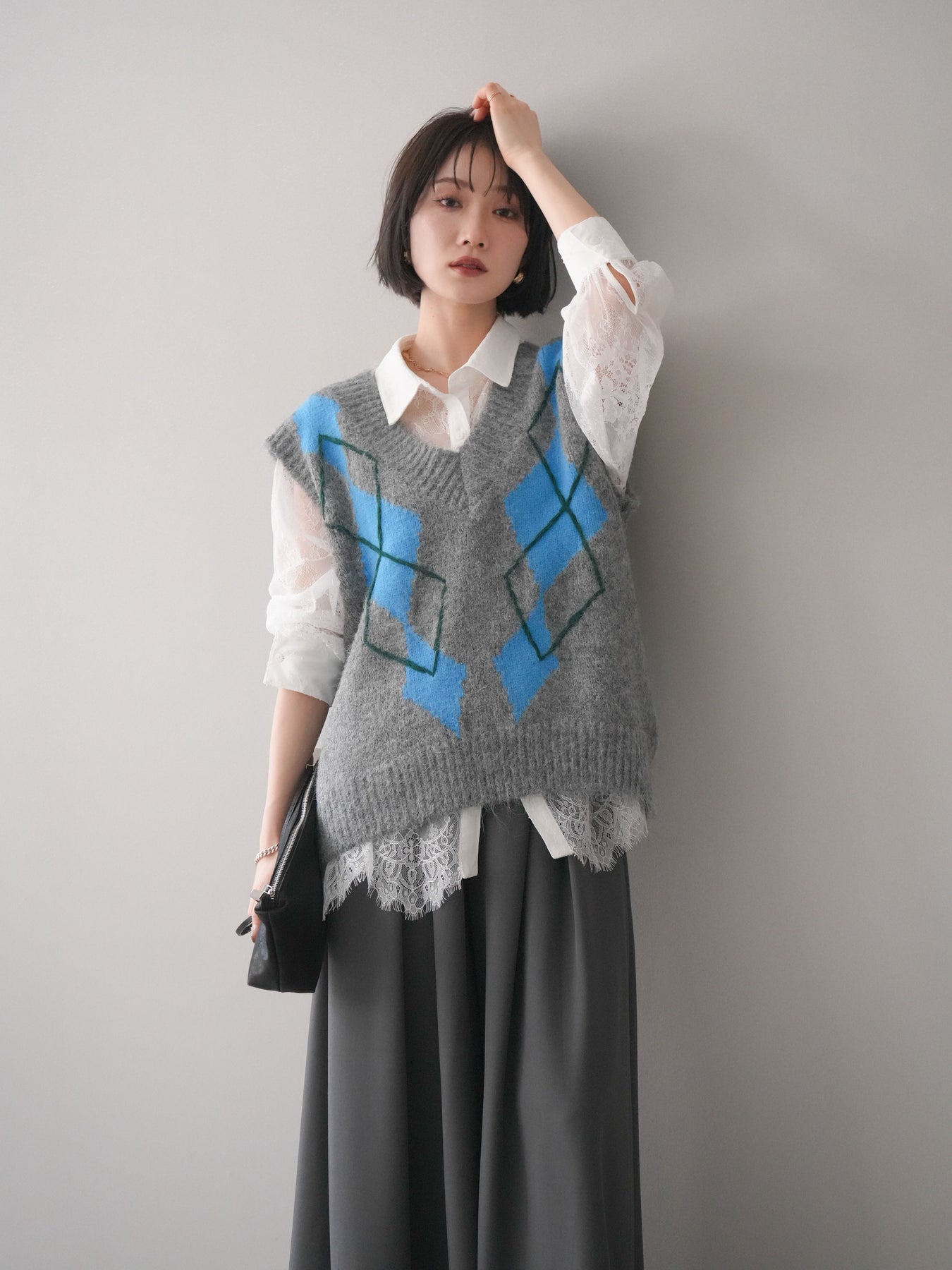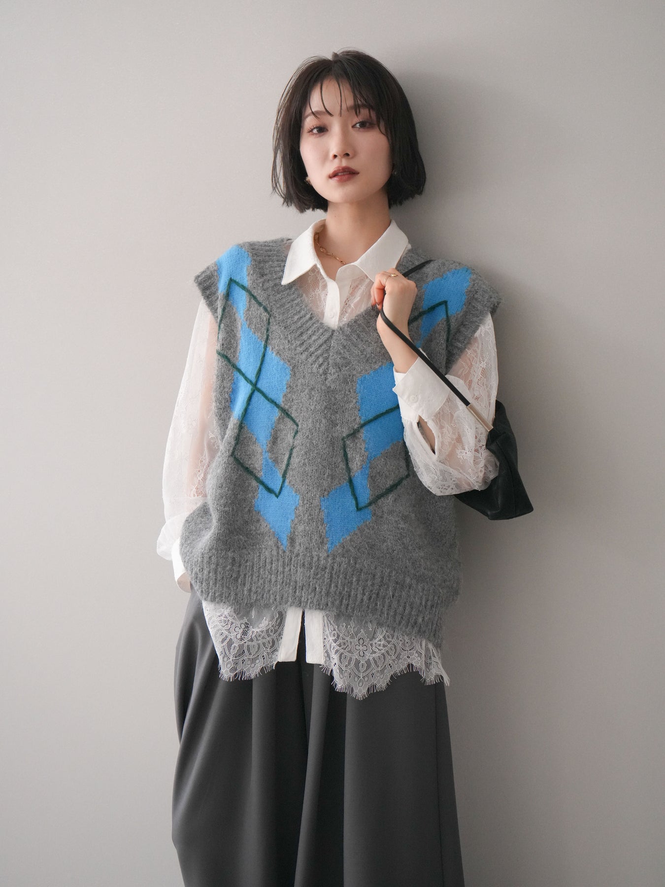 クラシカルなアーガイル柄をアクセントにしたVネックニットベスト。存在感のある柄デザインに、ステッチ風のディテールを重ねることで、シンプルなスタイリングにも奥行きをプラスします。程よくゆとりのあるサイズ感で、シャツやカットソー、ワンピースなど幅広いアイテムとのレイヤードが楽しめる一着。Vネック仕様が顔まわりをすっきりと見せ、カジュアルにもきれいめにも馴染むため、シーズンを通して着回し力の高いアイテムです。 ※ボトムス、キャミソール(インナー)以外の商品は一律でインナーは付属していません。
