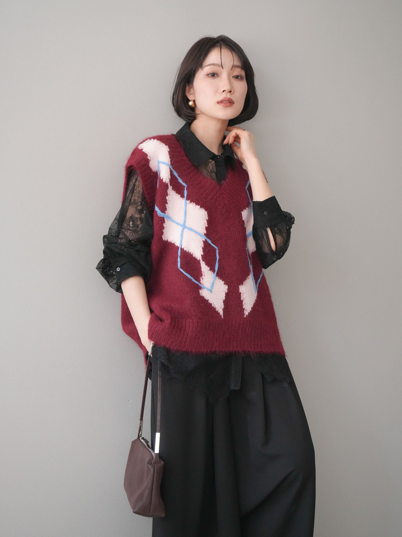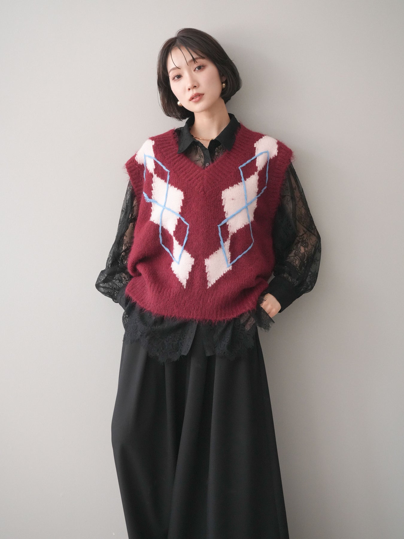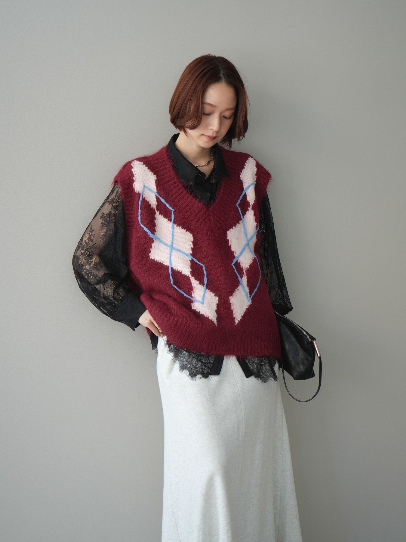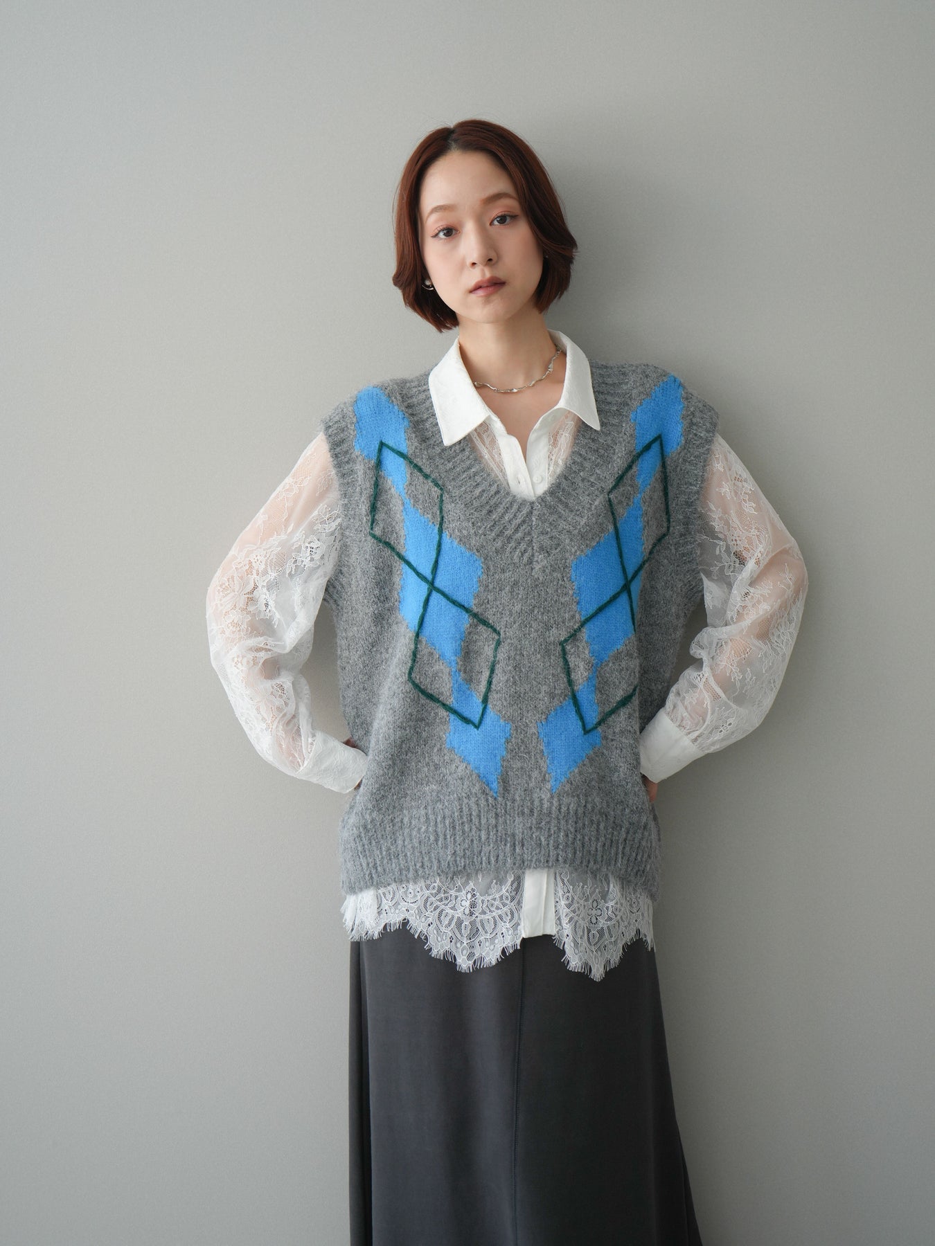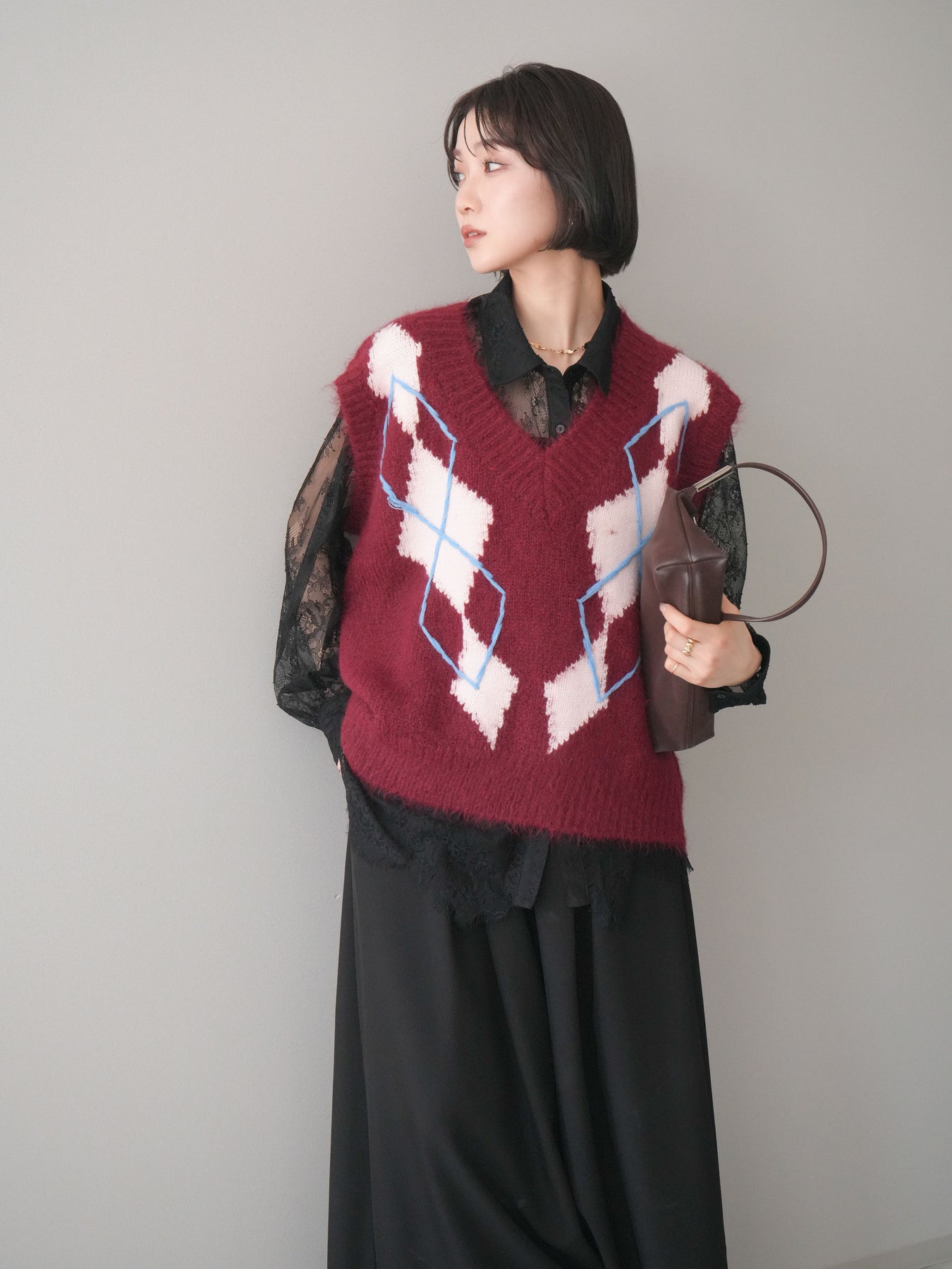 クラシカルなアーガイル柄をアクセントにしたVネックニットベスト。存在感のある柄デザインに、ステッチ風のディテールを重ねることで、シンプルなスタイリングにも奥行きをプラスします。程よくゆとりのあるサイズ感で、シャツやカットソー、ワンピースなど幅広いアイテムとのレイヤードが楽しめる一着。Vネック仕様が顔まわりをすっきりと見せ、カジュアルにもきれいめにも馴染むため、シーズンを通して着回し力の高いアイテムです。 ※ボトムス、キャミソール(インナー)以外の商品は一律でインナーは付属していません。