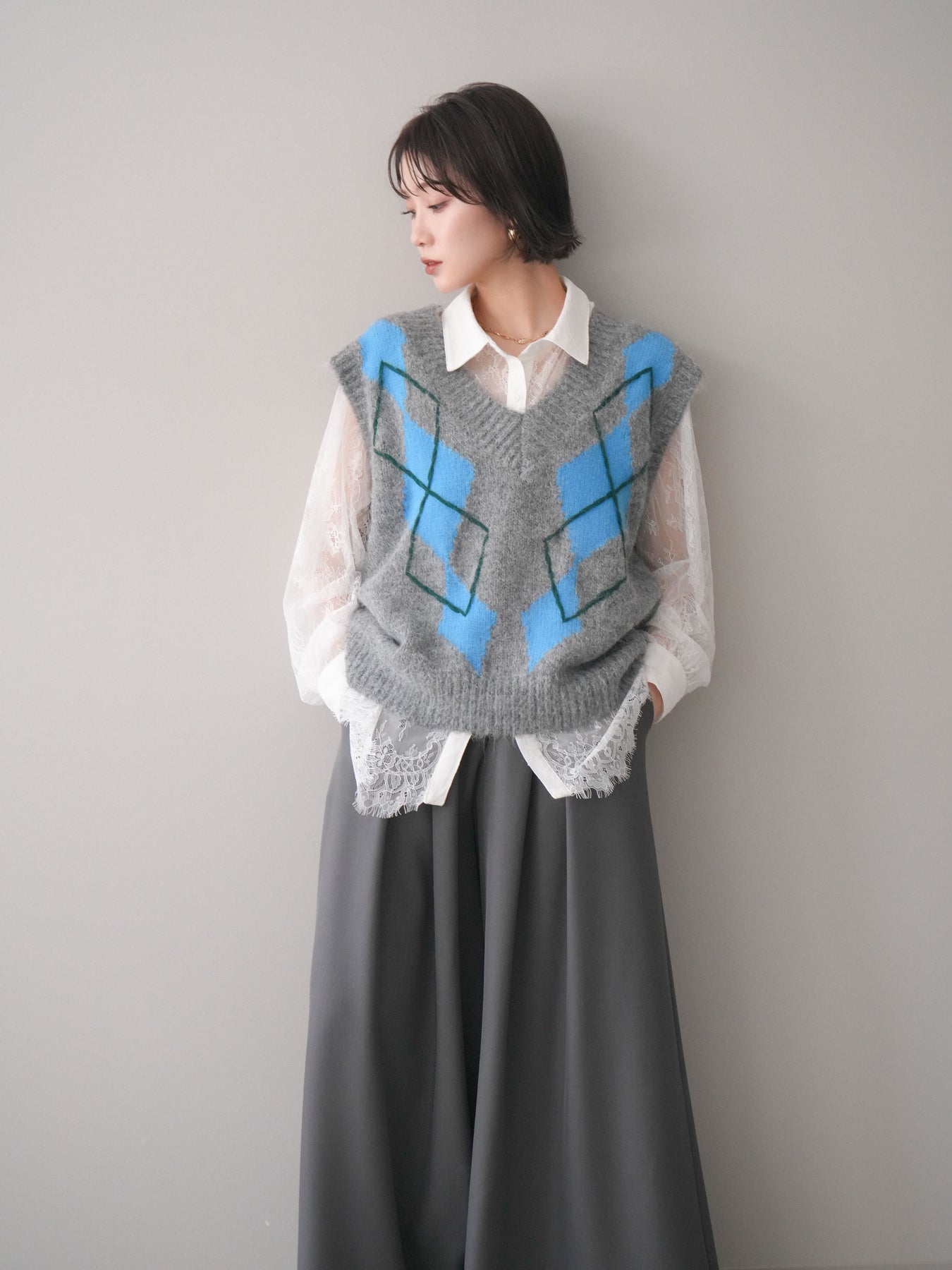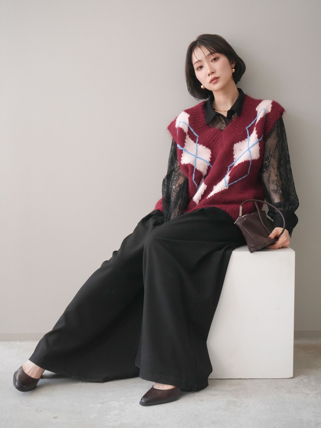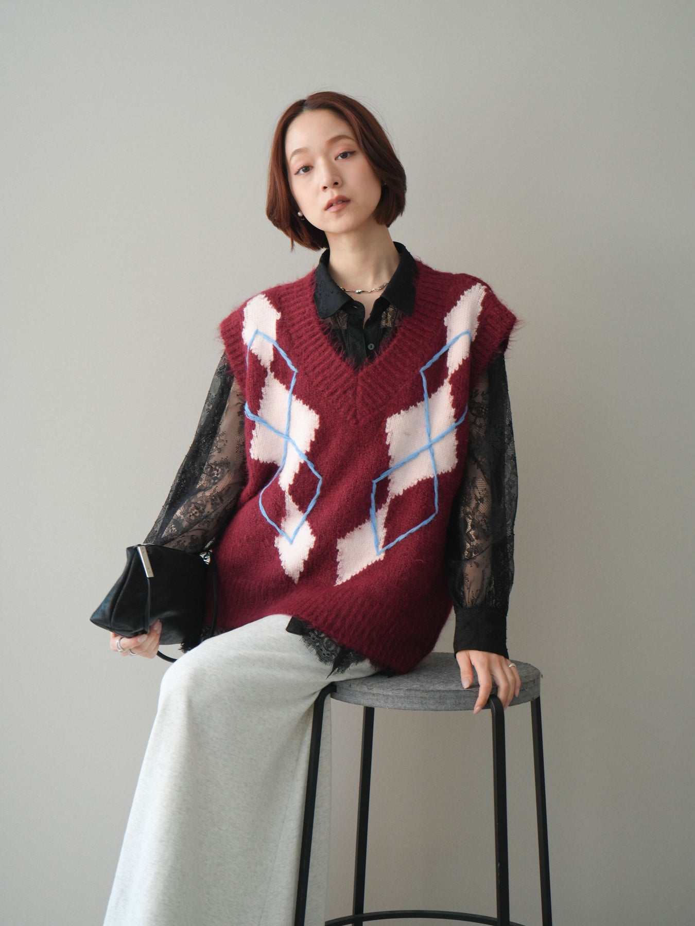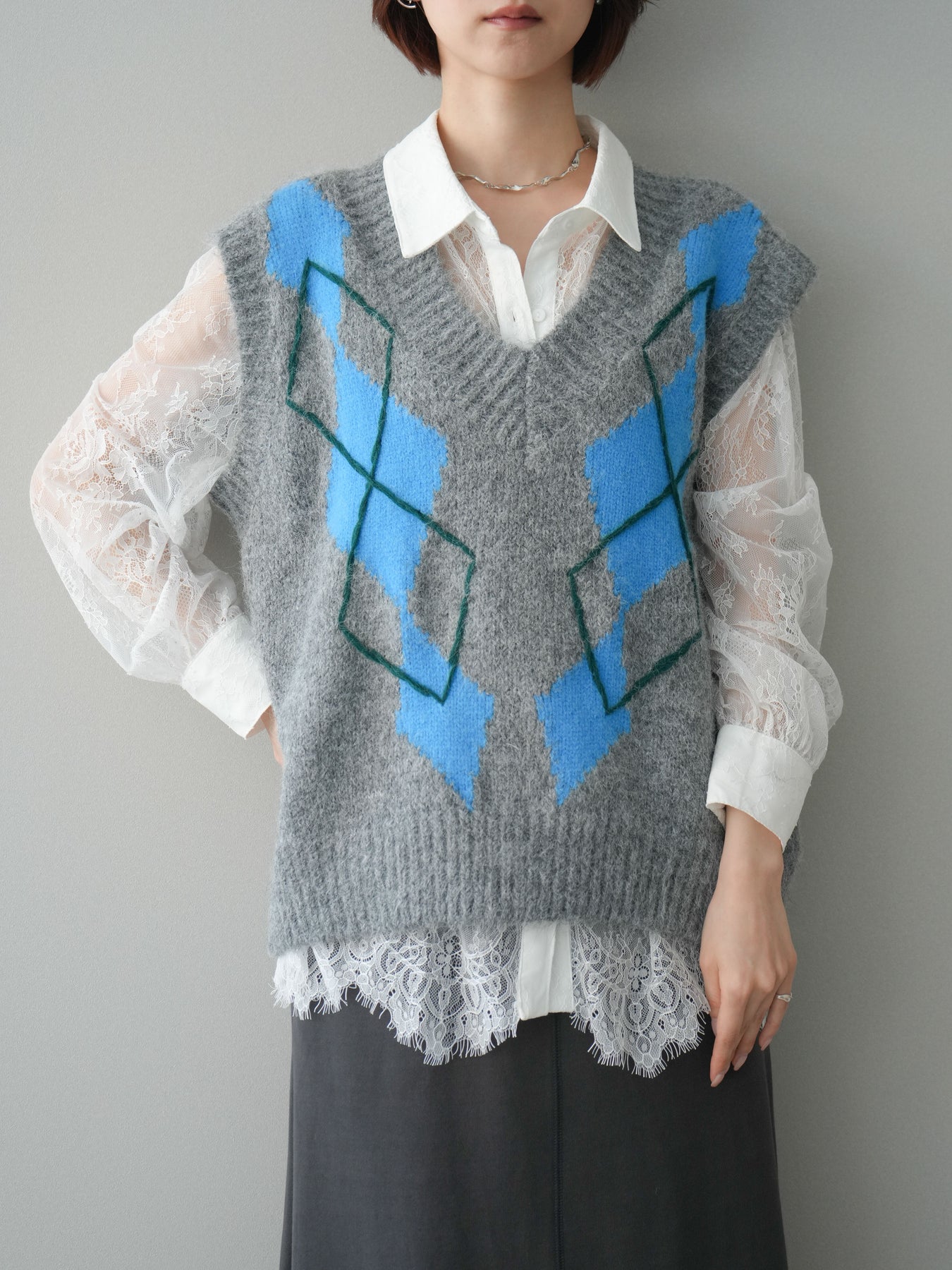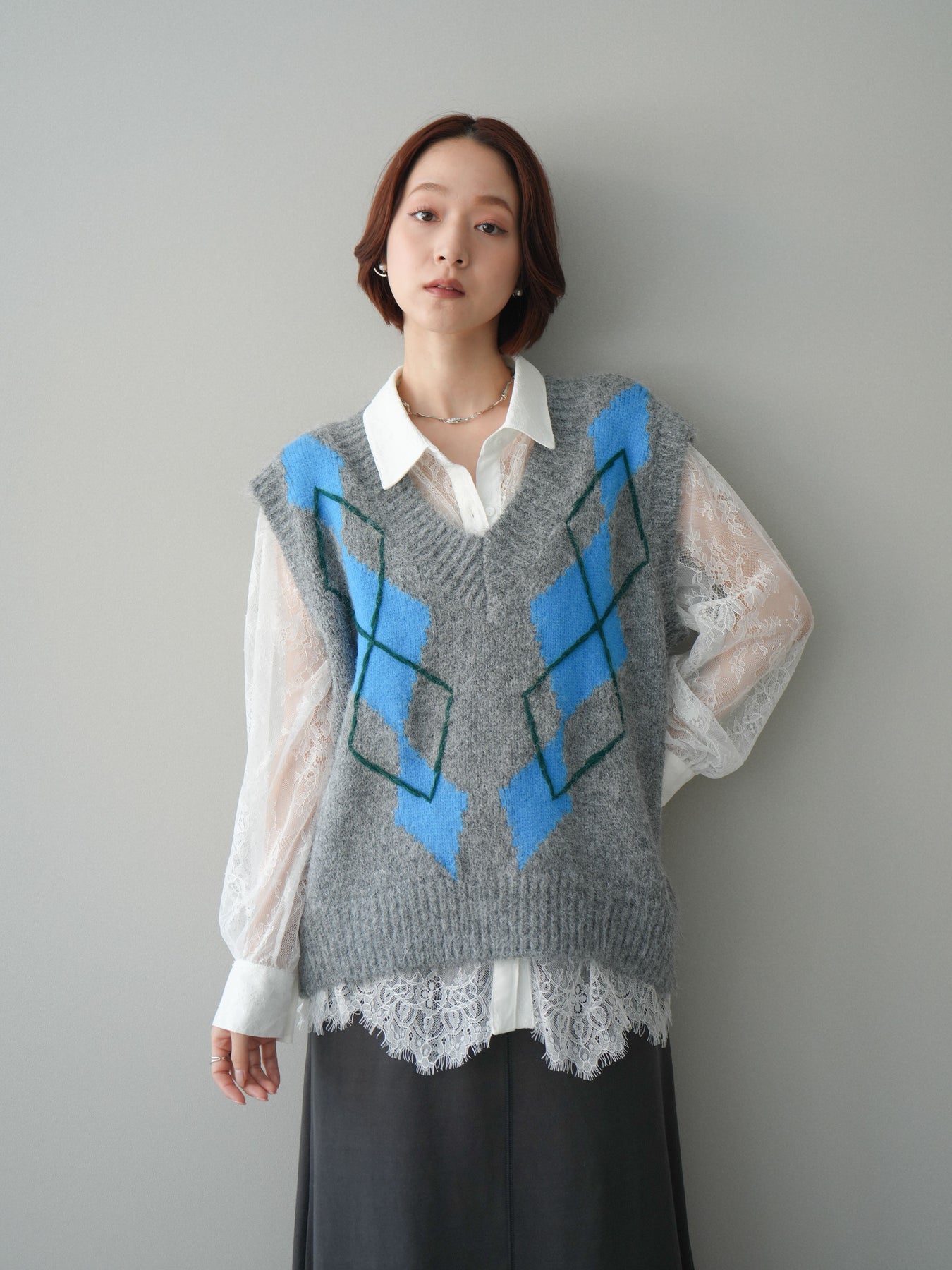 クラシカルなアーガイル柄をアクセントにしたVネックニットベスト。存在感のある柄デザインに、ステッチ風のディテールを重ねることで、シンプルなスタイリングにも奥行きをプラスします。程よくゆとりのあるサイズ感で、シャツやカットソー、ワンピースなど幅広いアイテムとのレイヤードが楽しめる一着。Vネック仕様が顔まわりをすっきりと見せ、カジュアルにもきれいめにも馴染むため、シーズンを通して着回し力の高いアイテムです。 ※ボトムス、キャミソール(インナー)以外の商品は一律でインナーは付属していません。