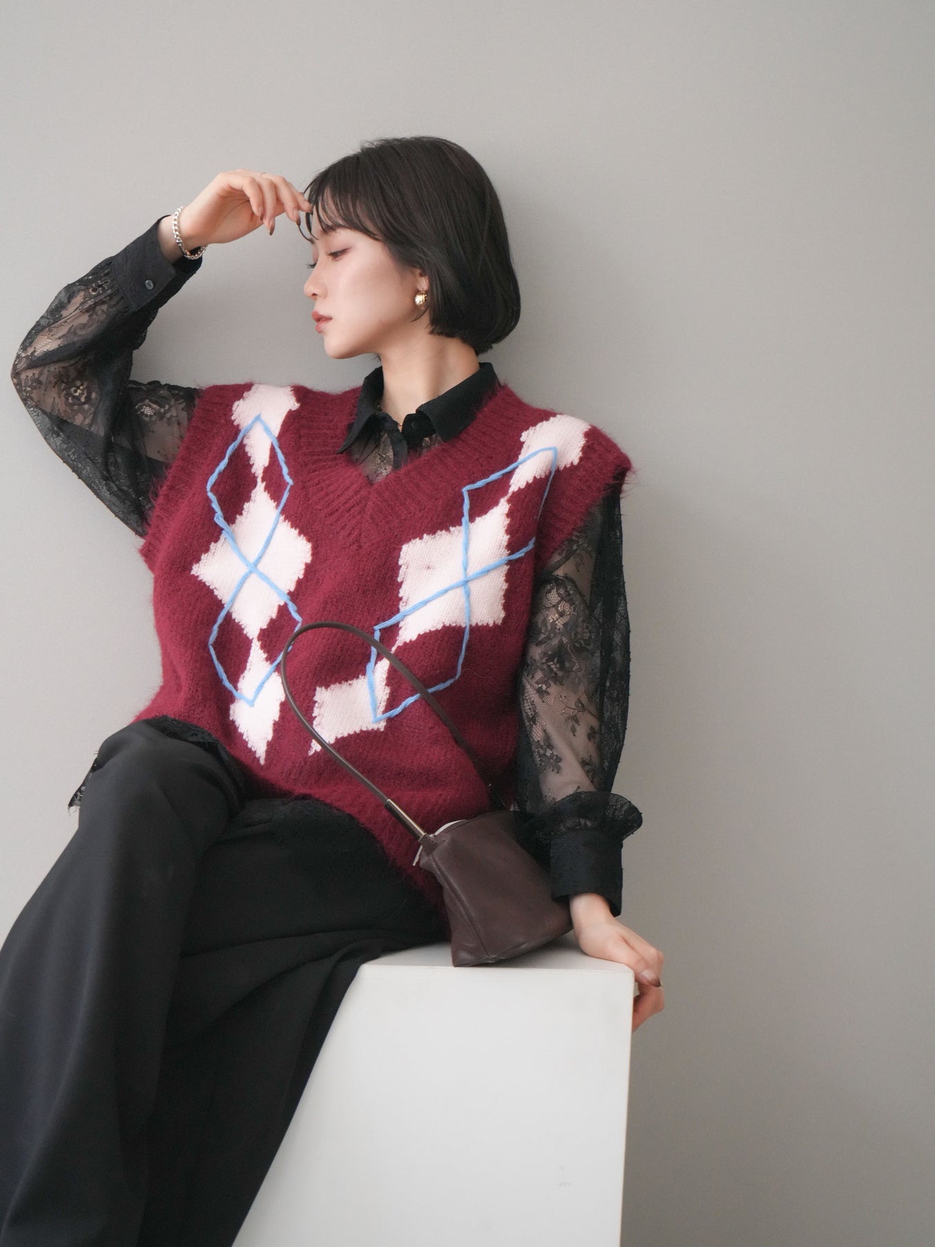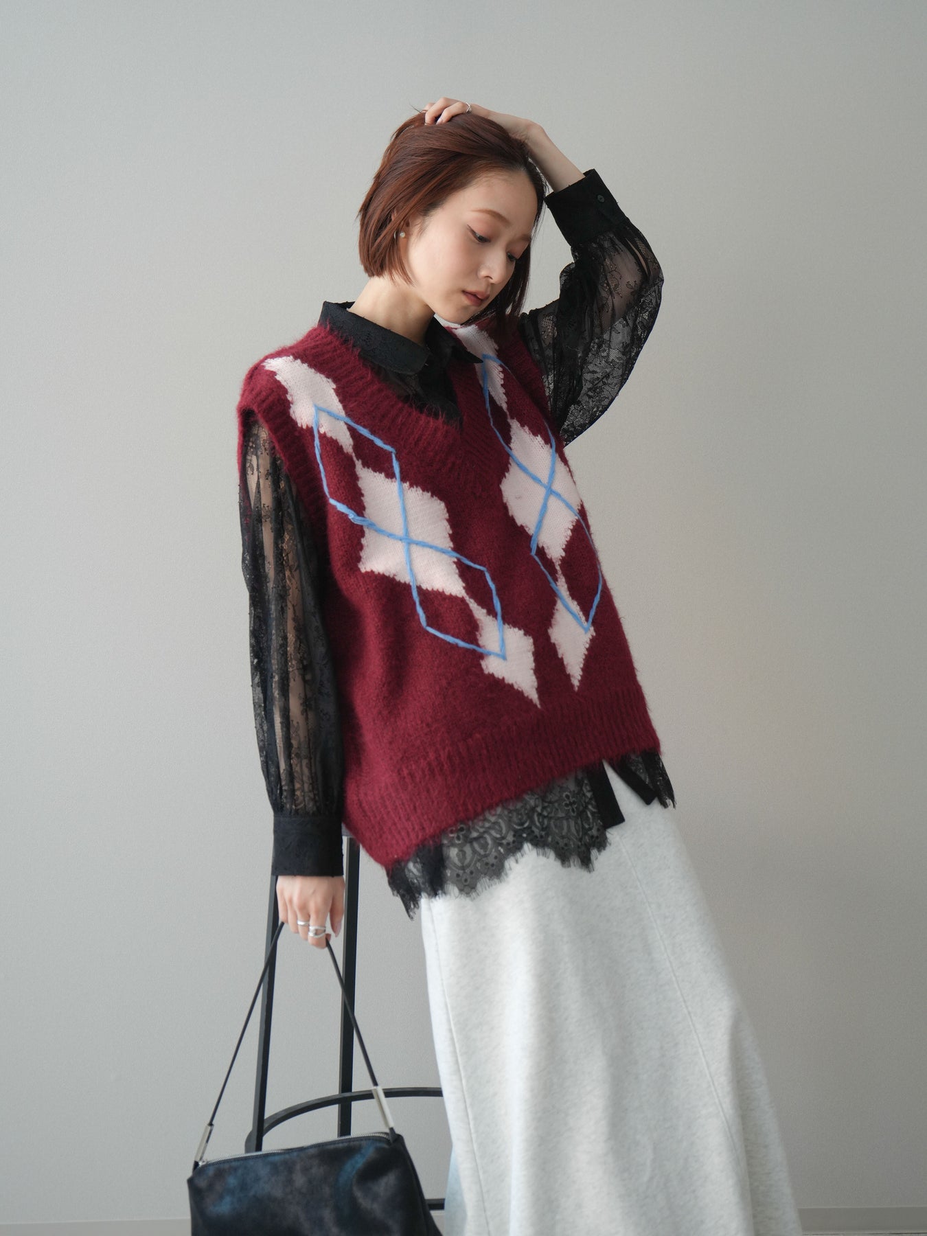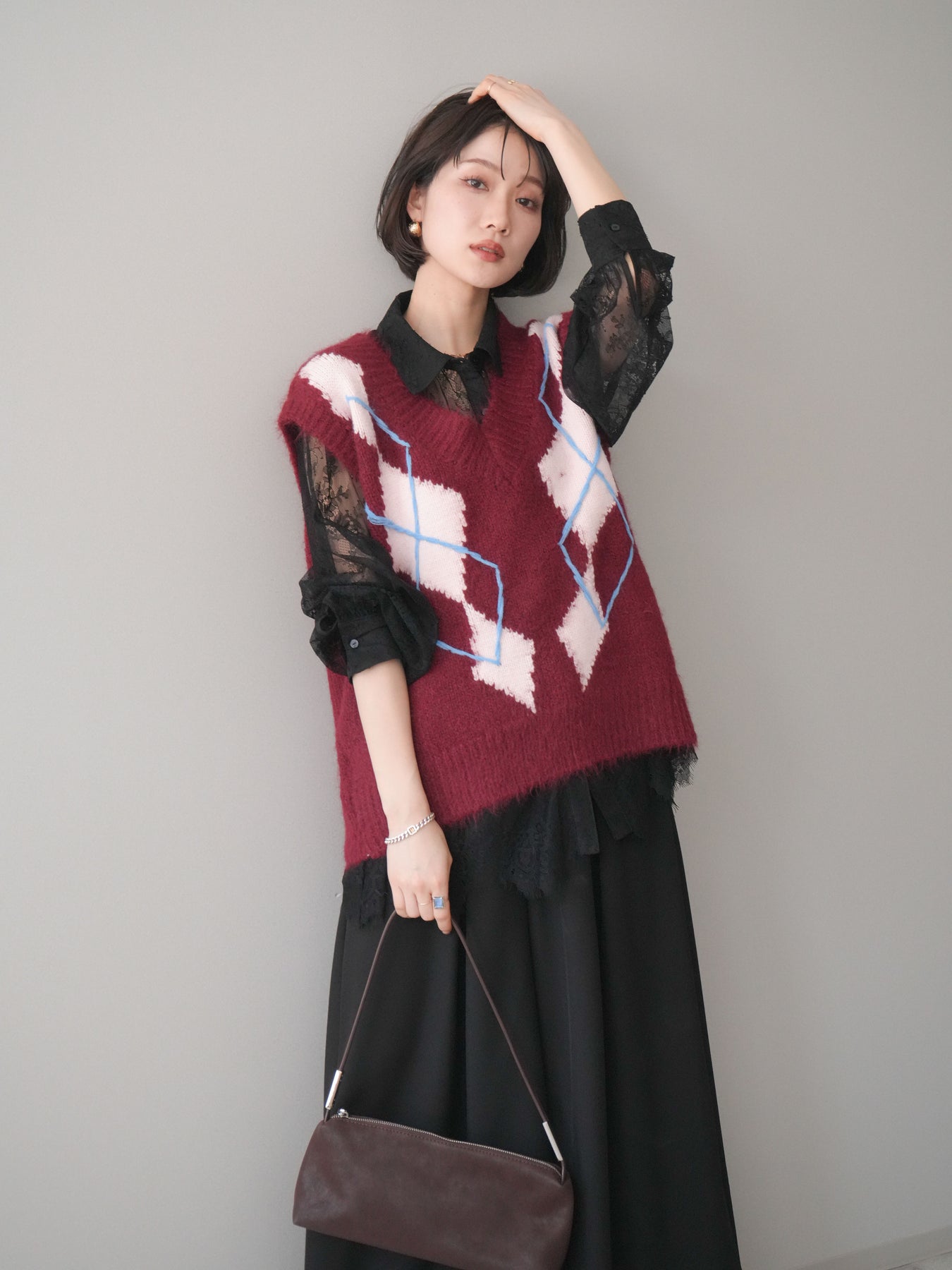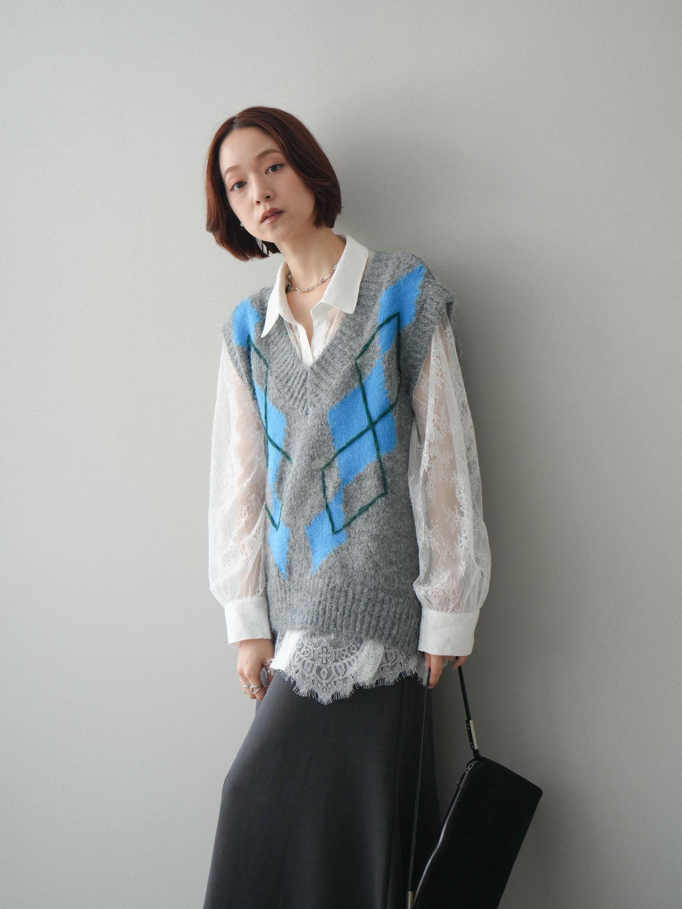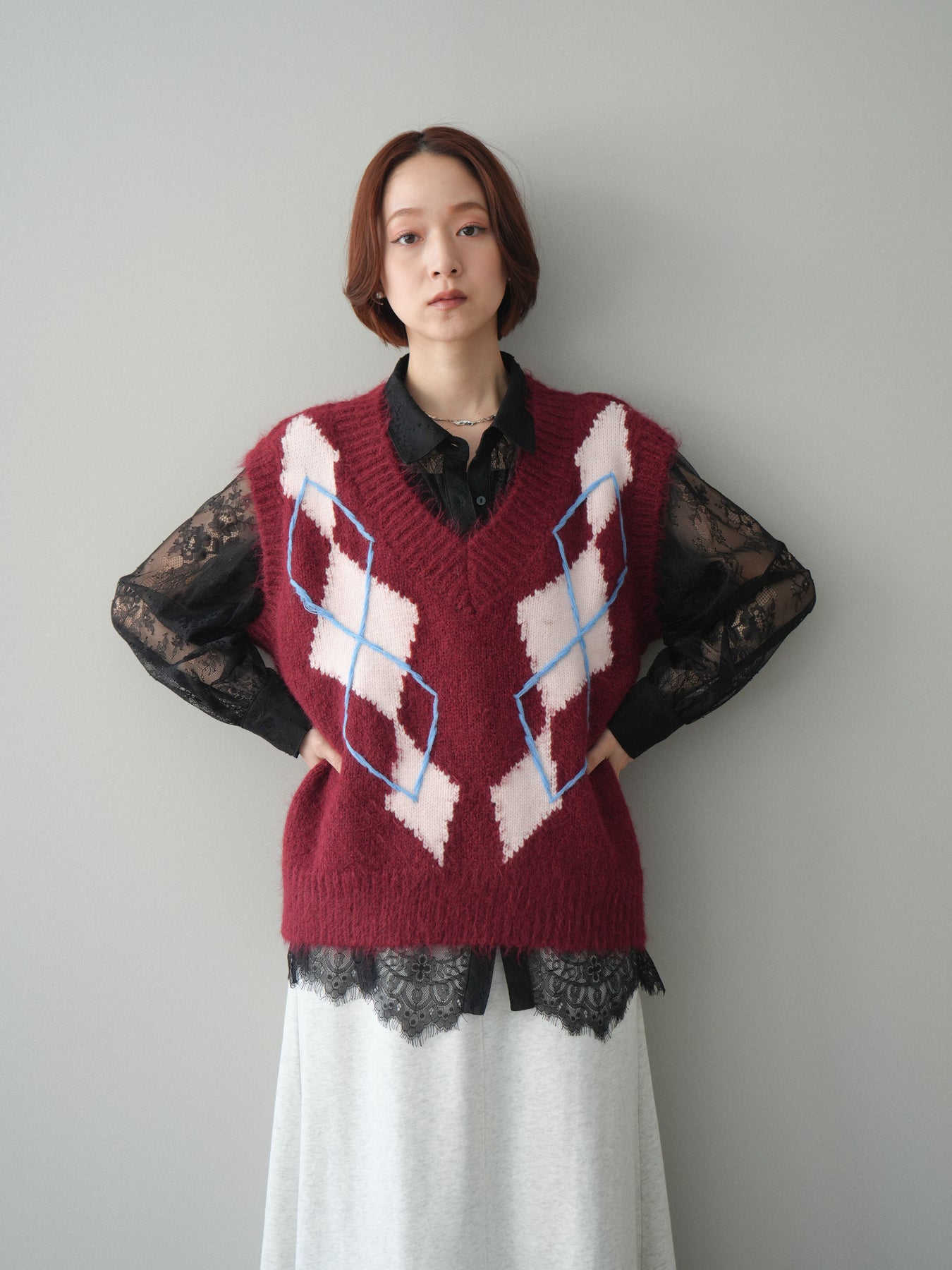 クラシカルなアーガイル柄をアクセントにしたVネックニットベスト。存在感のある柄デザインに、ステッチ風のディテールを重ねることで、シンプルなスタイリングにも奥行きをプラスします。程よくゆとりのあるサイズ感で、シャツやカットソー、ワンピースなど幅広いアイテムとのレイヤードが楽しめる一着。Vネック仕様が顔まわりをすっきりと見せ、カジュアルにもきれいめにも馴染むため、シーズンを通して着回し力の高いアイテムです。 ※ボトムス、キャミソール(インナー)以外の商品は一律でインナーは付属していません。