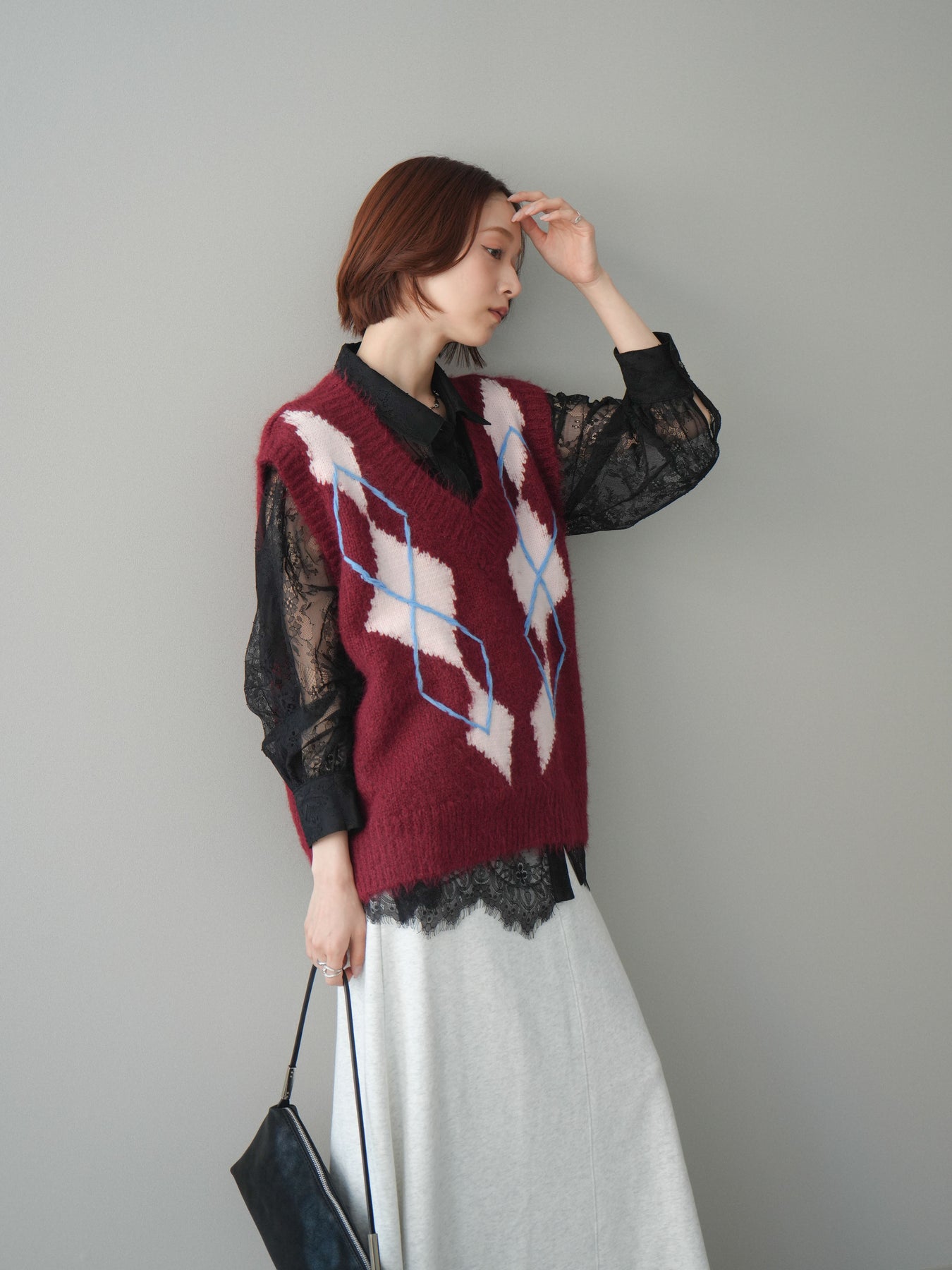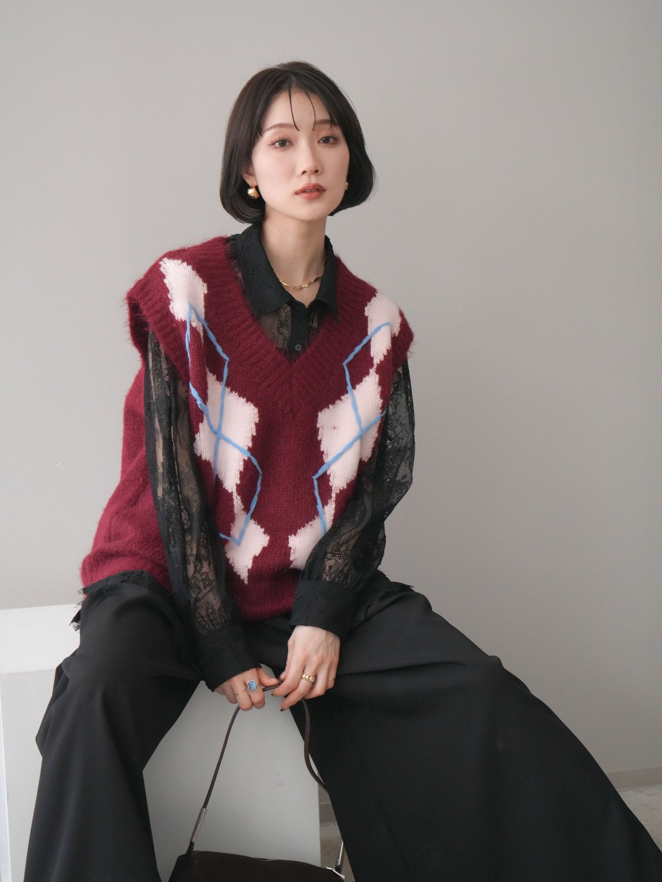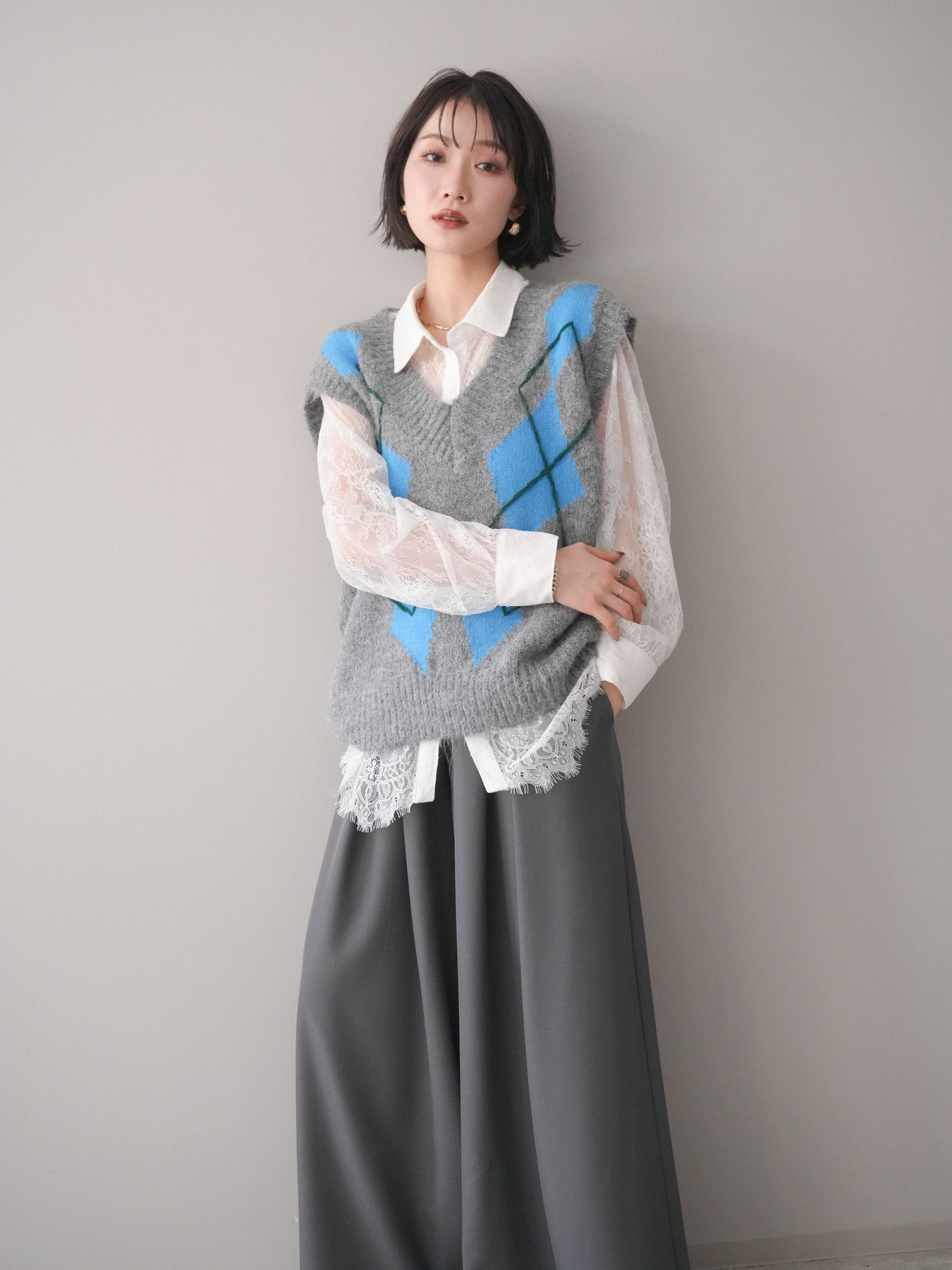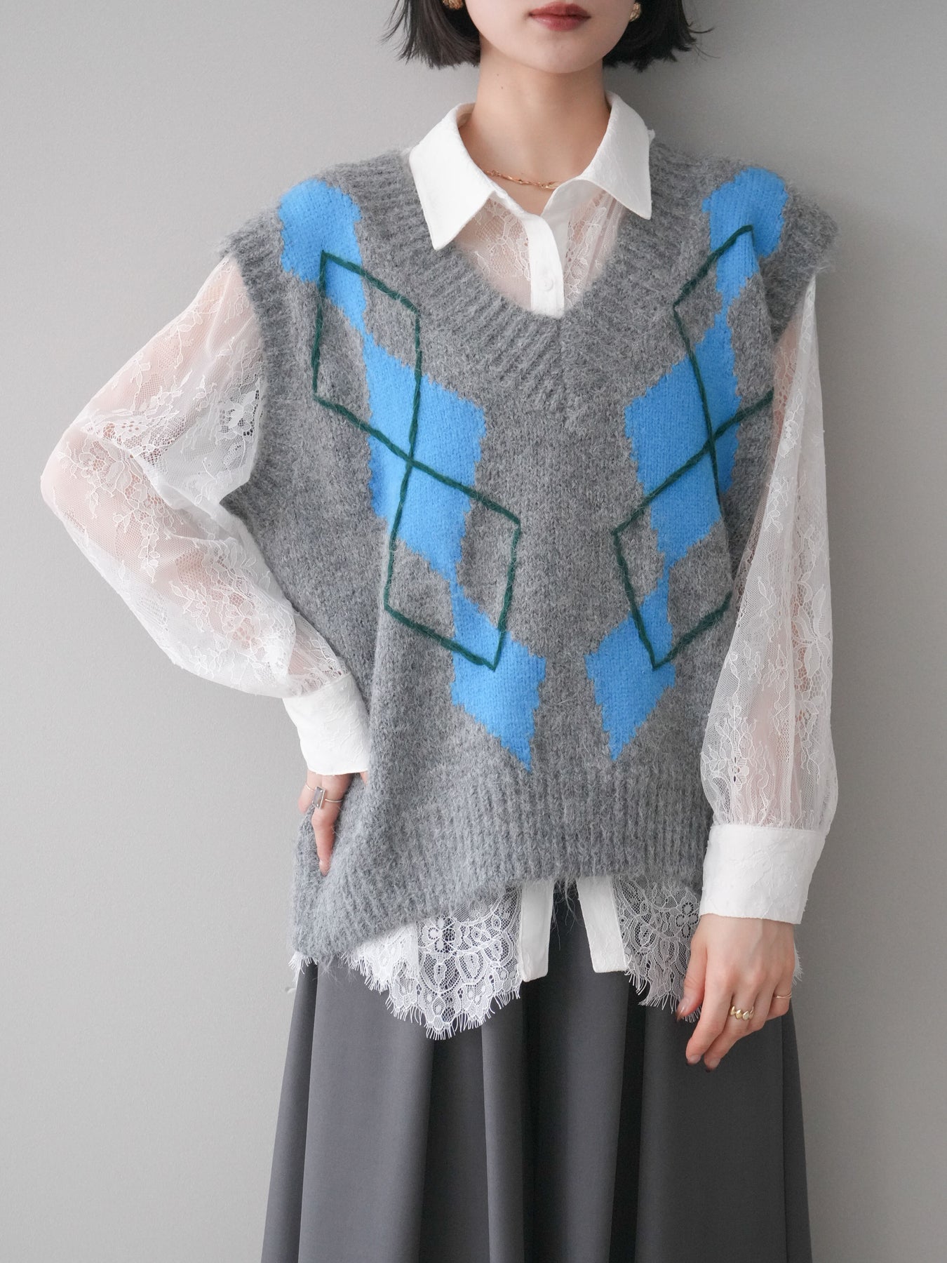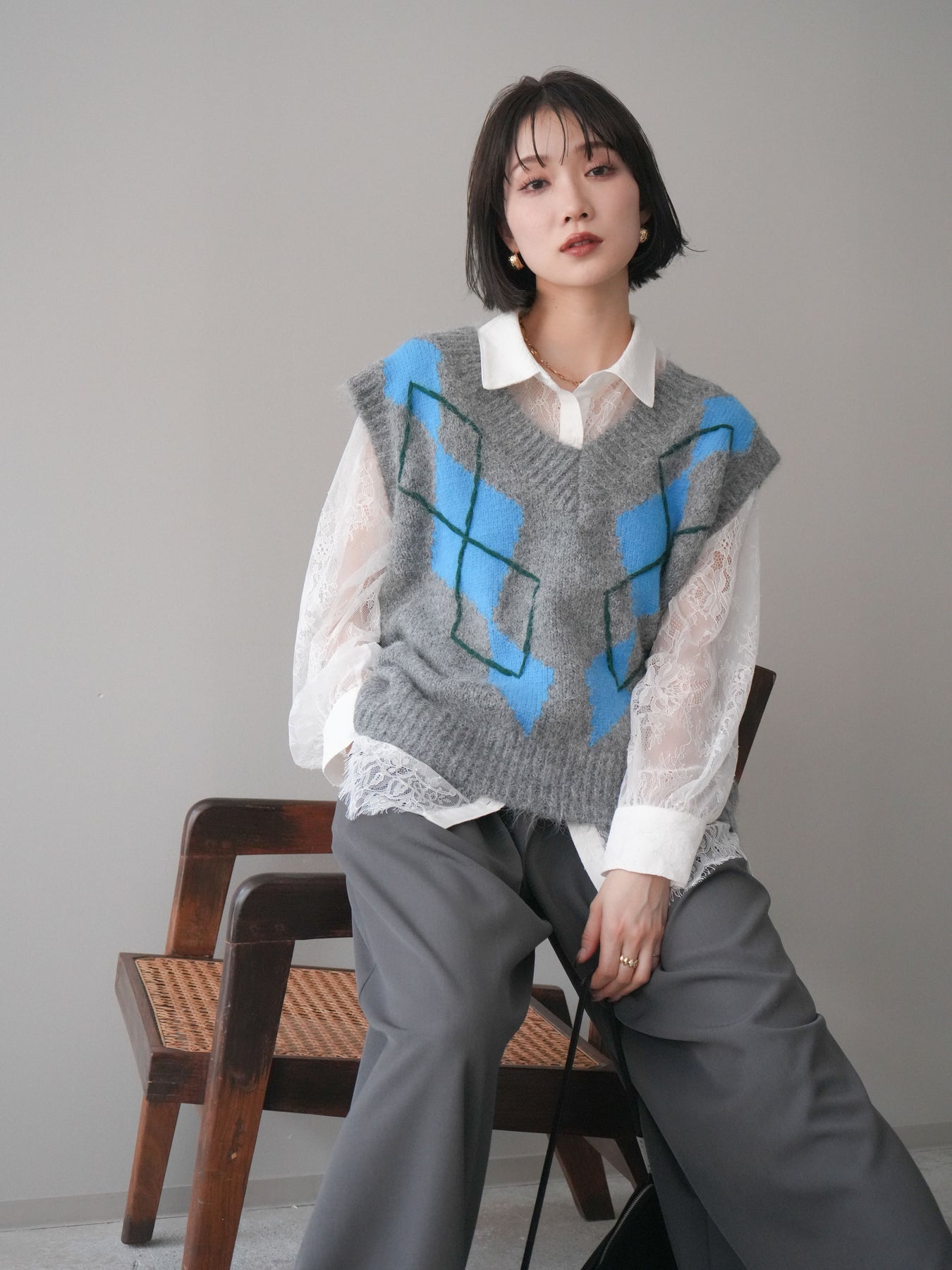 クラシカルなアーガイル柄をアクセントにしたVネックニットベスト。存在感のある柄デザインに、ステッチ風のディテールを重ねることで、シンプルなスタイリングにも奥行きをプラスします。程よくゆとりのあるサイズ感で、シャツやカットソー、ワンピースなど幅広いアイテムとのレイヤードが楽しめる一着。Vネック仕様が顔まわりをすっきりと見せ、カジュアルにもきれいめにも馴染むため、シーズンを通して着回し力の高いアイテムです。 ※ボトムス、キャミソール(インナー)以外の商品は一律でインナーは付属していません。