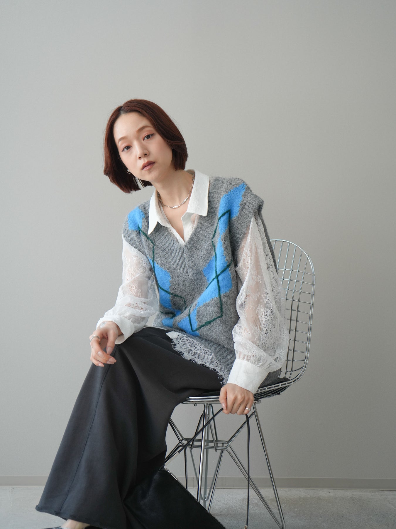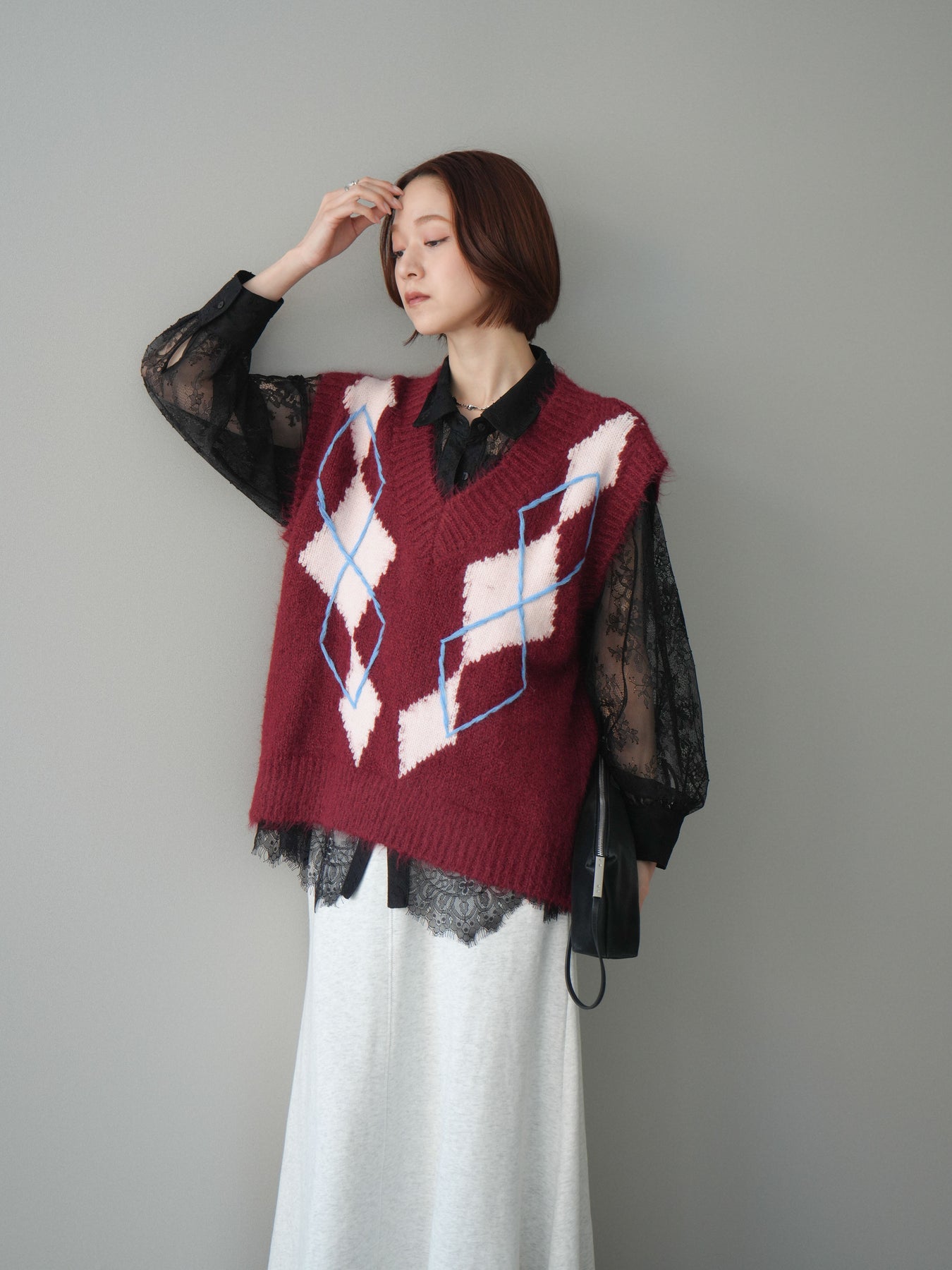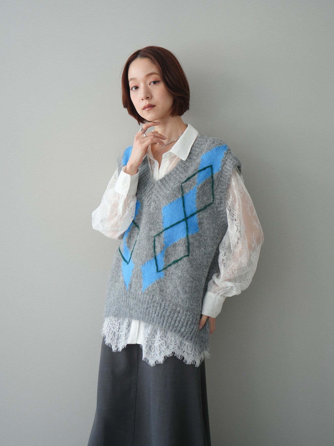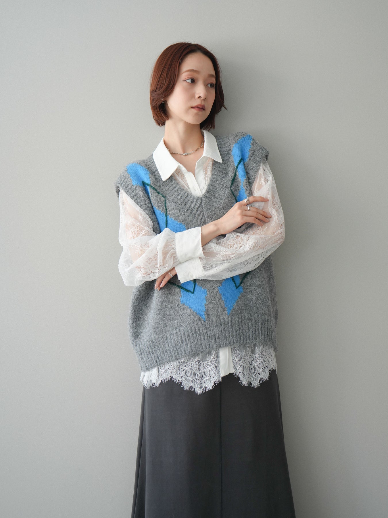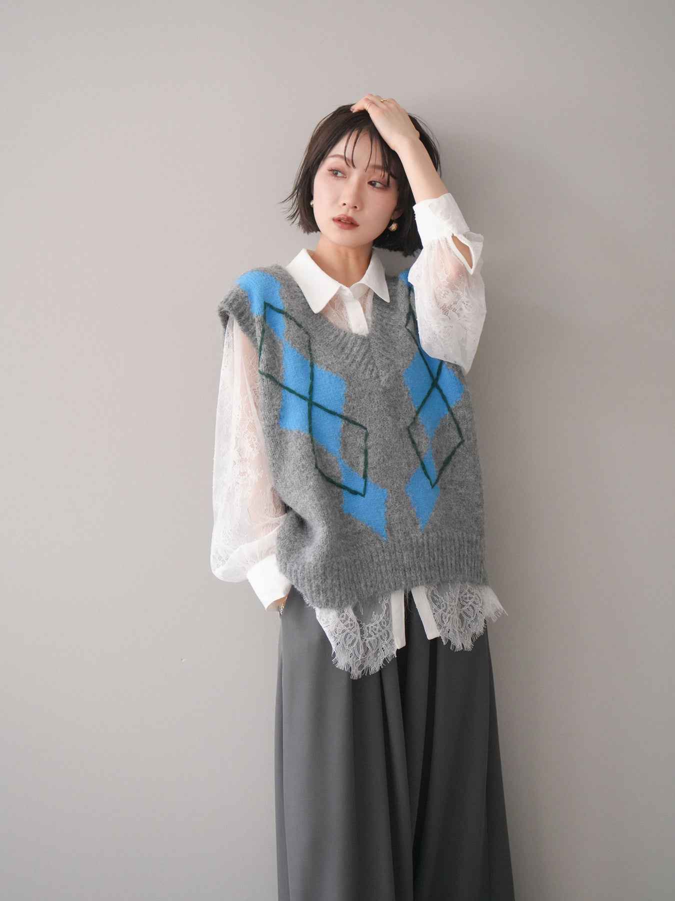クラシカルなアーガイル柄をアクセントにしたVネックニットベスト。存在感のある柄デザインに、ステッチ風のディテールを重ねることで、シンプルなスタイリングにも奥行きをプラスします。程よくゆとりのあるサイズ感で、シャツやカットソー、ワンピースなど幅広いアイテムとのレイヤードが楽しめる一着。Vネック仕様が顔まわりをすっきりと見せ、カジュアルにもきれいめにも馴染むため、シーズンを通して着回し力の高いアイテムです。 ※ボトムス、キャミソール(インナー)以外の商品は一律でインナーは付属していません。