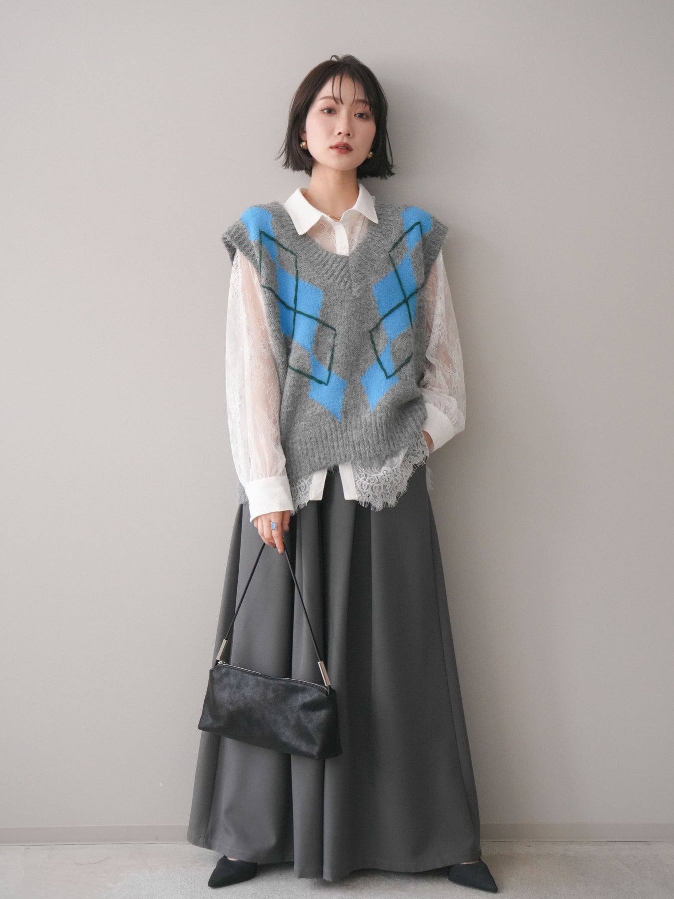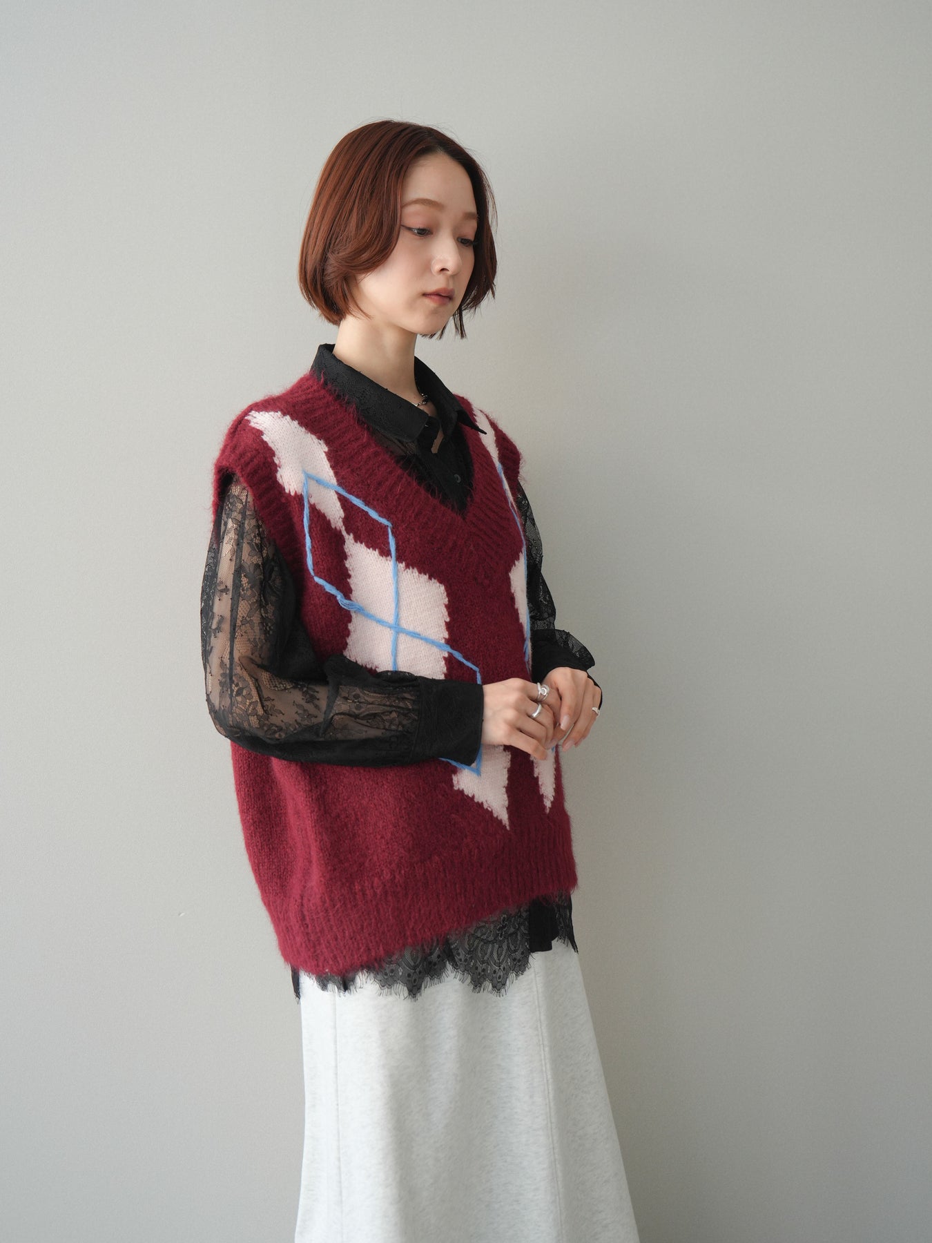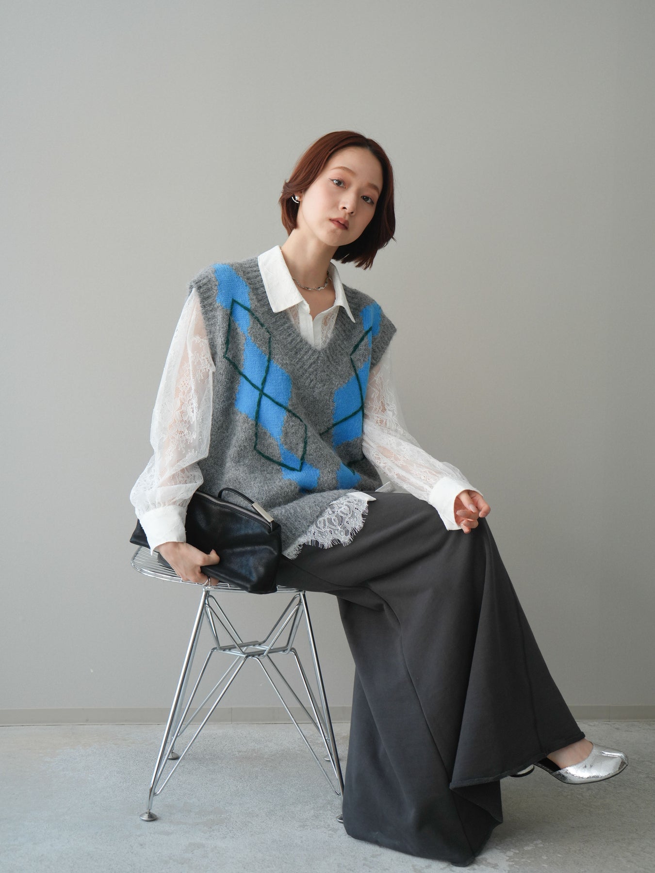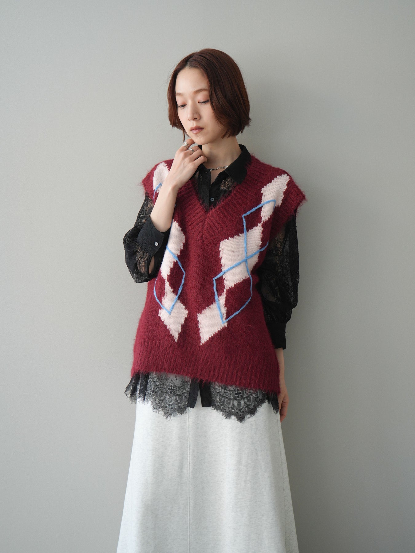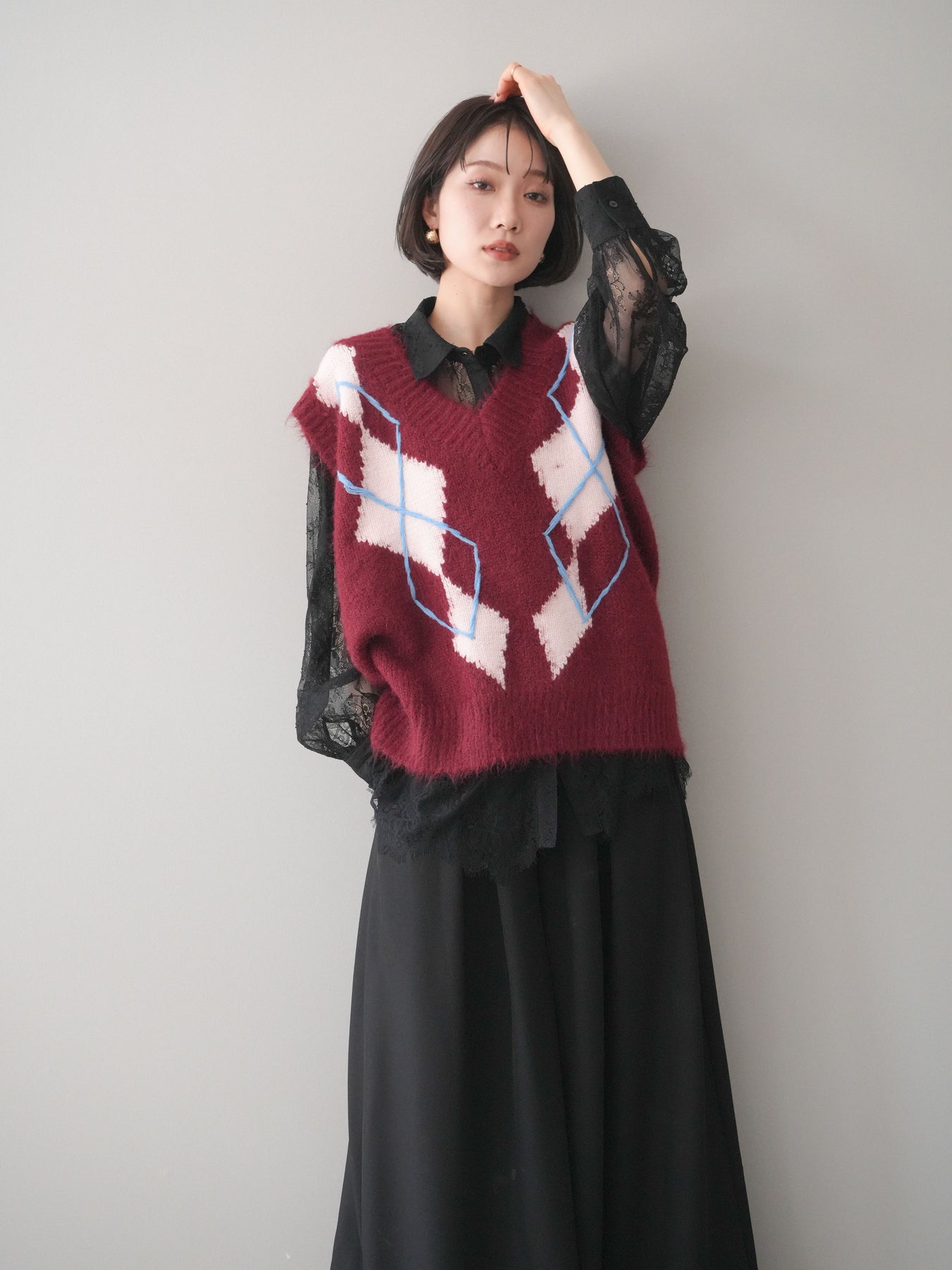 クラシカルなアーガイル柄をアクセントにしたVネックニットベスト。存在感のある柄デザインに、ステッチ風のディテールを重ねることで、シンプルなスタイリングにも奥行きをプラスします。程よくゆとりのあるサイズ感で、シャツやカットソー、ワンピースなど幅広いアイテムとのレイヤードが楽しめる一着。Vネック仕様が顔まわりをすっきりと見せ、カジュアルにもきれいめにも馴染むため、シーズンを通して着回し力の高いアイテムです。 ※ボトムス、キャミソール(インナー)以外の商品は一律でインナーは付属していません。