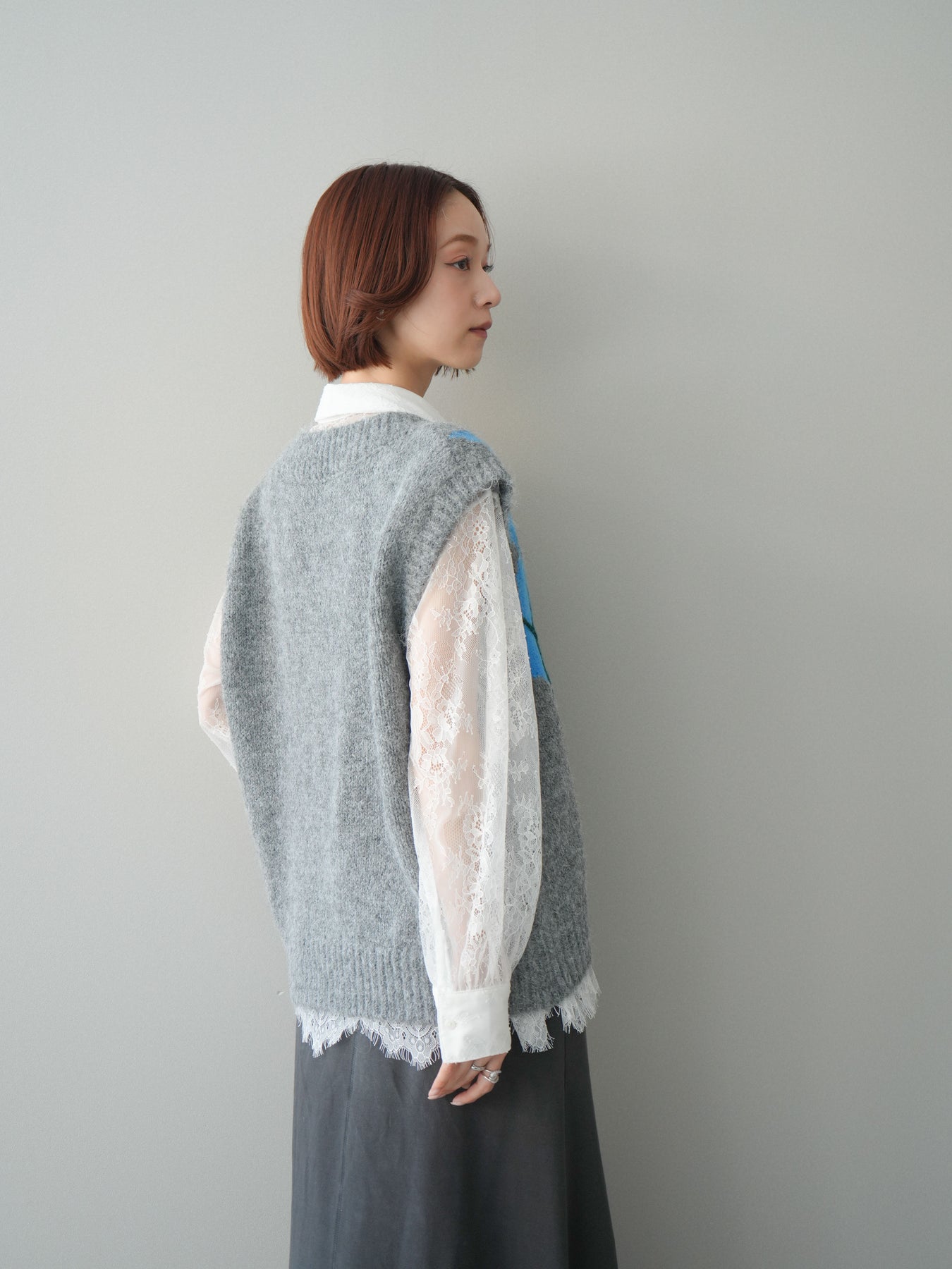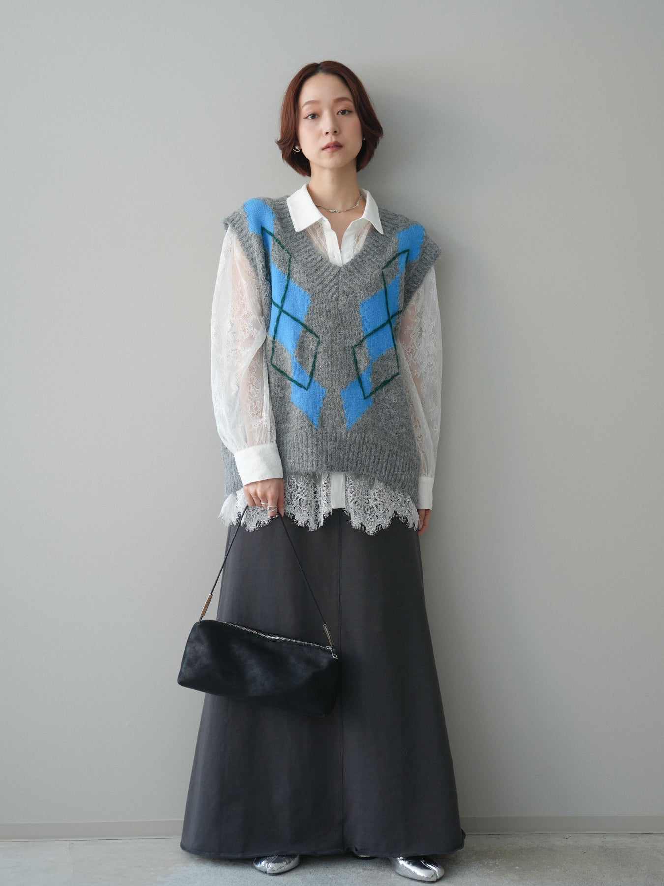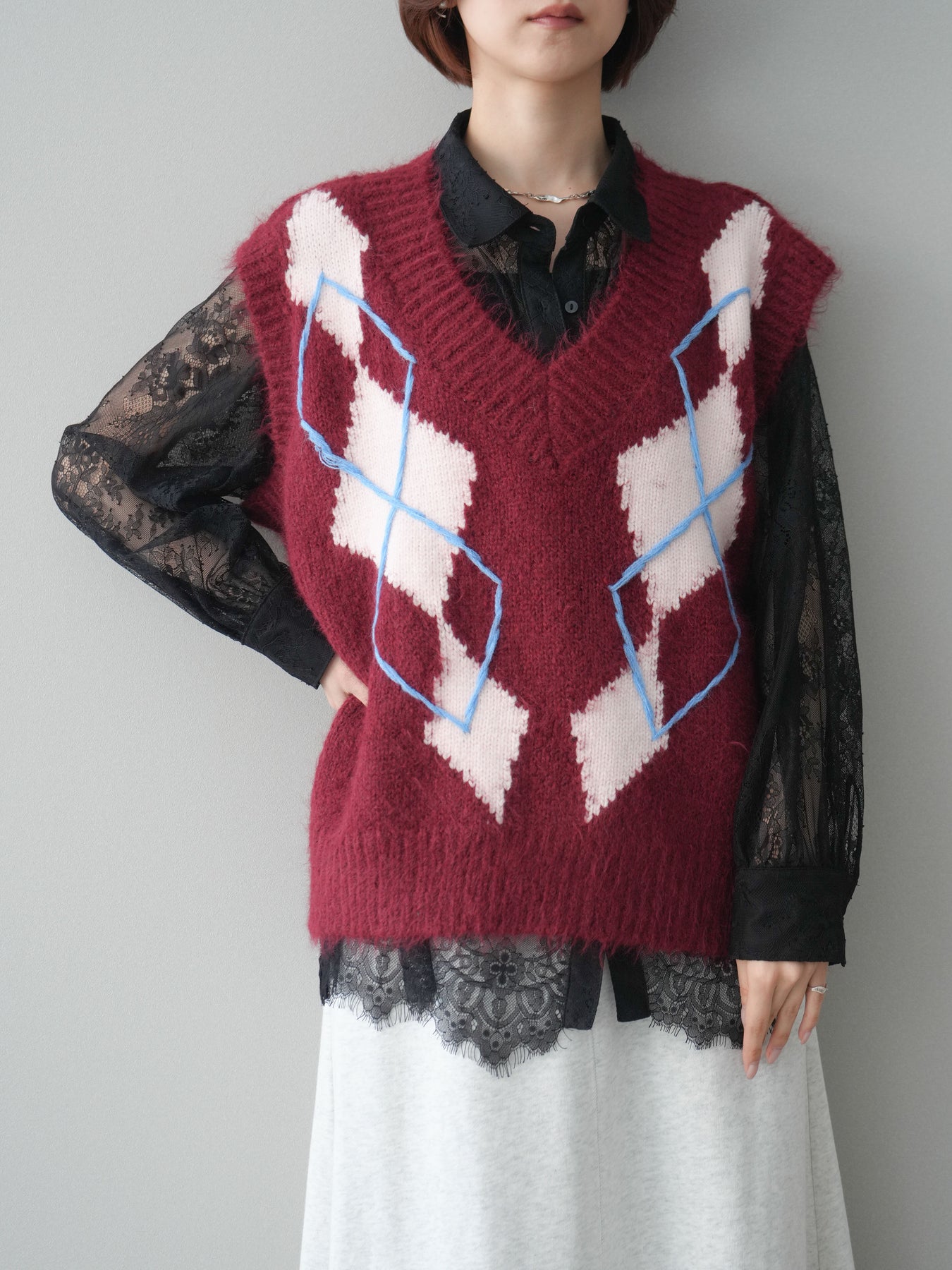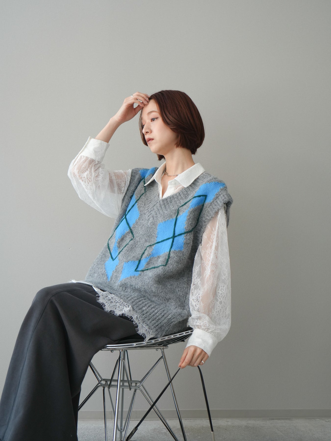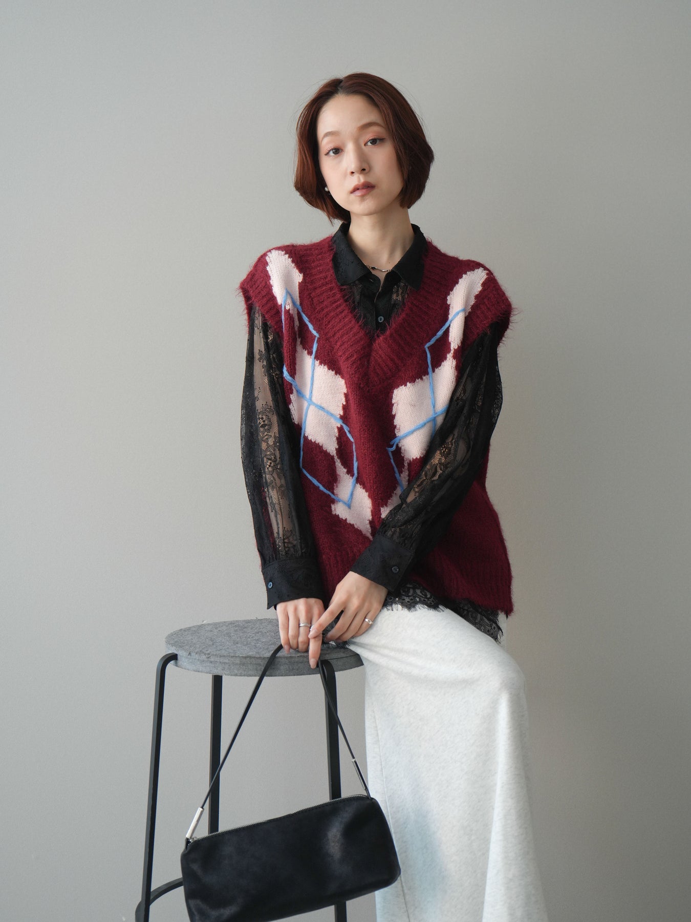 クラシカルなアーガイル柄をアクセントにしたVネックニットベスト。存在感のある柄デザインに、ステッチ風のディテールを重ねることで、シンプルなスタイリングにも奥行きをプラスします。程よくゆとりのあるサイズ感で、シャツやカットソー、ワンピースなど幅広いアイテムとのレイヤードが楽しめる一着。Vネック仕様が顔まわりをすっきりと見せ、カジュアルにもきれいめにも馴染むため、シーズンを通して着回し力の高いアイテムです。 ※ボトムス、キャミソール(インナー)以外の商品は一律でインナーは付属していません。