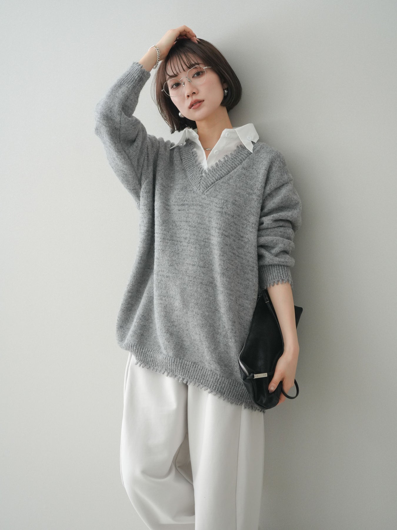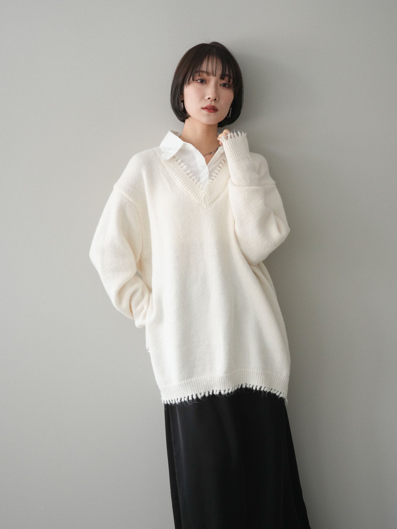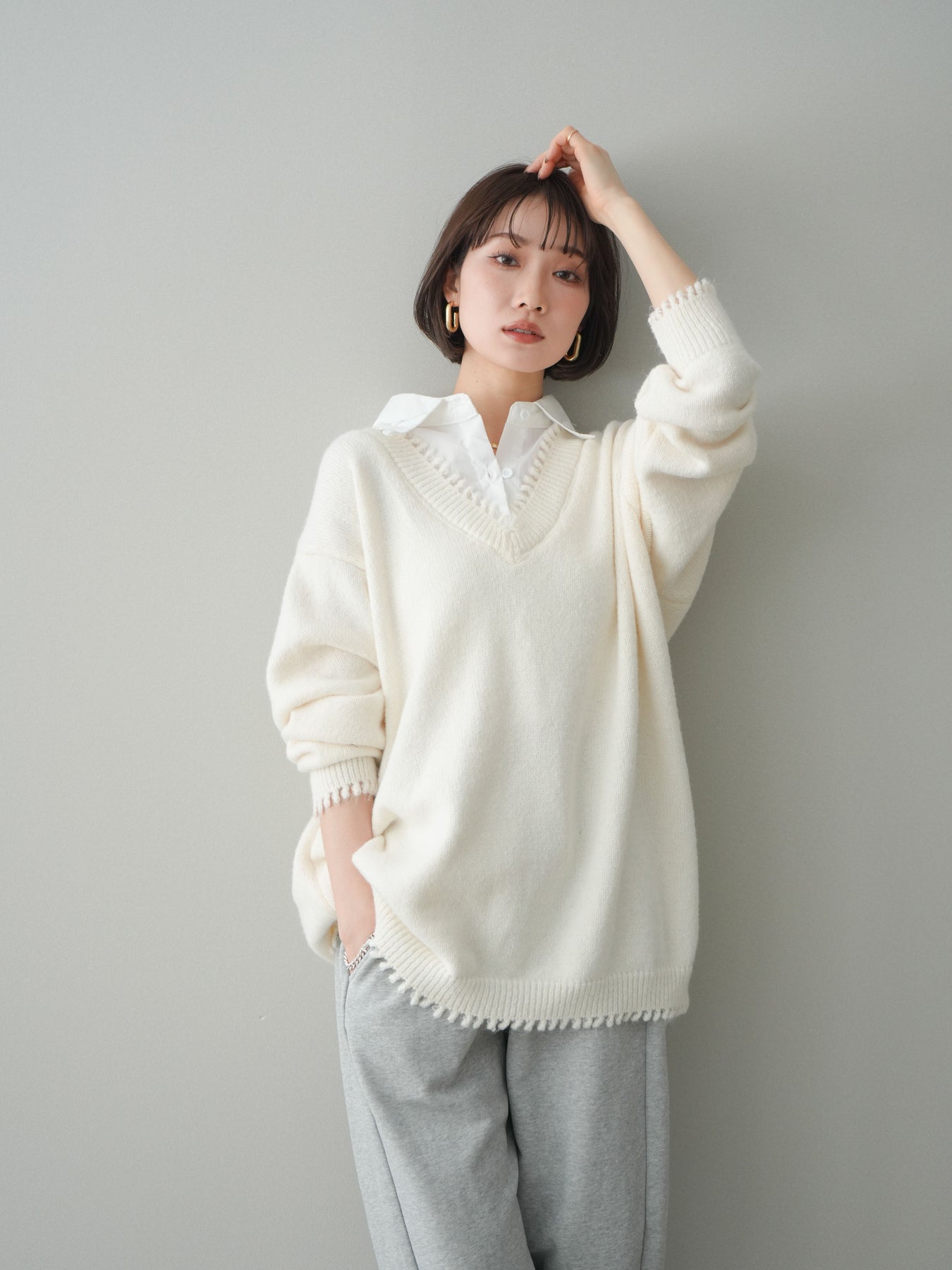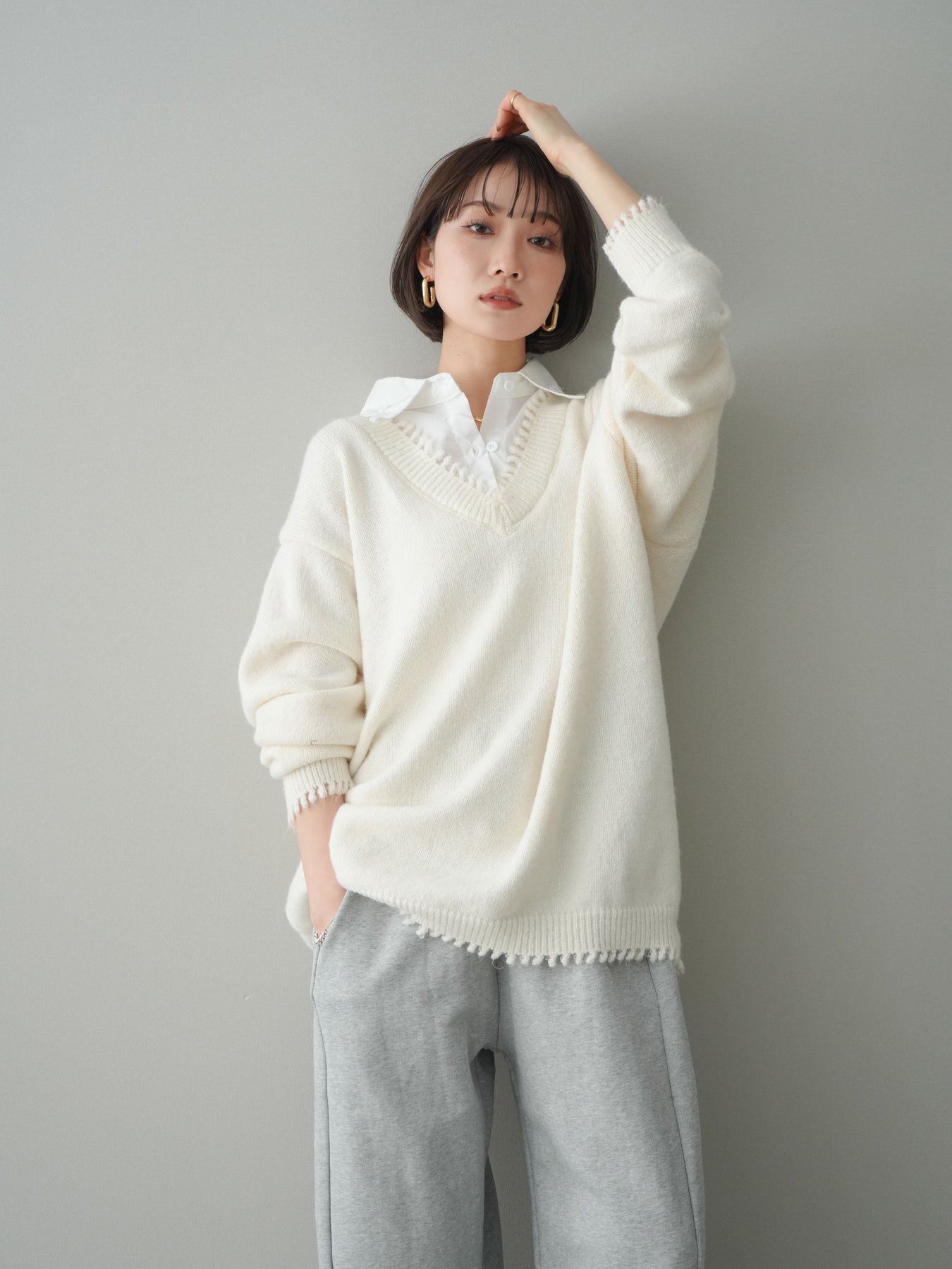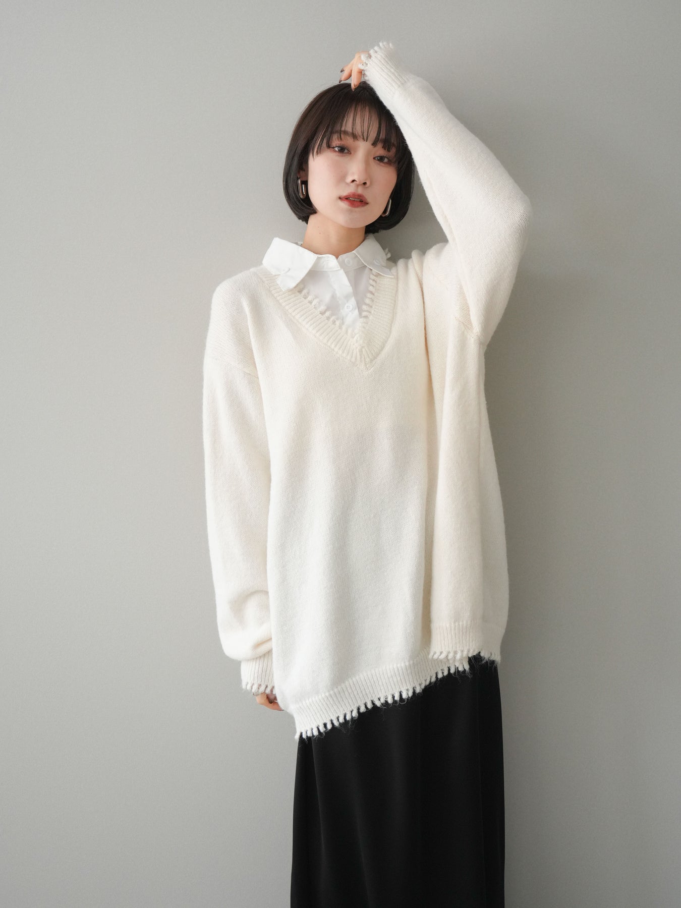 ◆ [予約]シャツドッキングVネックフリンジニットプルオーバー