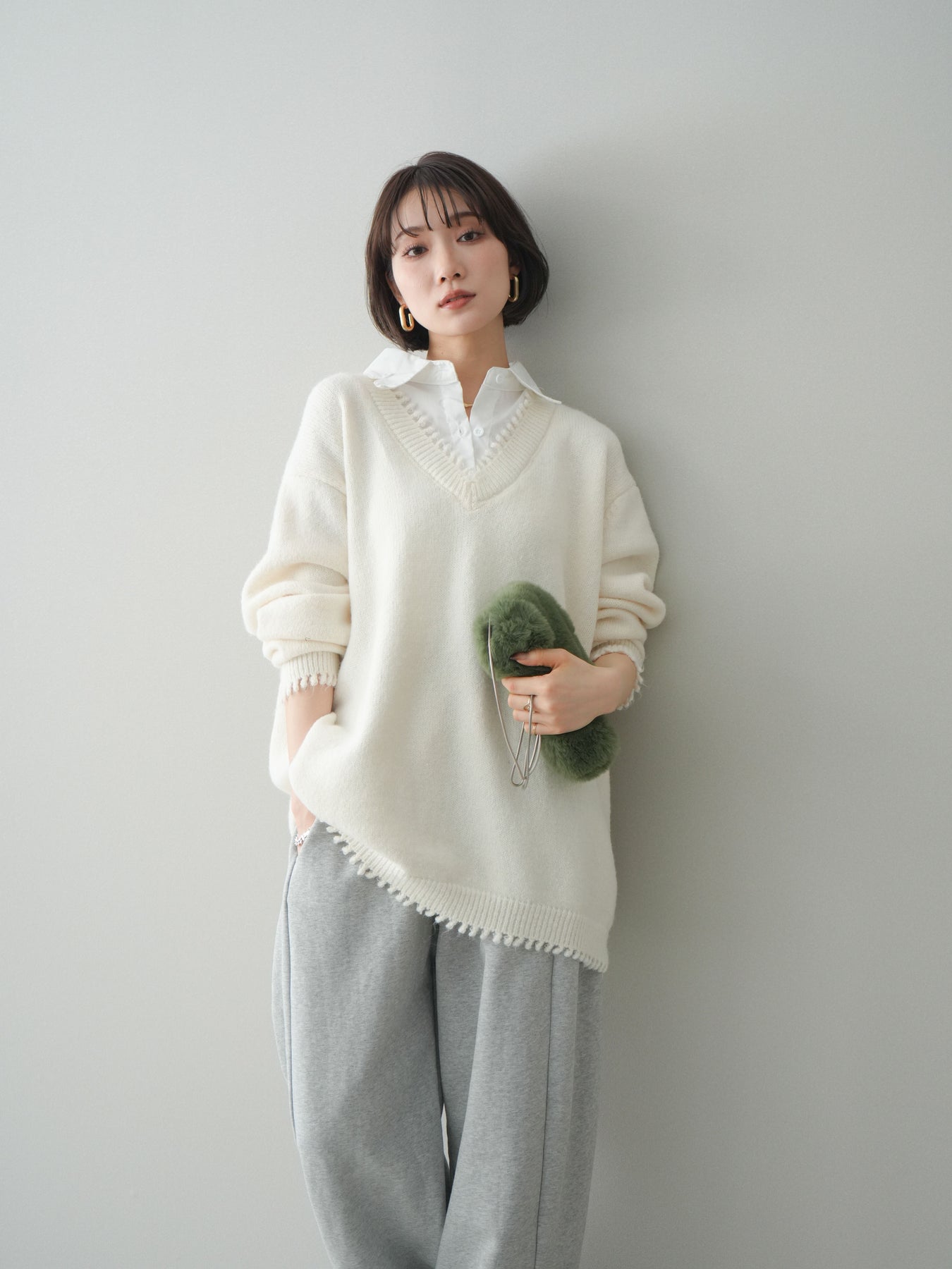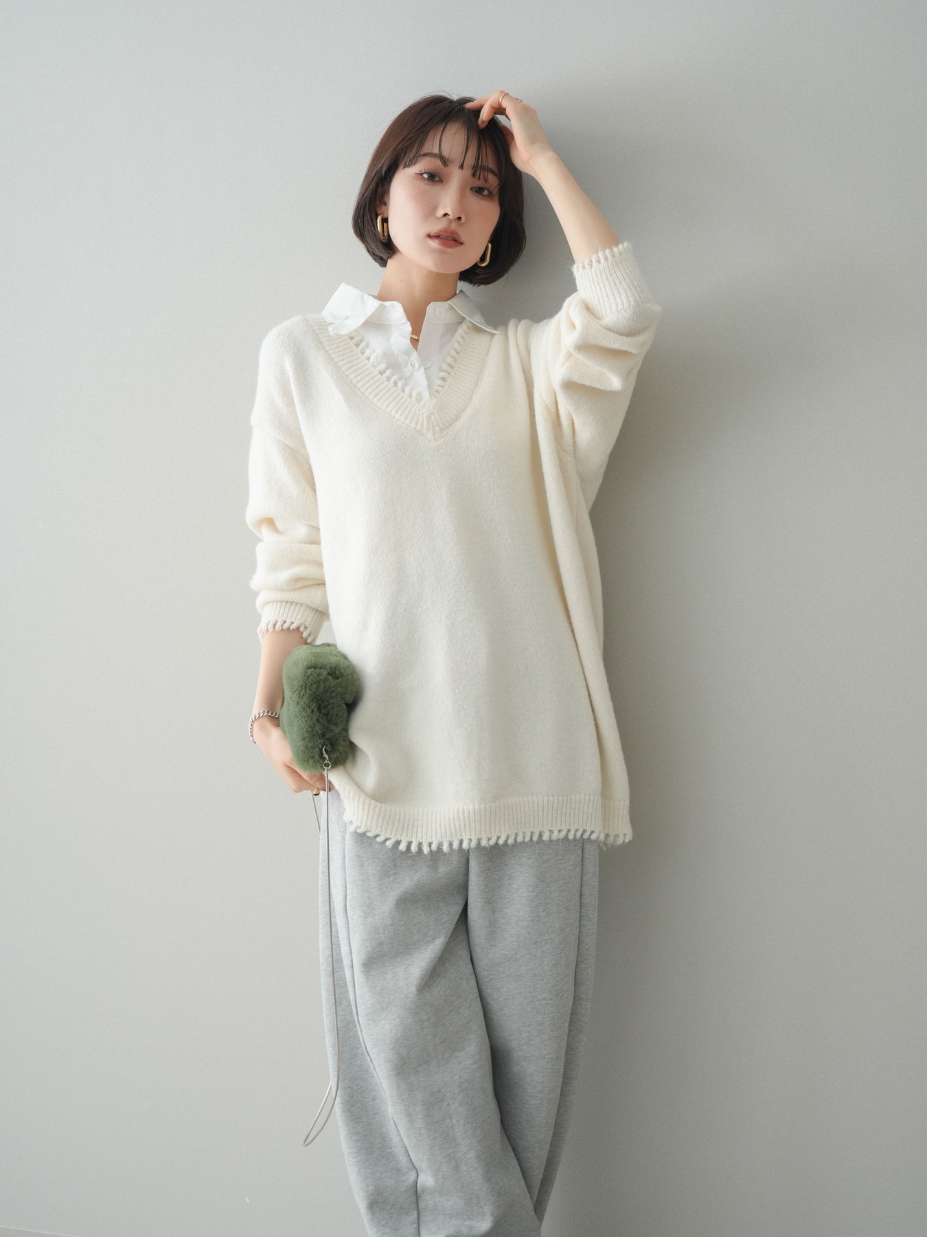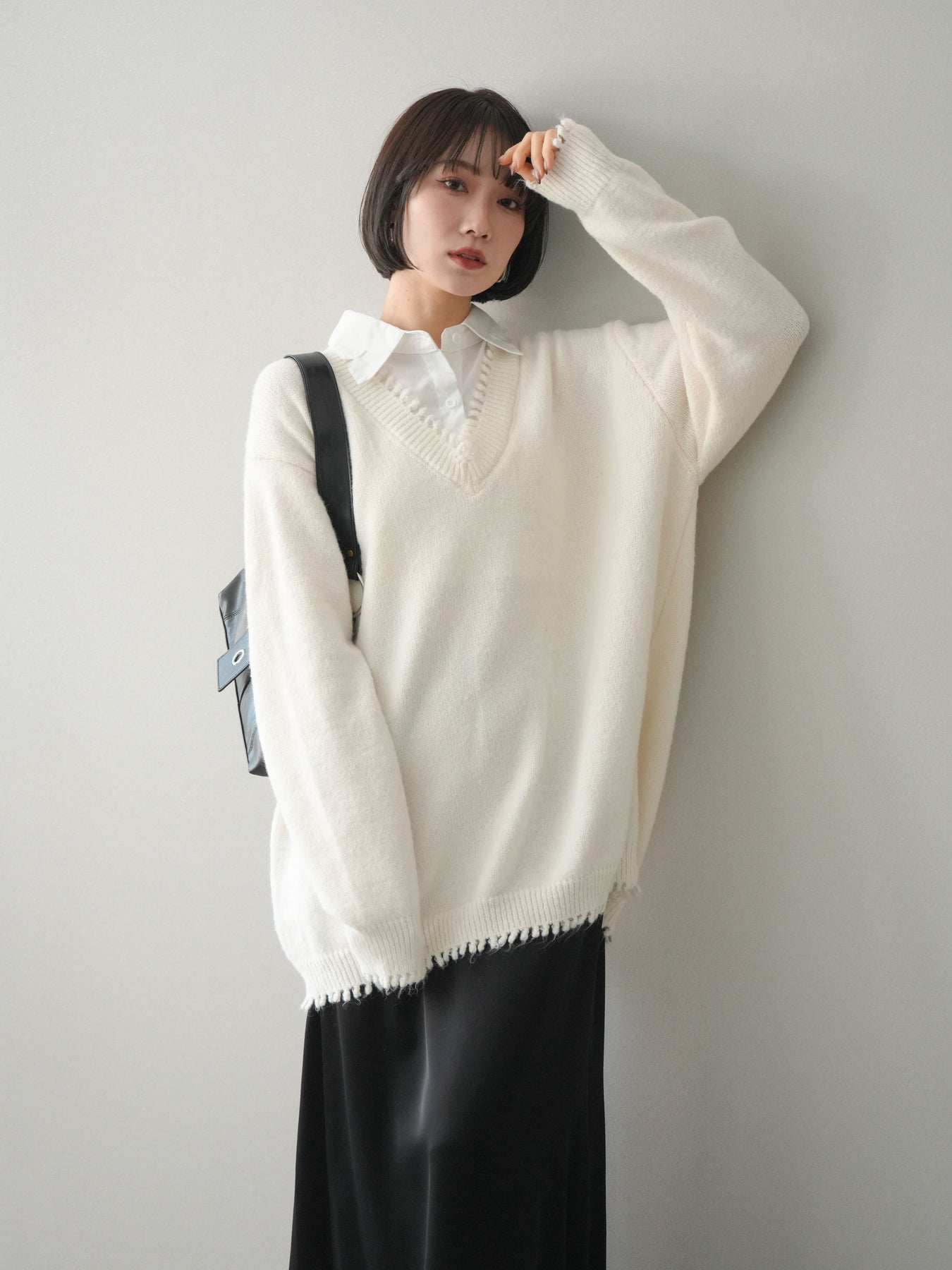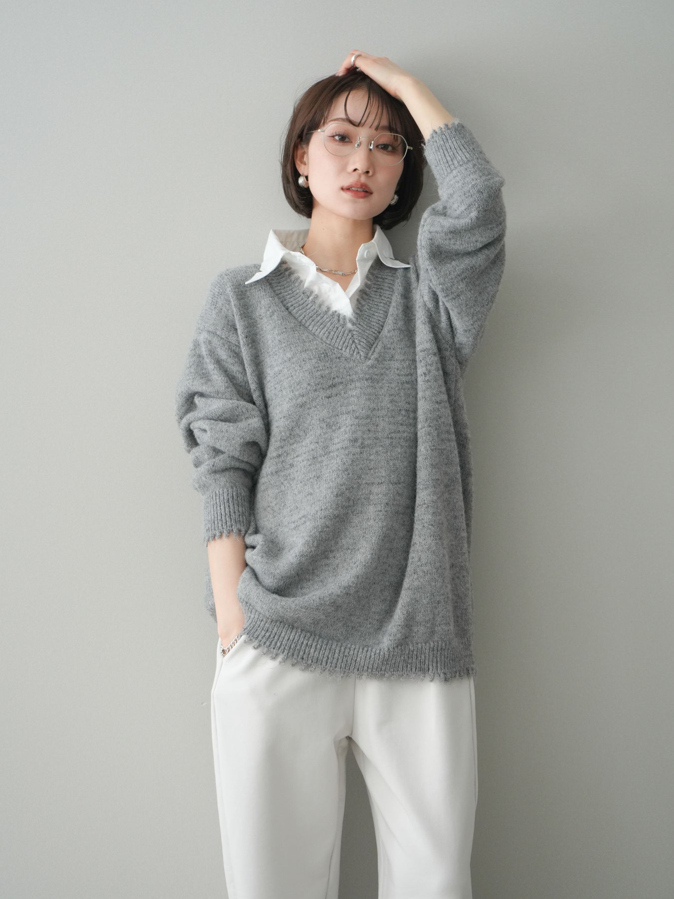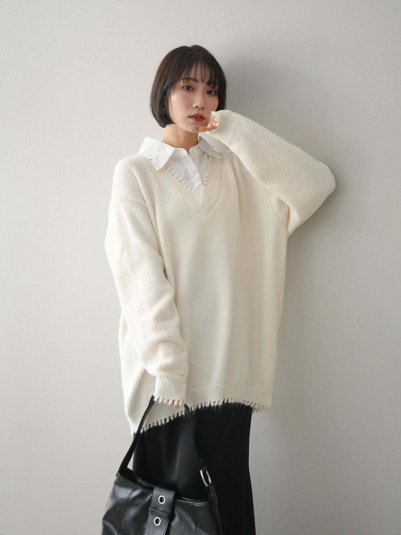 ◆ [予約]シャツドッキングVネックフリンジニットプルオーバー