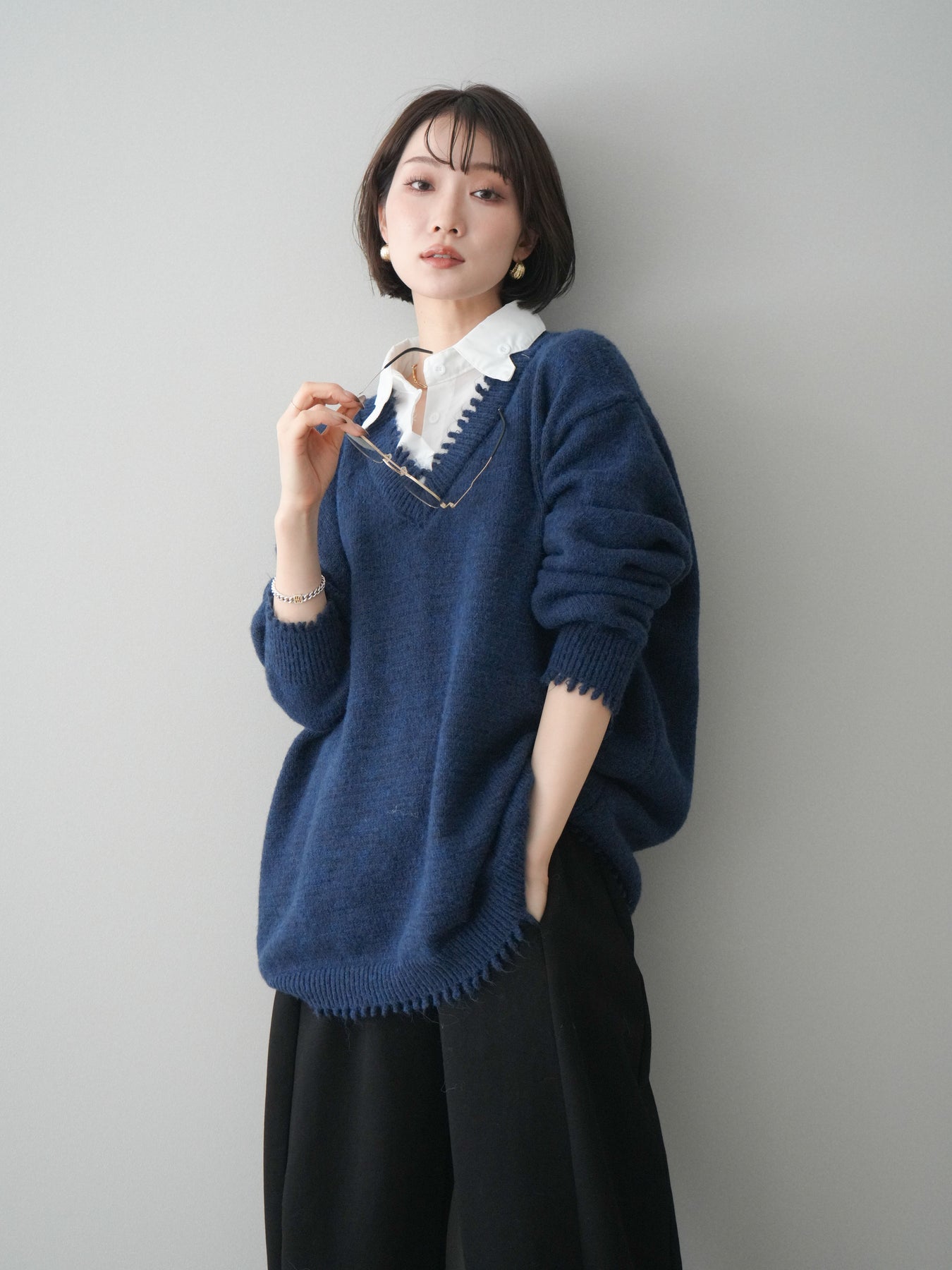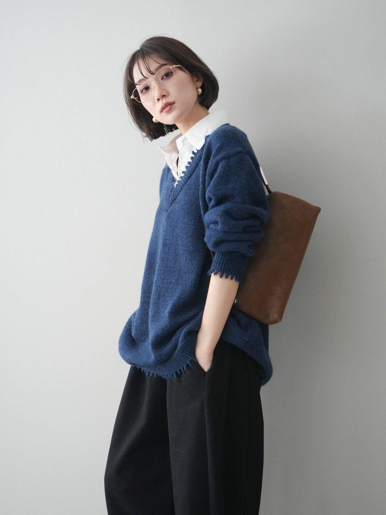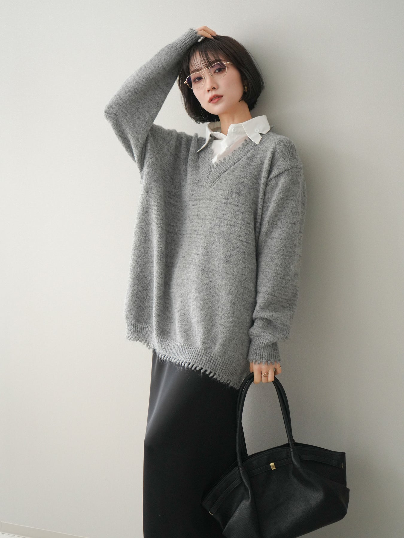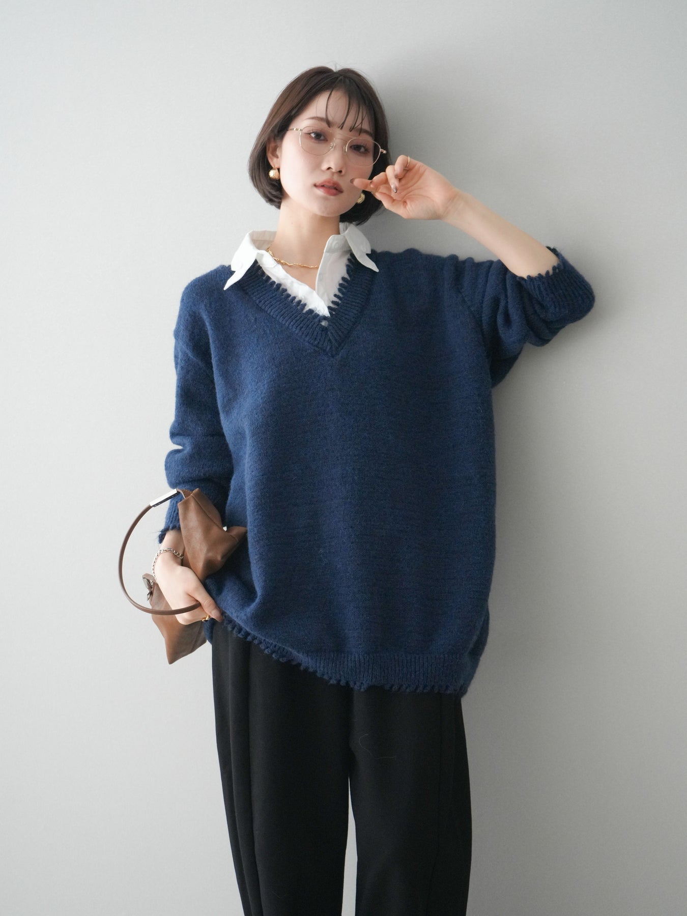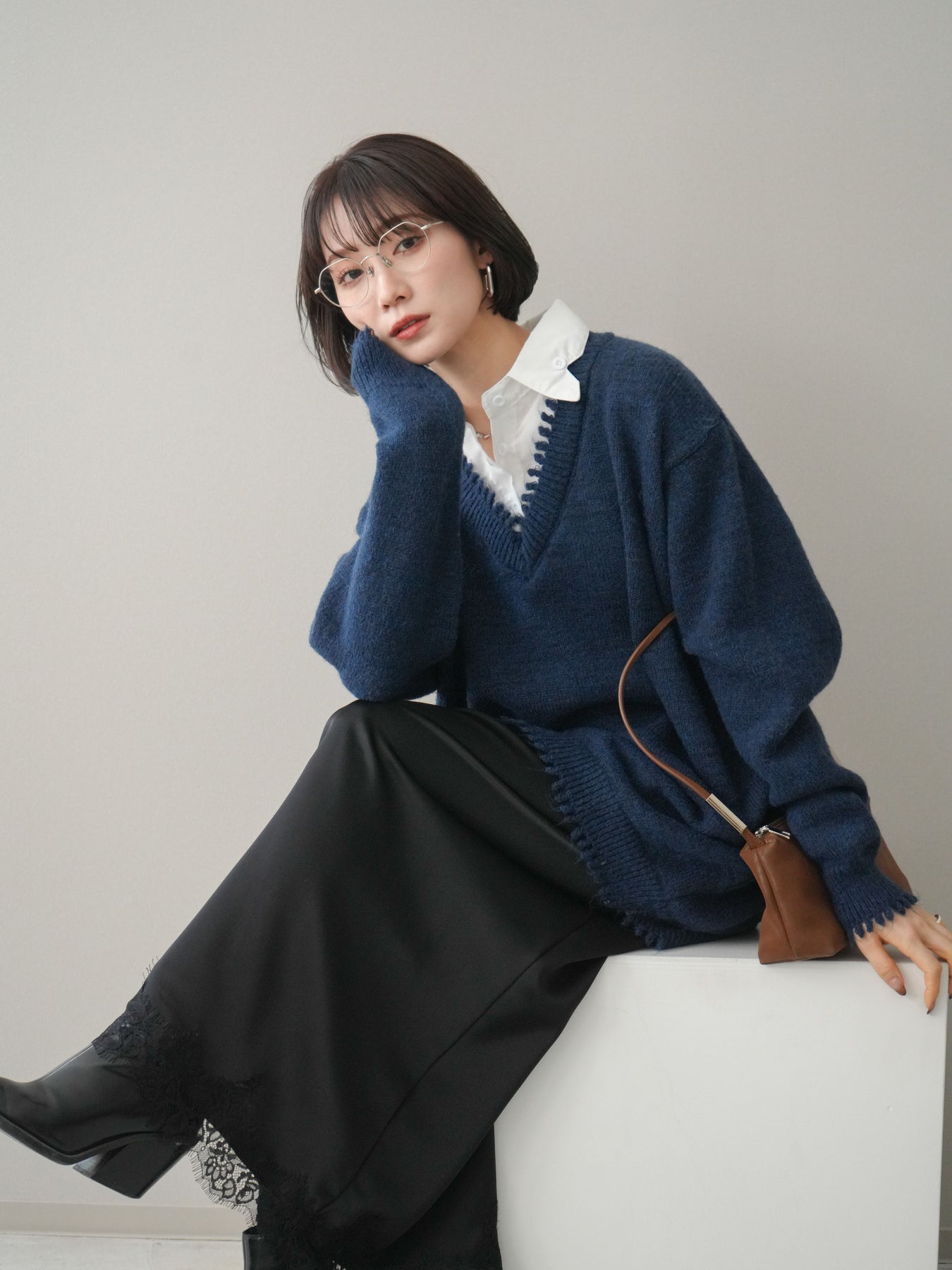 ◆ [予約]シャツドッキングVネックフリンジニットプルオーバー