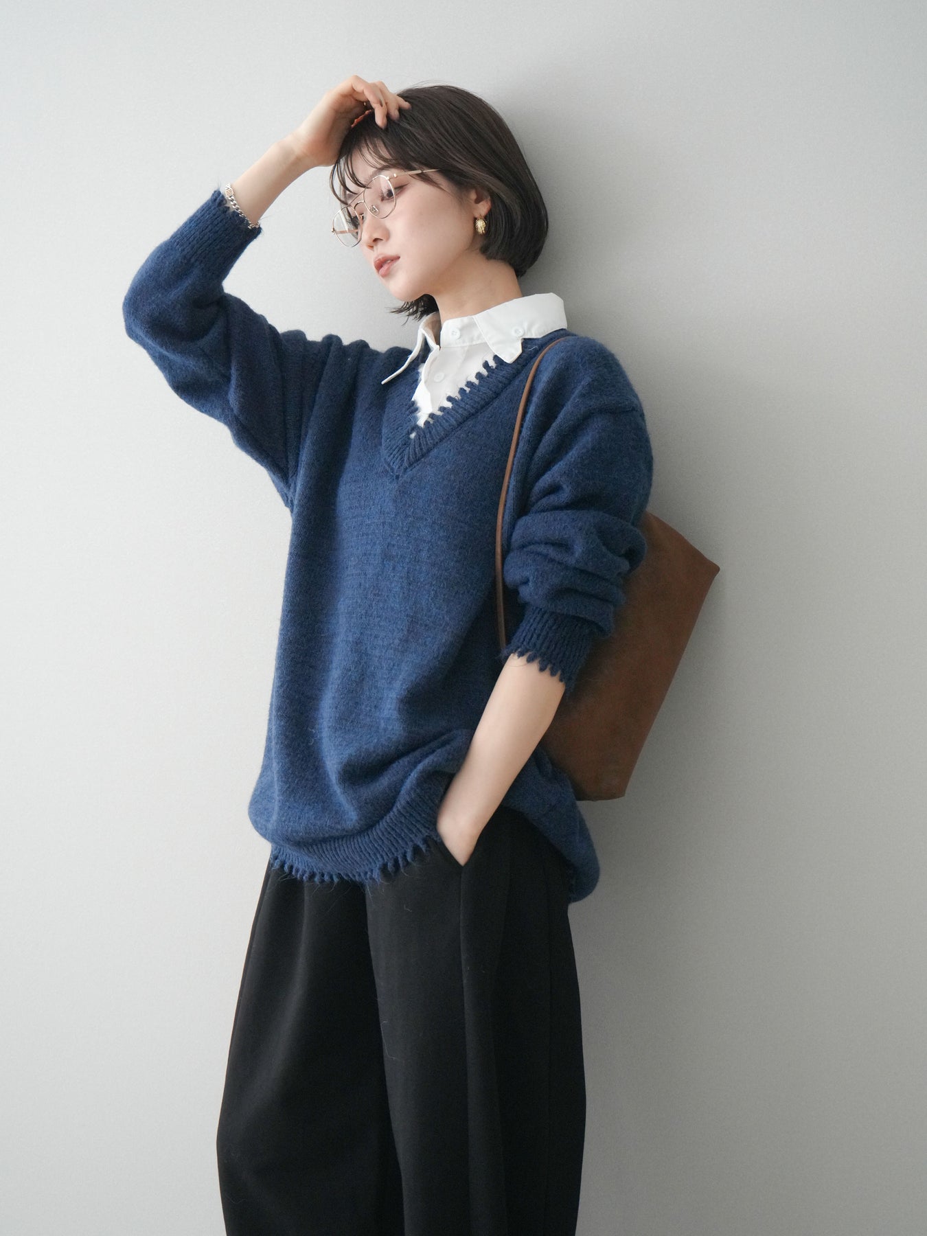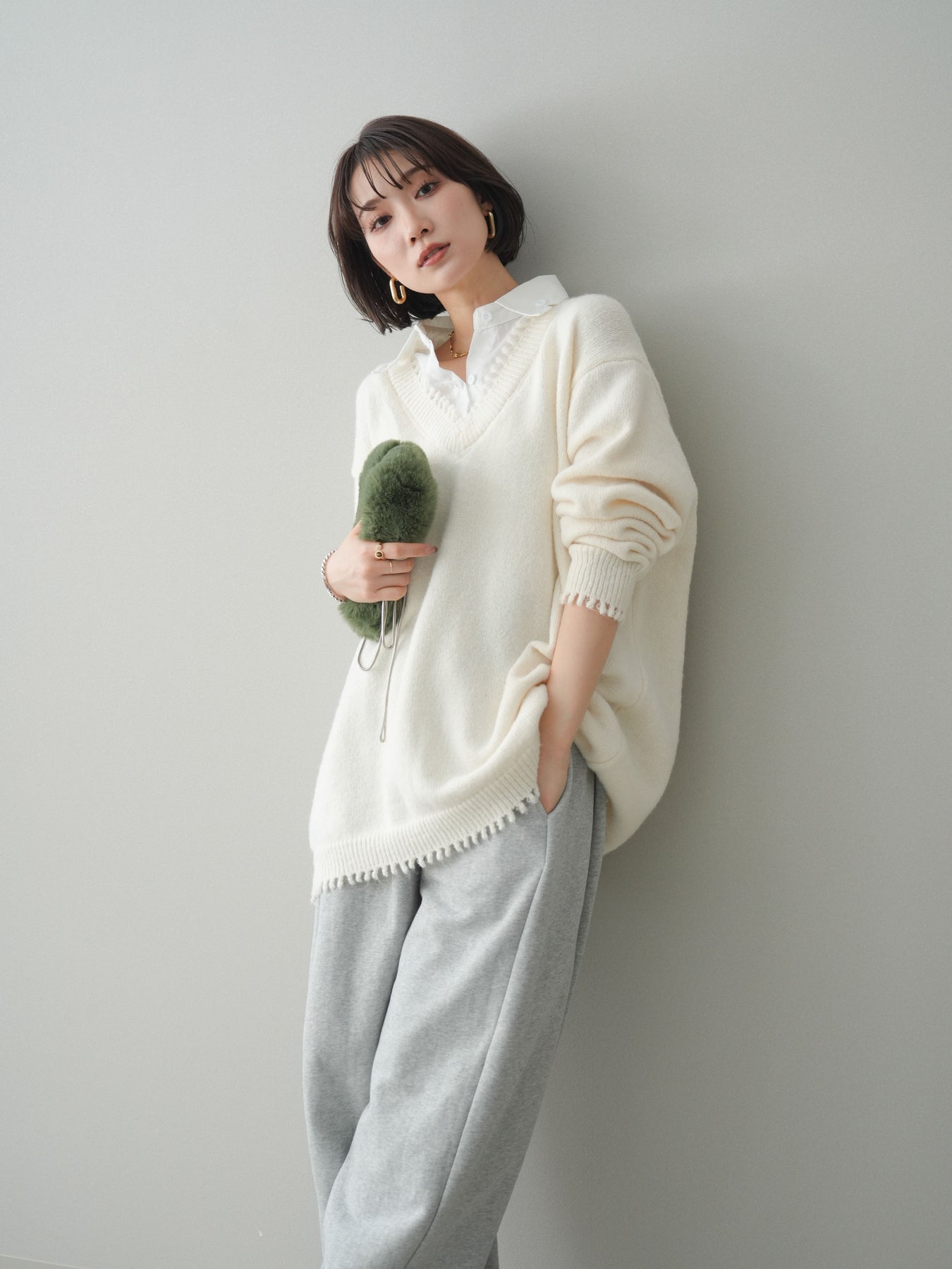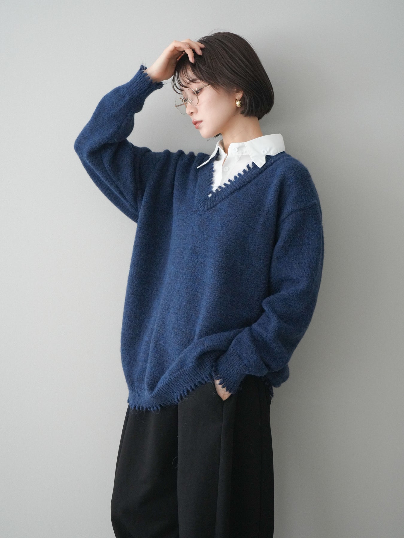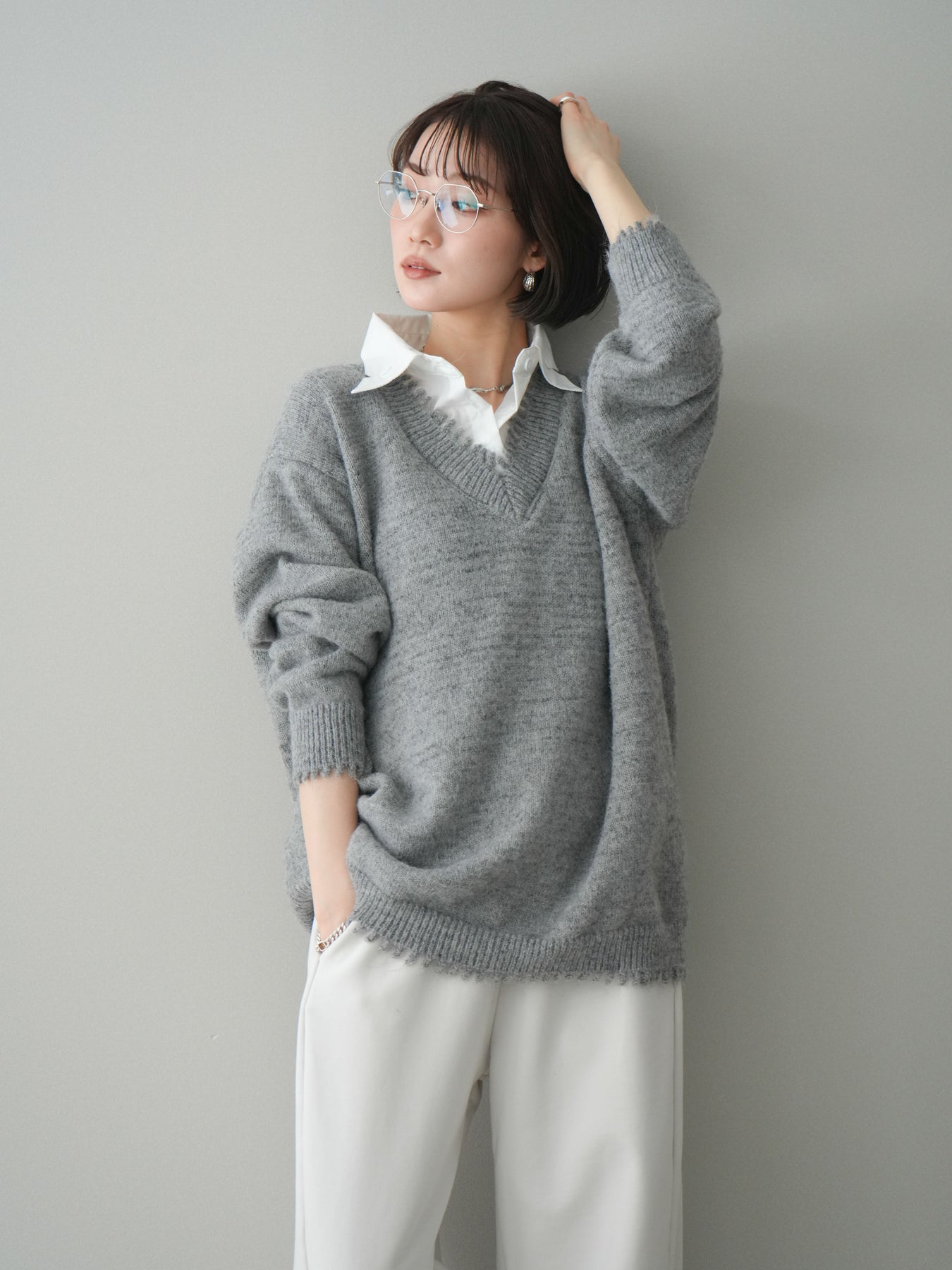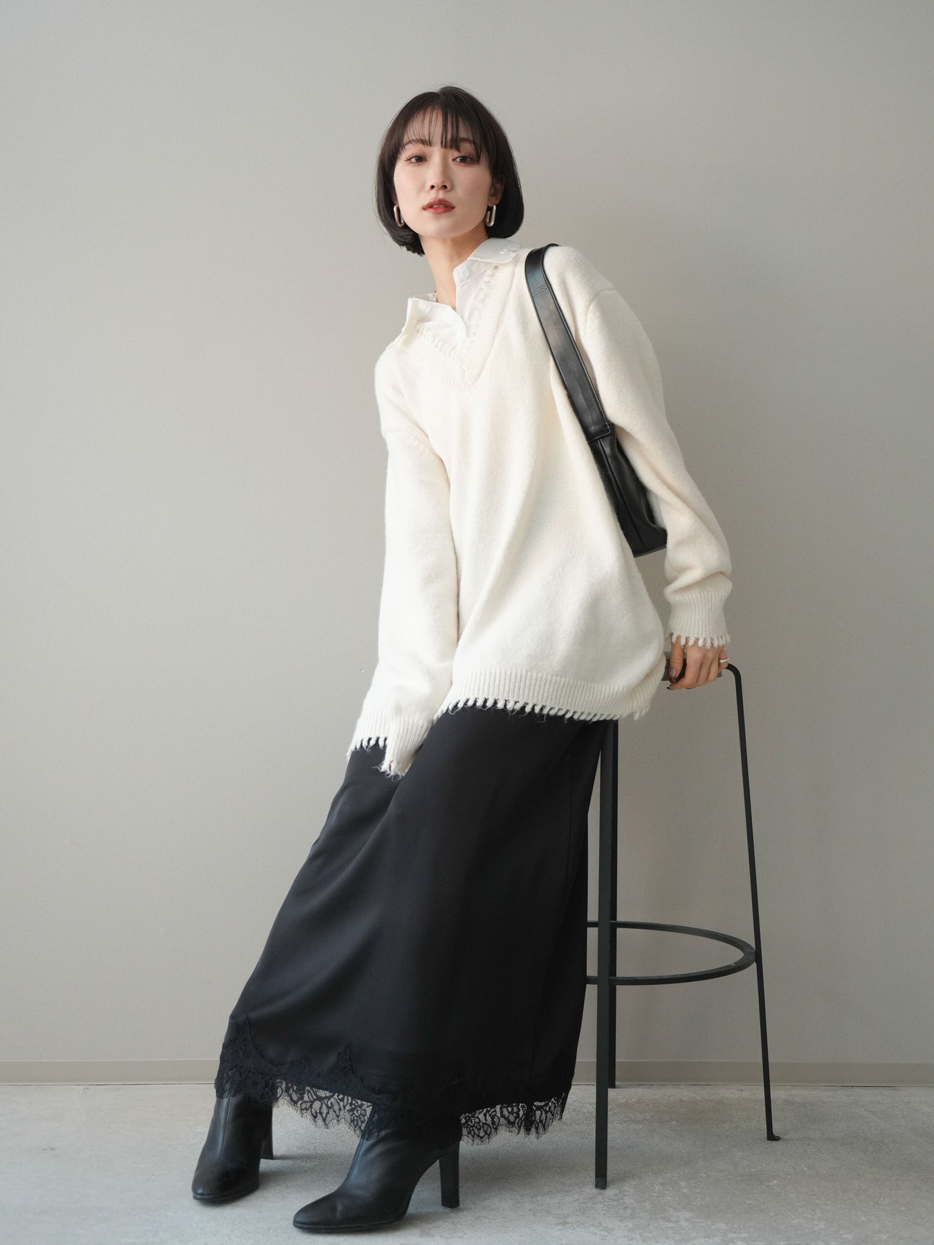 ◆ [予約]シャツドッキングVネックフリンジニットプルオーバー