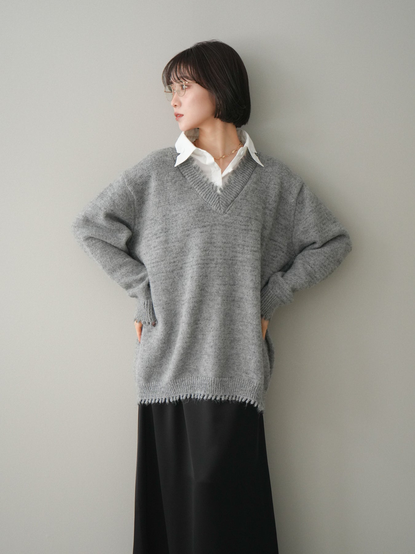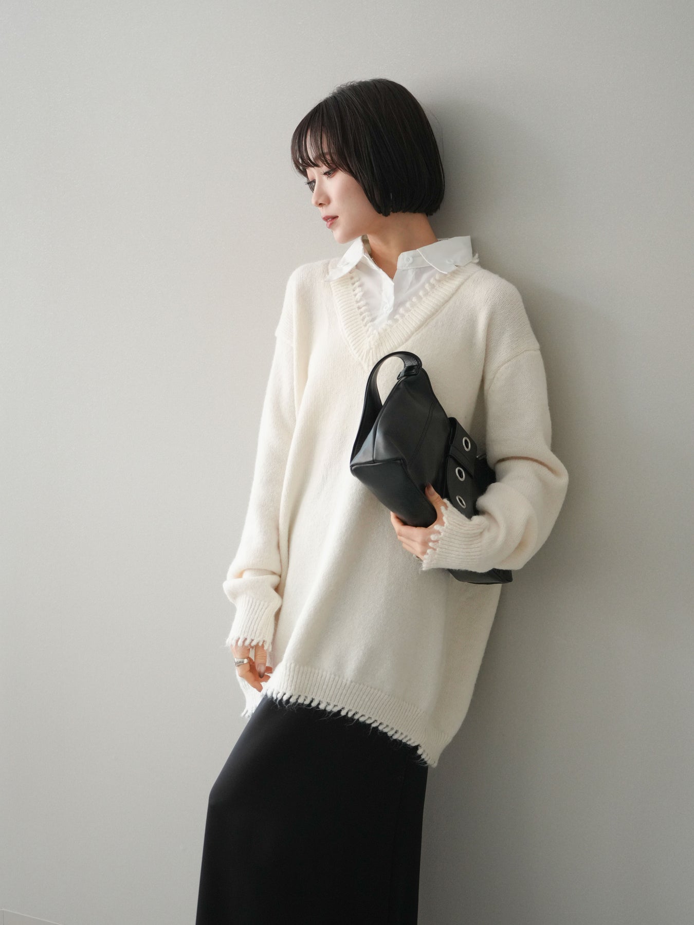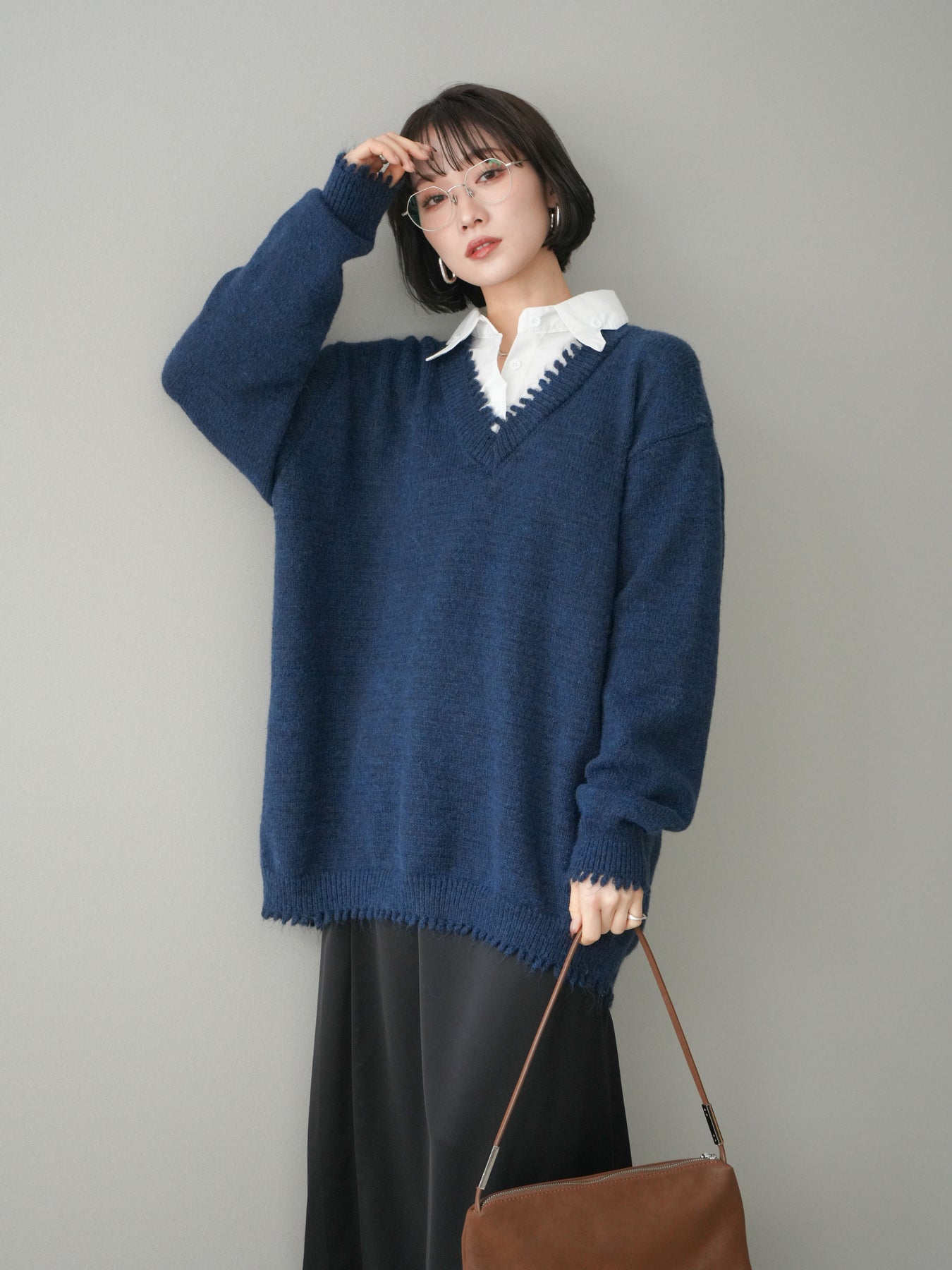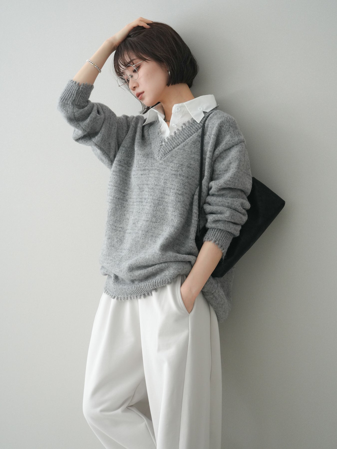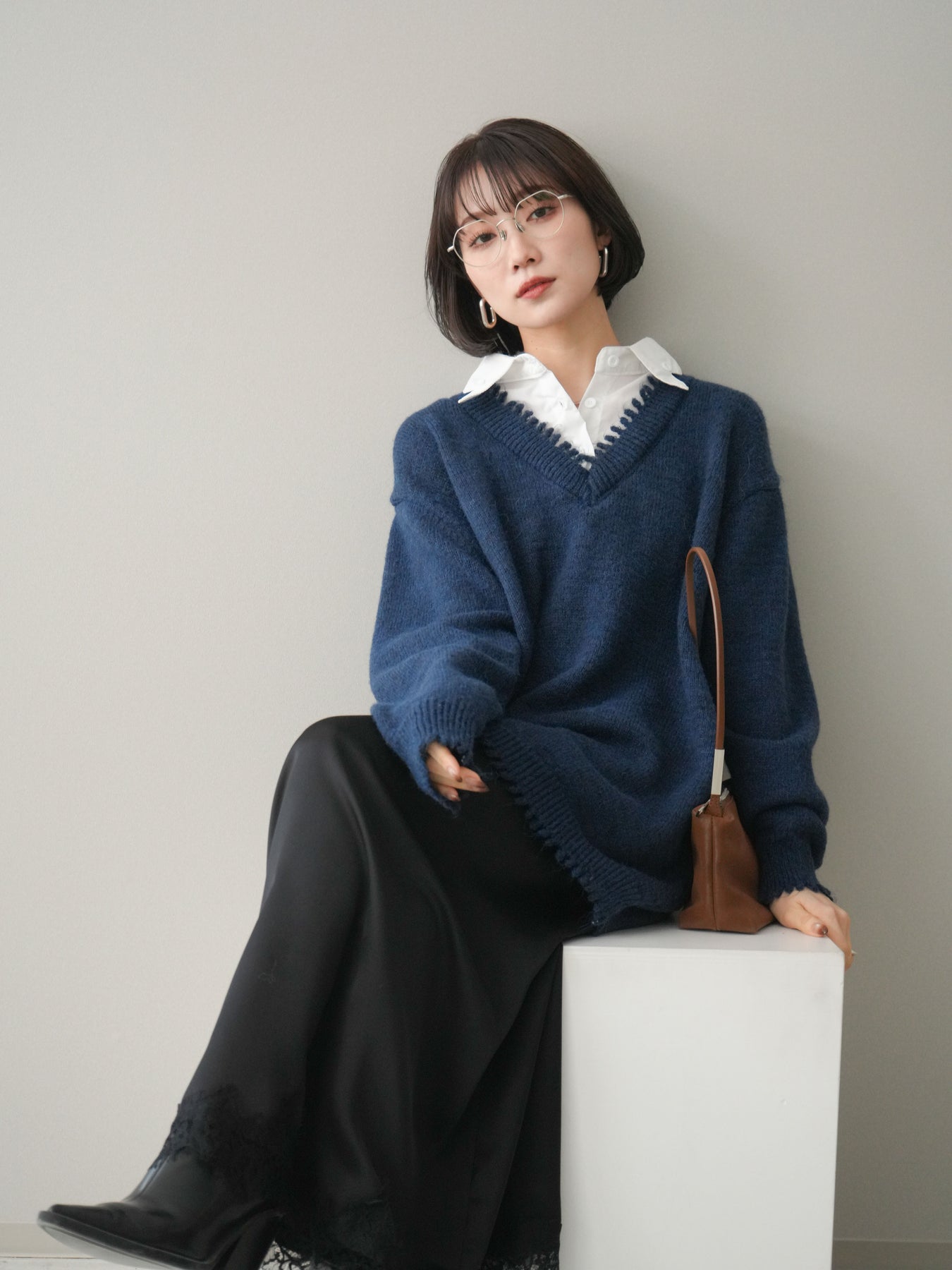 ◆ [予約]シャツドッキングVネックフリンジニットプルオーバー