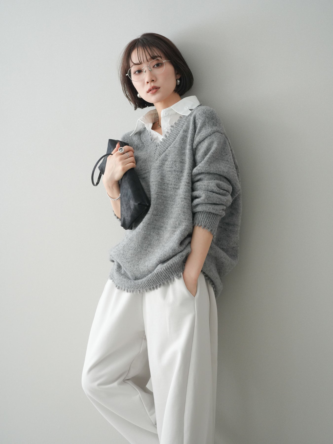 Vネックニットにシャツをレイヤードしたようなデザインが目を惹くドッキングプルオーバー。襟元から覗くシャツディテールが程よいきちんと感を演出し、1枚でコーディネートが完成するのが魅力です。裾にはフリンジを施し、シンプルな中にも動きと抜け感をプラス。ゆとりのあるシルエットで体のラインを拾いにくく、デニムやスラックス、スカートまで幅広いボトムスと相性良く着用できます。デイリーからお出かけまで活躍する着映えアイテムです。 ※ボトムス、キャミソール(インナー)以外の商品は一律でインナーは付属していません。