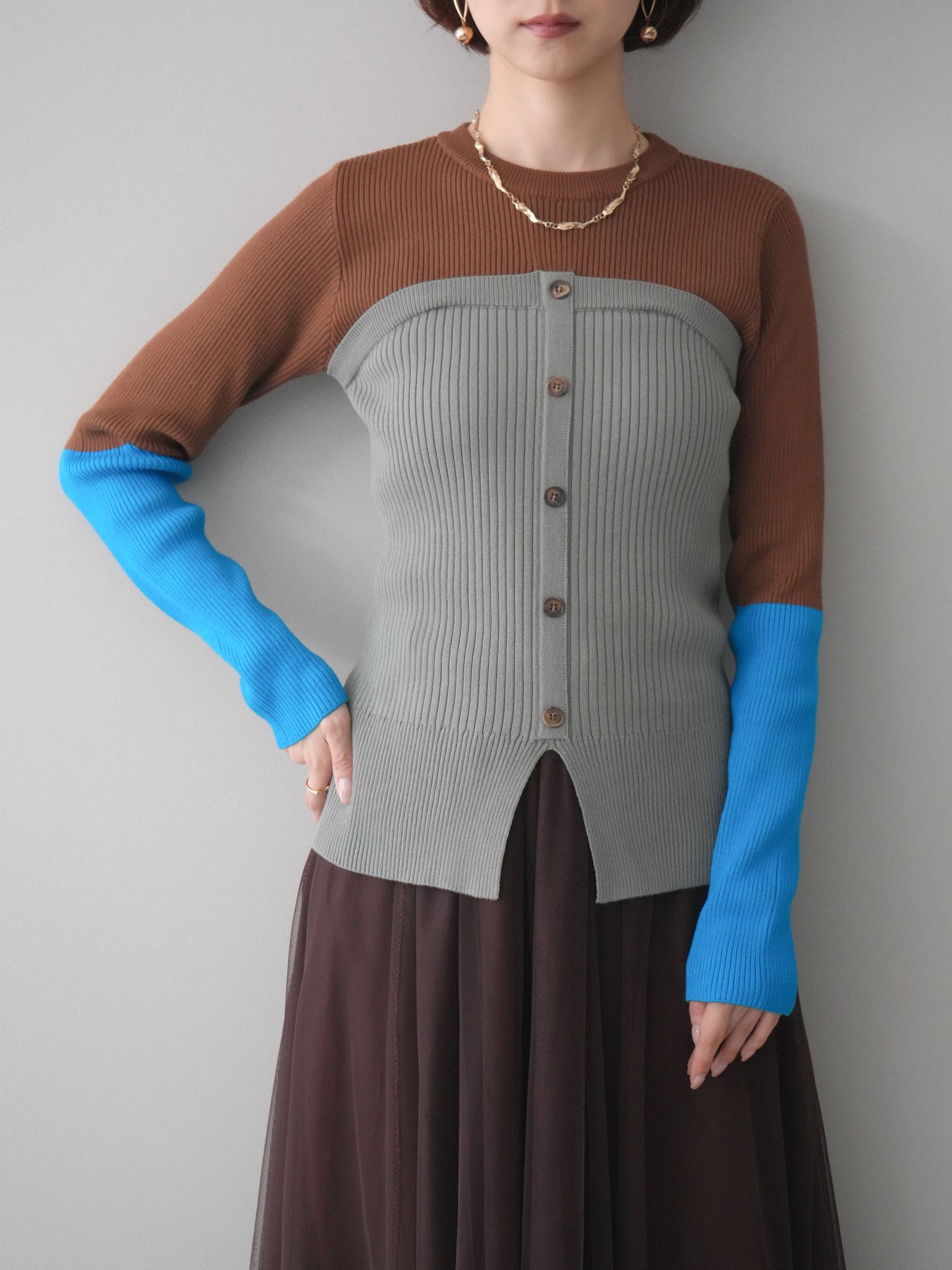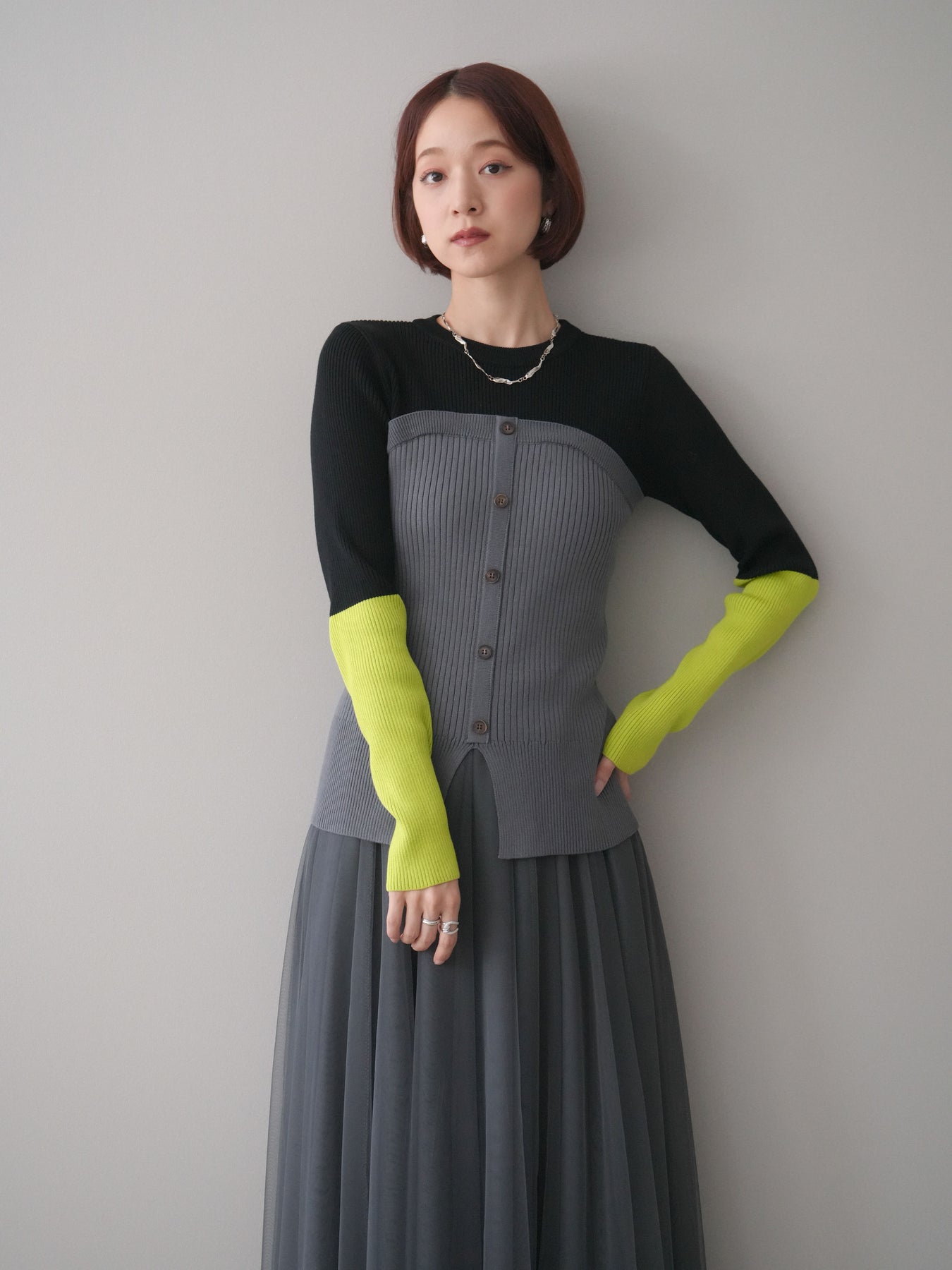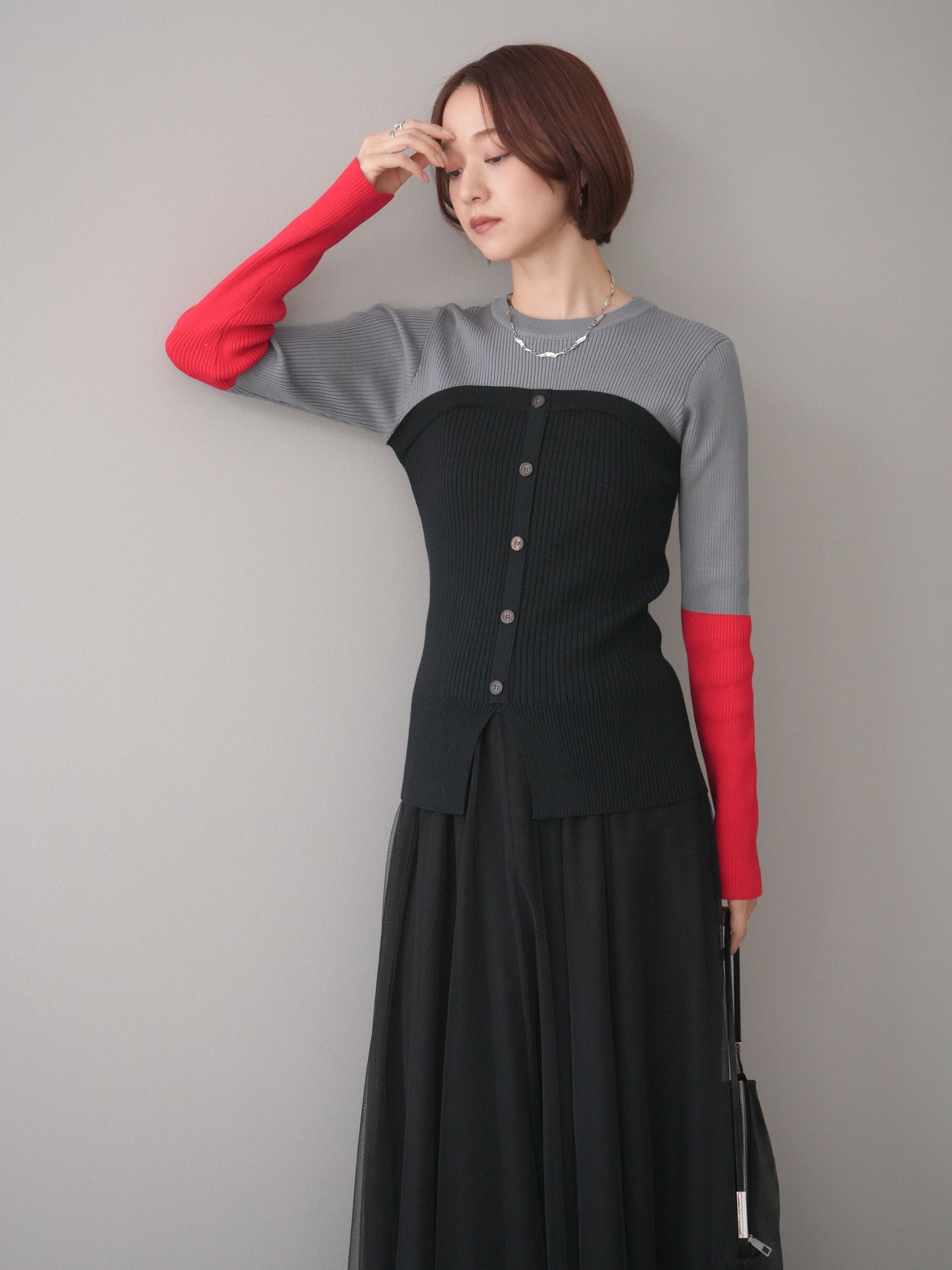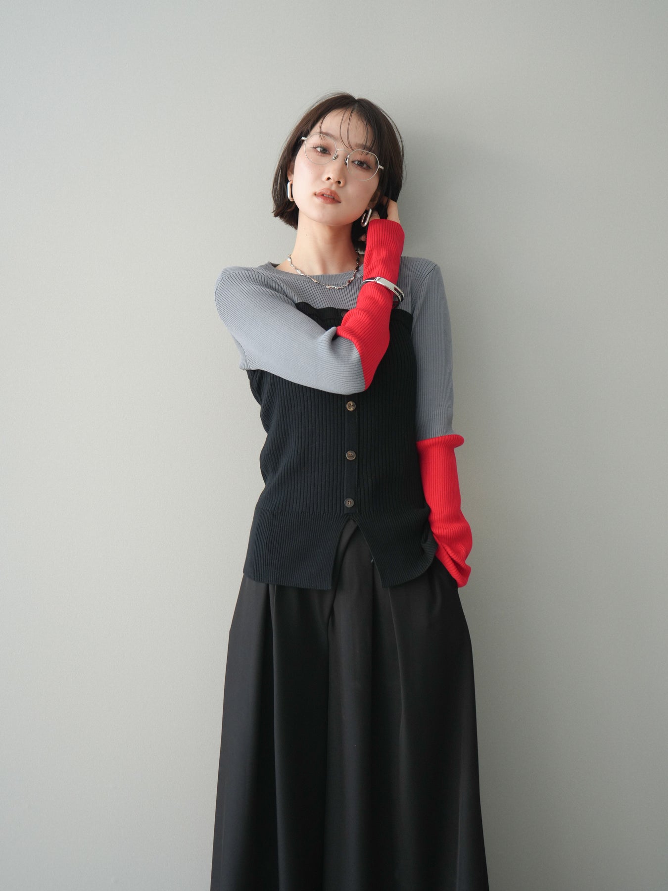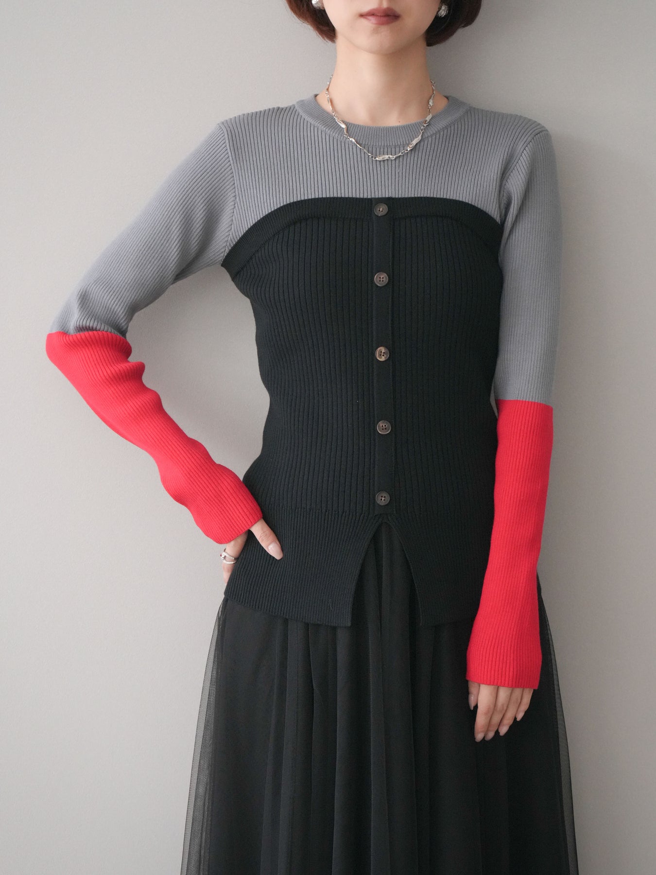 ビスチェを重ねたようなデザインが目を惹く、配色ドッキング仕様のリブニットトップス。立体感のある切り替えとフロントのボタンディテールが、シンプルな着こなしにも奥行きをプラスします。程よくフィットするリブ素材が身体のラインをきれいに見せつつ、1枚でコーディネートが完成するのも魅力。デニムやスラックス、スカートまで幅広いボトムスと相性が良く、デイリーからお出かけまで活躍する着映えアイテムです。 ※ボトムス、キャミソール(インナー)以外の商品は一律でインナーは付属していません。
