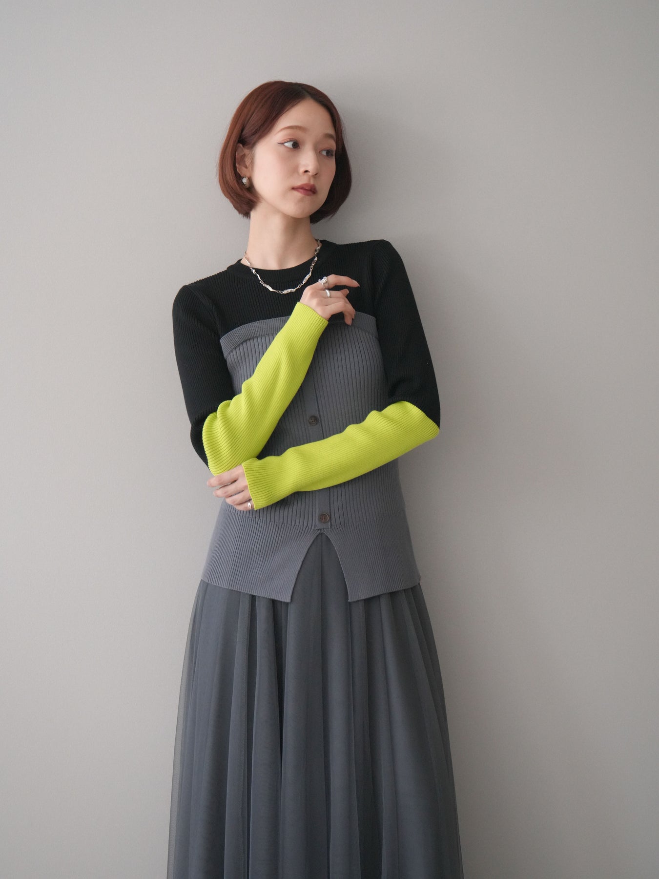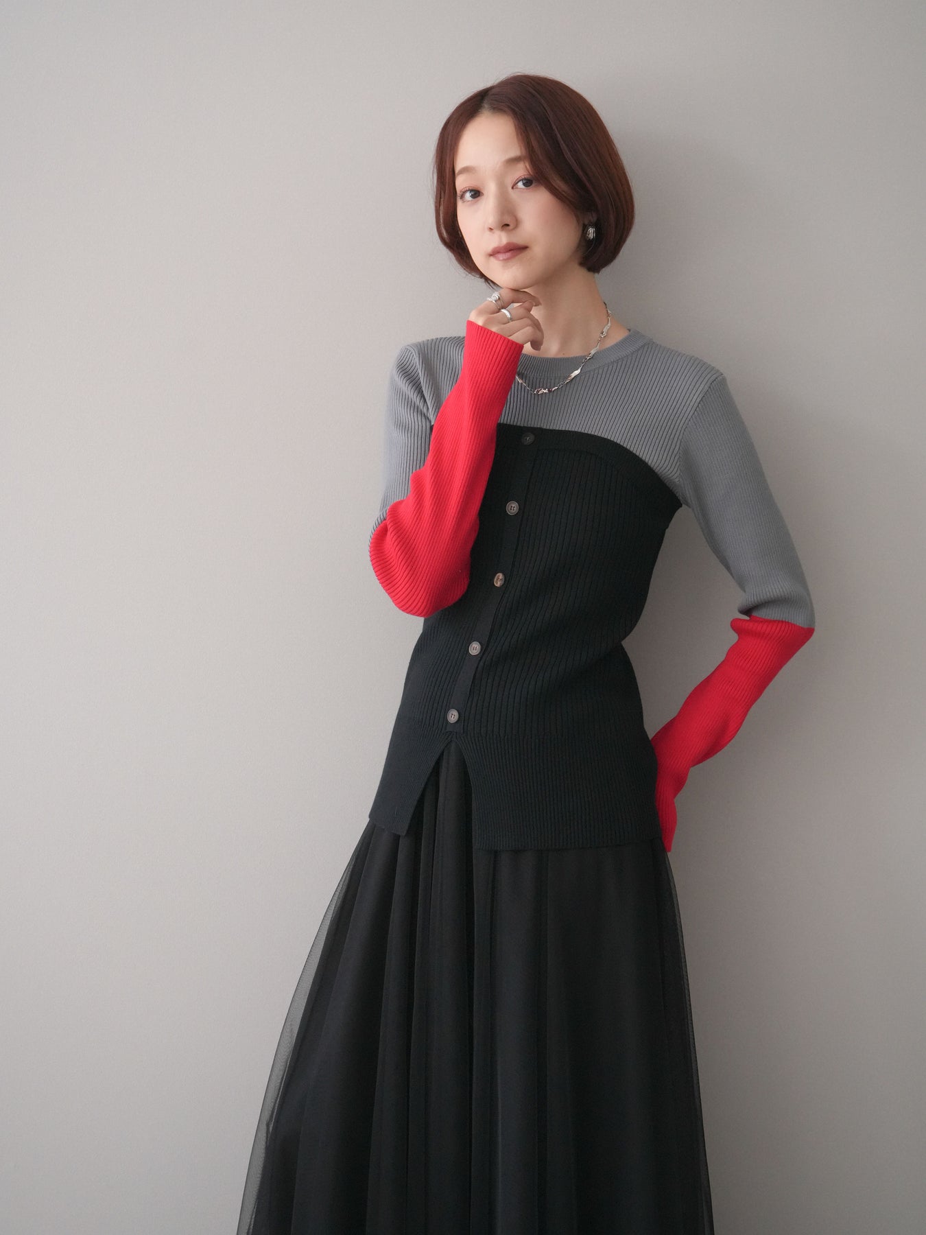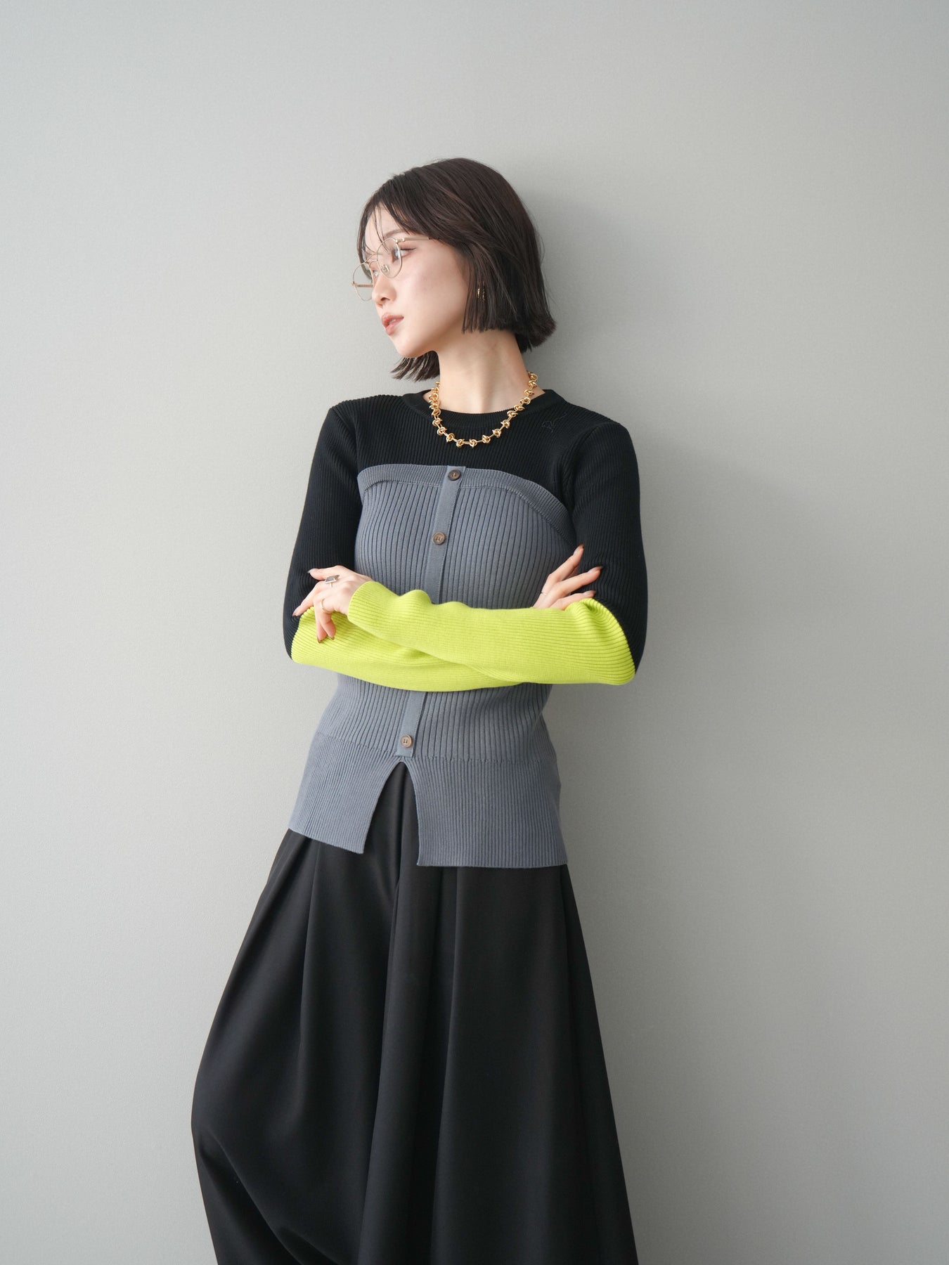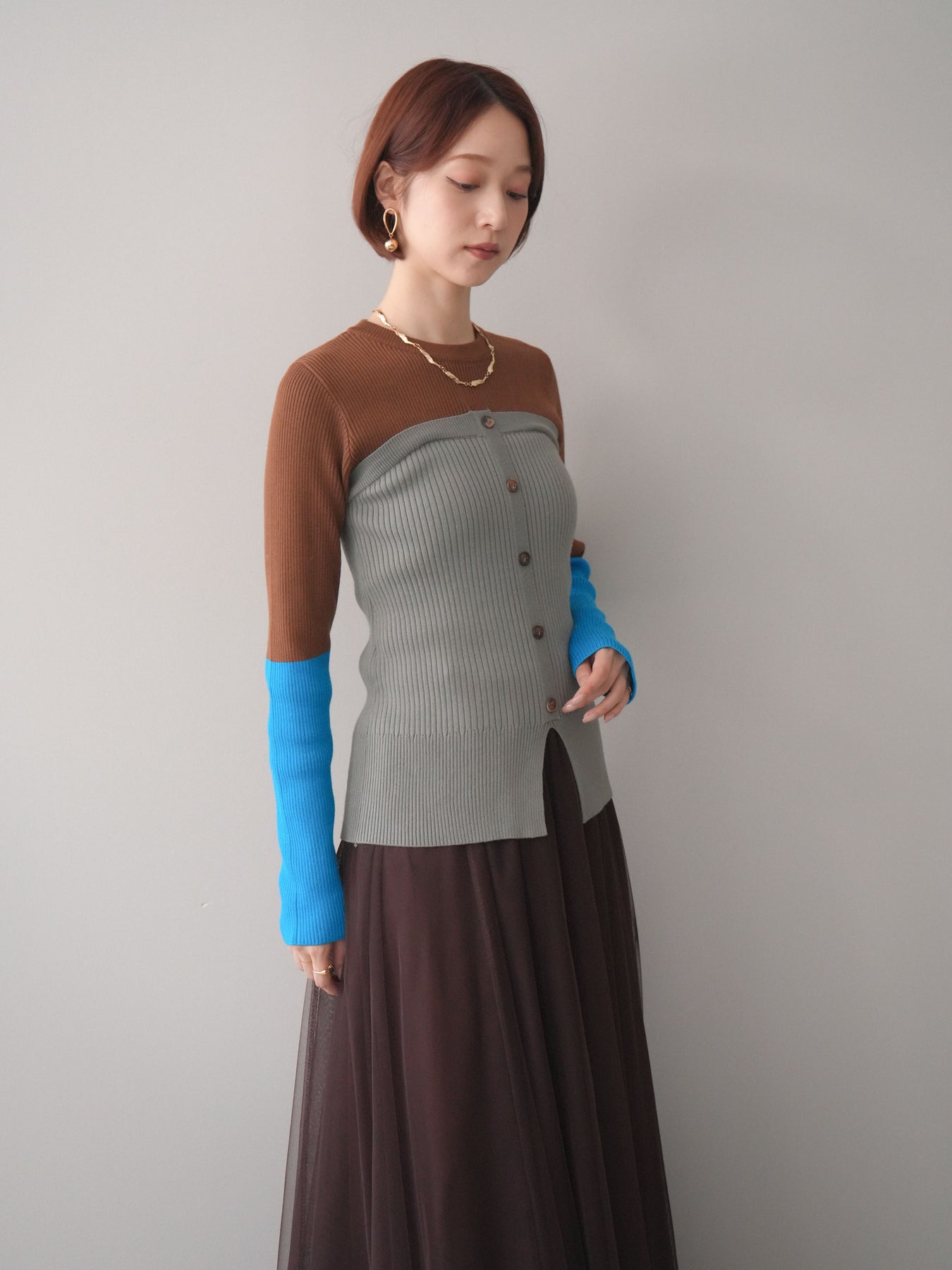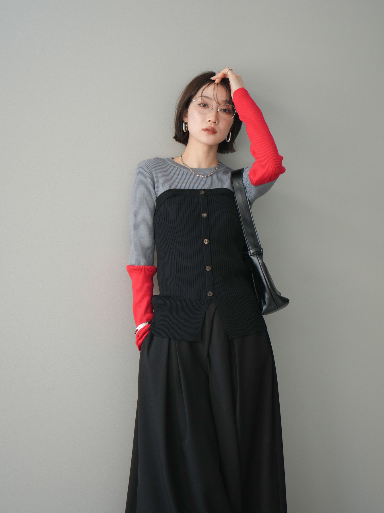 ビスチェを重ねたようなデザインが目を惹く、配色ドッキング仕様のリブニットトップス。立体感のある切り替えとフロントのボタンディテールが、シンプルな着こなしにも奥行きをプラスします。程よくフィットするリブ素材が身体のラインをきれいに見せつつ、1枚でコーディネートが完成するのも魅力。デニムやスラックス、スカートまで幅広いボトムスと相性が良く、デイリーからお出かけまで活躍する着映えアイテムです。 ※ボトムス、キャミソール(インナー)以外の商品は一律でインナーは付属していません。