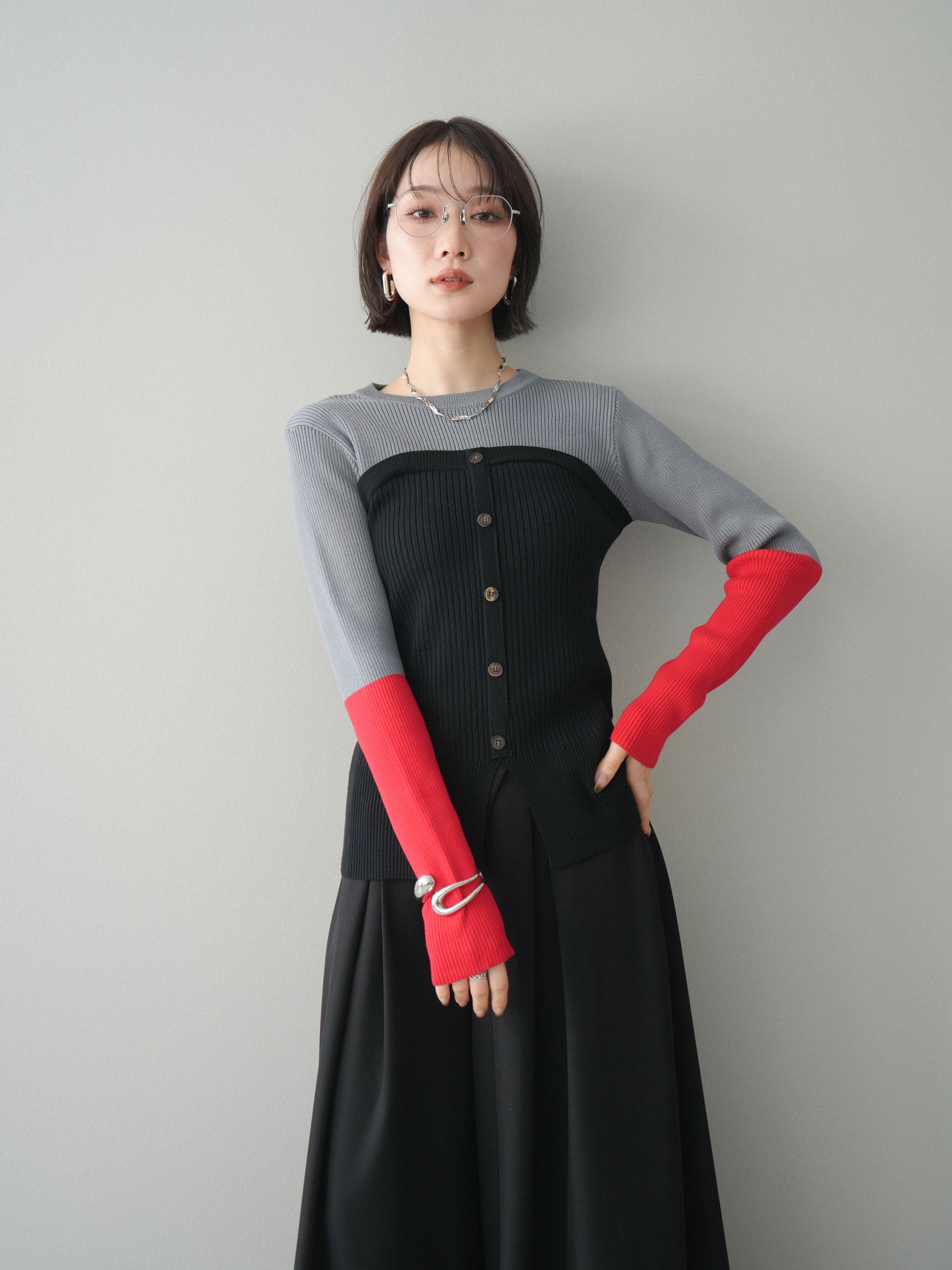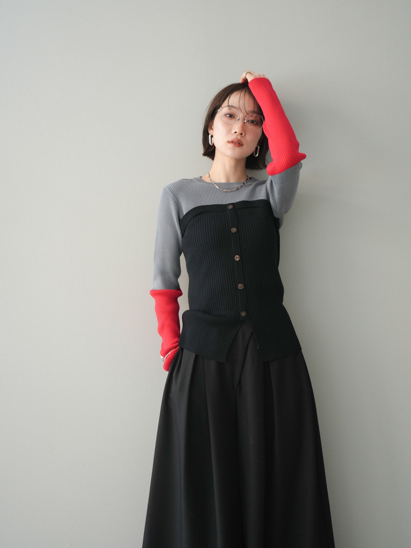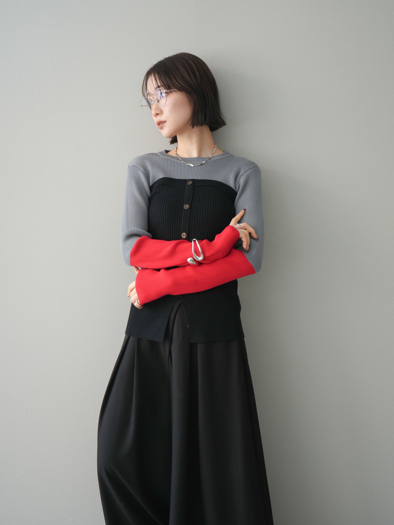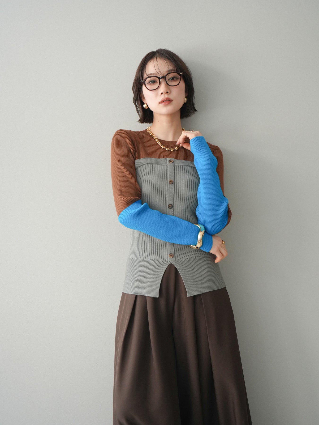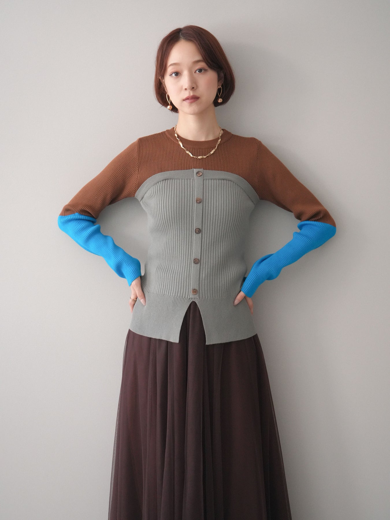 ビスチェを重ねたようなデザインが目を惹く、配色ドッキング仕様のリブニットトップス。立体感のある切り替えとフロントのボタンディテールが、シンプルな着こなしにも奥行きをプラスします。程よくフィットするリブ素材が身体のラインをきれいに見せつつ、1枚でコーディネートが完成するのも魅力。デニムやスラックス、スカートまで幅広いボトムスと相性が良く、デイリーからお出かけまで活躍する着映えアイテムです。 ※ボトムス、キャミソール(インナー)以外の商品は一律でインナーは付属していません。