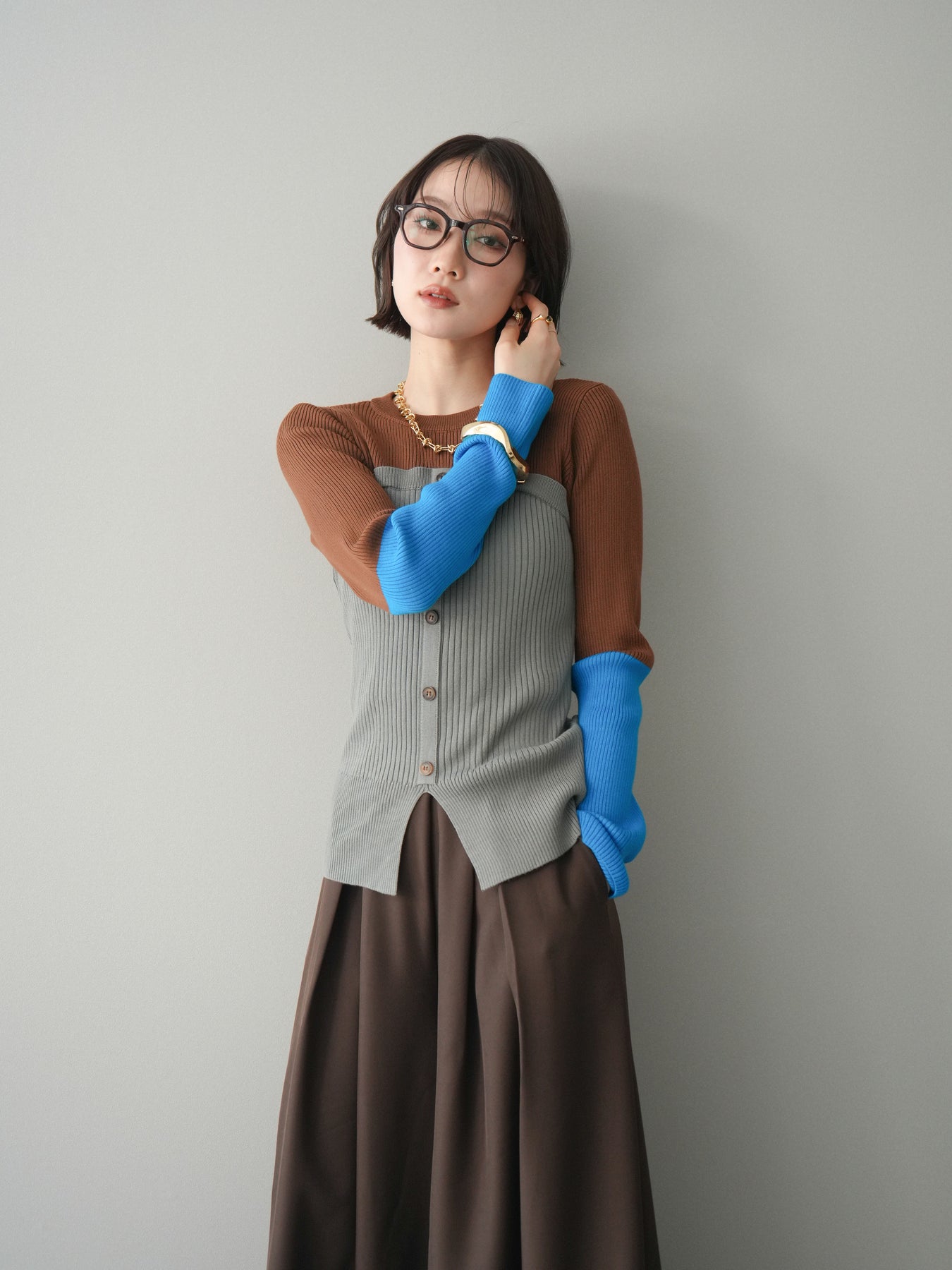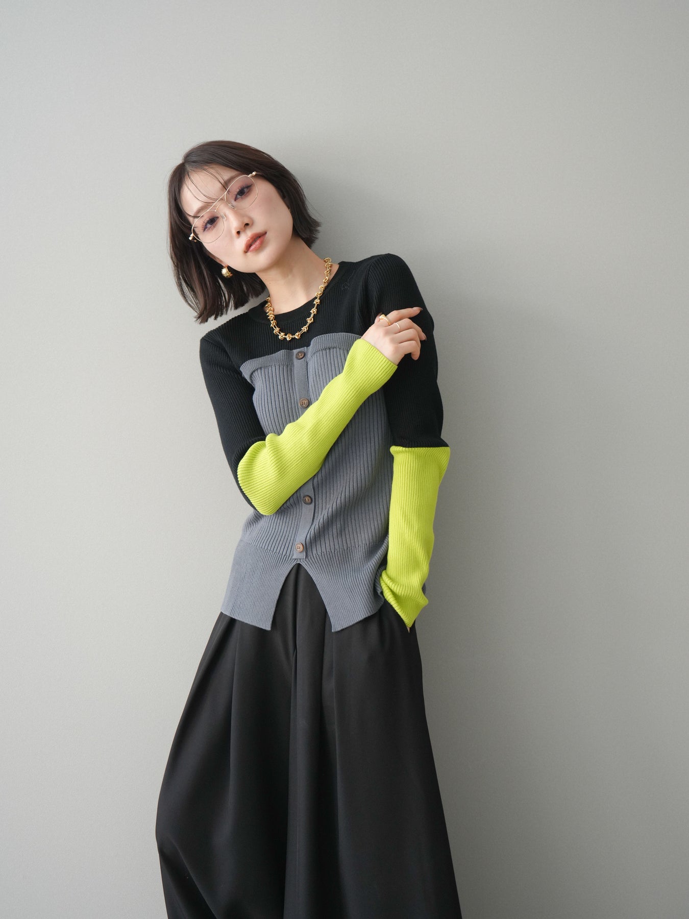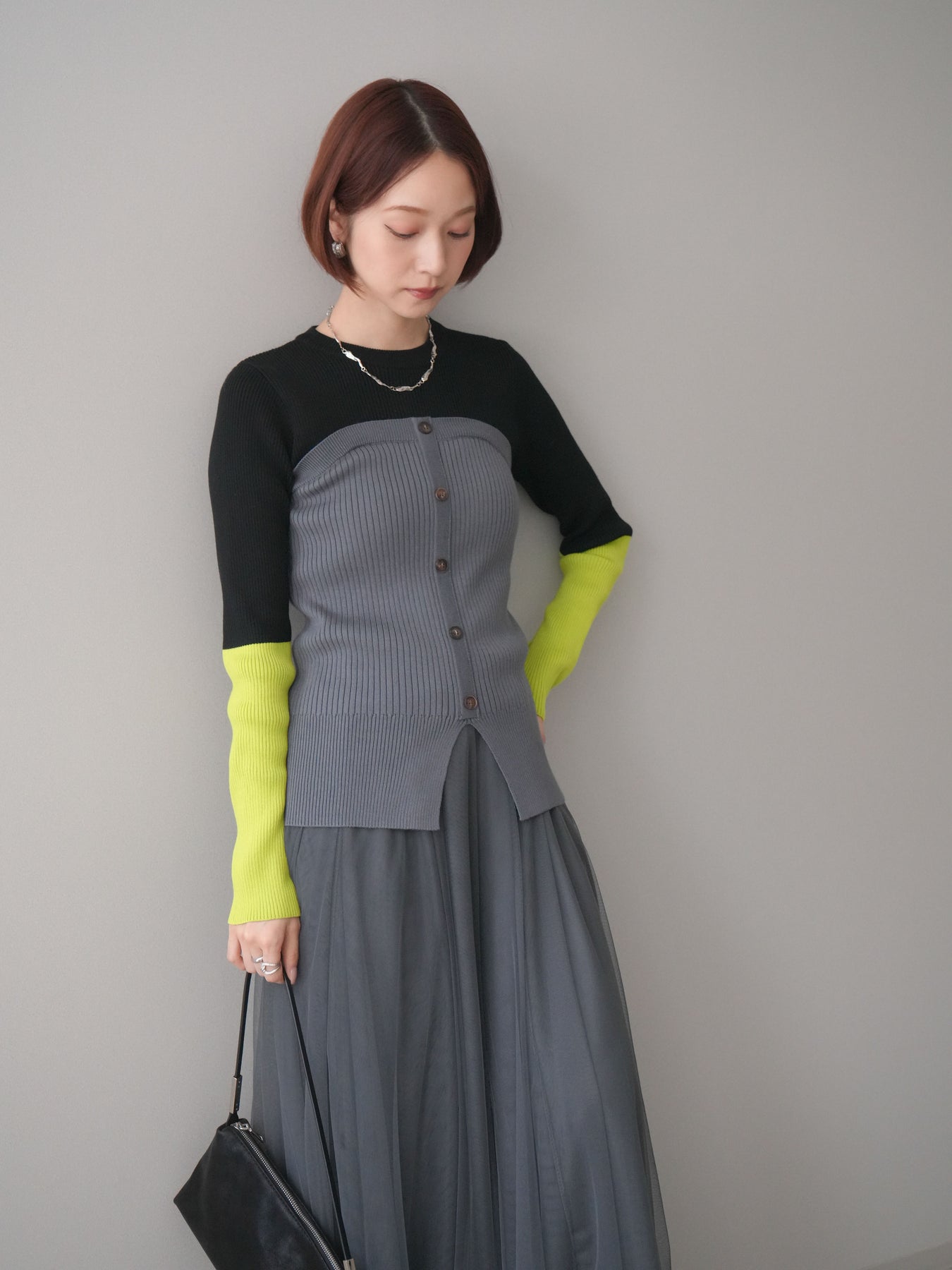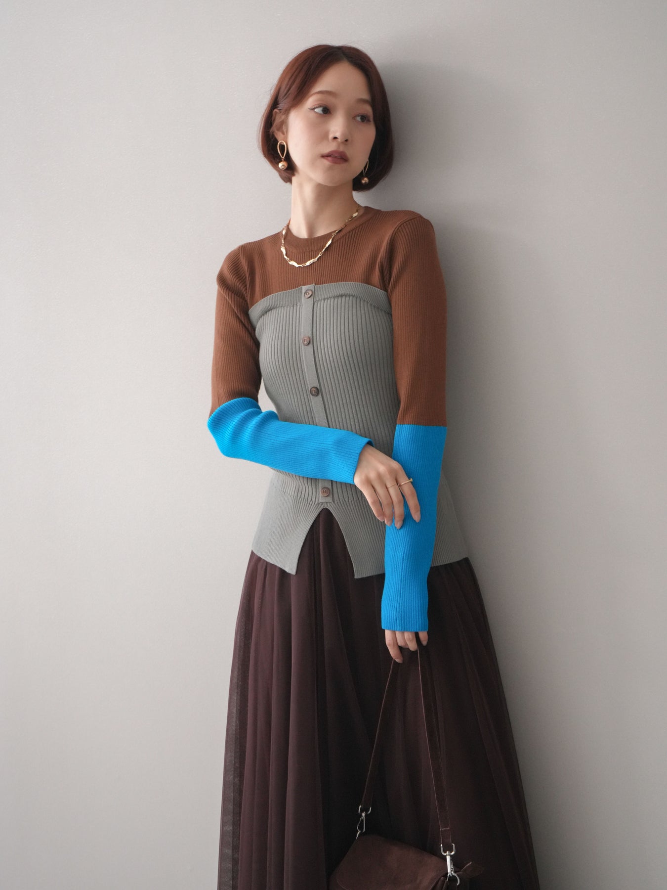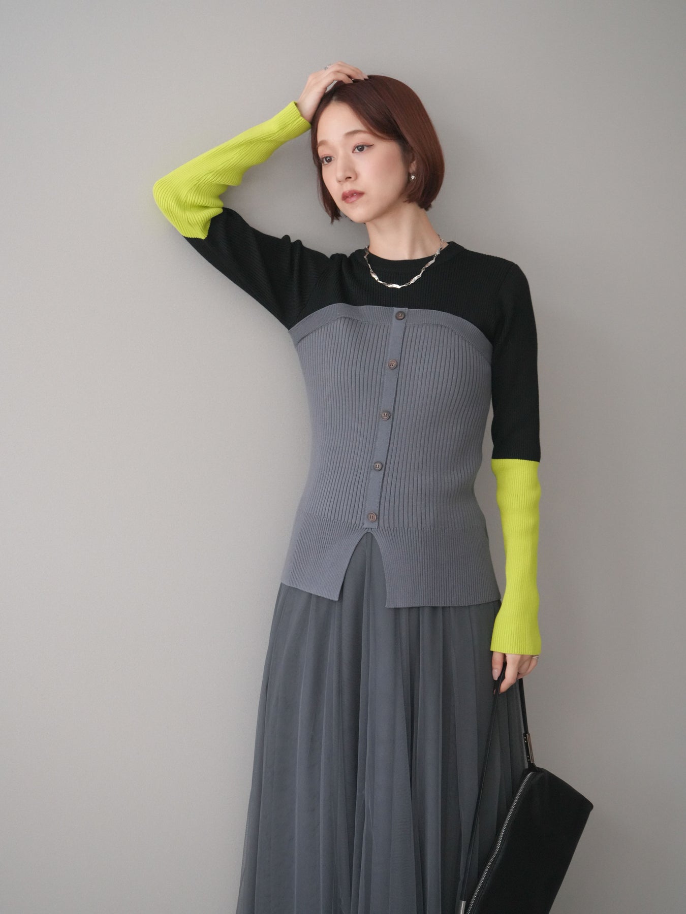 ビスチェを重ねたようなデザインが目を惹く、配色ドッキング仕様のリブニットトップス。立体感のある切り替えとフロントのボタンディテールが、シンプルな着こなしにも奥行きをプラスします。程よくフィットするリブ素材が身体のラインをきれいに見せつつ、1枚でコーディネートが完成するのも魅力。デニムやスラックス、スカートまで幅広いボトムスと相性が良く、デイリーからお出かけまで活躍する着映えアイテムです。 ※ボトムス、キャミソール(インナー)以外の商品は一律でインナーは付属していません。