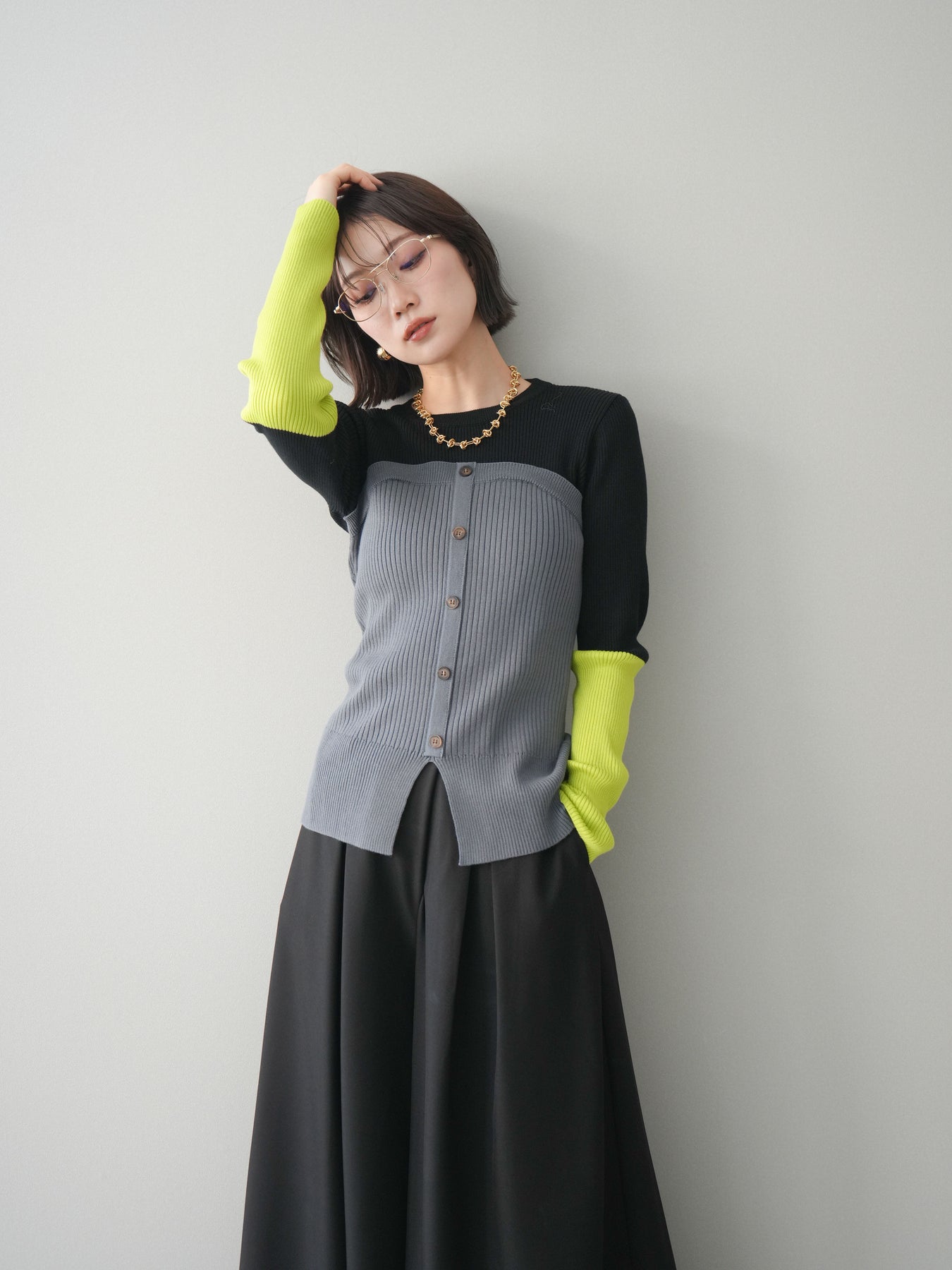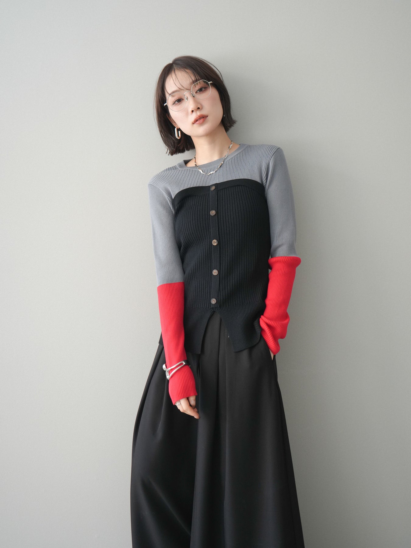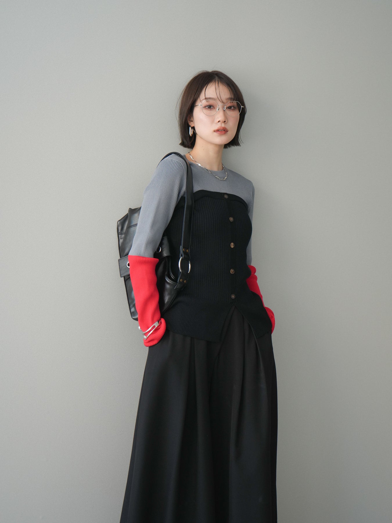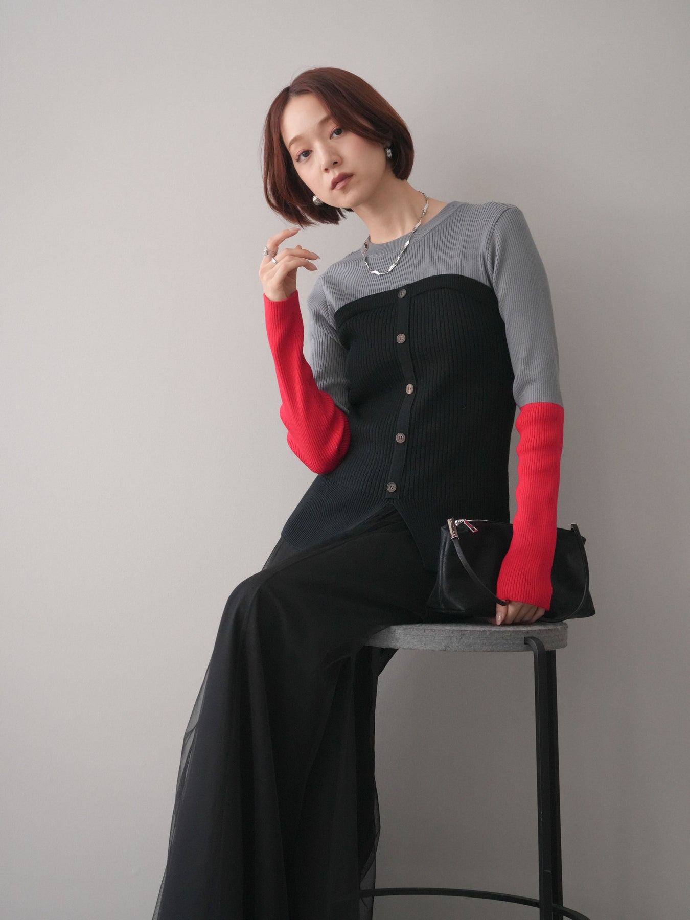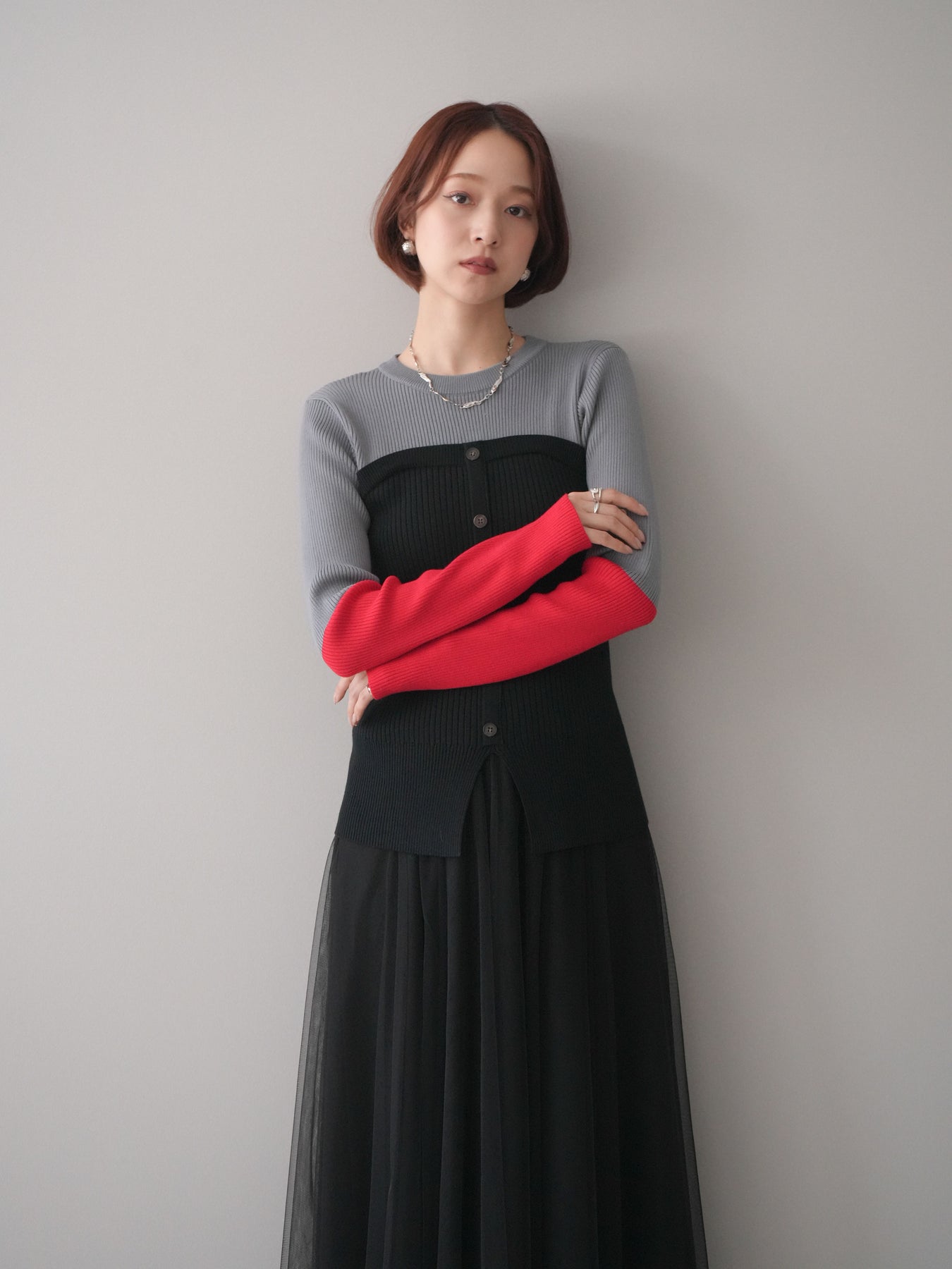 ビスチェを重ねたようなデザインが目を惹く、配色ドッキング仕様のリブニットトップス。立体感のある切り替えとフロントのボタンディテールが、シンプルな着こなしにも奥行きをプラスします。程よくフィットするリブ素材が身体のラインをきれいに見せつつ、1枚でコーディネートが完成するのも魅力。デニムやスラックス、スカートまで幅広いボトムスと相性が良く、デイリーからお出かけまで活躍する着映えアイテムです。 ※ボトムス、キャミソール(インナー)以外の商品は一律でインナーは付属していません。
