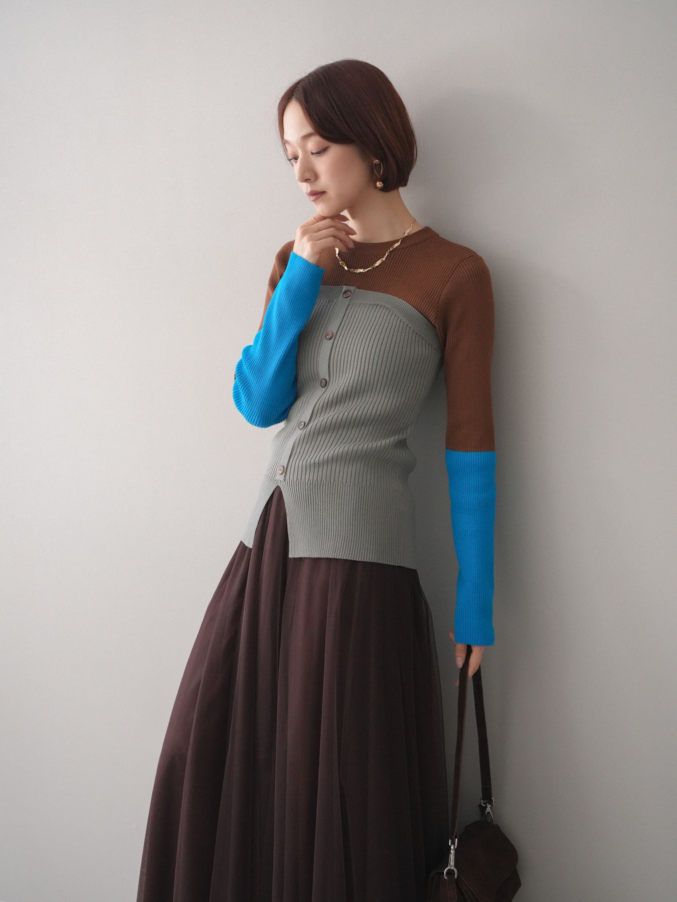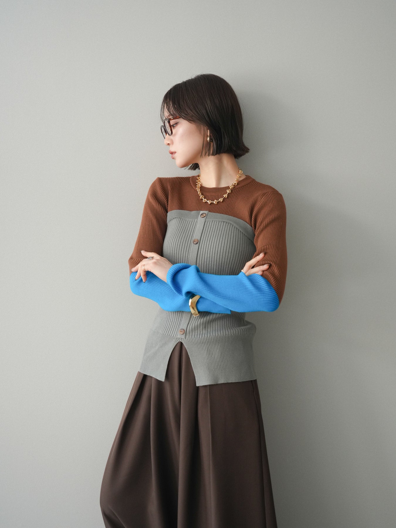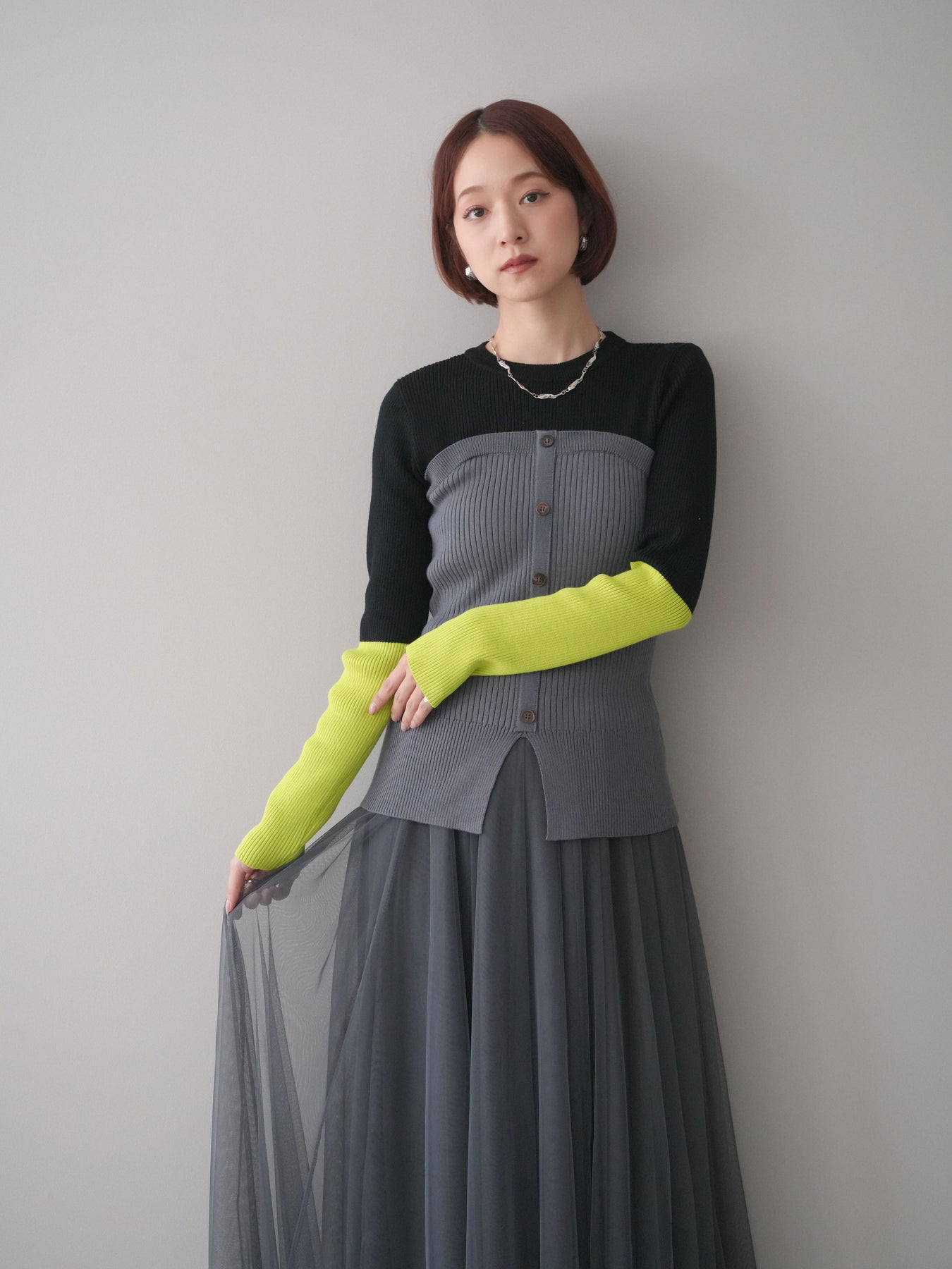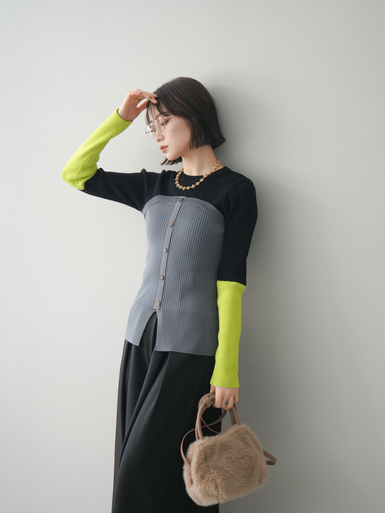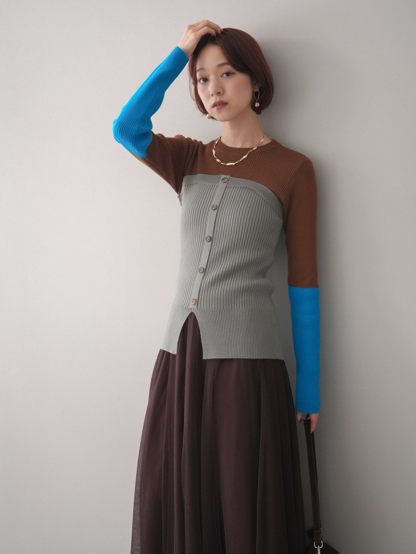 ビスチェを重ねたようなデザインが目を惹く、配色ドッキング仕様のリブニットトップス。立体感のある切り替えとフロントのボタンディテールが、シンプルな着こなしにも奥行きをプラスします。程よくフィットするリブ素材が身体のラインをきれいに見せつつ、1枚でコーディネートが完成するのも魅力。デニムやスラックス、スカートまで幅広いボトムスと相性が良く、デイリーからお出かけまで活躍する着映えアイテムです。 ※ボトムス、キャミソール(インナー)以外の商品は一律でインナーは付属していません。