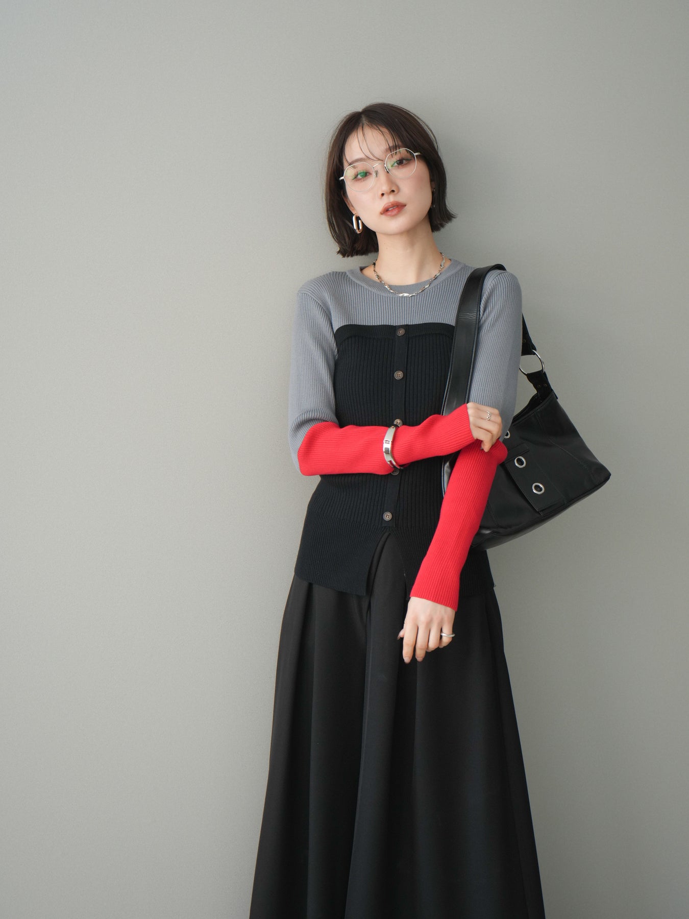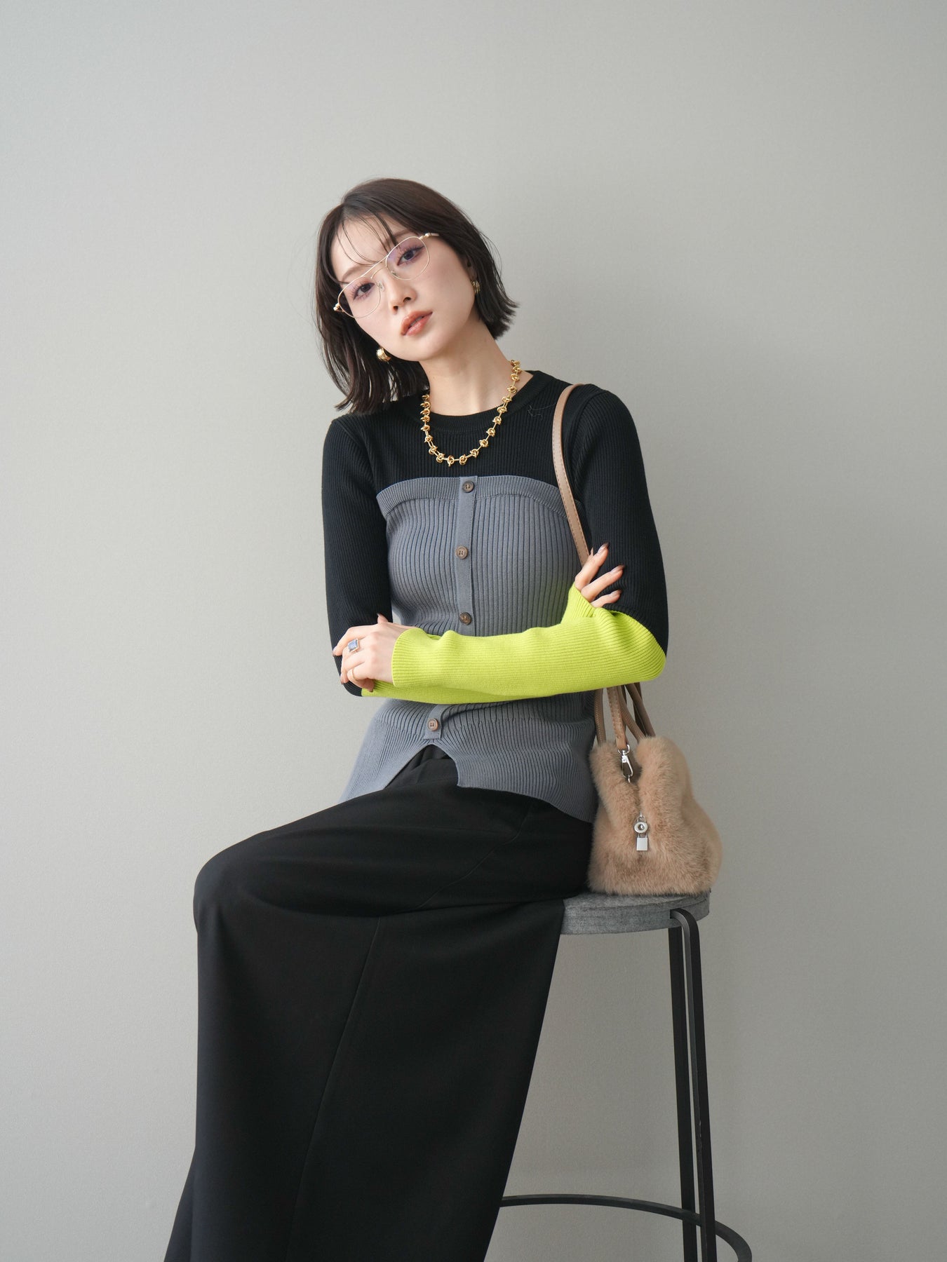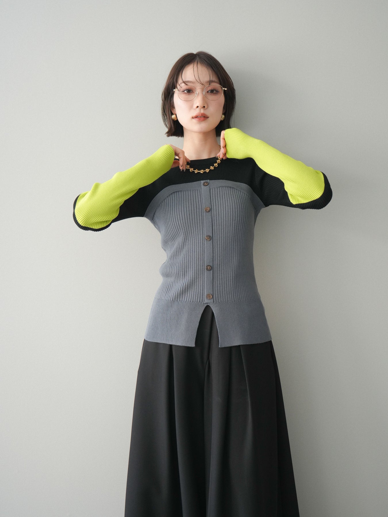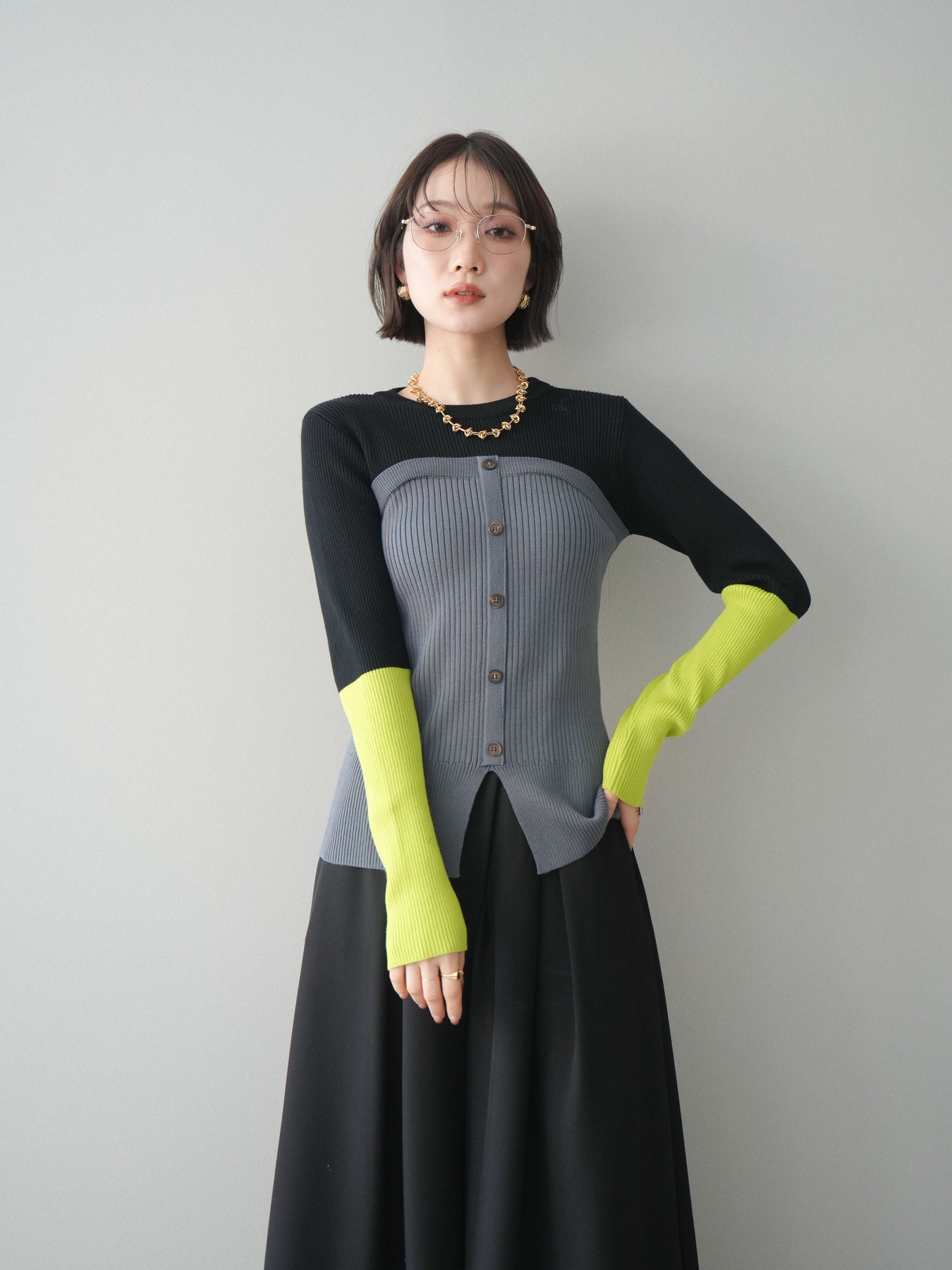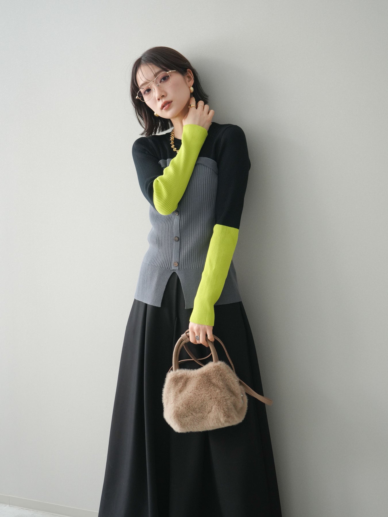 ビスチェを重ねたようなデザインが目を惹く、配色ドッキング仕様のリブニットトップス。立体感のある切り替えとフロントのボタンディテールが、シンプルな着こなしにも奥行きをプラスします。程よくフィットするリブ素材が身体のラインをきれいに見せつつ、1枚でコーディネートが完成するのも魅力。デニムやスラックス、スカートまで幅広いボトムスと相性が良く、デイリーからお出かけまで活躍する着映えアイテムです。 ※ボトムス、キャミソール(インナー)以外の商品は一律でインナーは付属していません。