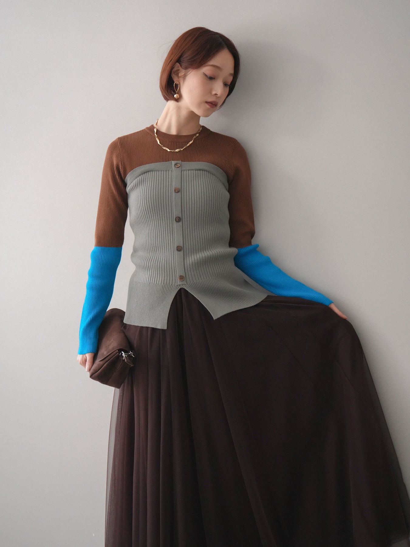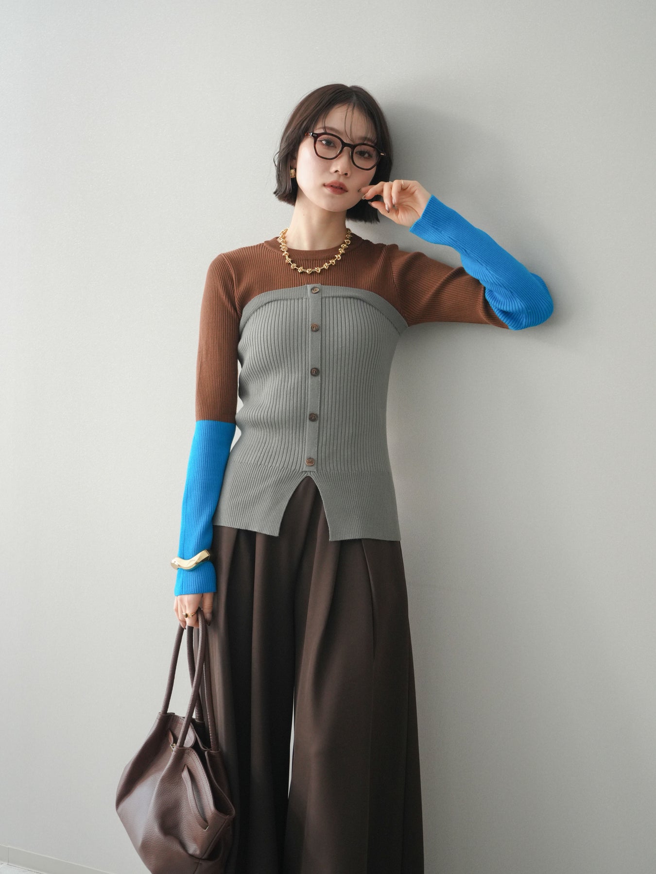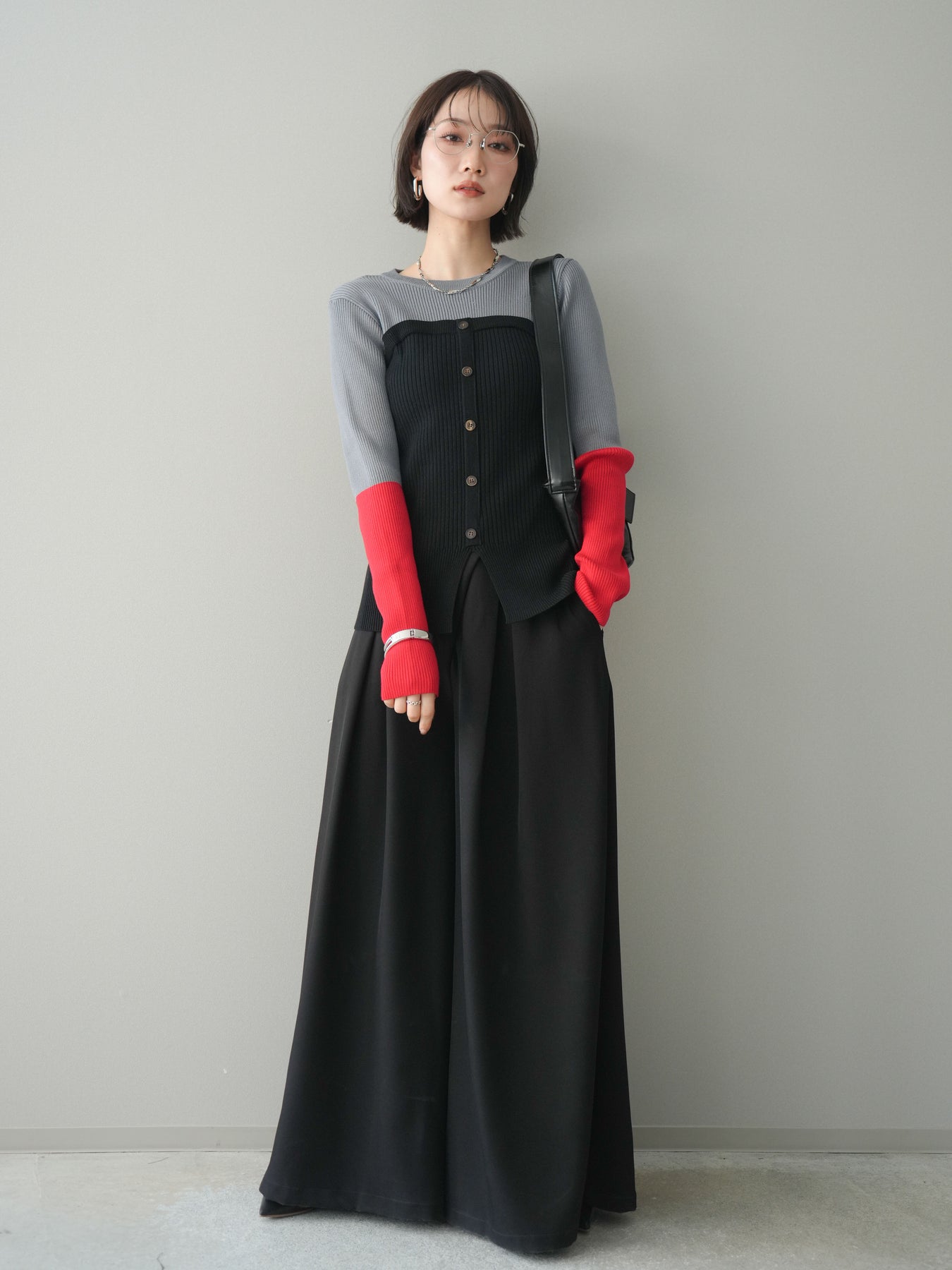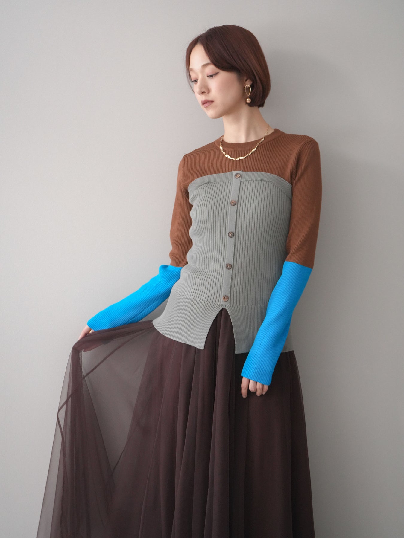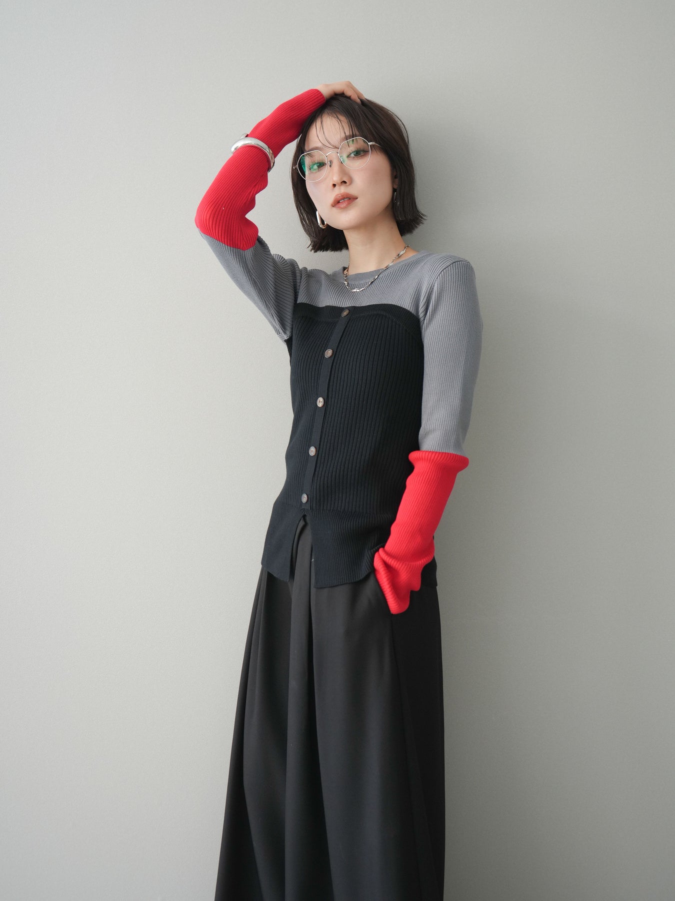 ビスチェを重ねたようなデザインが目を惹く、配色ドッキング仕様のリブニットトップス。立体感のある切り替えとフロントのボタンディテールが、シンプルな着こなしにも奥行きをプラスします。程よくフィットするリブ素材が身体のラインをきれいに見せつつ、1枚でコーディネートが完成するのも魅力。デニムやスラックス、スカートまで幅広いボトムスと相性が良く、デイリーからお出かけまで活躍する着映えアイテムです。 ※ボトムス、キャミソール(インナー)以外の商品は一律でインナーは付属していません。