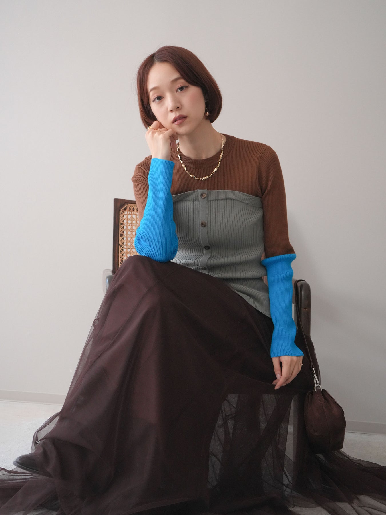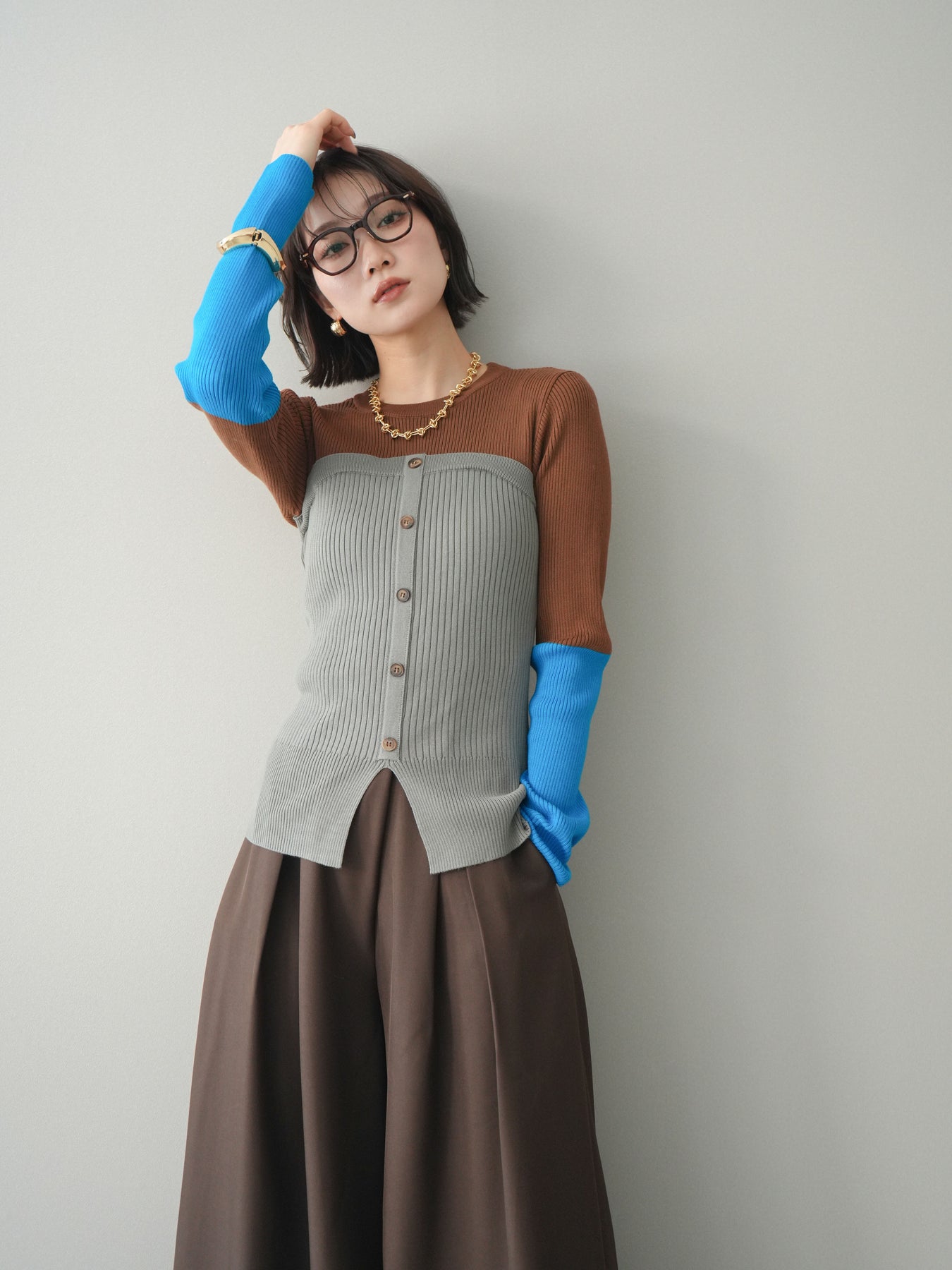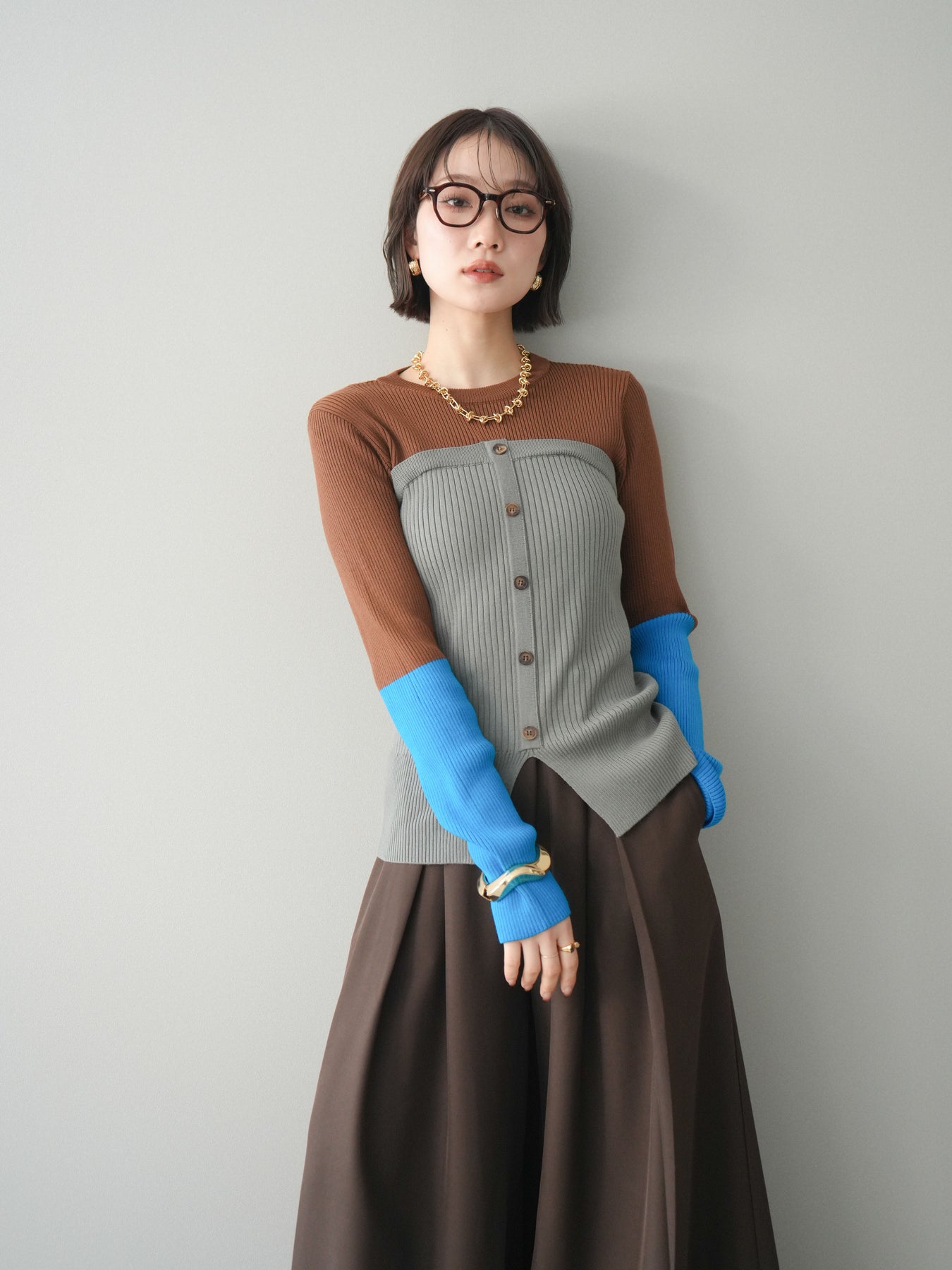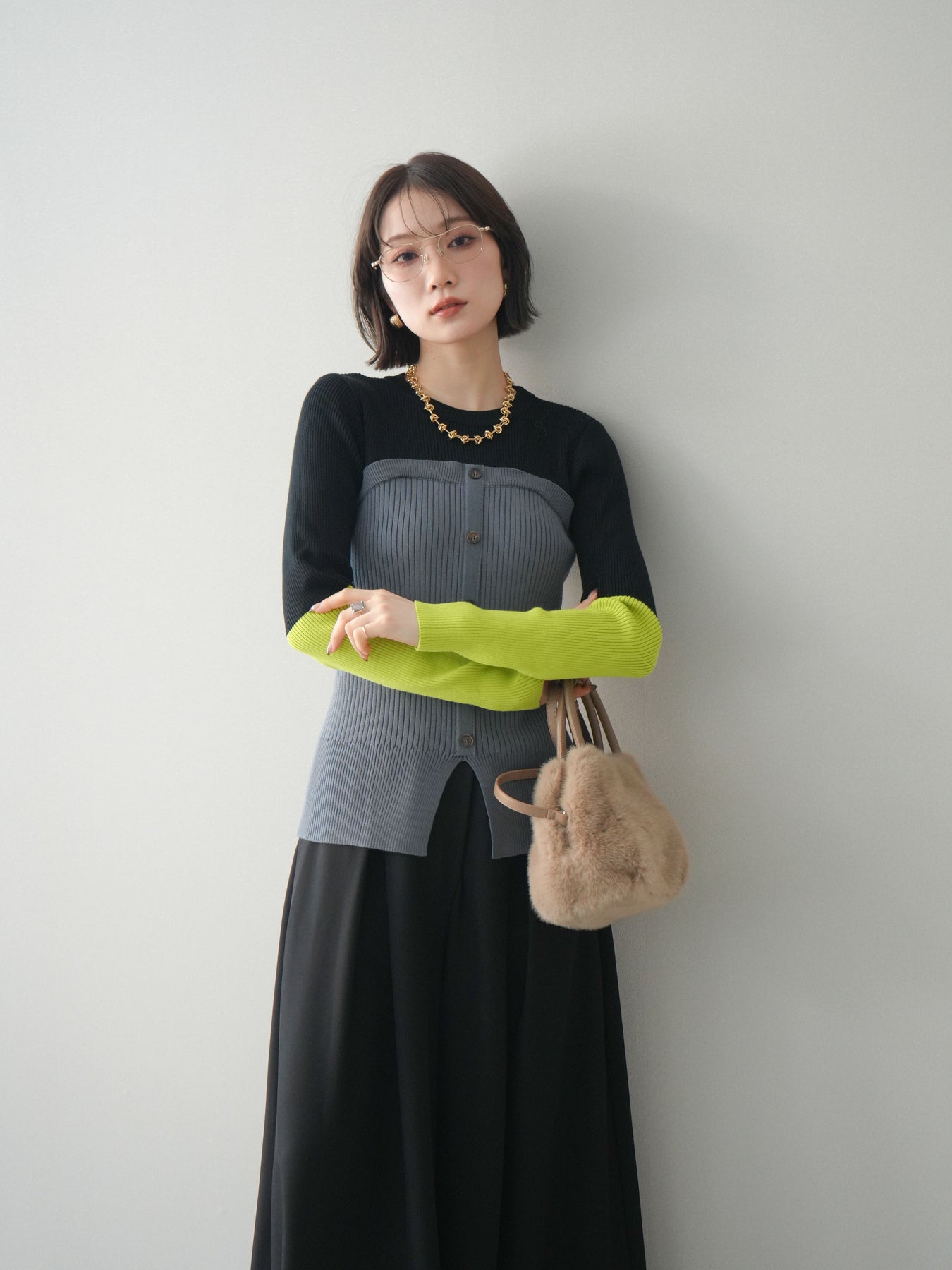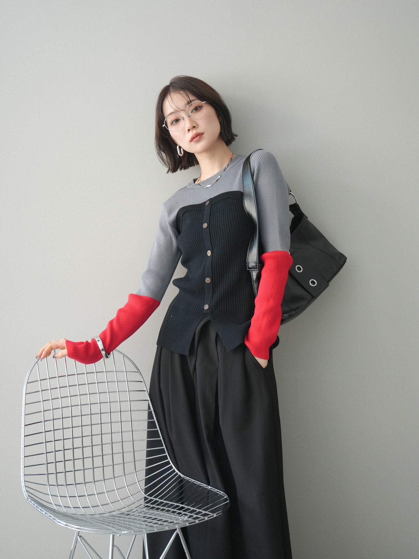 ビスチェを重ねたようなデザインが目を惹く、配色ドッキング仕様のリブニットトップス。立体感のある切り替えとフロントのボタンディテールが、シンプルな着こなしにも奥行きをプラスします。程よくフィットするリブ素材が身体のラインをきれいに見せつつ、1枚でコーディネートが完成するのも魅力。デニムやスラックス、スカートまで幅広いボトムスと相性が良く、デイリーからお出かけまで活躍する着映えアイテムです。 ※ボトムス、キャミソール(インナー)以外の商品は一律でインナーは付属していません。