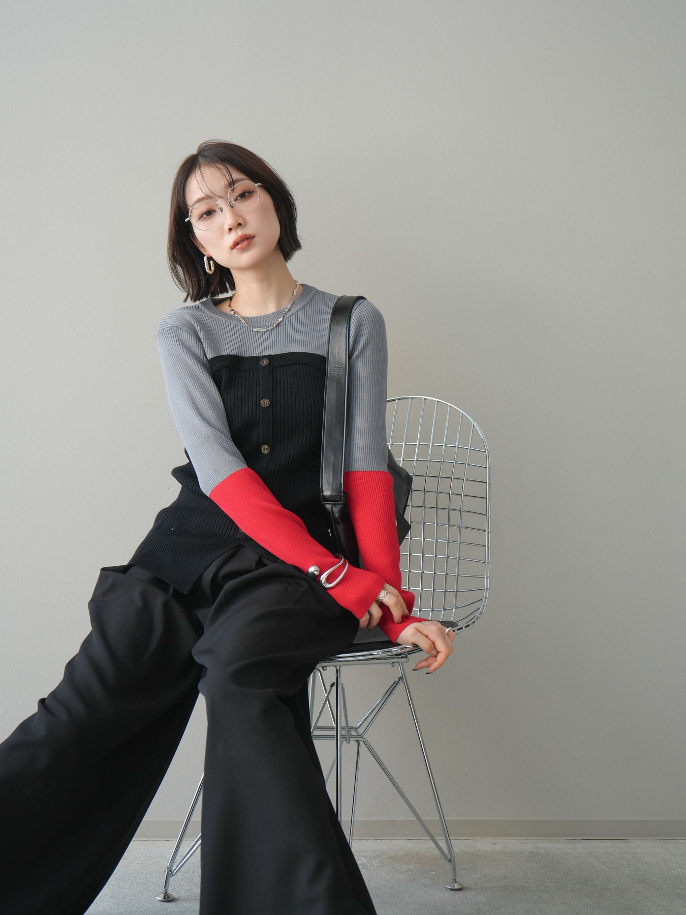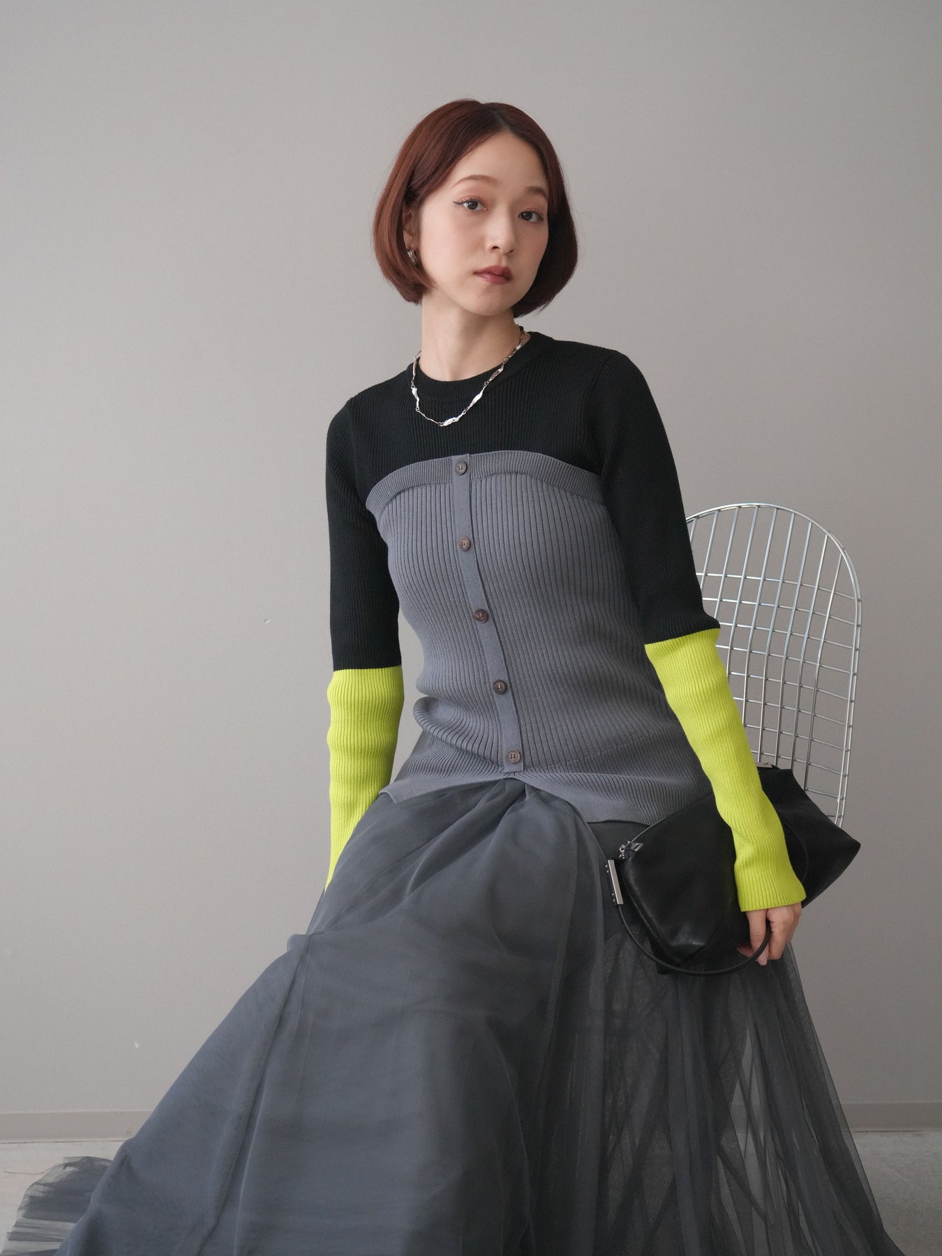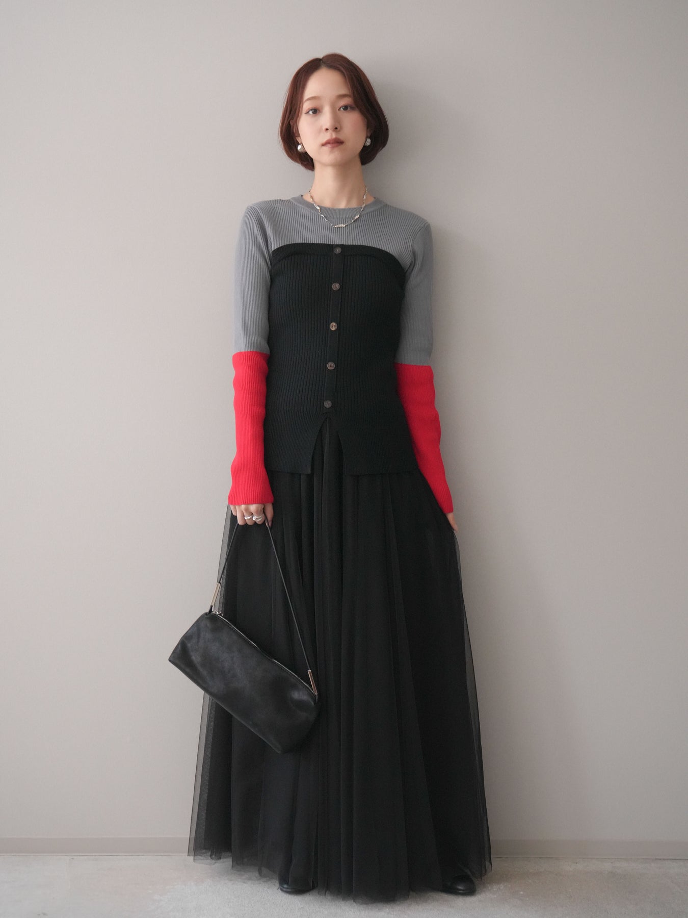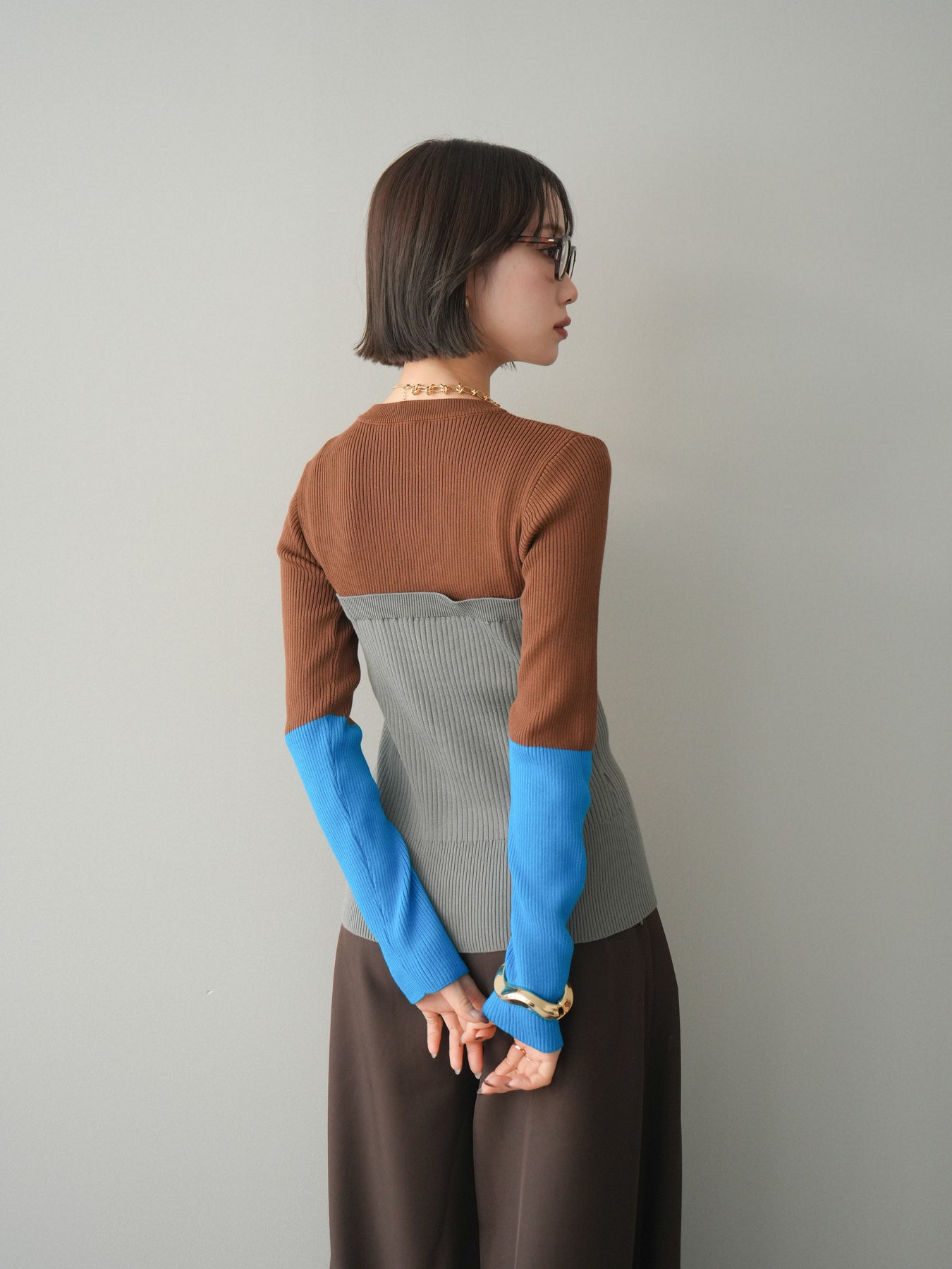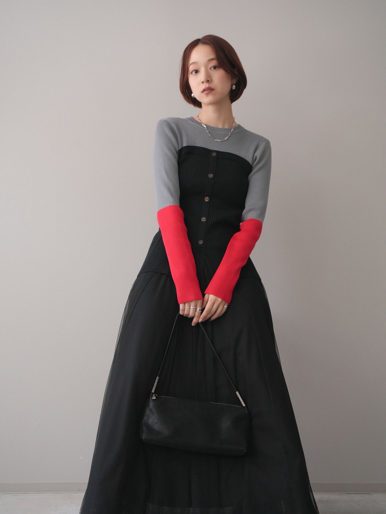 ビスチェを重ねたようなデザインが目を惹く、配色ドッキング仕様のリブニットトップス。立体感のある切り替えとフロントのボタンディテールが、シンプルな着こなしにも奥行きをプラスします。程よくフィットするリブ素材が身体のラインをきれいに見せつつ、1枚でコーディネートが完成するのも魅力。デニムやスラックス、スカートまで幅広いボトムスと相性が良く、デイリーからお出かけまで活躍する着映えアイテムです。 ※ボトムス、キャミソール(インナー)以外の商品は一律でインナーは付属していません。