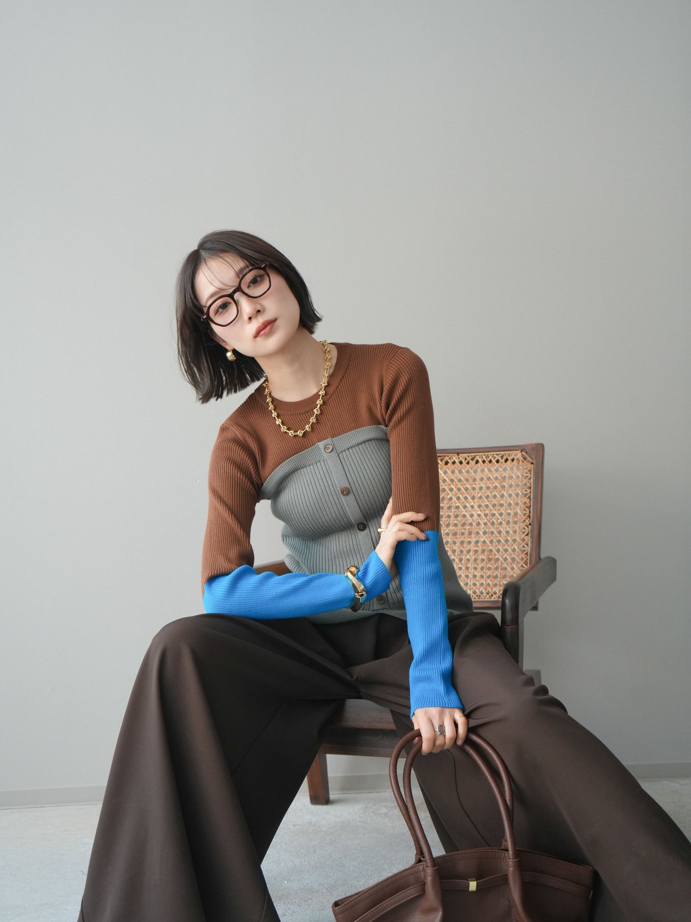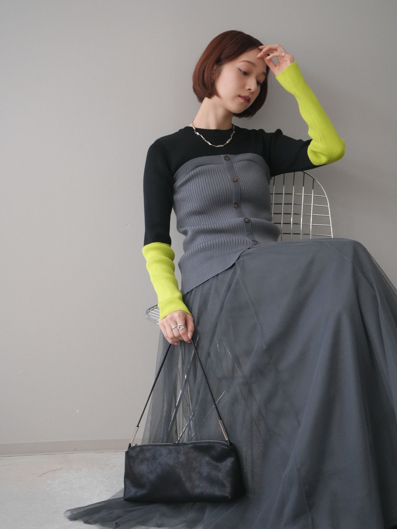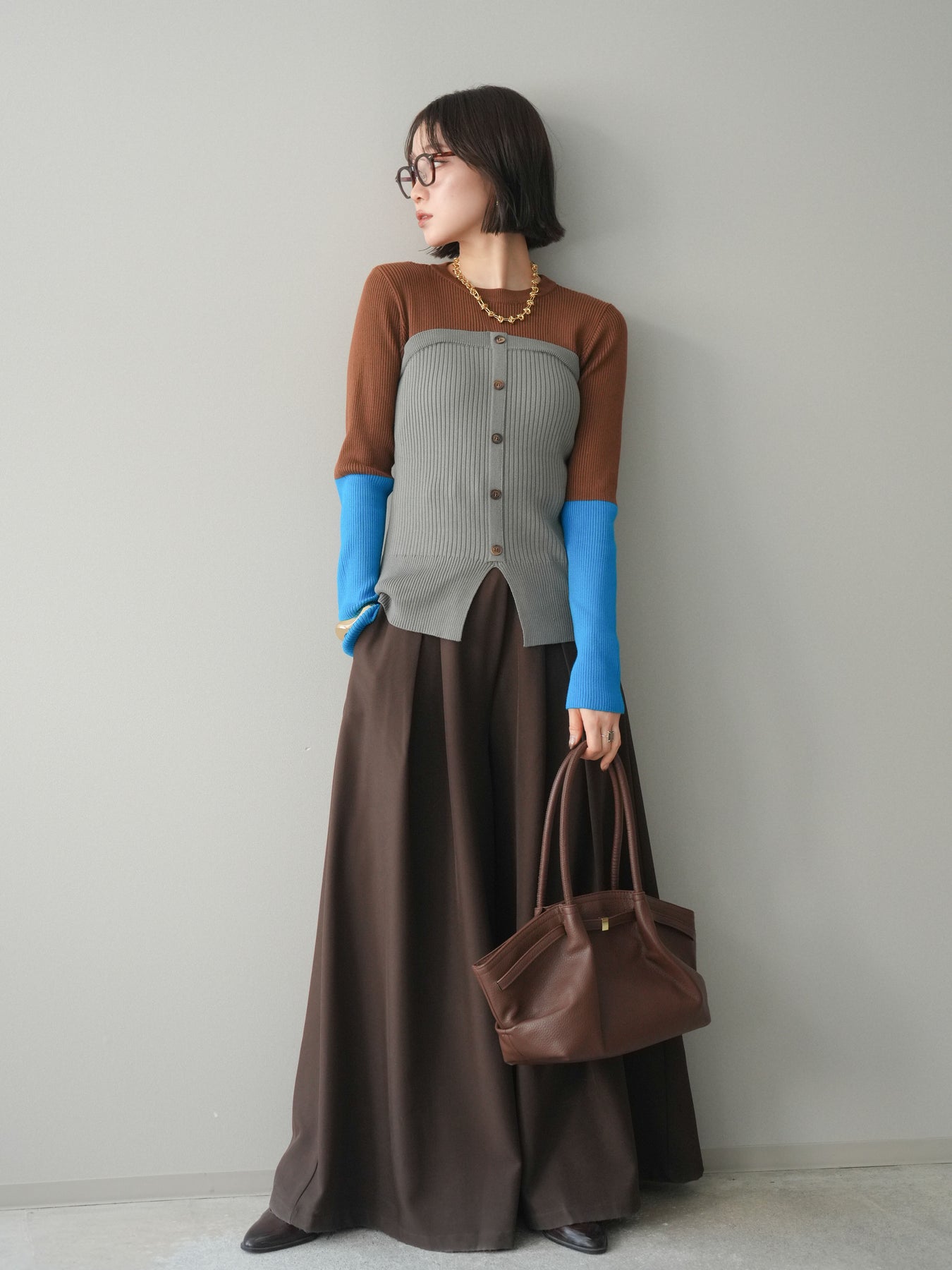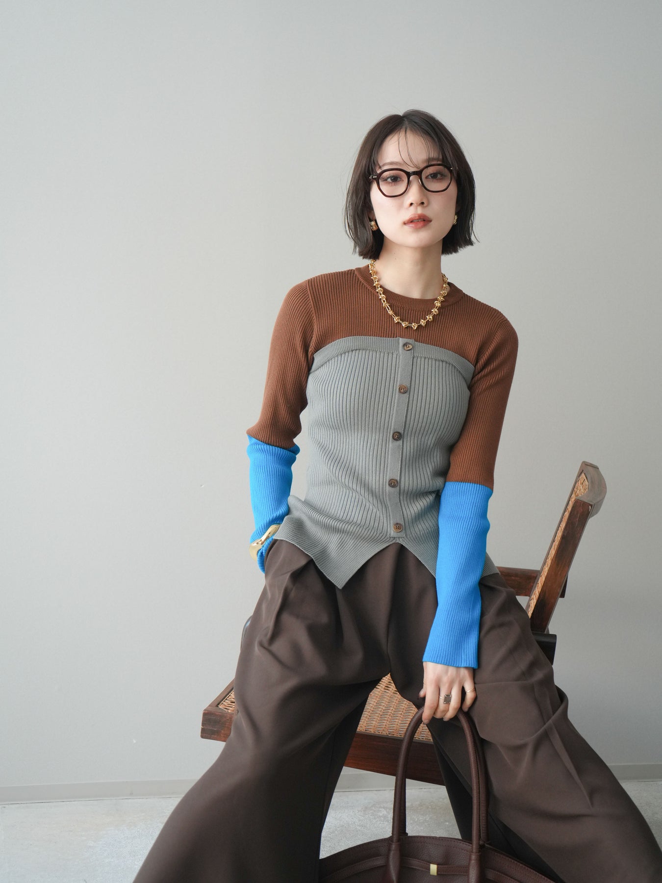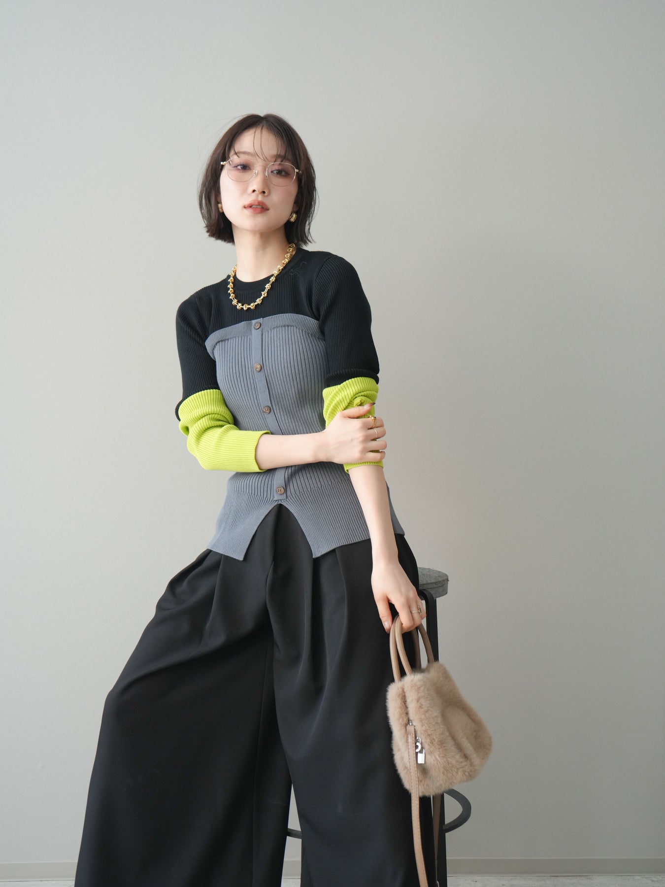 ビスチェを重ねたようなデザインが目を惹く、配色ドッキング仕様のリブニットトップス。立体感のある切り替えとフロントのボタンディテールが、シンプルな着こなしにも奥行きをプラスします。程よくフィットするリブ素材が身体のラインをきれいに見せつつ、1枚でコーディネートが完成するのも魅力。デニムやスラックス、スカートまで幅広いボトムスと相性が良く、デイリーからお出かけまで活躍する着映えアイテムです。 ※ボトムス、キャミソール(インナー)以外の商品は一律でインナーは付属していません。