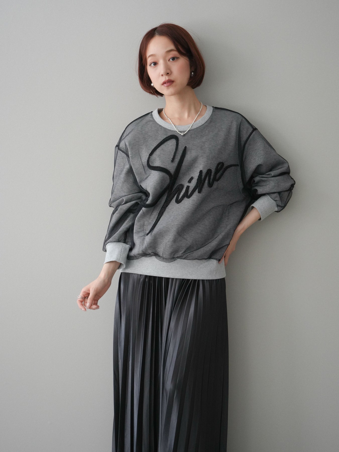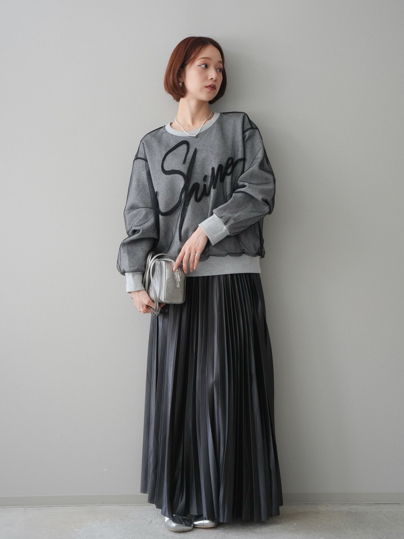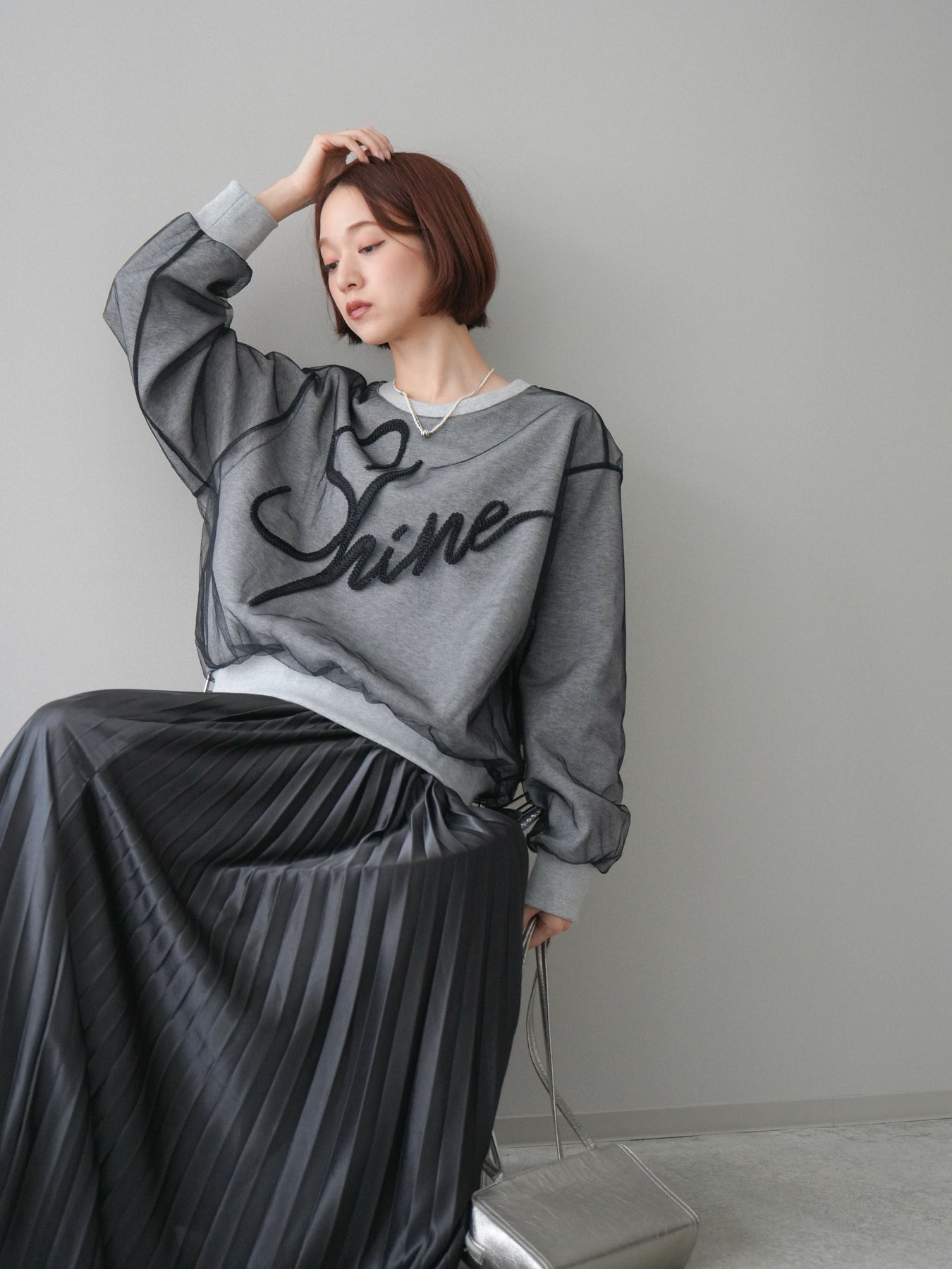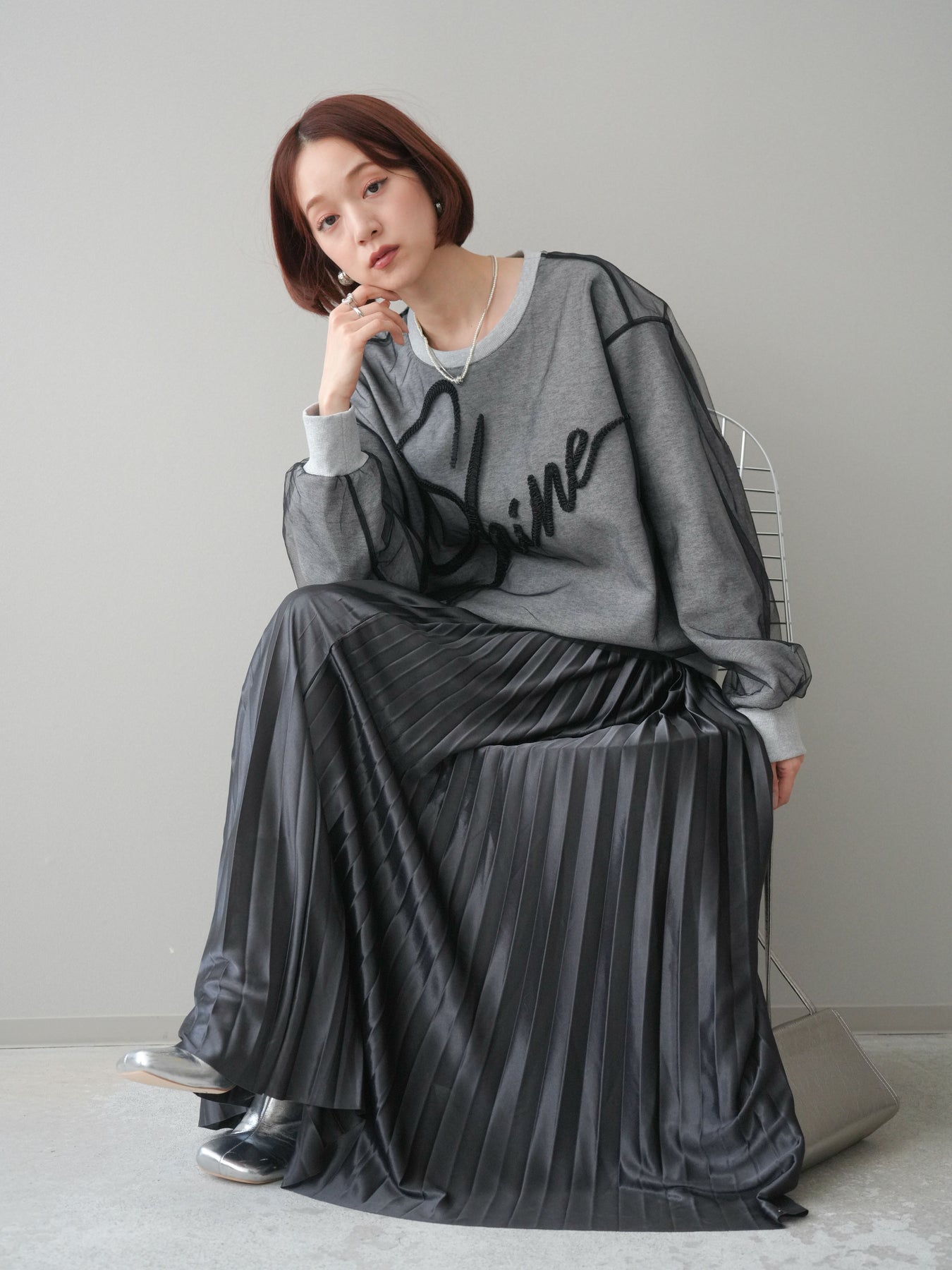 [SET]チュールレイヤードロゴスエットプルオーバー+サテンプリーツマキシスカート(2set)