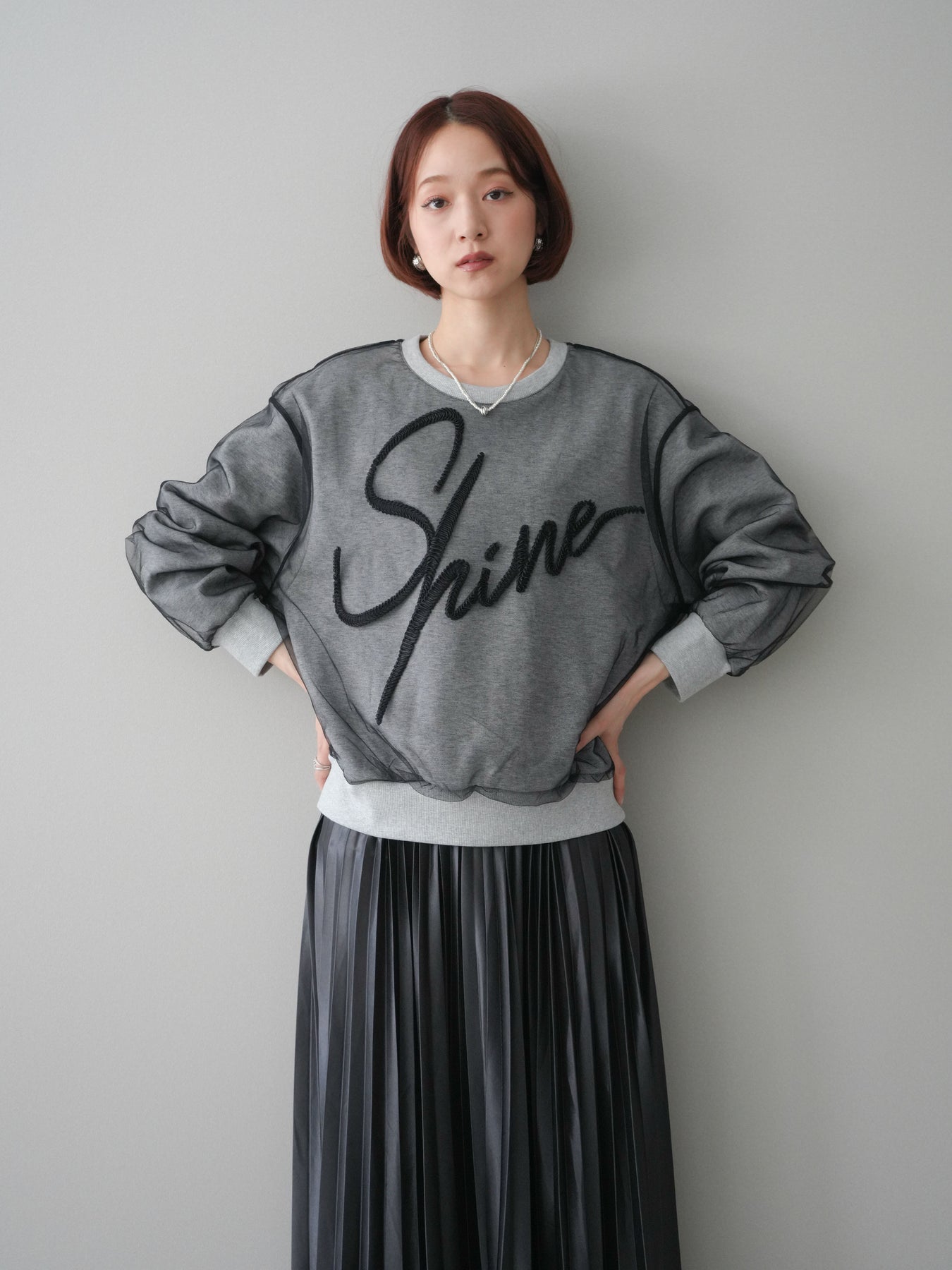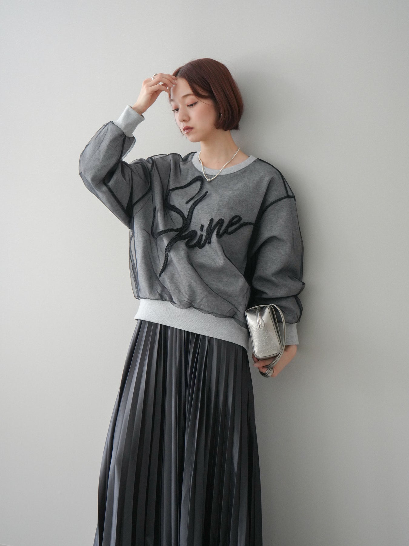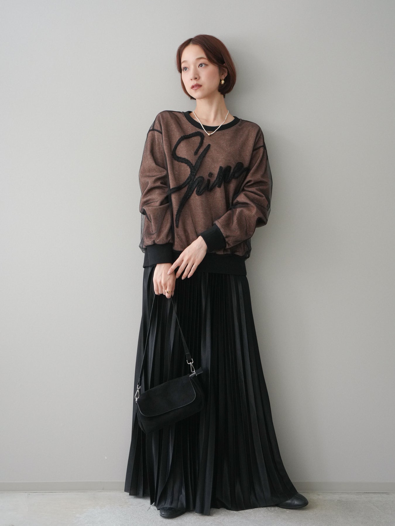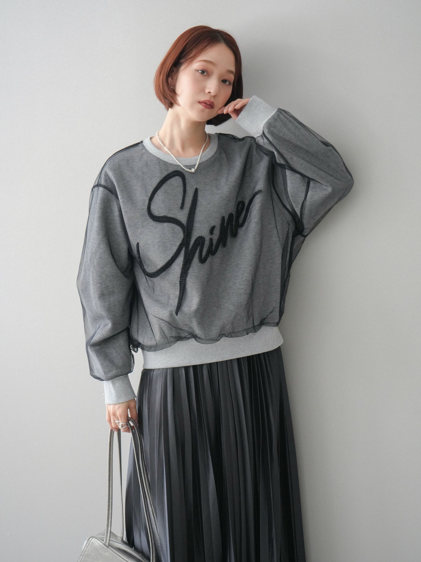 [SET]チュールレイヤードロゴスエットプルオーバー+サテンプリーツマキシスカート(2set)